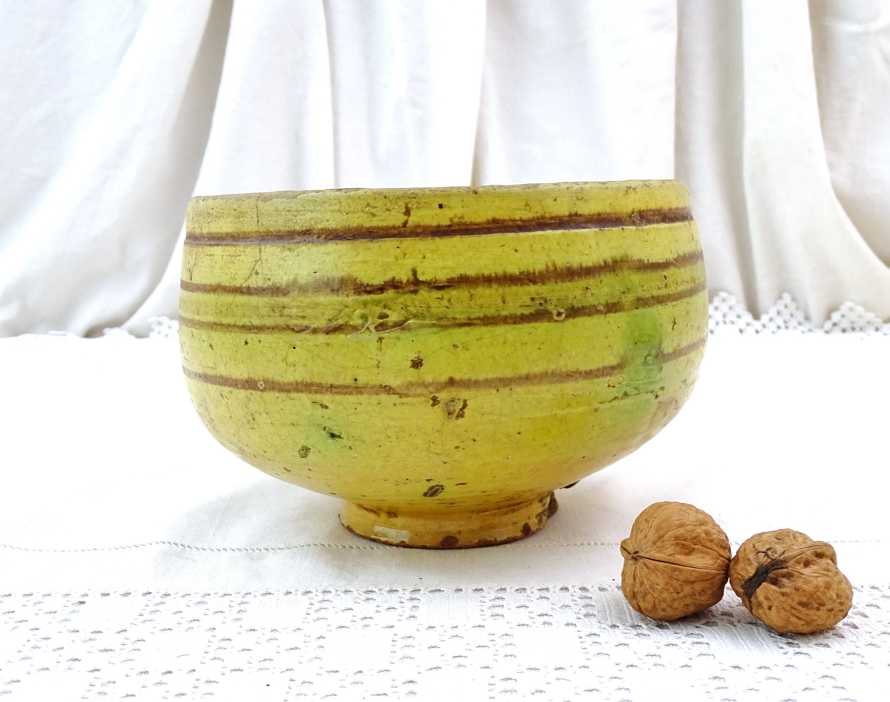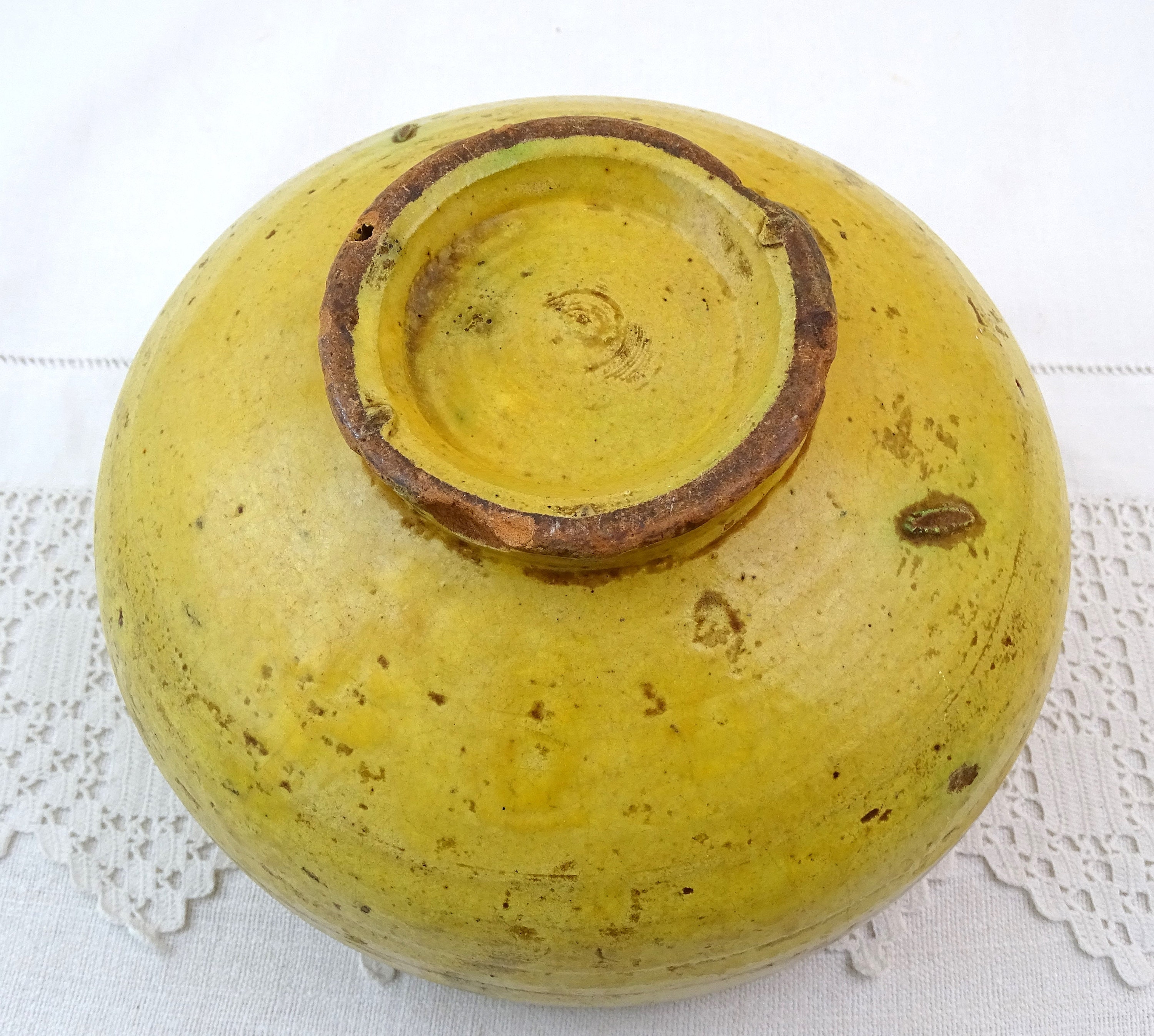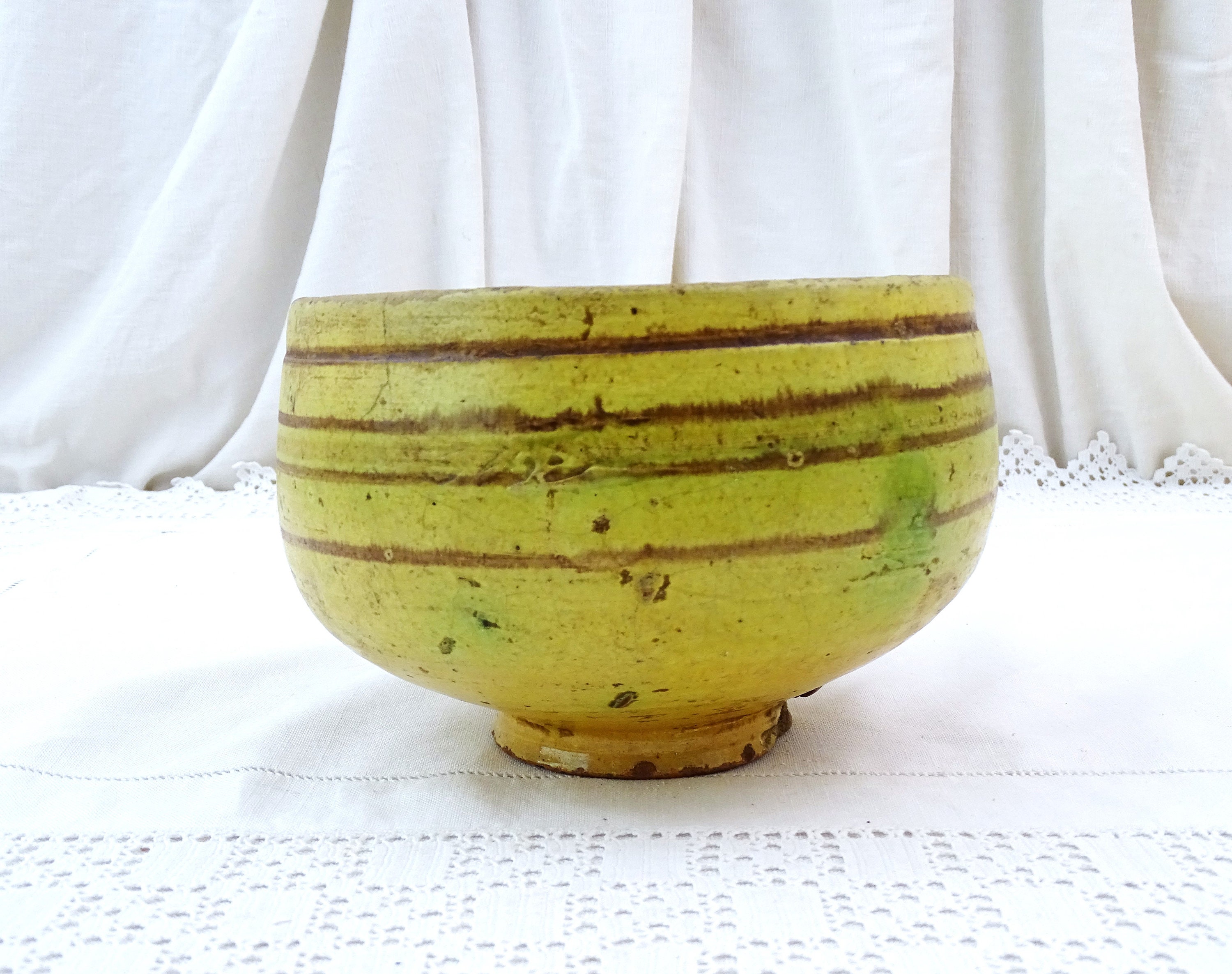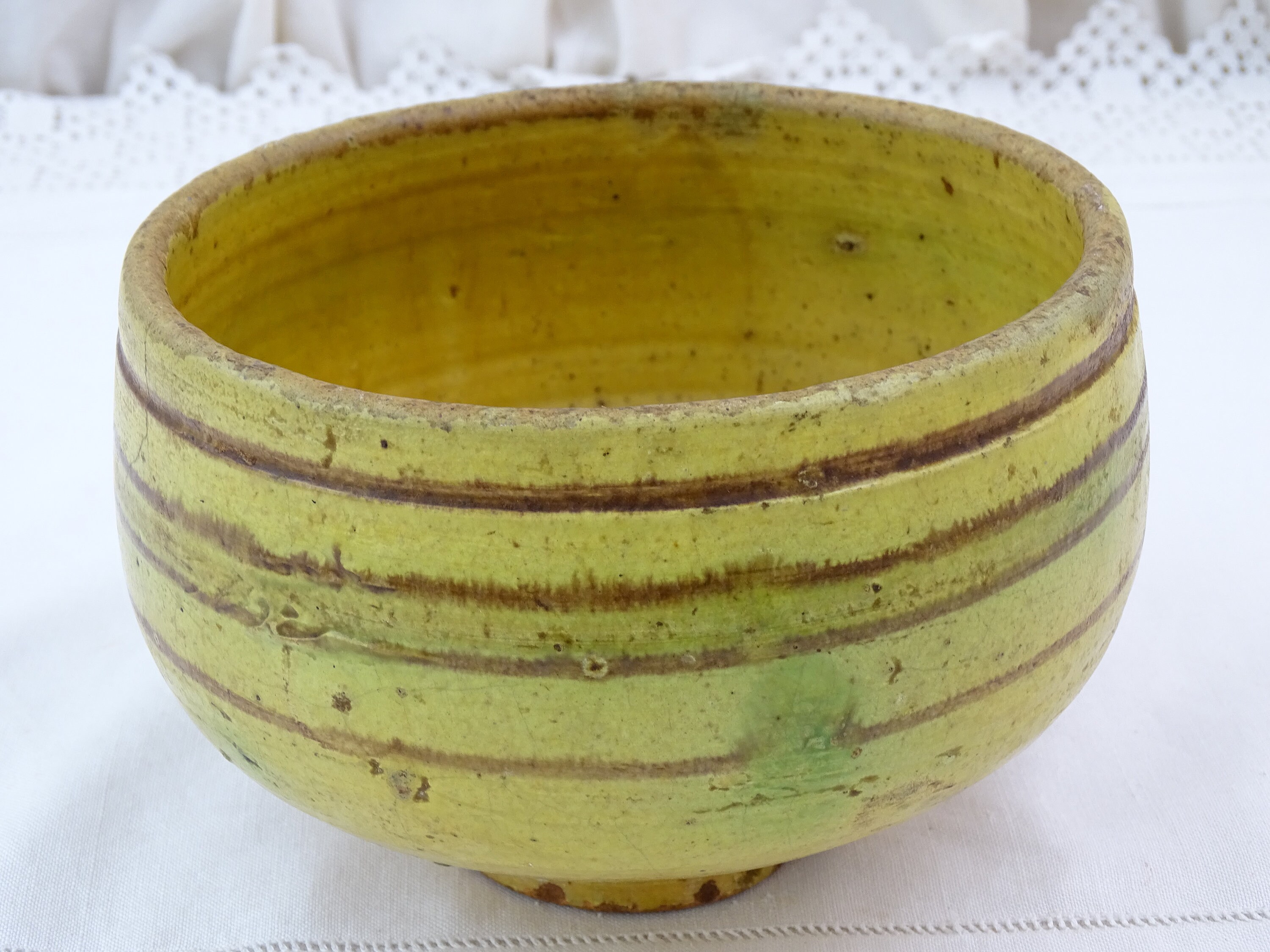 Antique French Provencal pottery footed bowl in yellow glaze. Made of pottery. A rare example. Ca 1800s.
