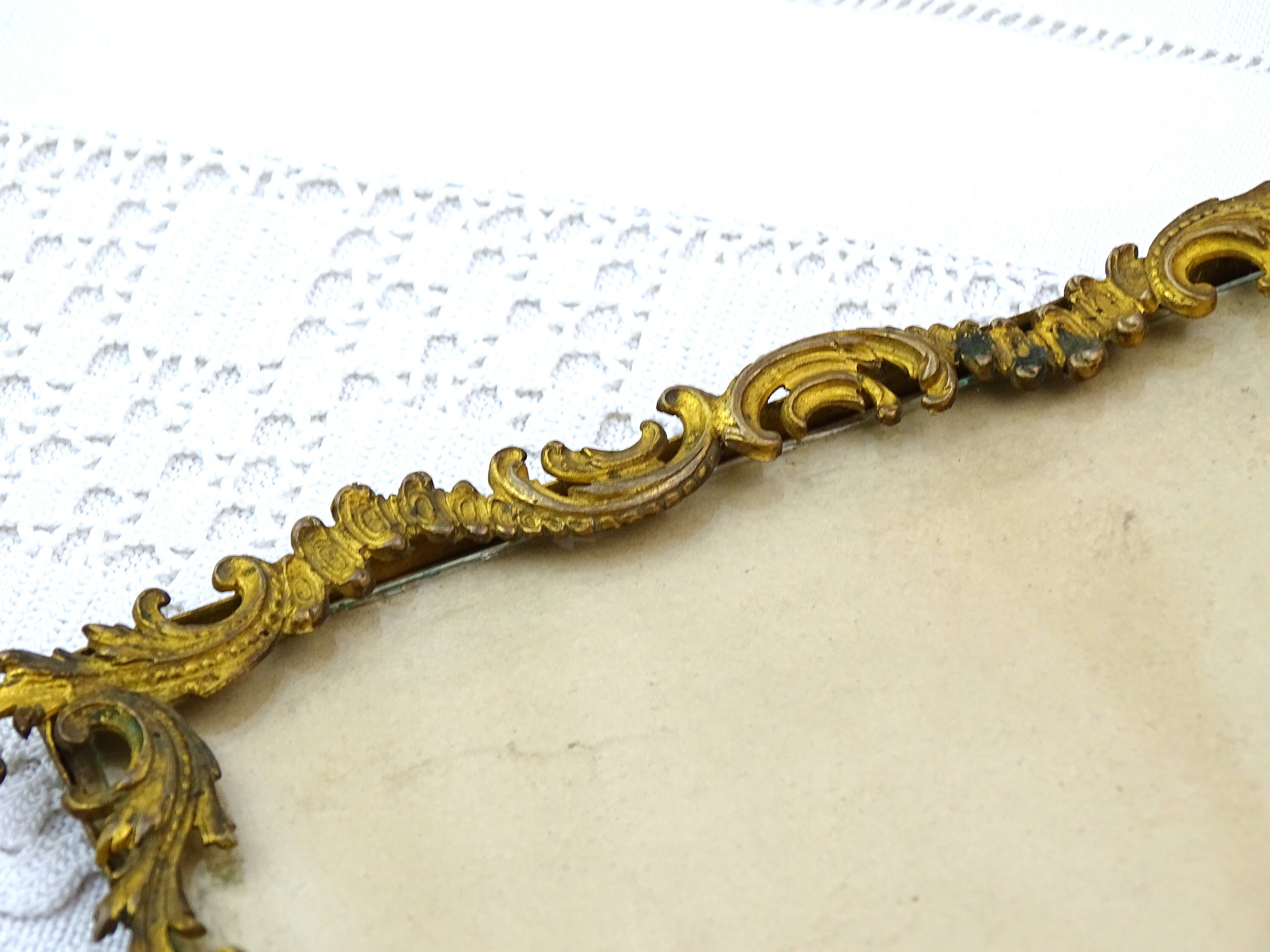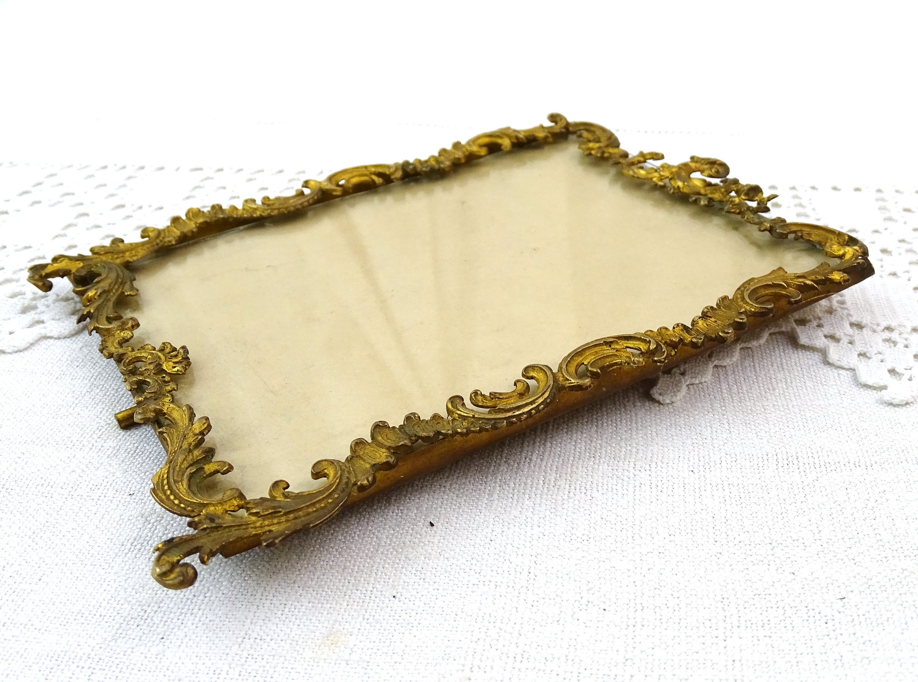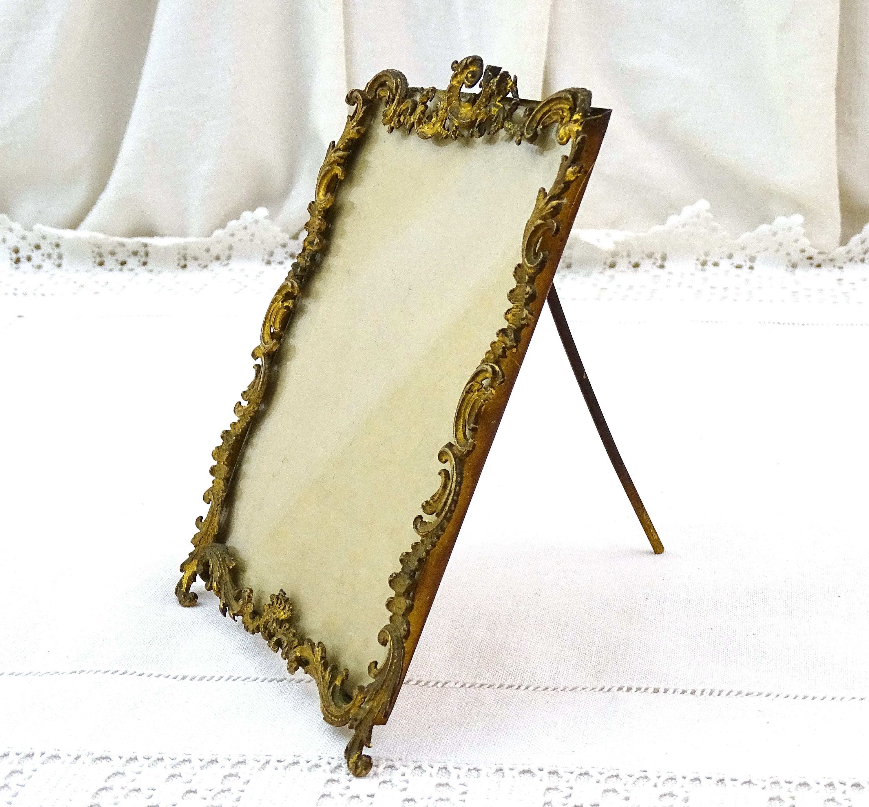 Antique French gold gilded rococo style portrait frame. Made of gilded metal with glass. Free standing easel or wall mounting hoop. Ca late 1800s.
