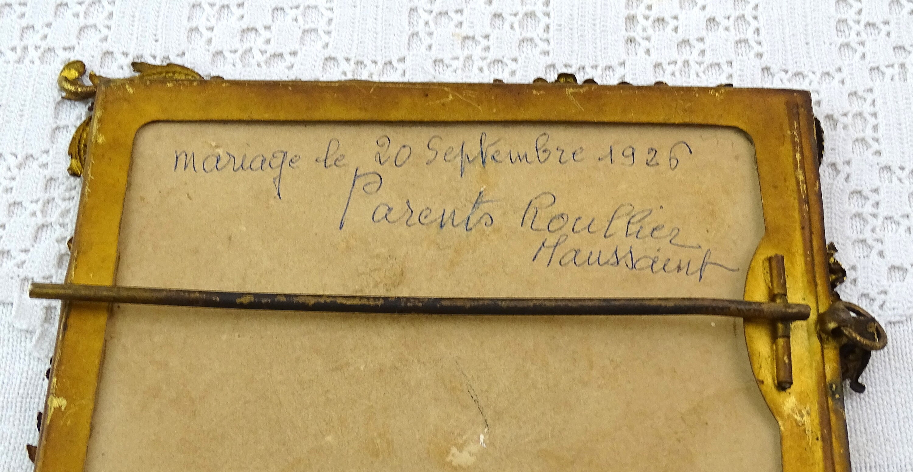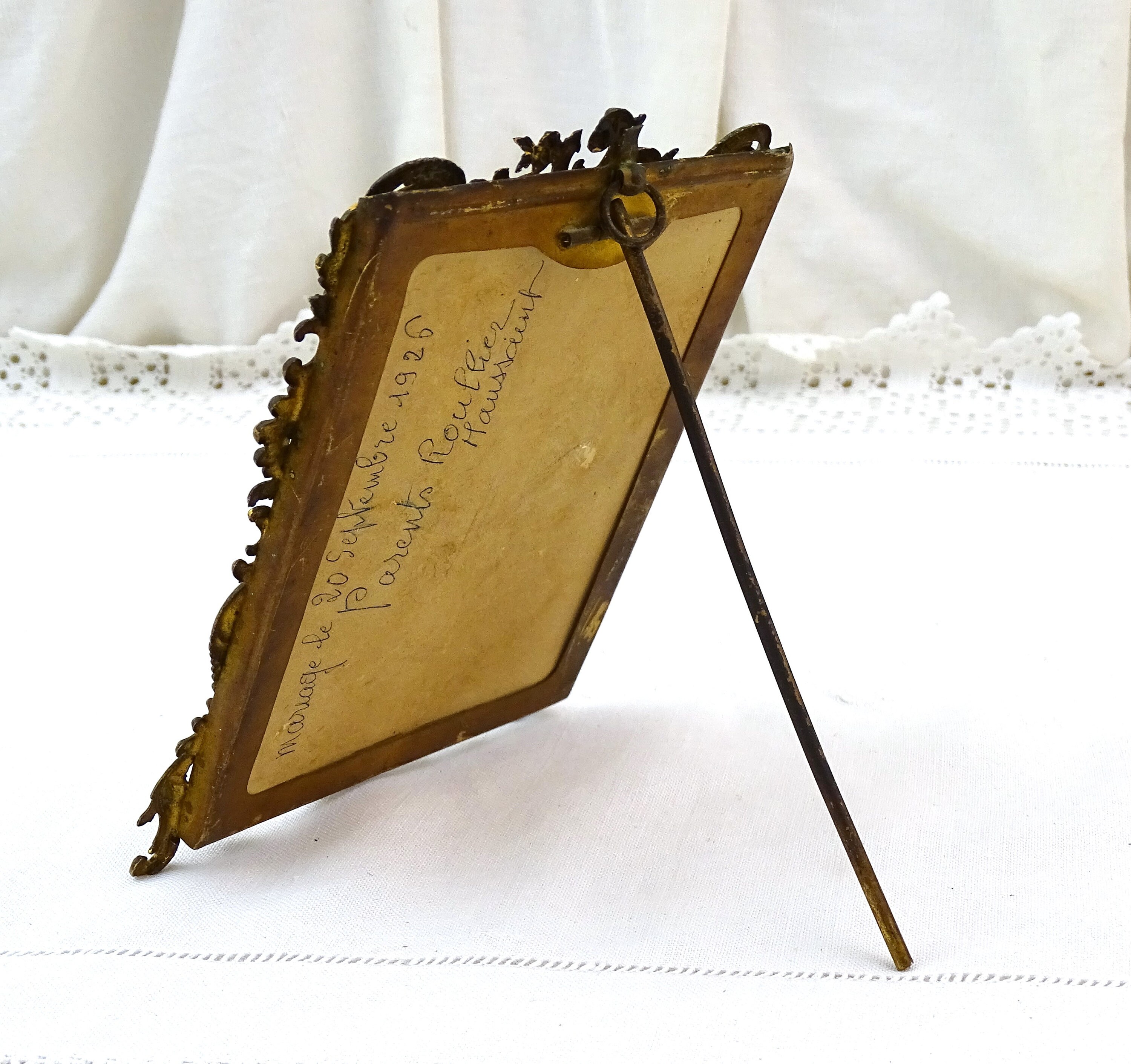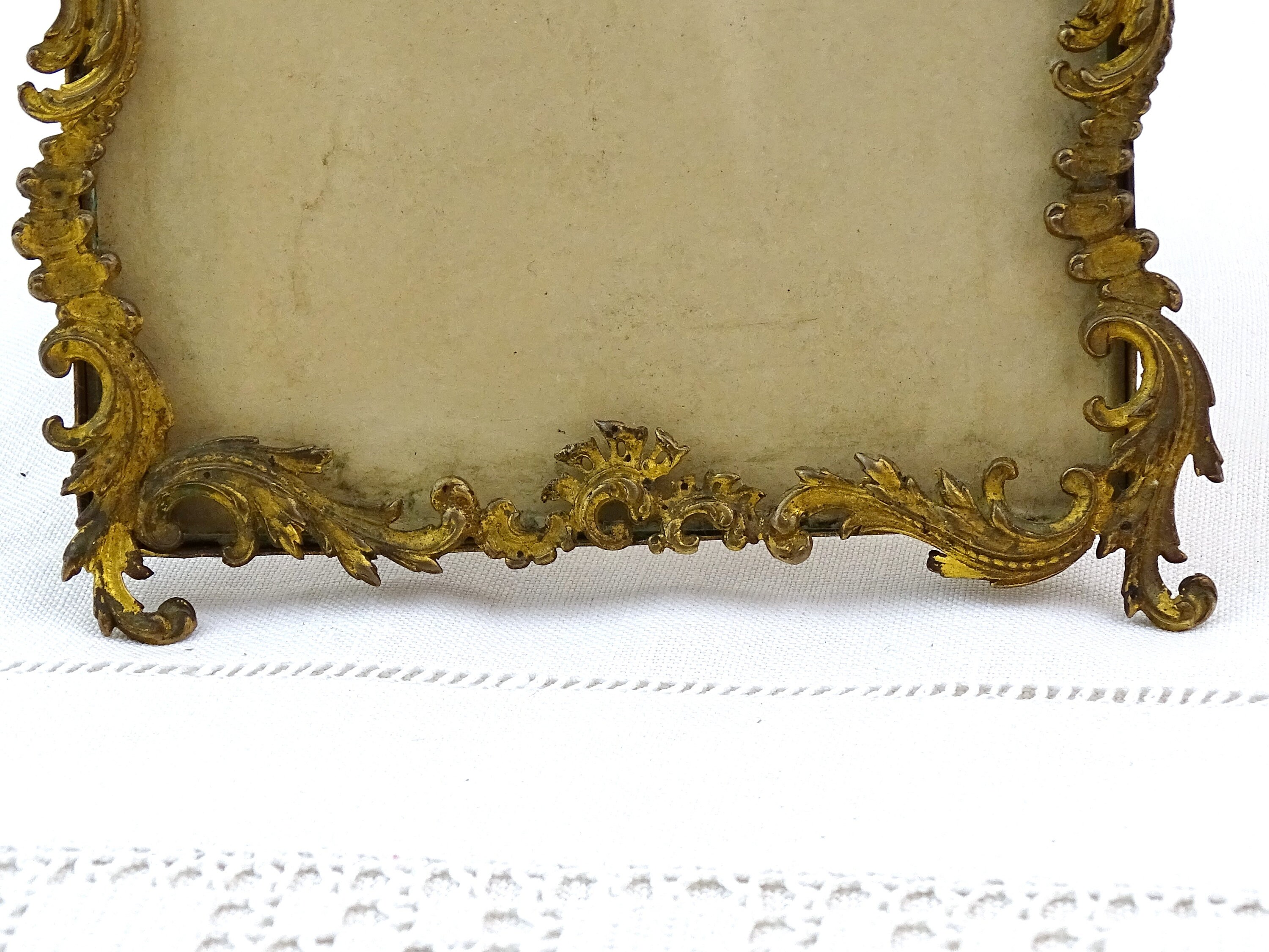 Antique French gold gilded rococo style portrait frame. Made of gilded metal with glass. Free standing easel or wall mounting hoop. Ca late 1800s.