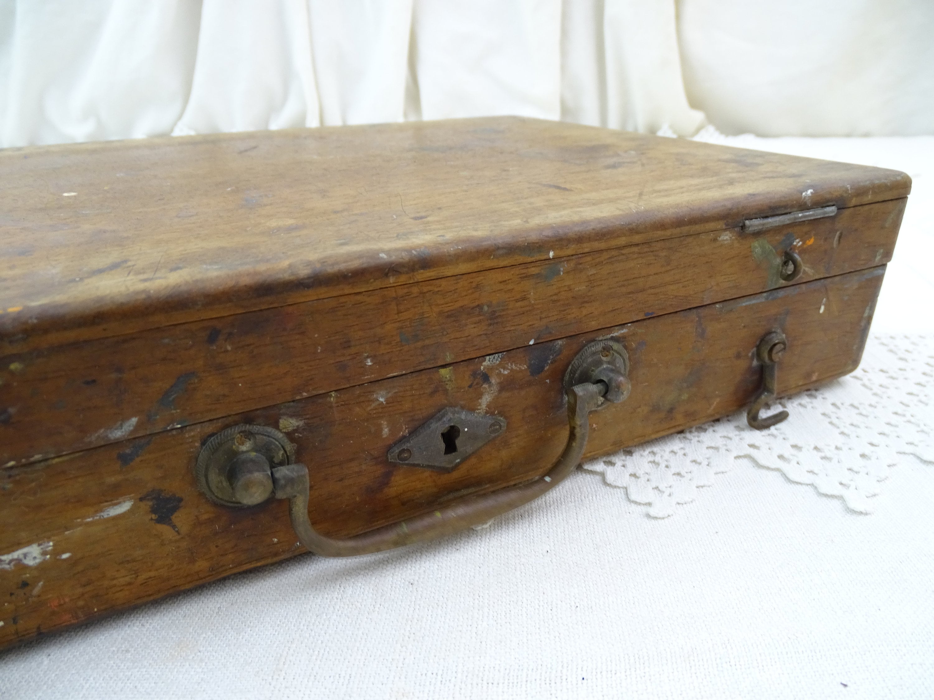 Antique French artist's paint box with palette and removable metal compartments. Made of wood with brass attachments and zinc metal compartments. Traces of the date 1880 on the lid of the box. Ca late 1800s.
