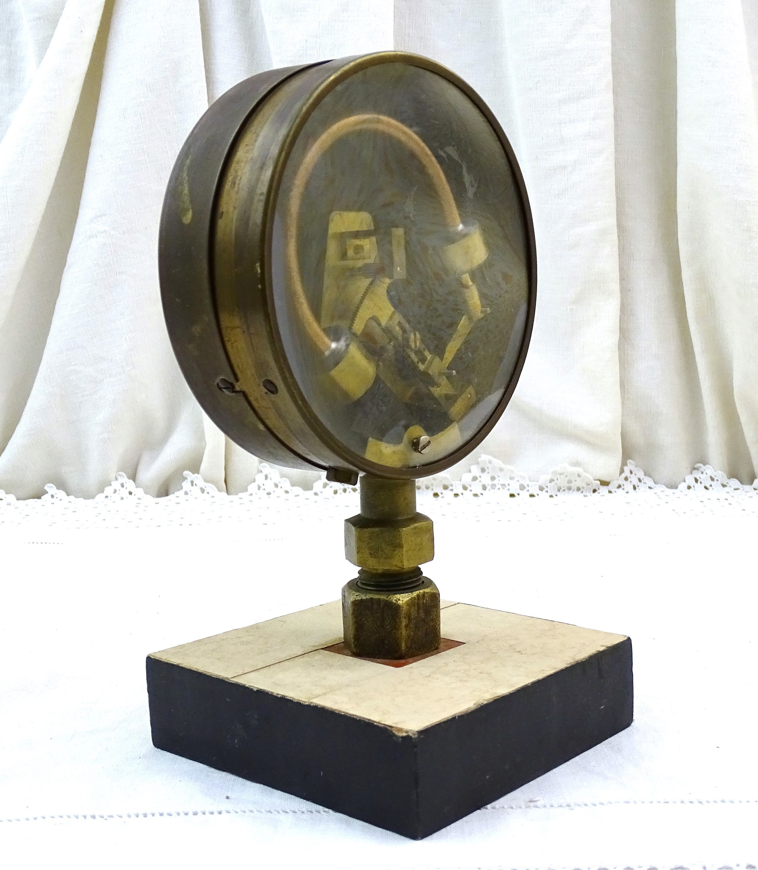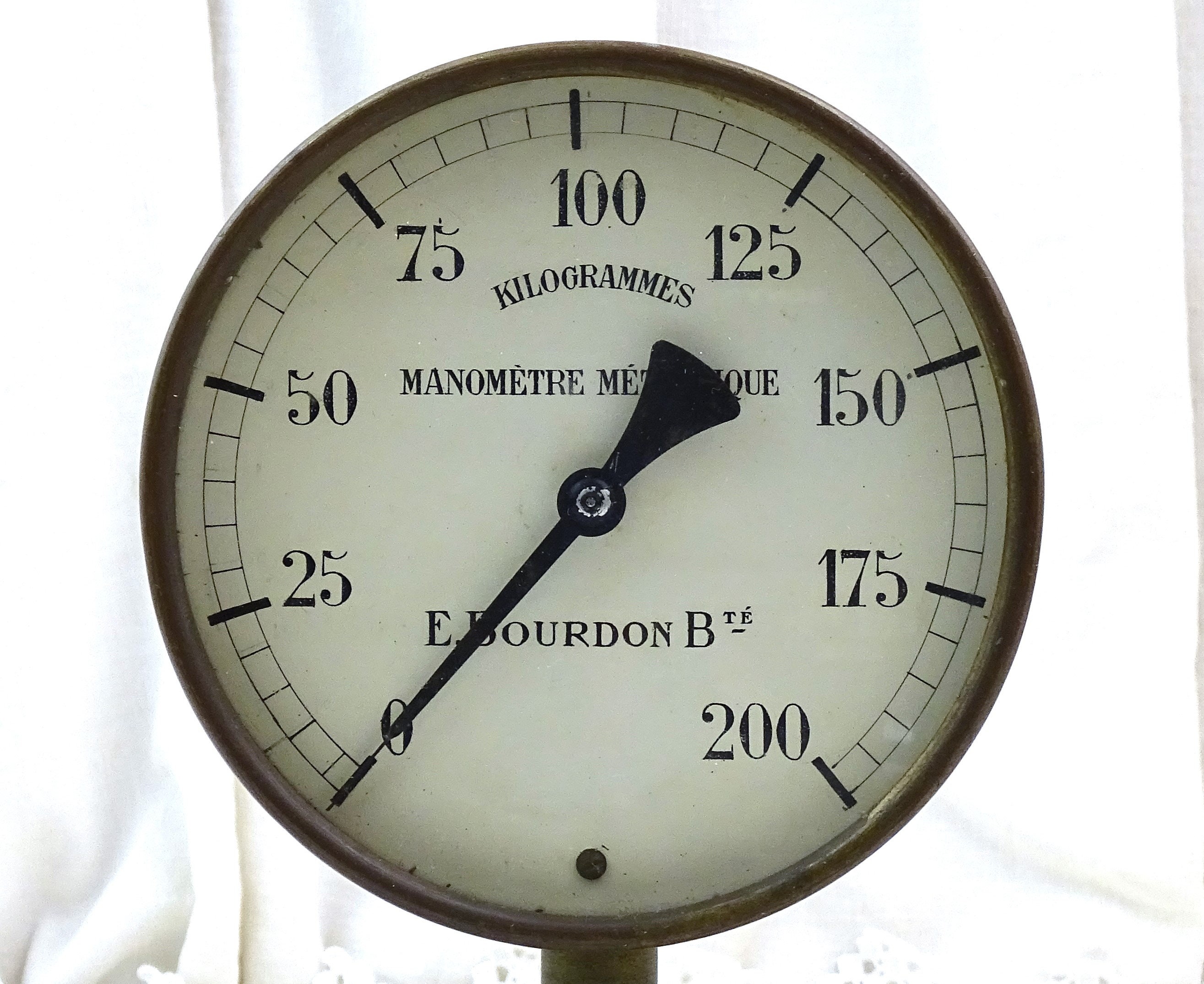 Large antique French manometer dial with transparent backing on a mount. Manometer in kilograms made by E Bourdon. Made of brass with glass and thin plastic backing which has been added at a later date. Mounted on a heavy base. Ca 1910s.