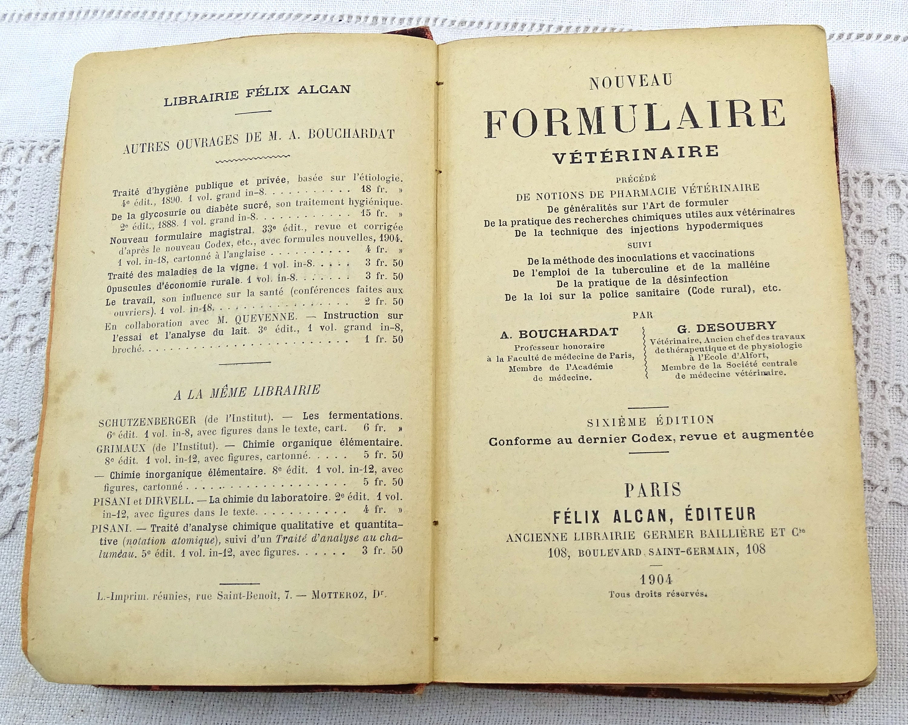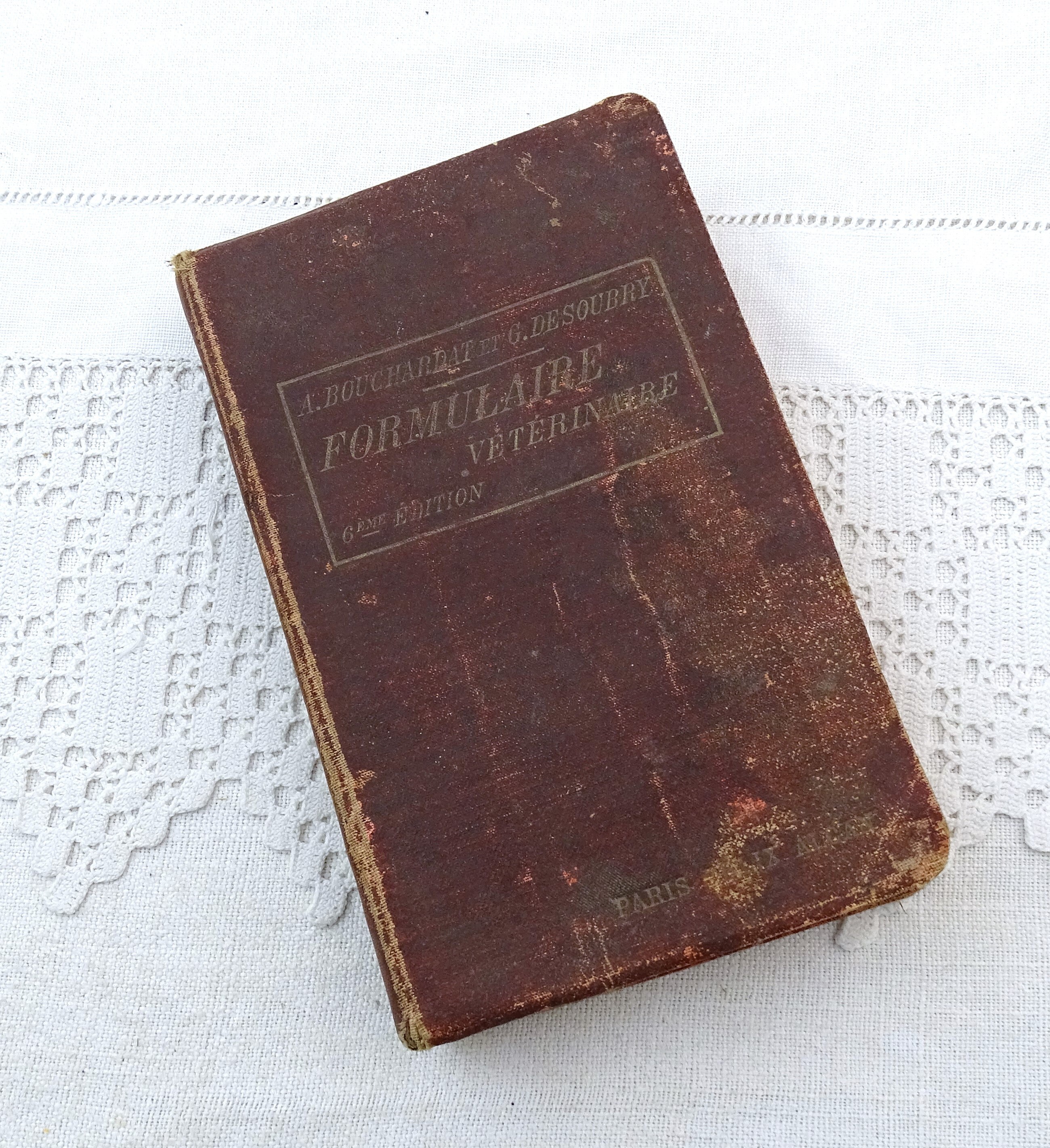 Antique French veterinary book. 6th Edition printed in 1904 Nouveau Formulaire Veterinaire written in French. 510 pages.