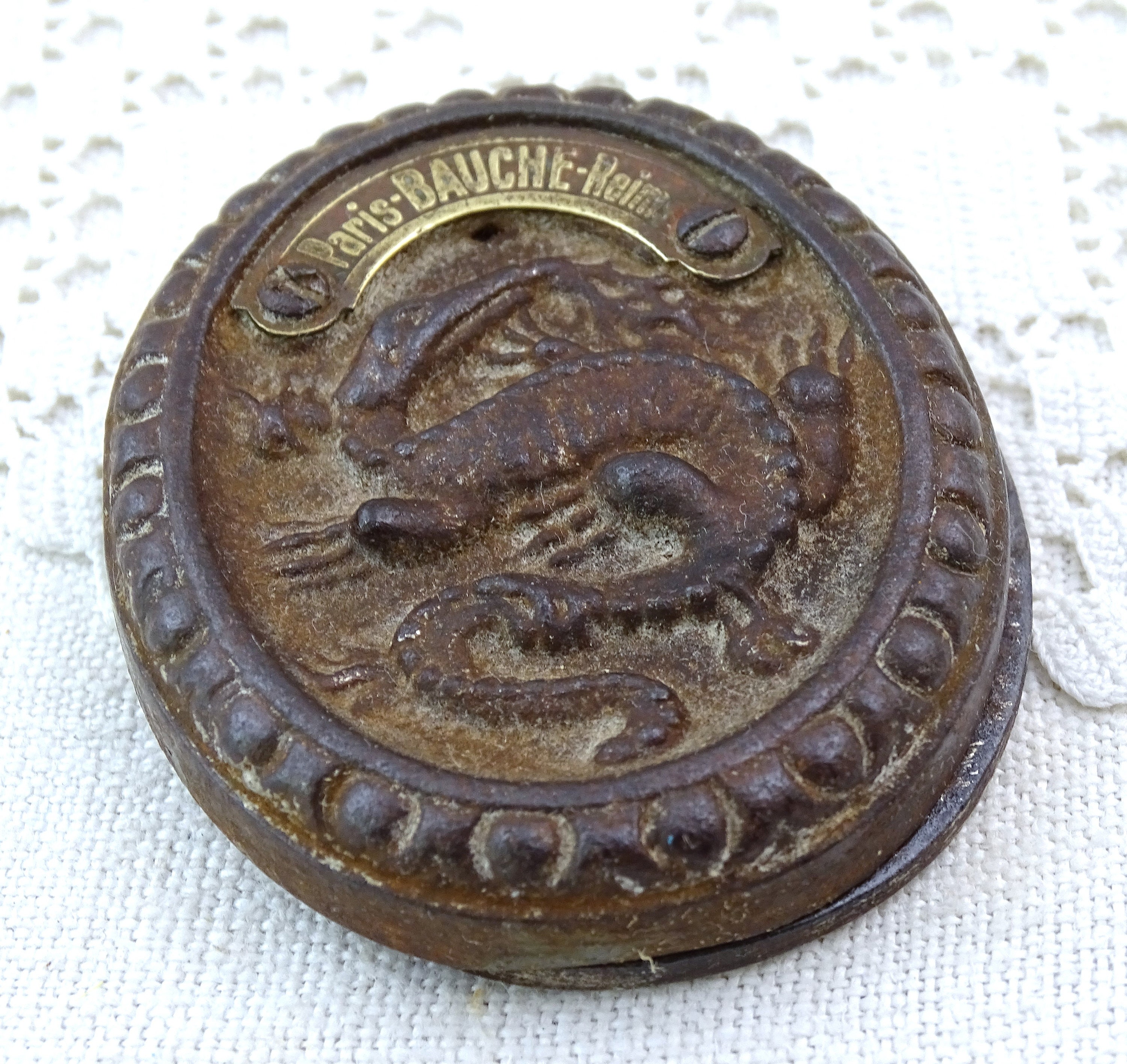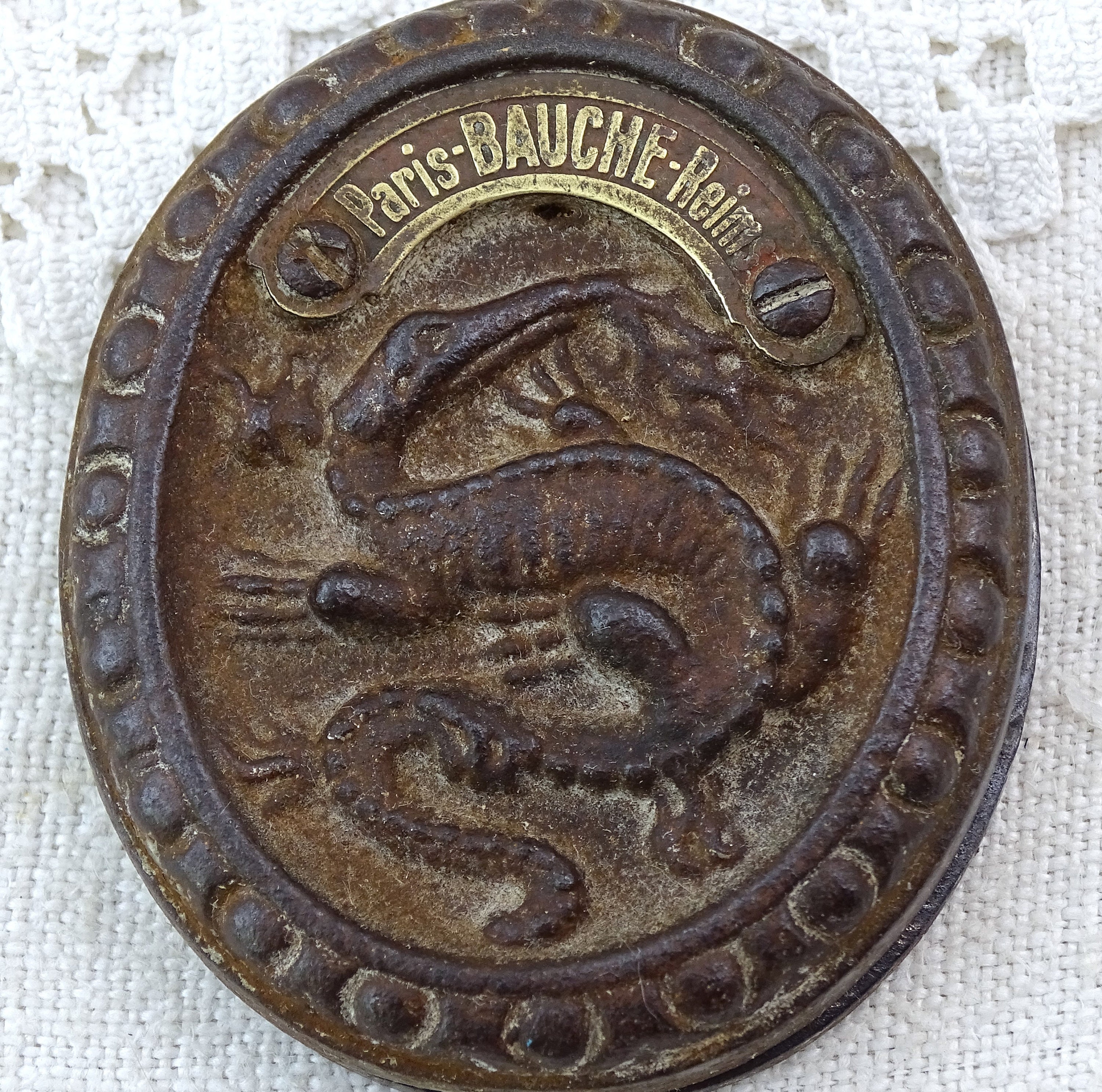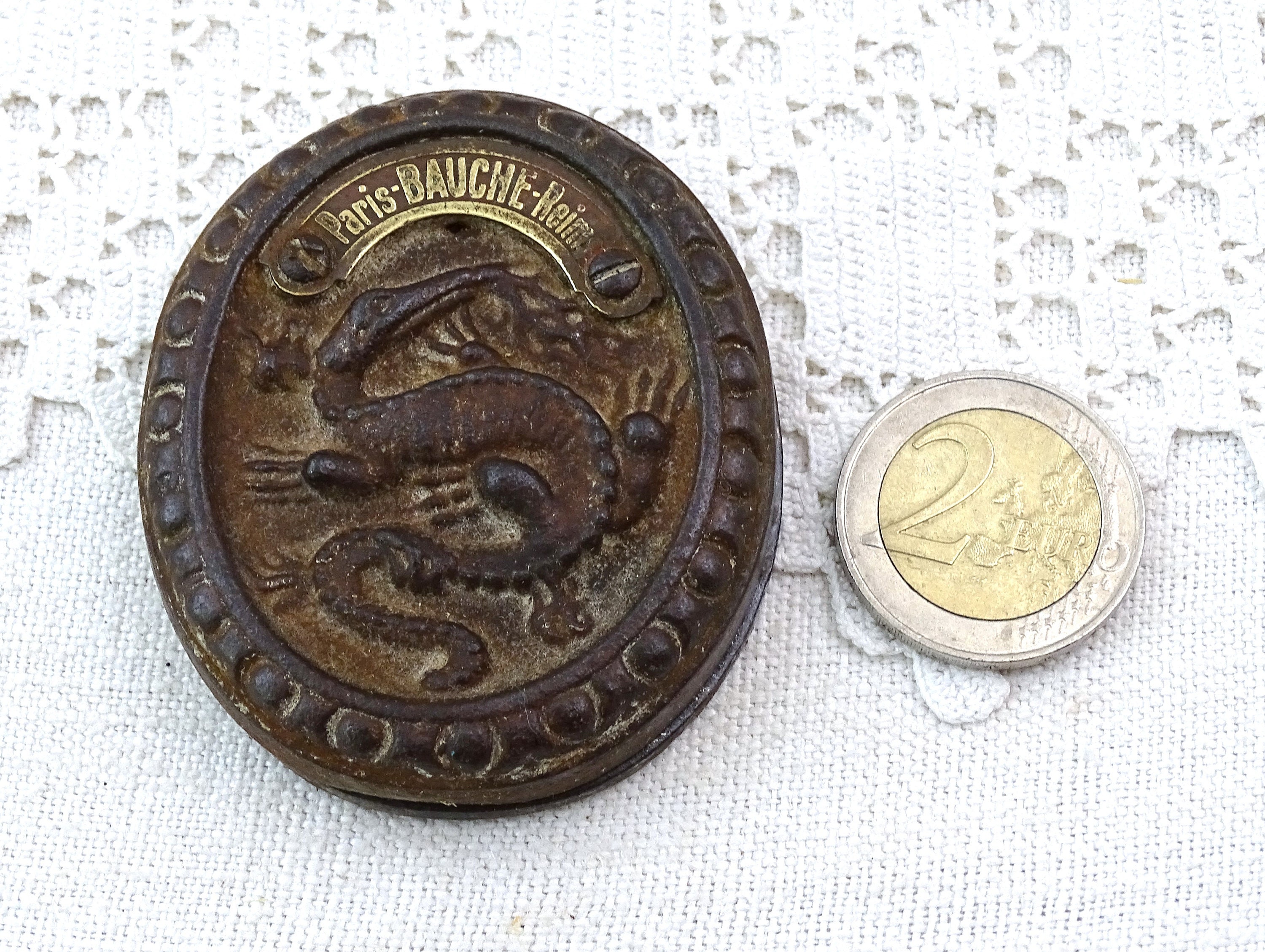 Antique French key hole flap for a money safe. Made by the company Bauche from Paris, decorated with a Dragon and small brass plaque. Made of cast iron. Ca mid to late 1800s.