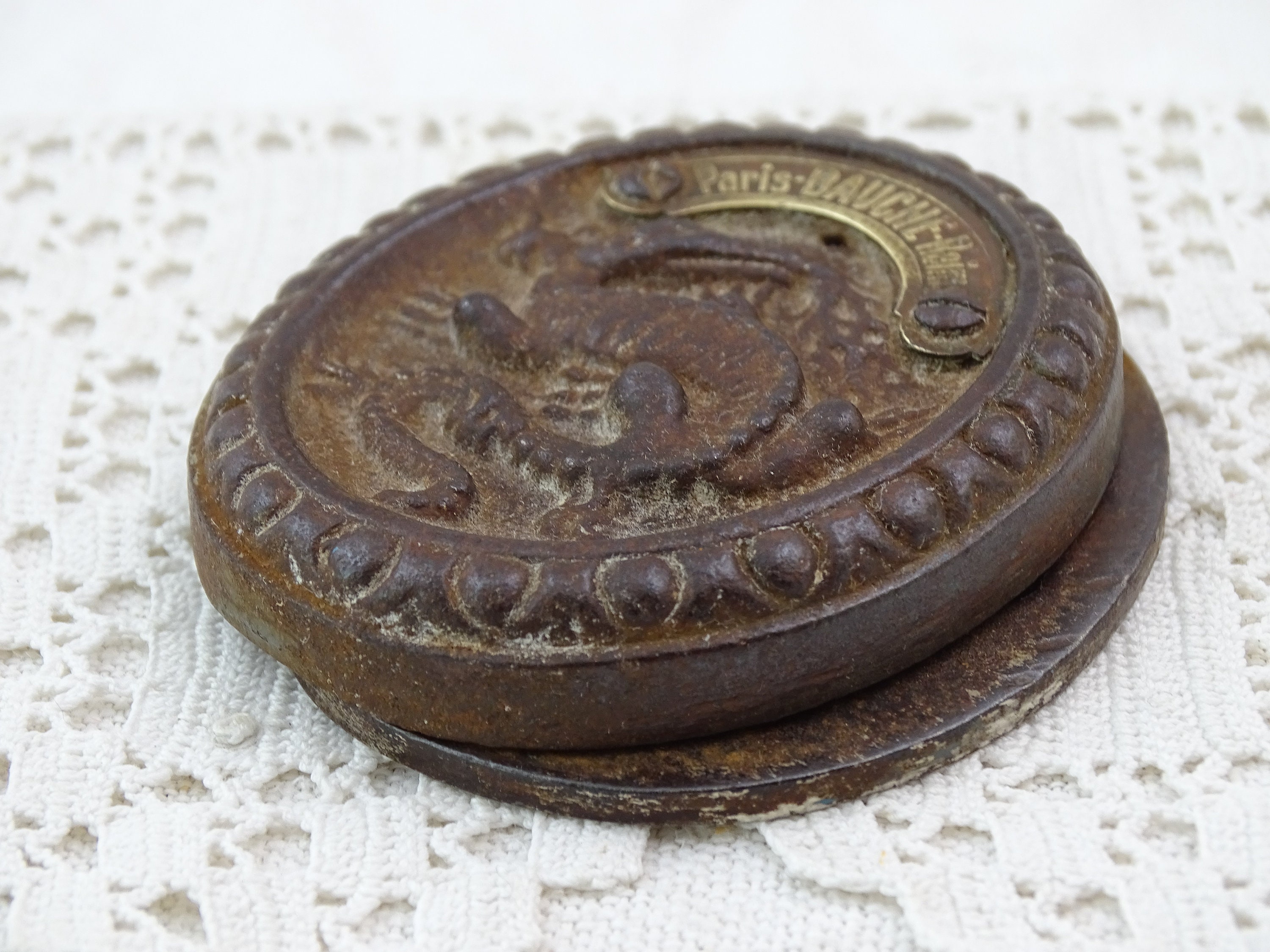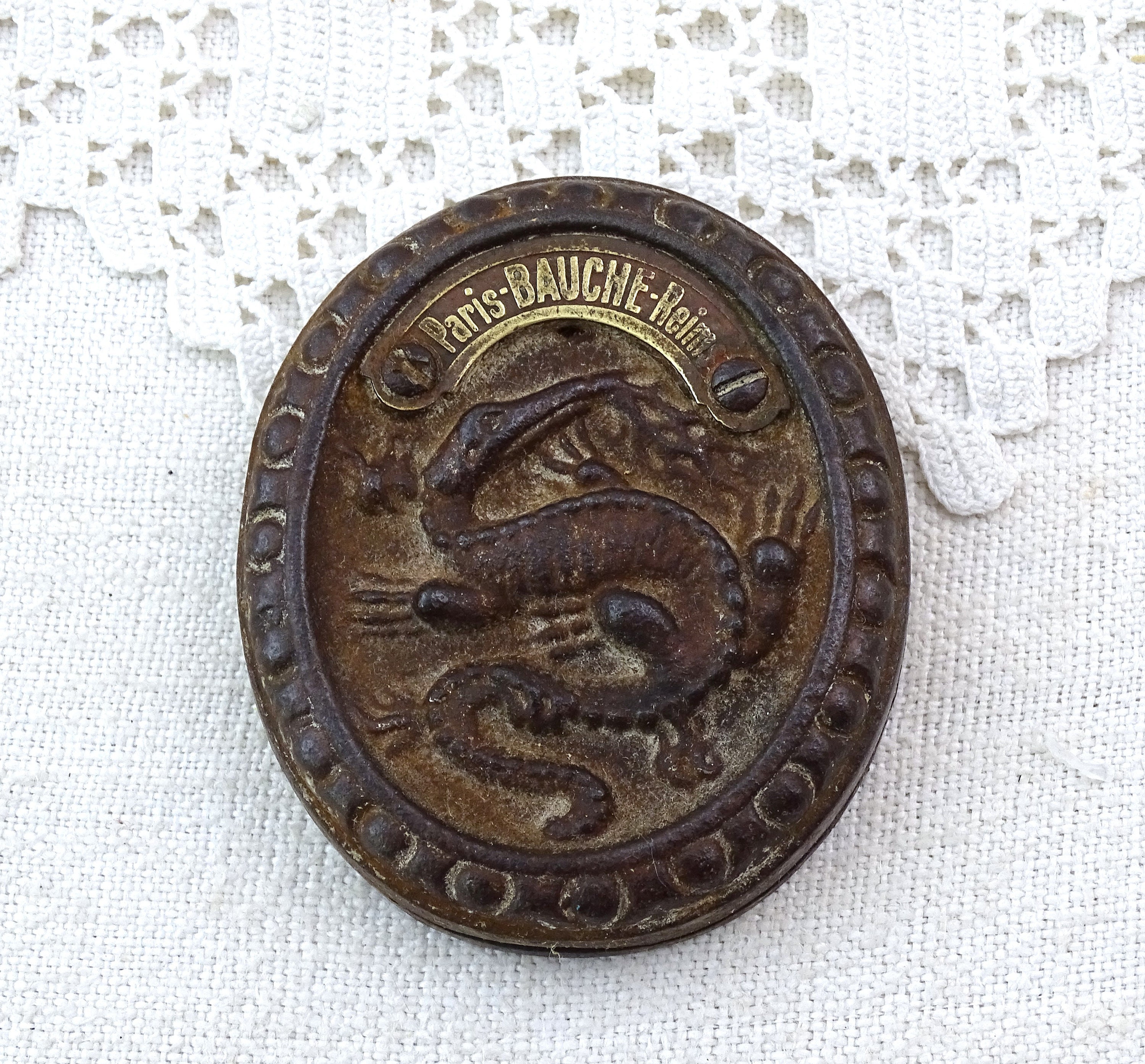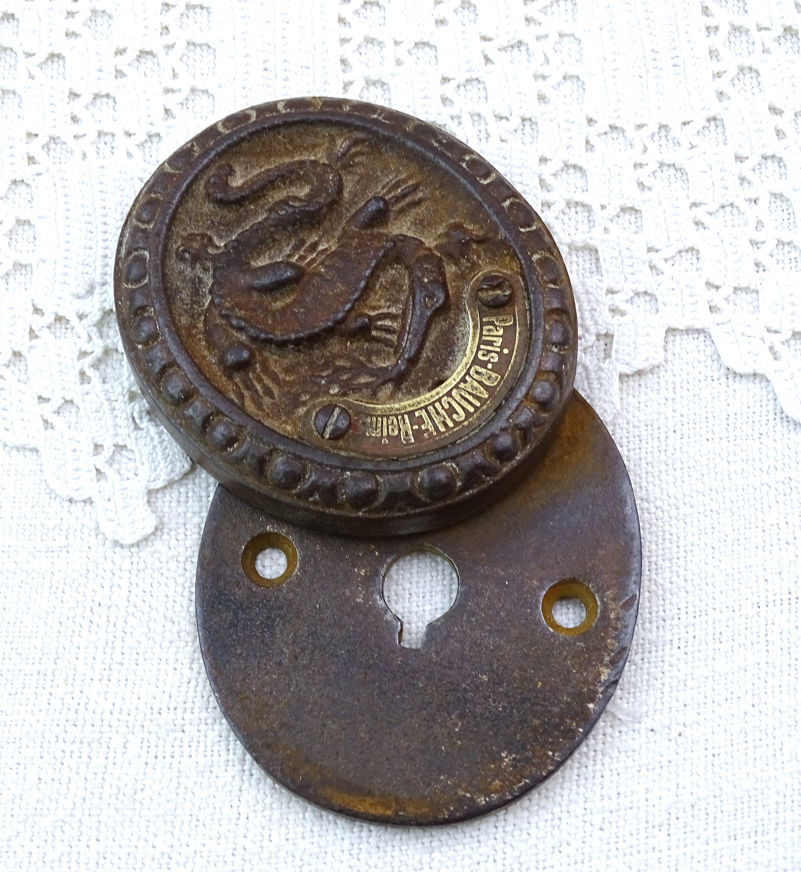 Antique French key hole flap for a money safe. Made by the company Bauche from Paris, decorated with a Dragon and small brass plaque. Made of cast iron. Ca mid to late 1800s.