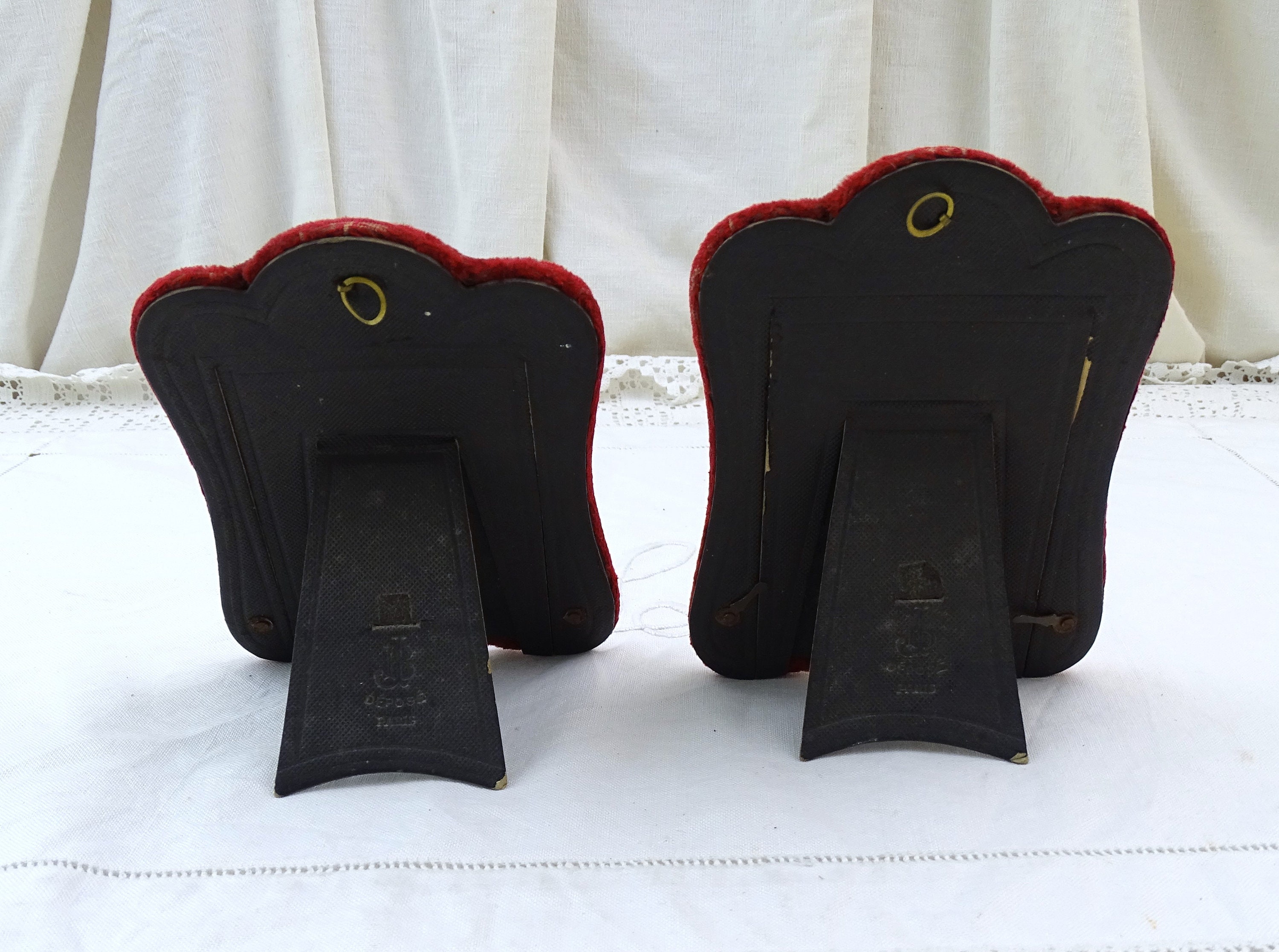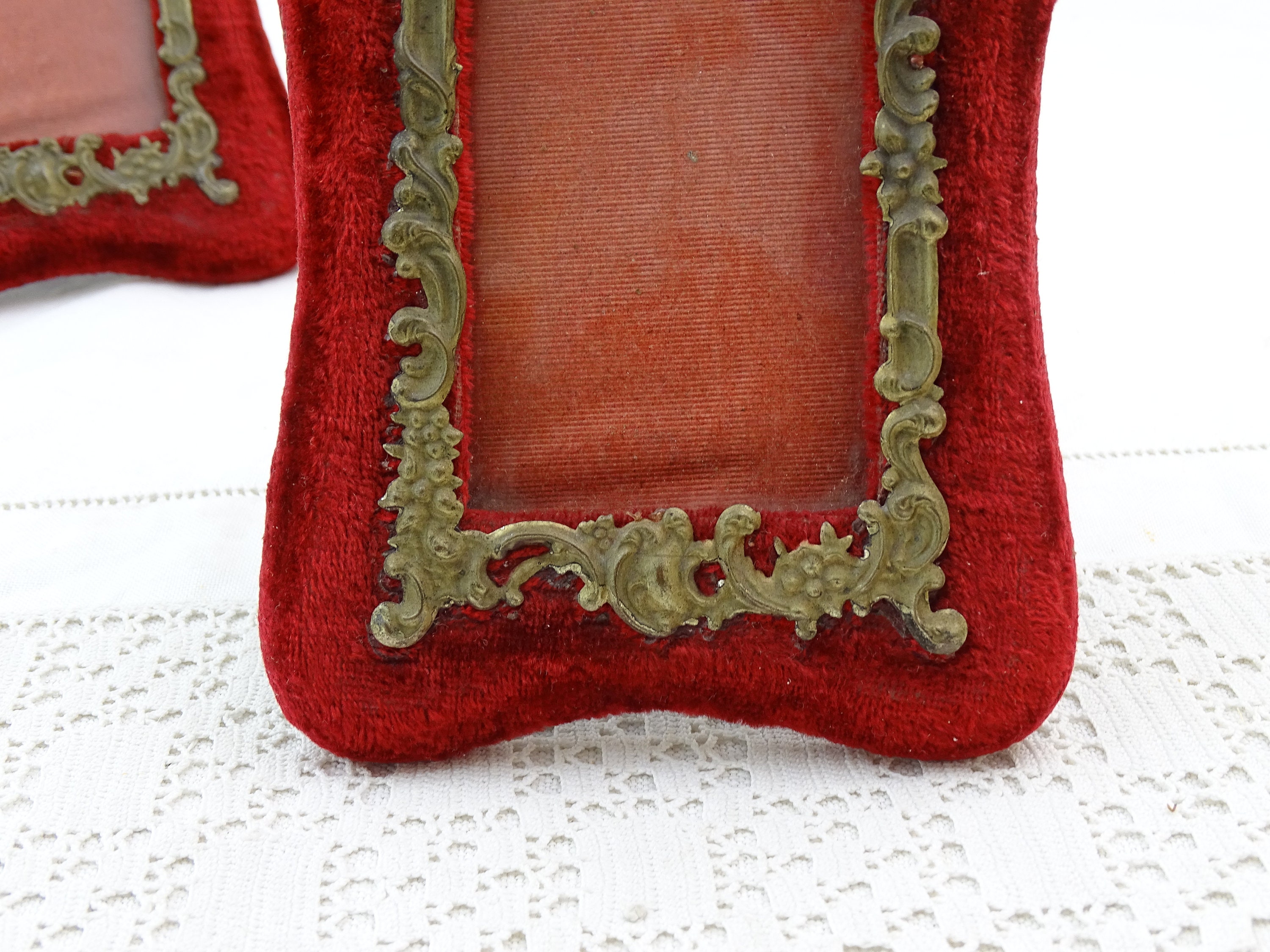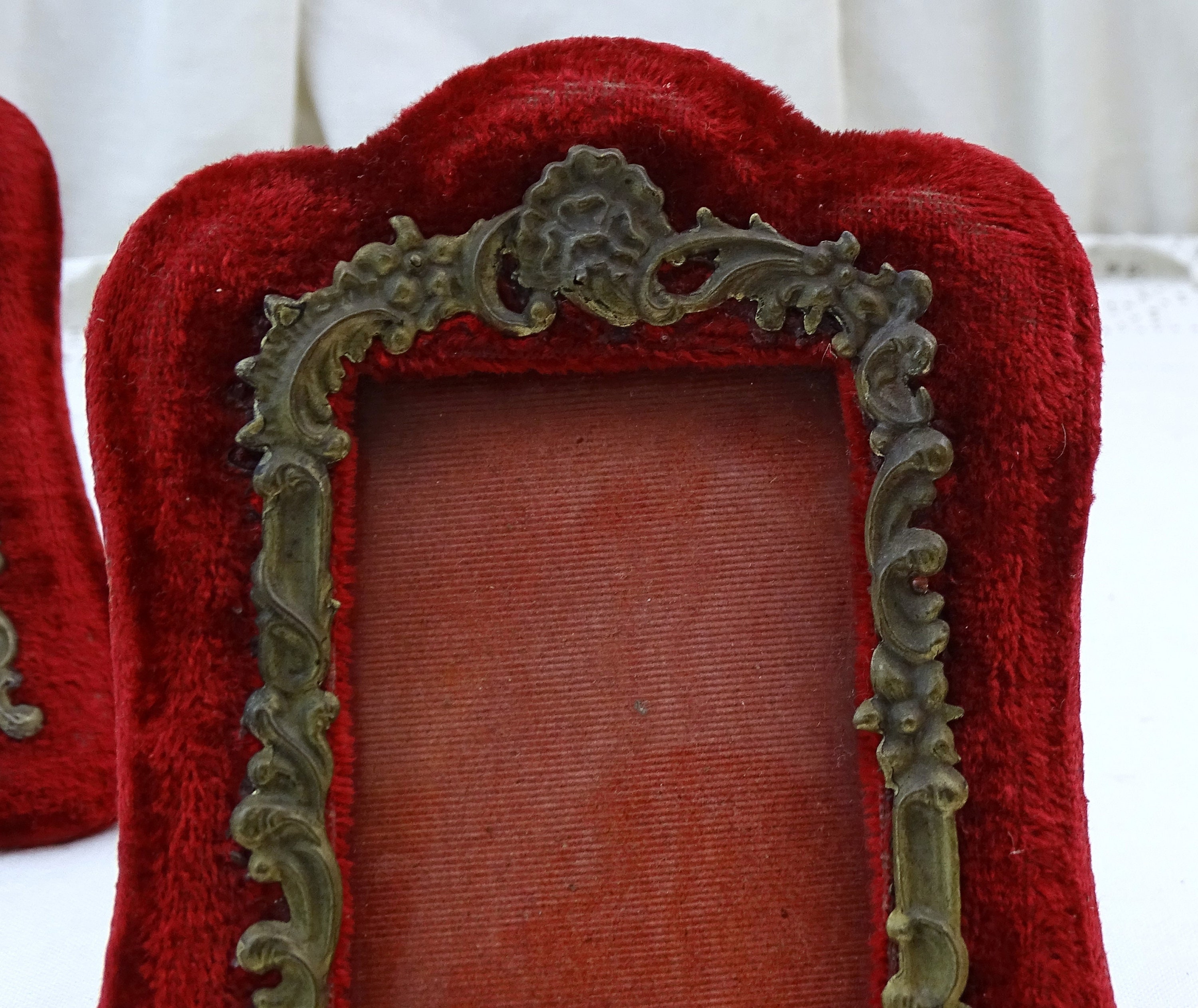 Pair of antique free standing or wall mounted portrait frames. Made of velvet covered wood with embossed metal ornamentation. Ca late 1800s.