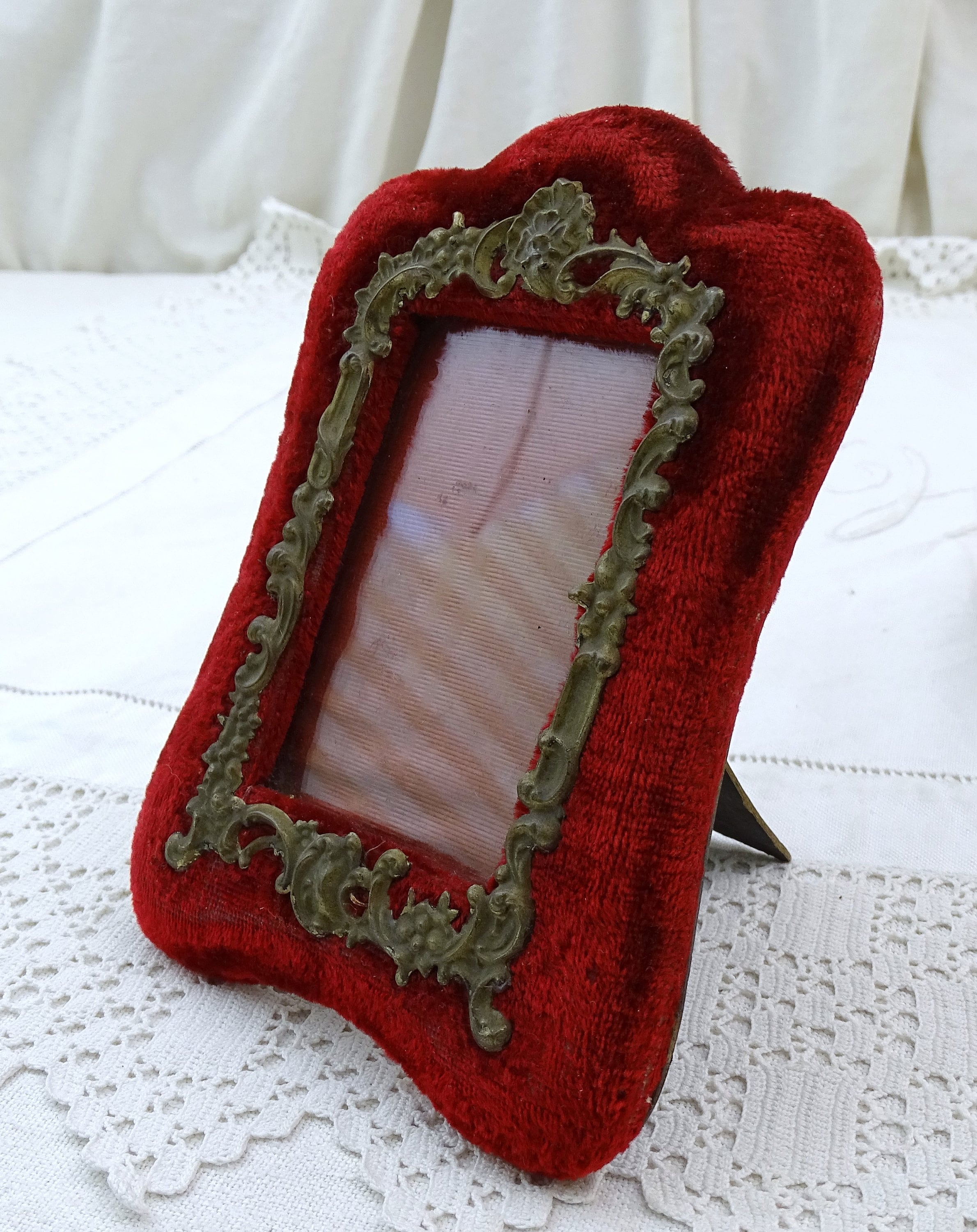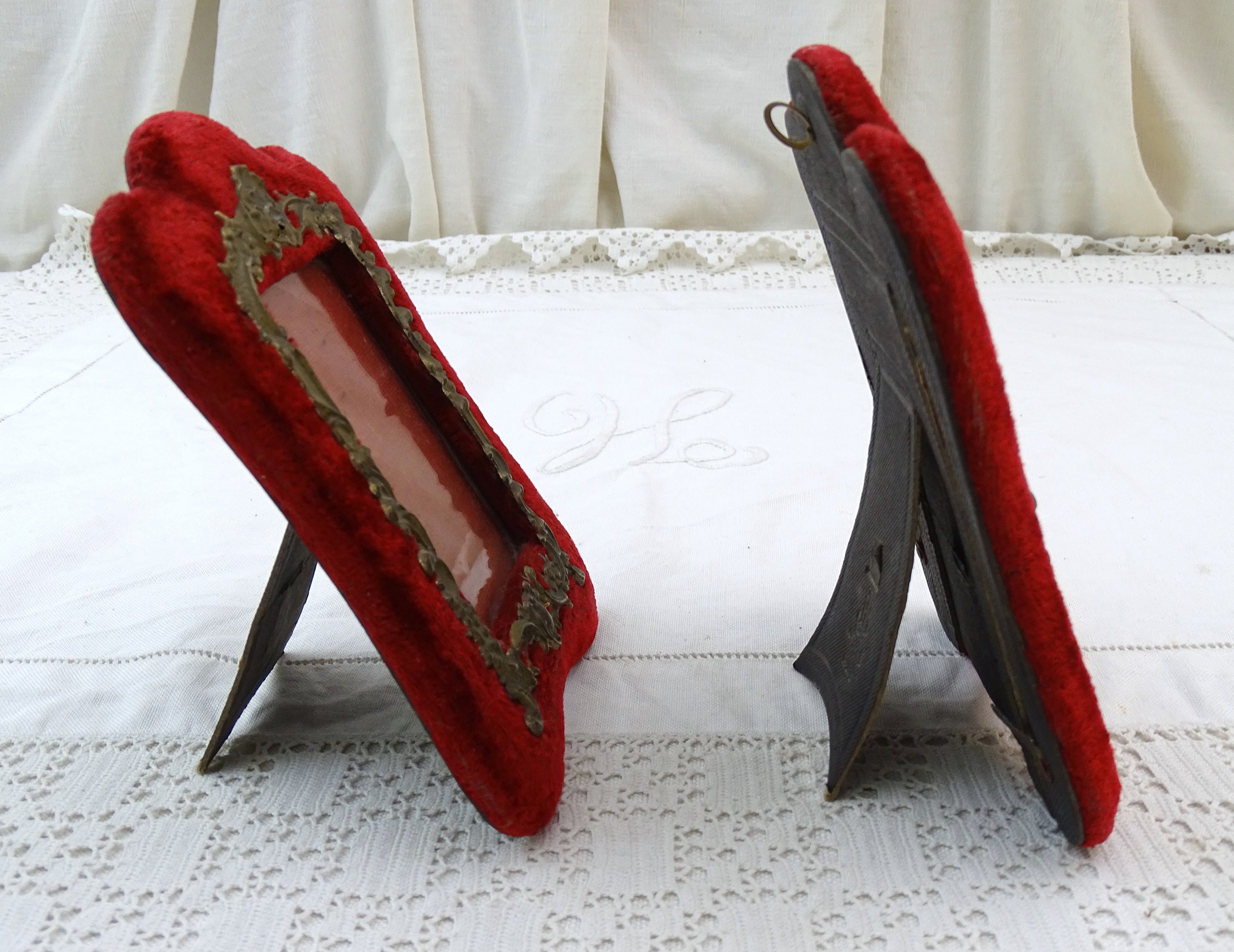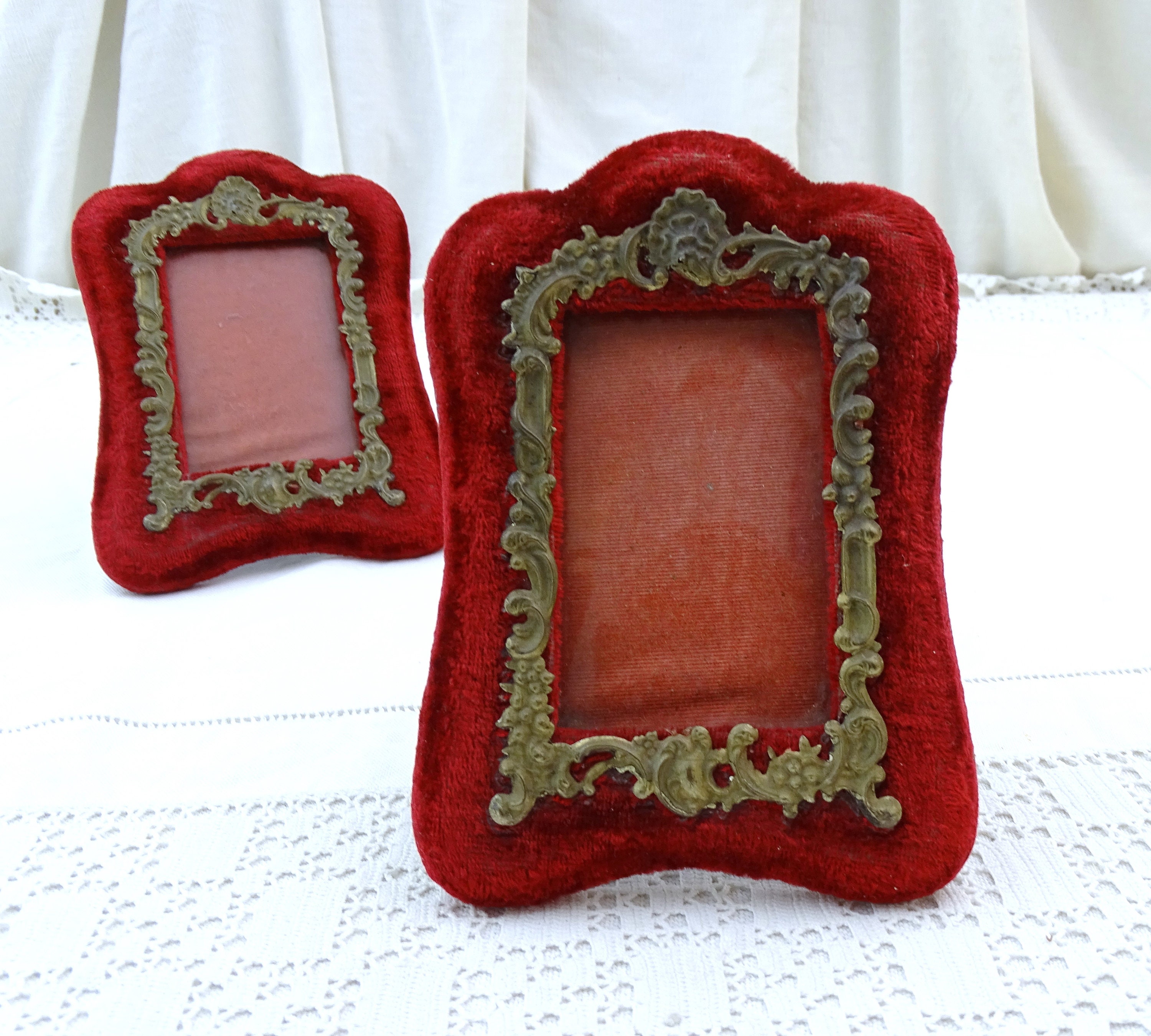 Pair of antique free standing or wall mounted portrait frames. Made of velvet covered wood with embossed metal ornamentation. Ca late 1800s.