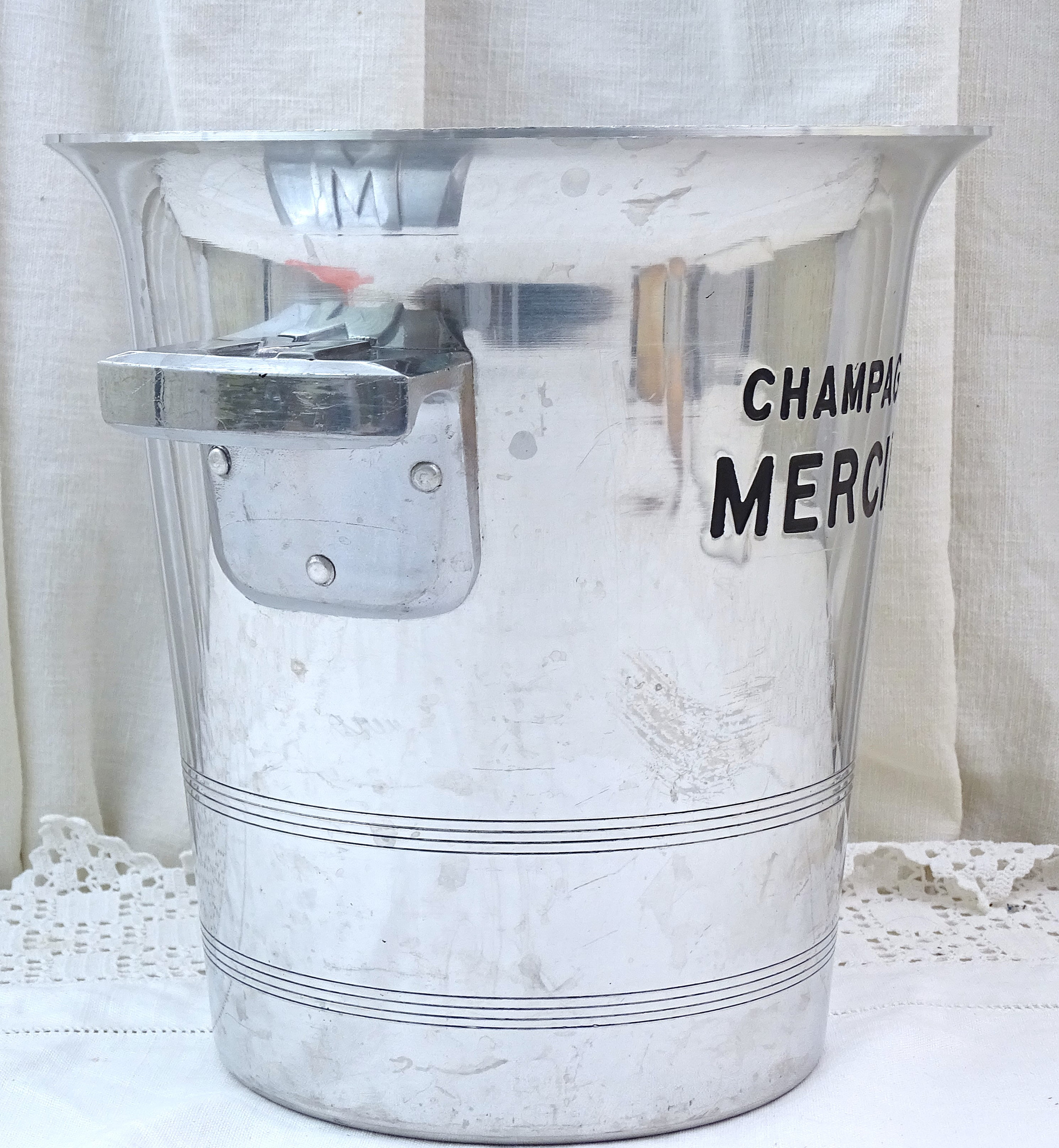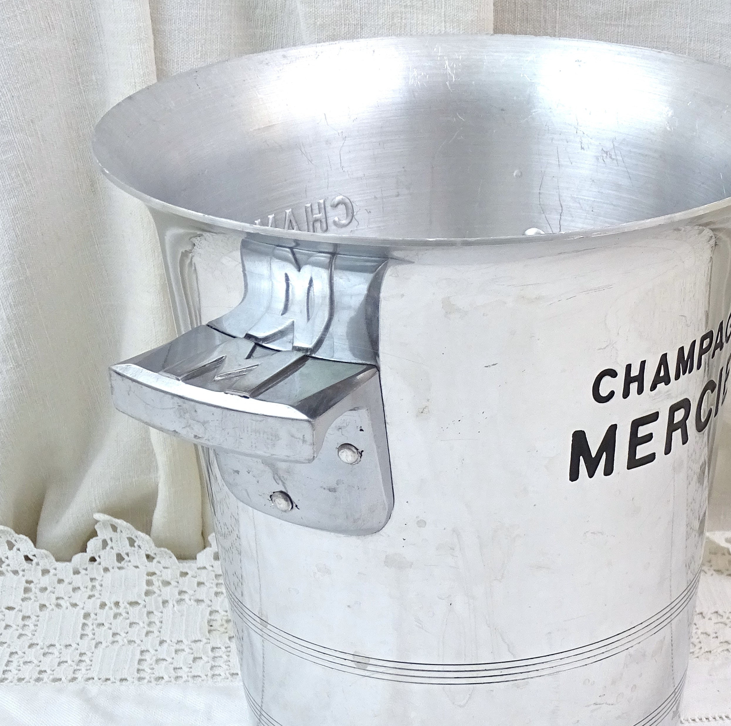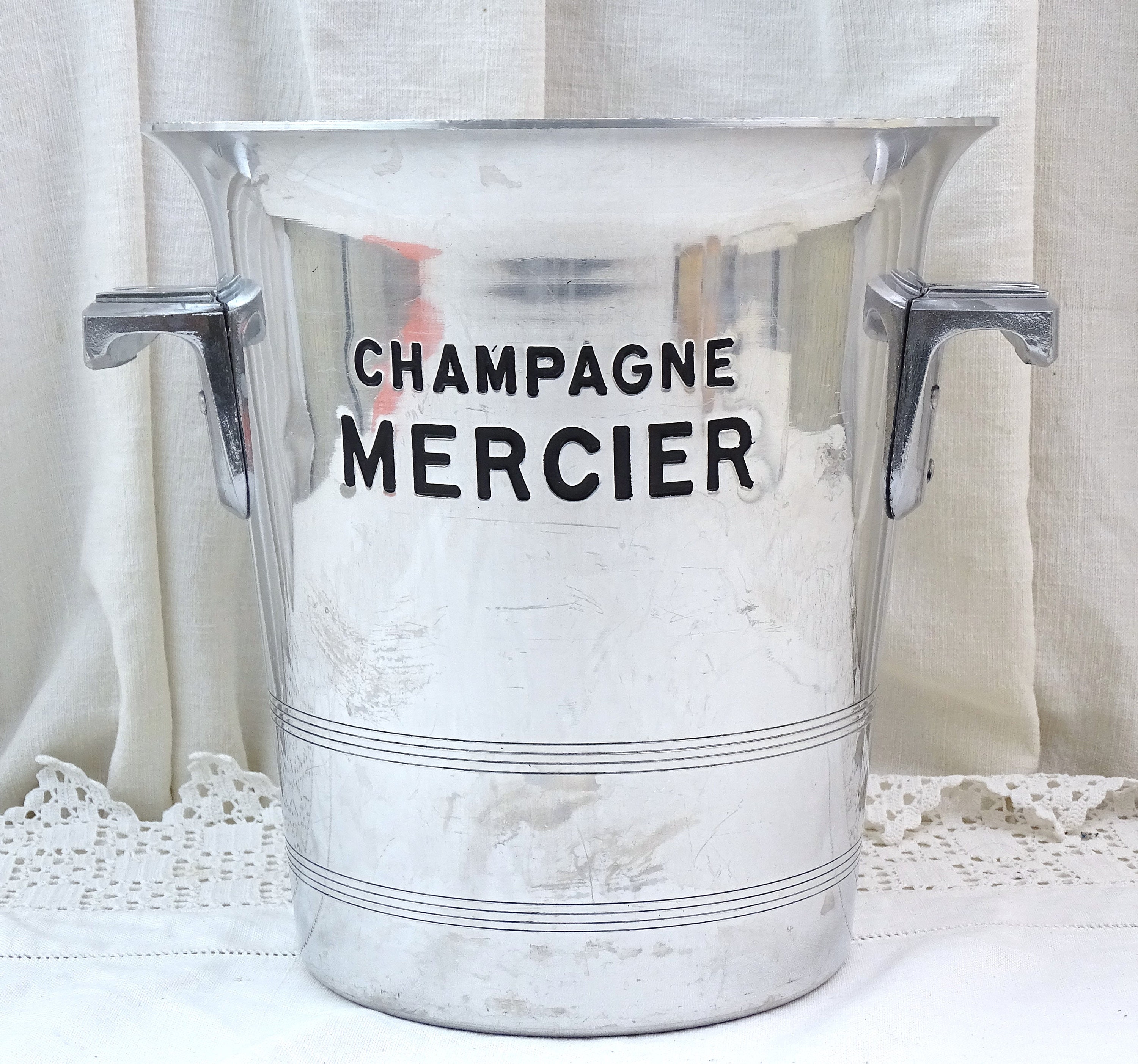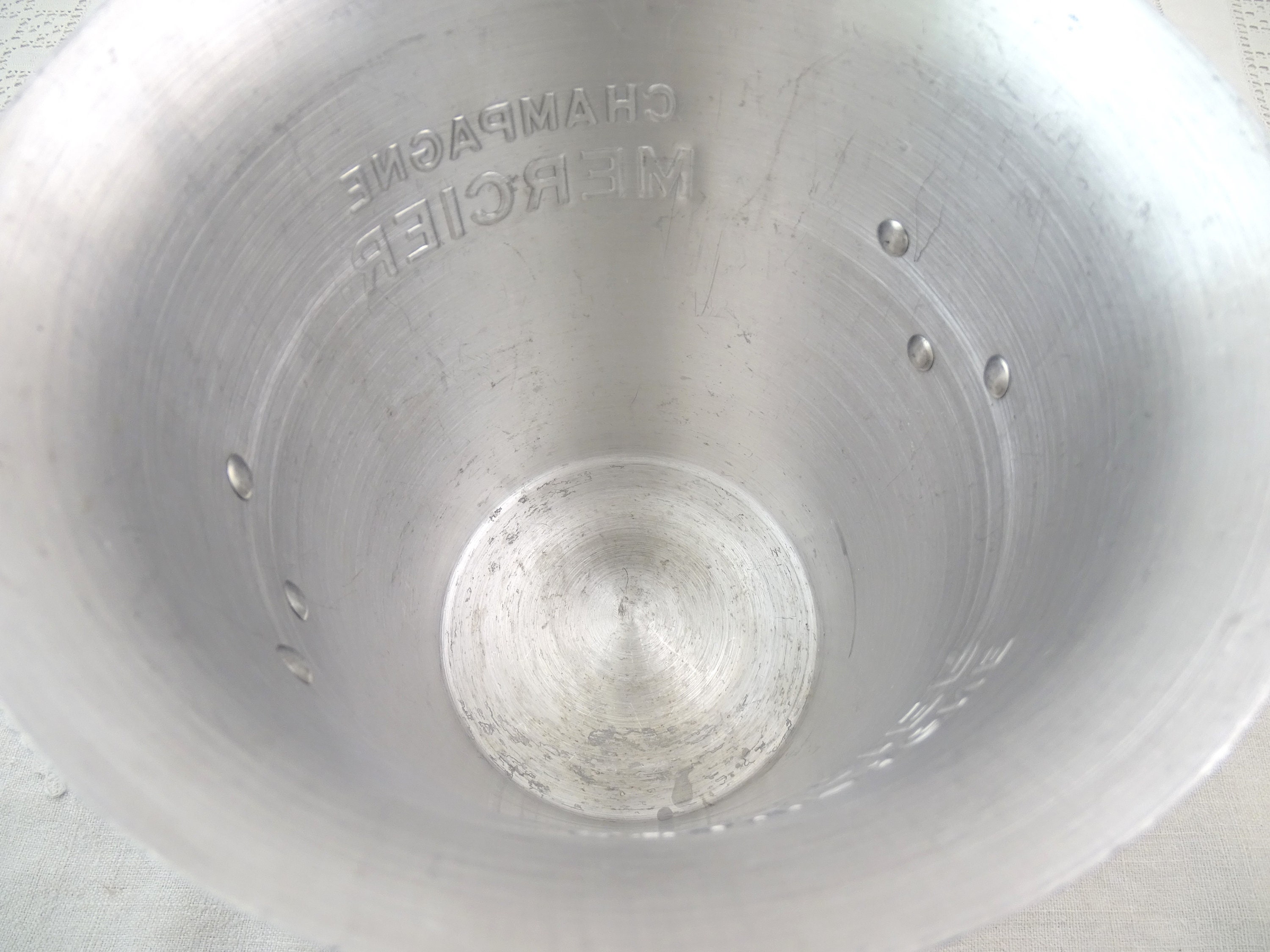 Vintage French Champagne wine bottle ice bucket. Promotional gift by the Champagne house Mercier. Made in France of white metal. Ca mid 1900s.