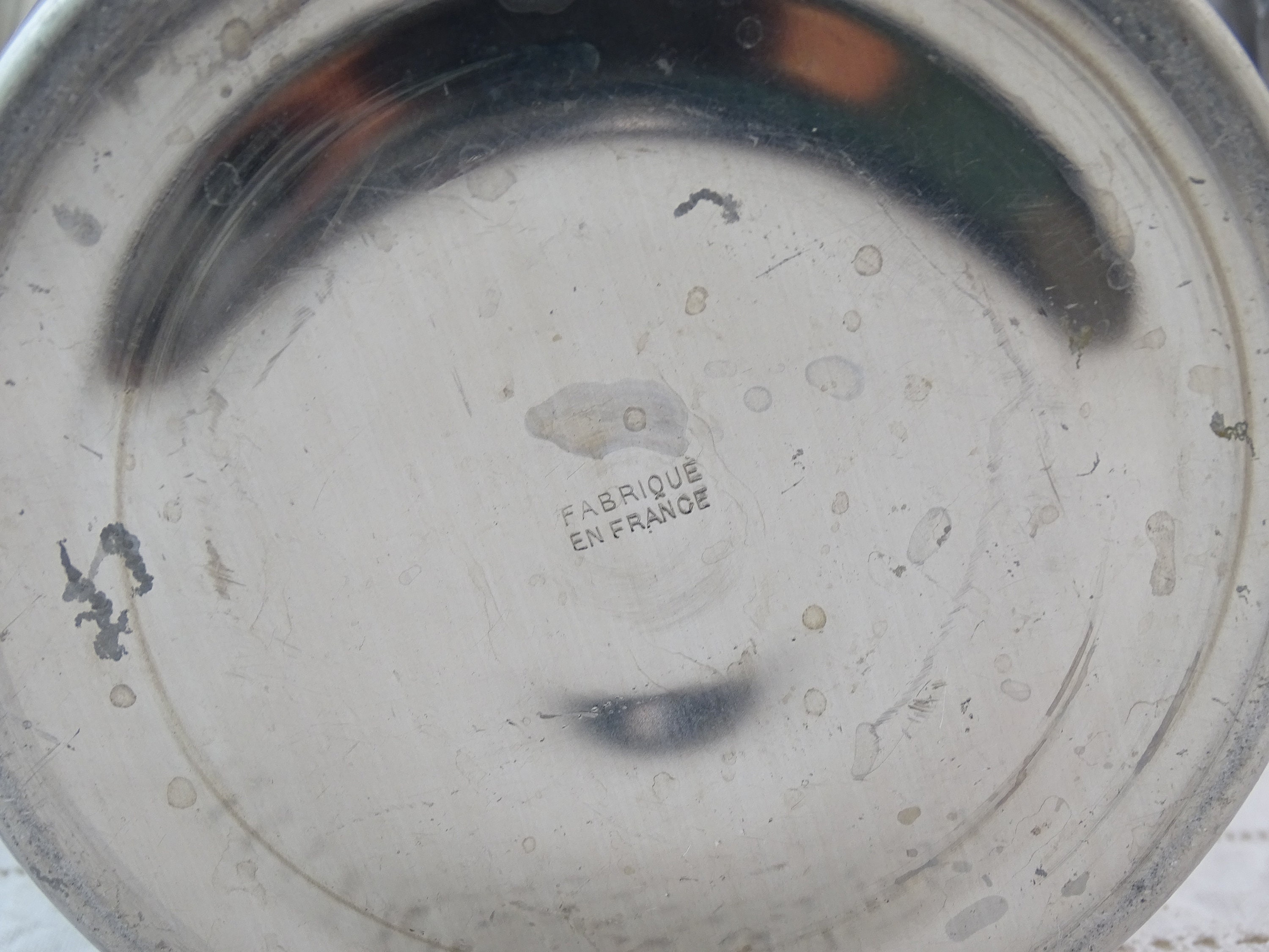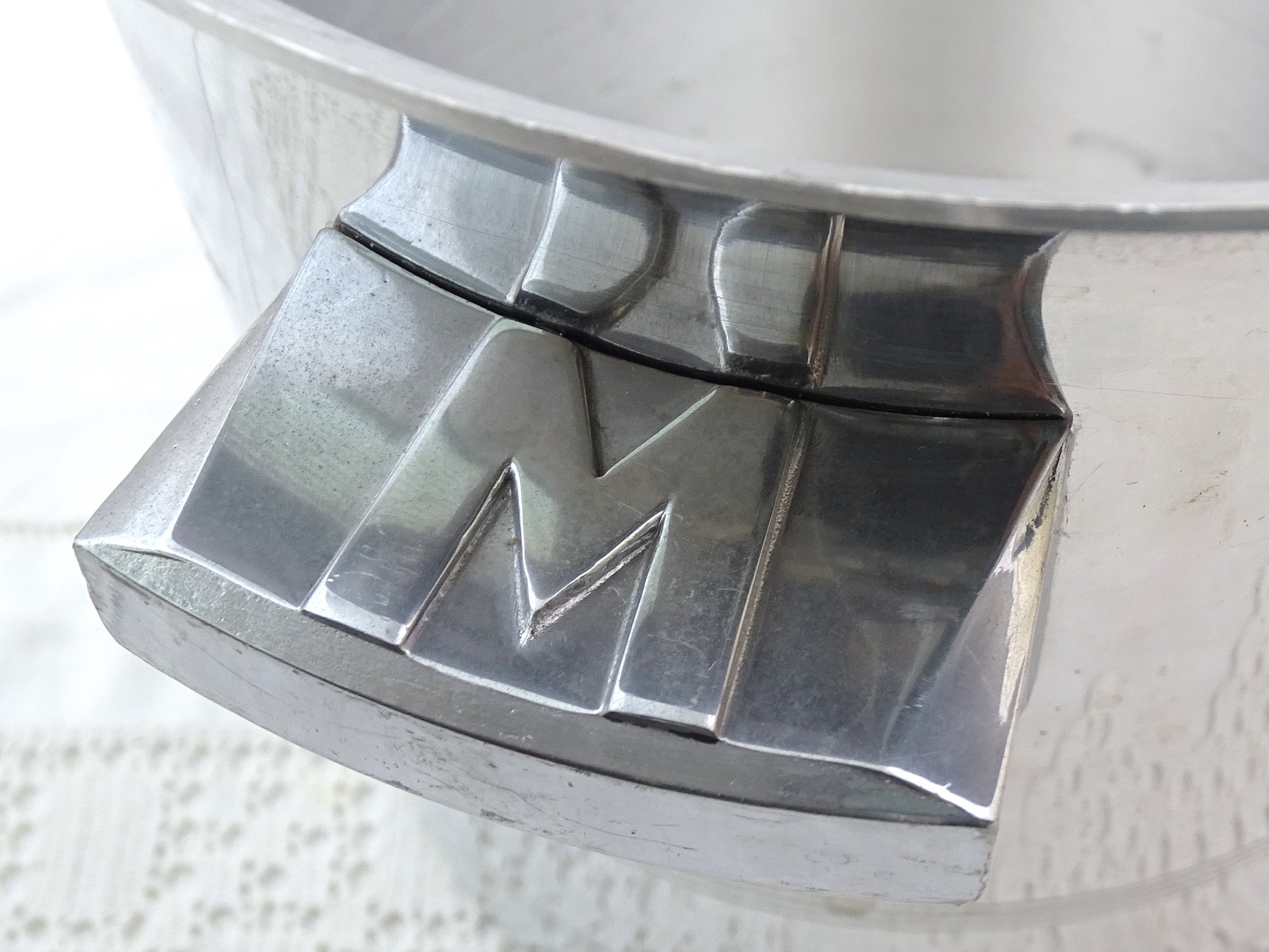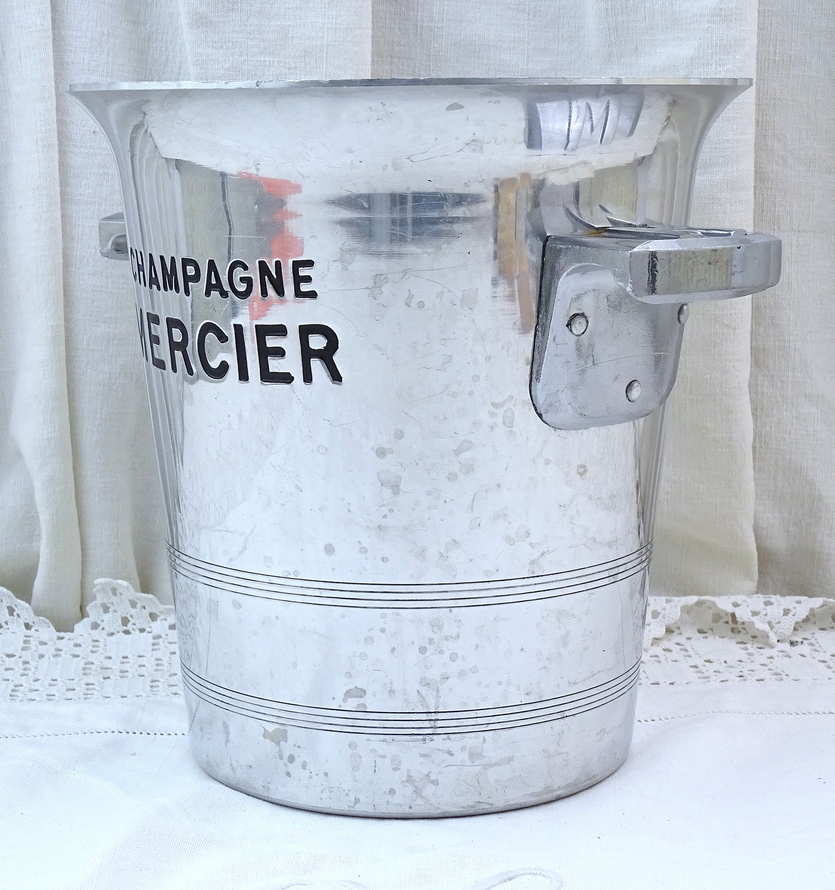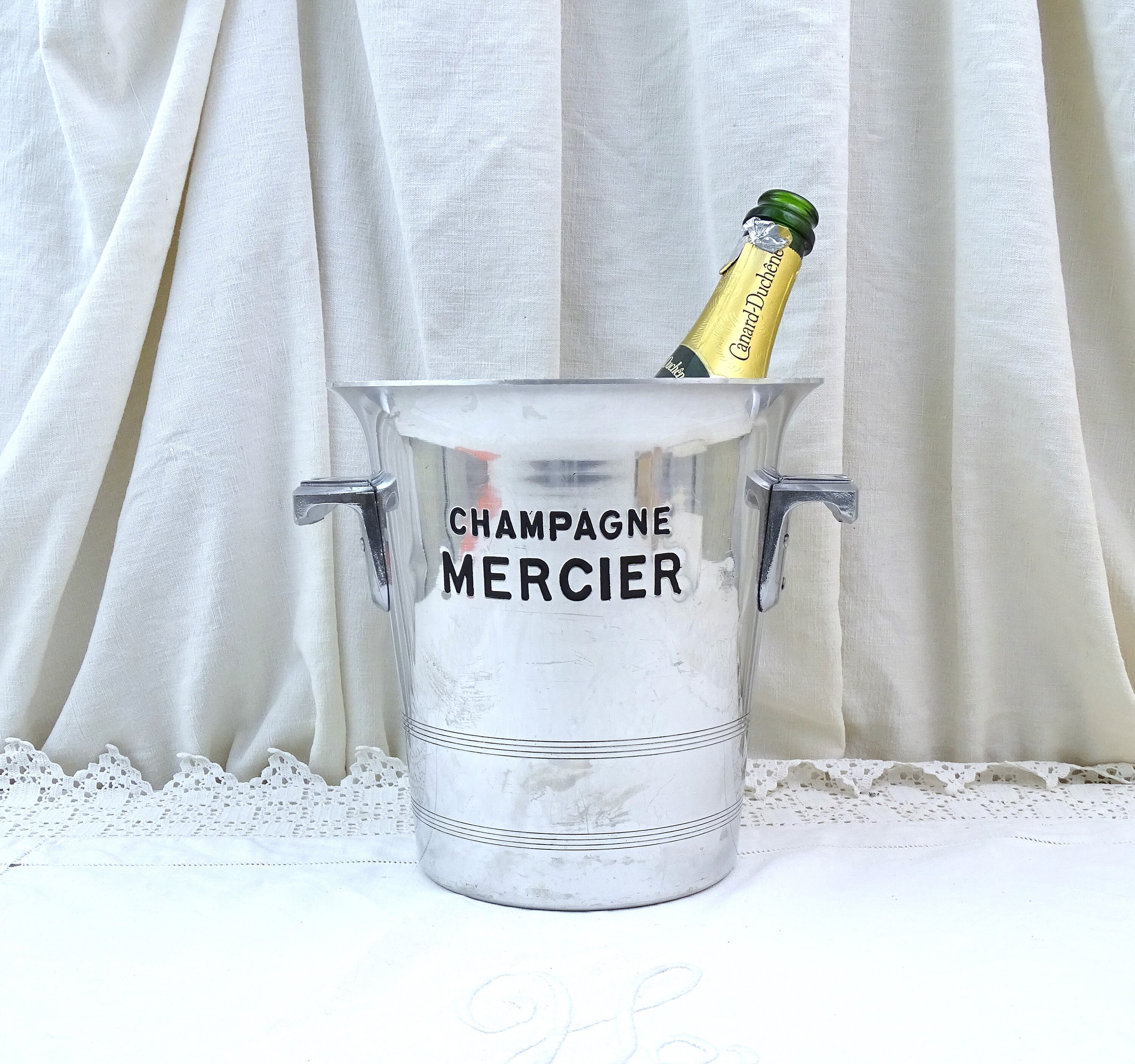 Vintage French Champagne wine bottle ice bucket. Promotional gift by the Champagne house Mercier. Made in France of white metal. Ca mid 1900s.