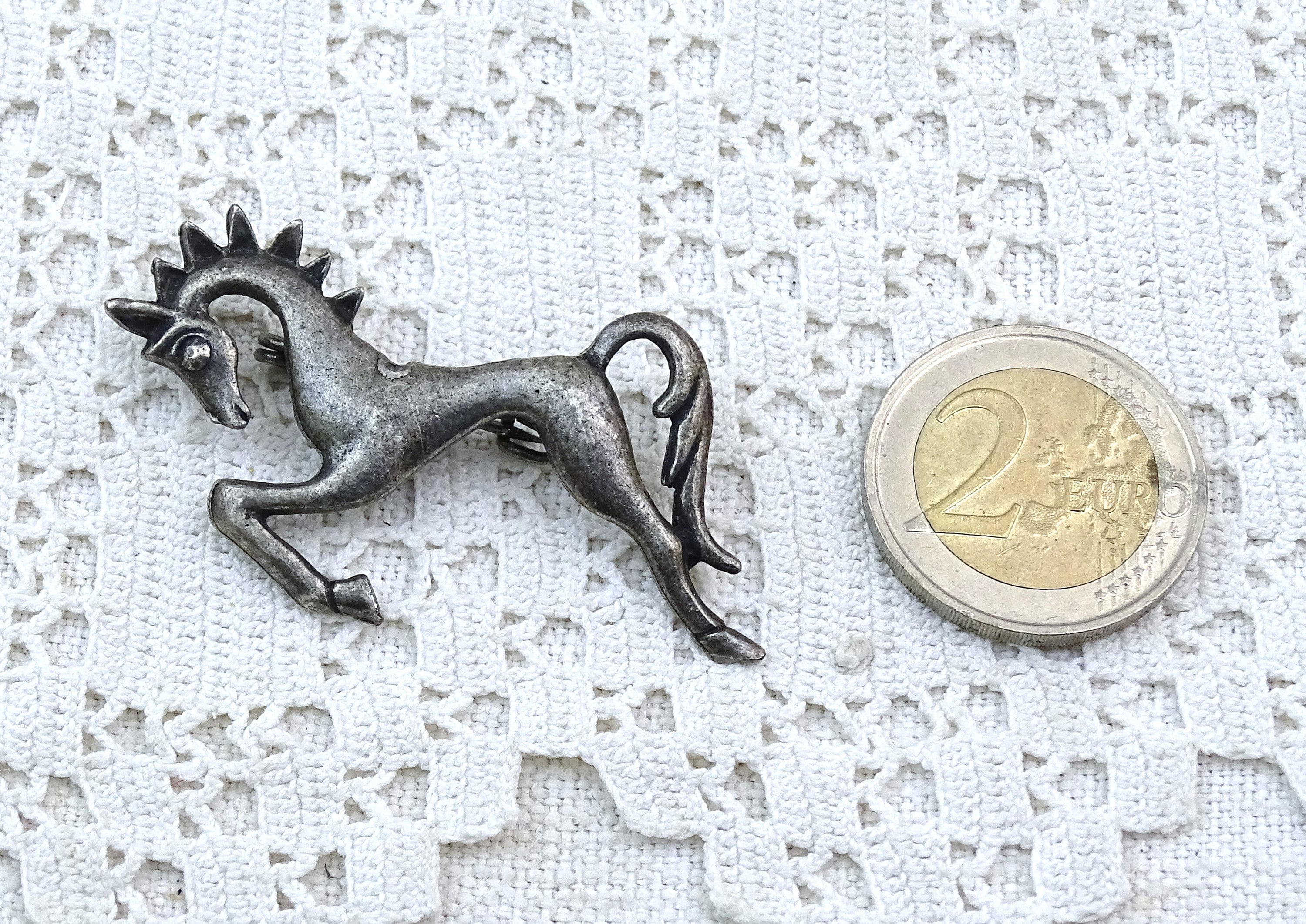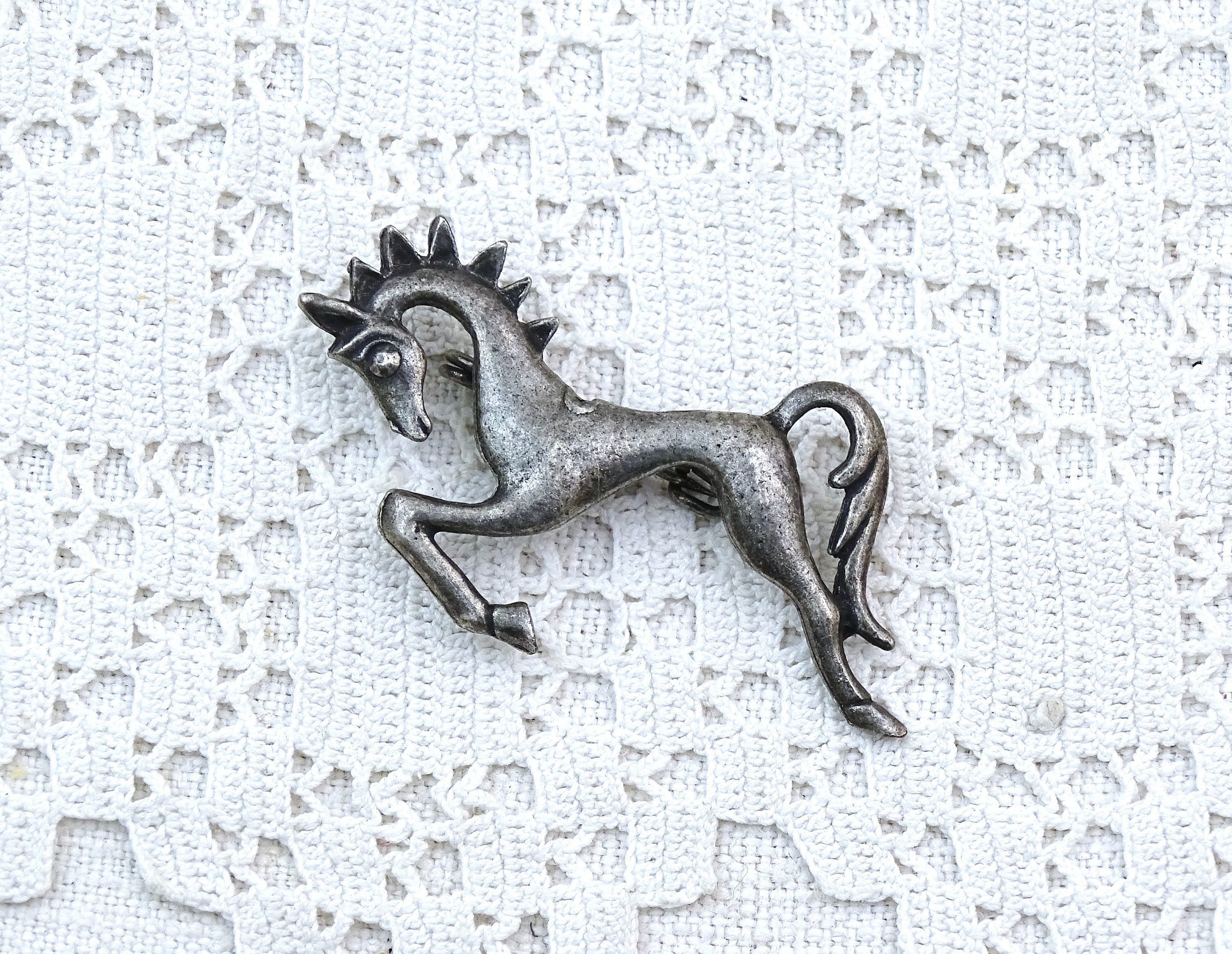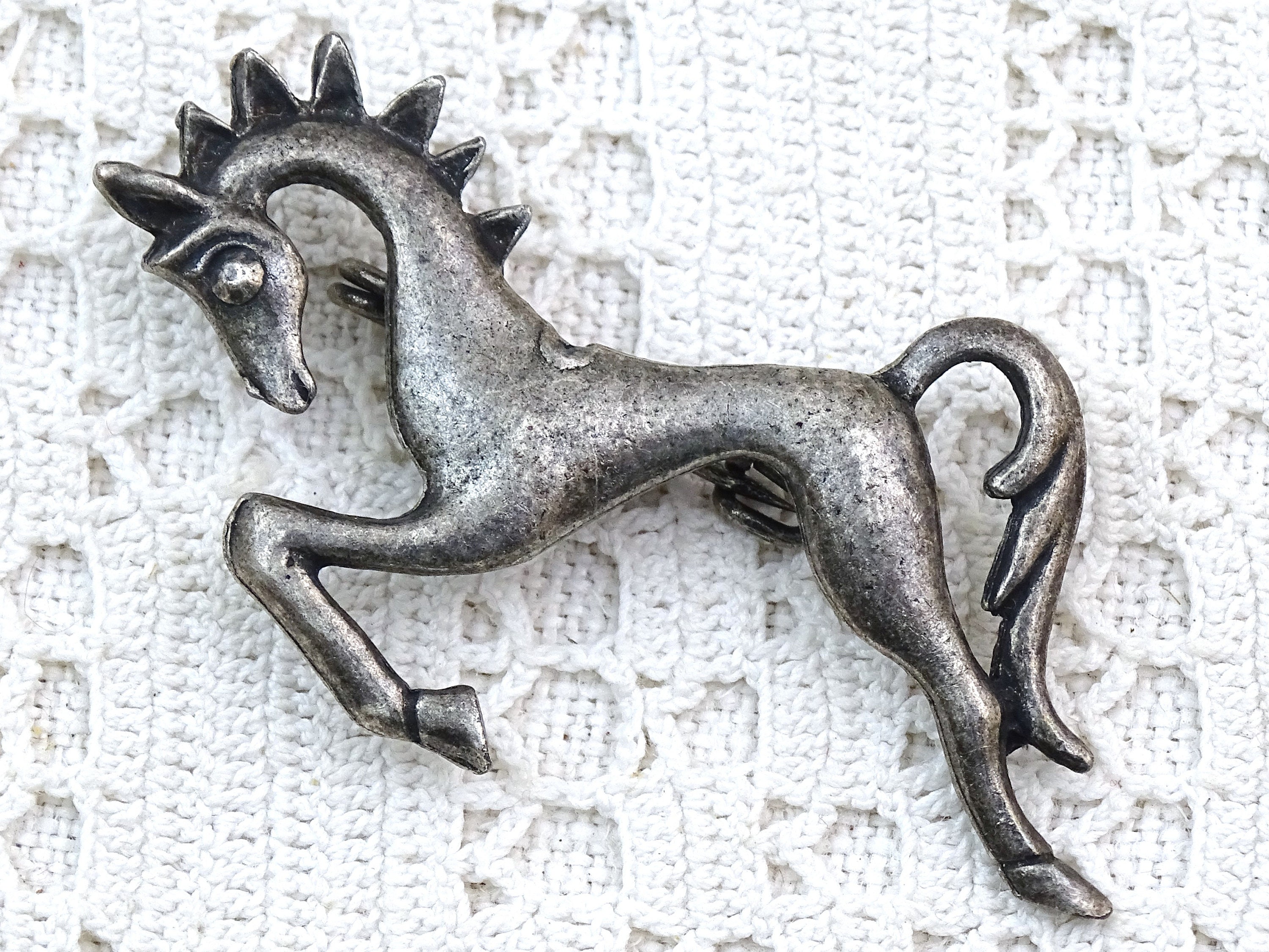 Vintage French stylized prancing horse brooch. Made of silver tone metal ( possibly silver but there is not hallmark) Ca 1960s.