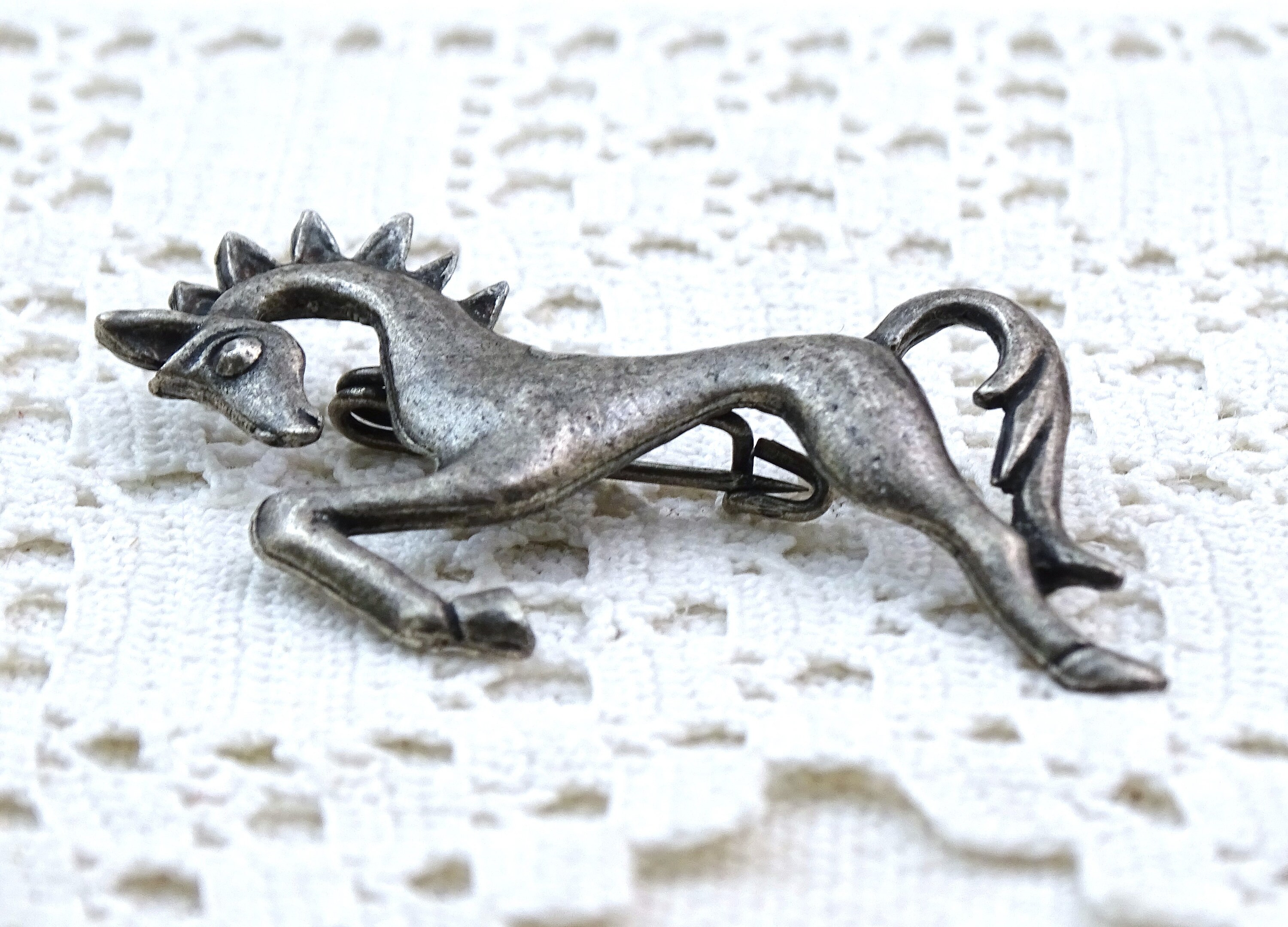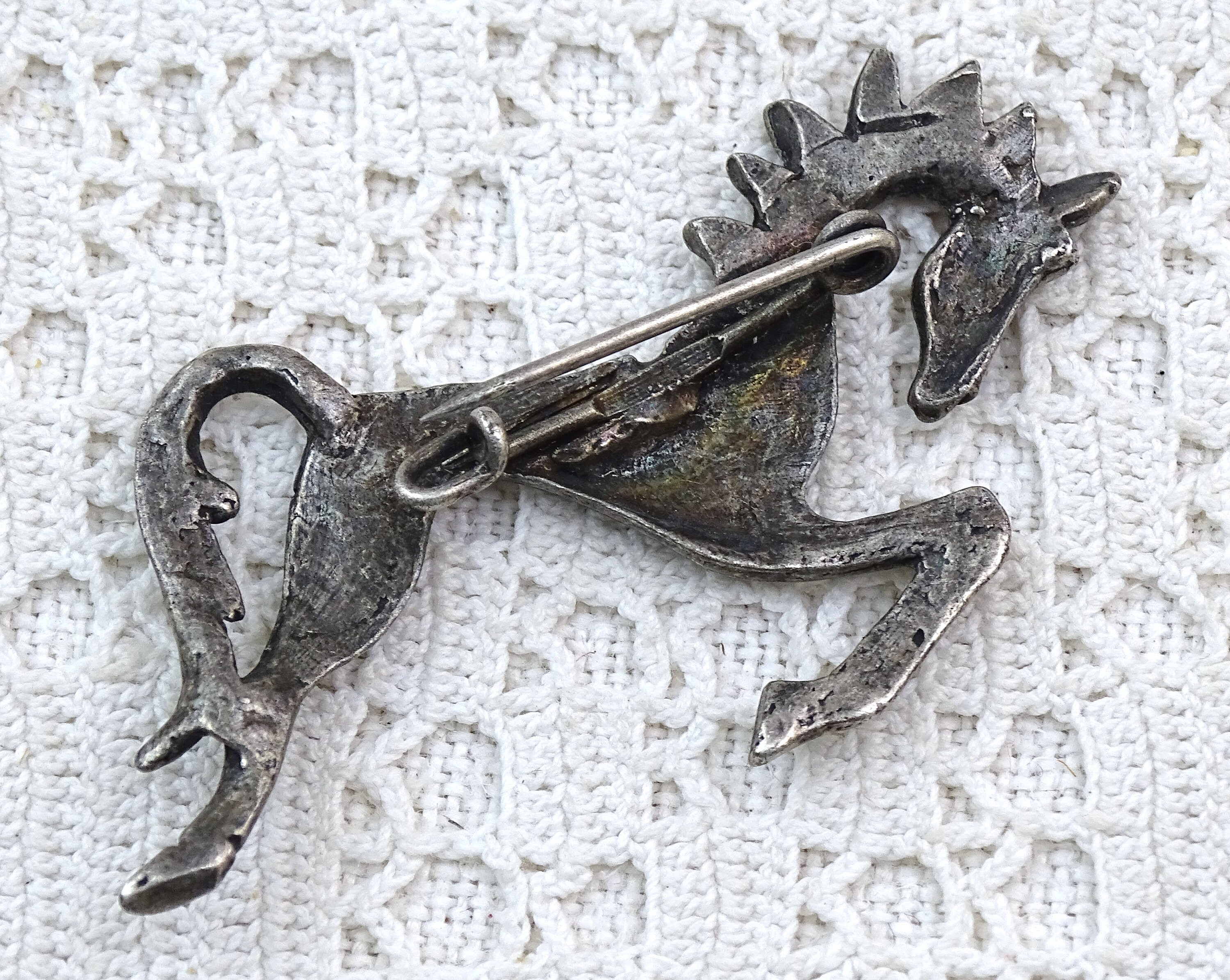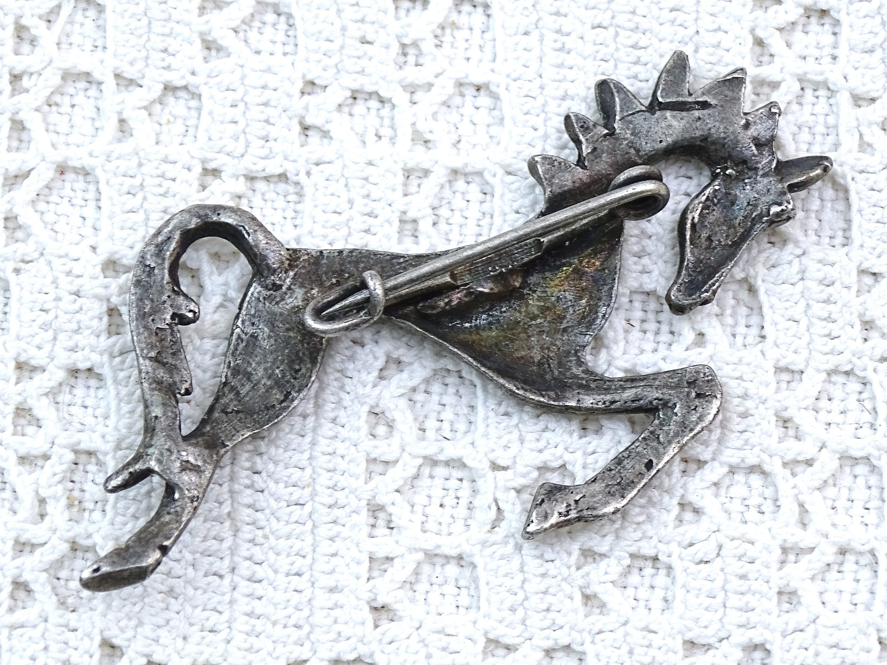 Vintage French stylized prancing horse brooch. Made of silver tone metal ( possibly silver but there is not hallmark) Ca 1960s.