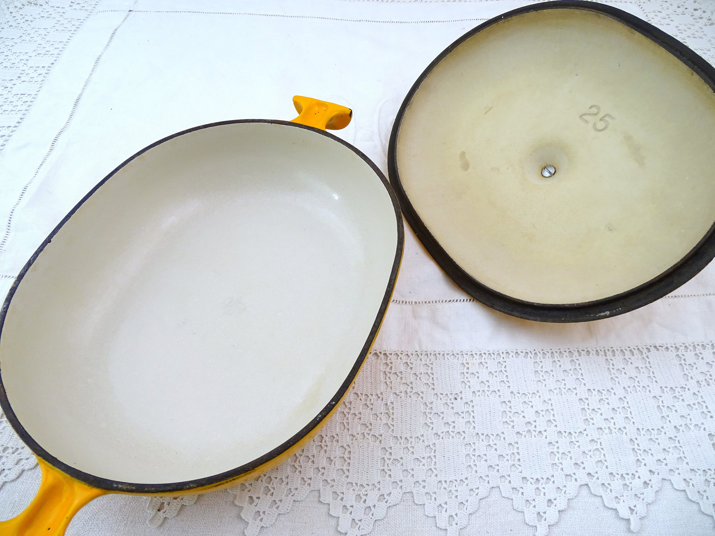 Vintage French Le Creuset pan and lid number 25. Designed by Enzo Mari in 1972 called the "La Mama" range. Orange and white enameled cast iron. Made by Le Creuset renown French cookware manufacturers. Ca 1970s.