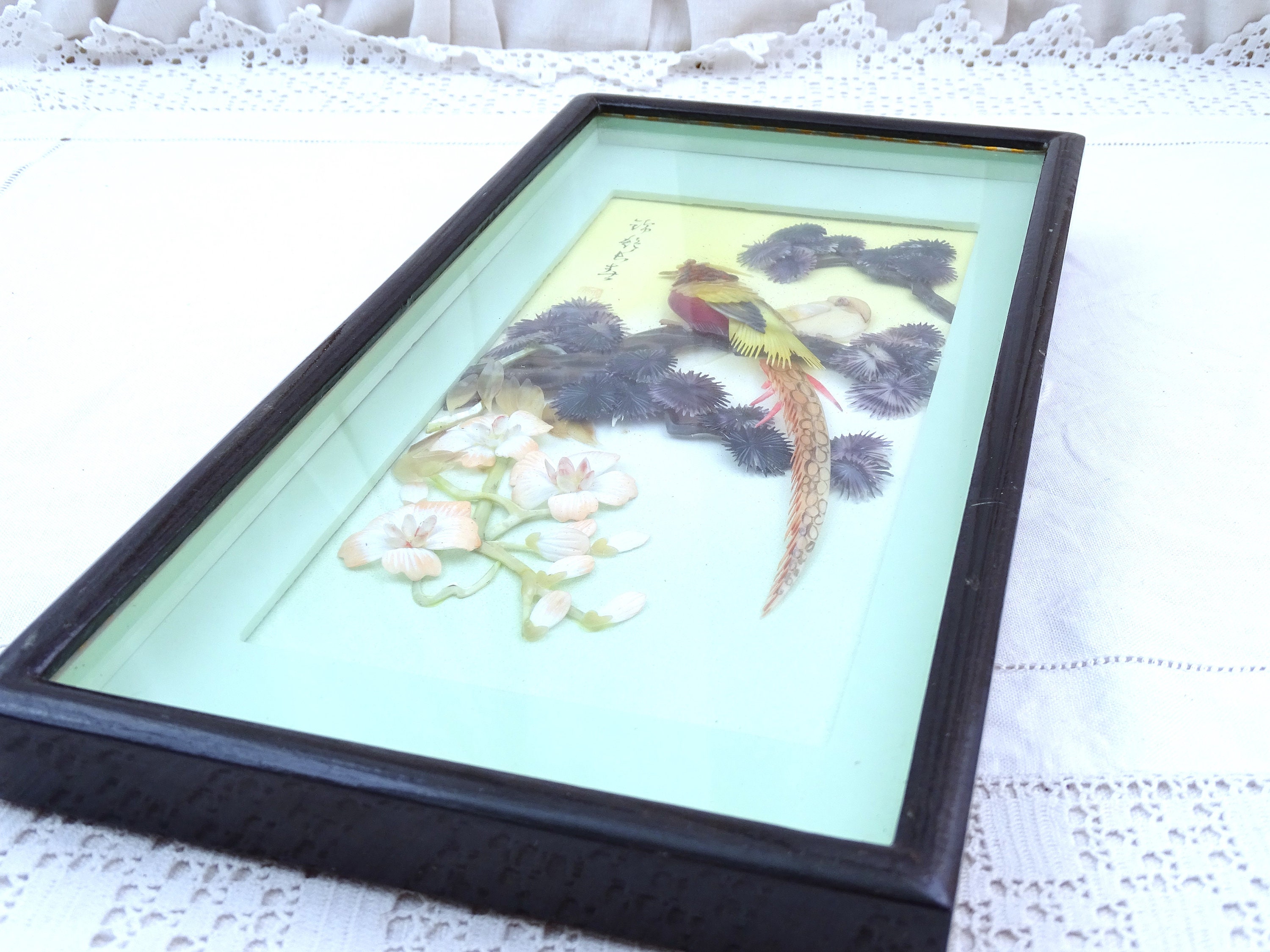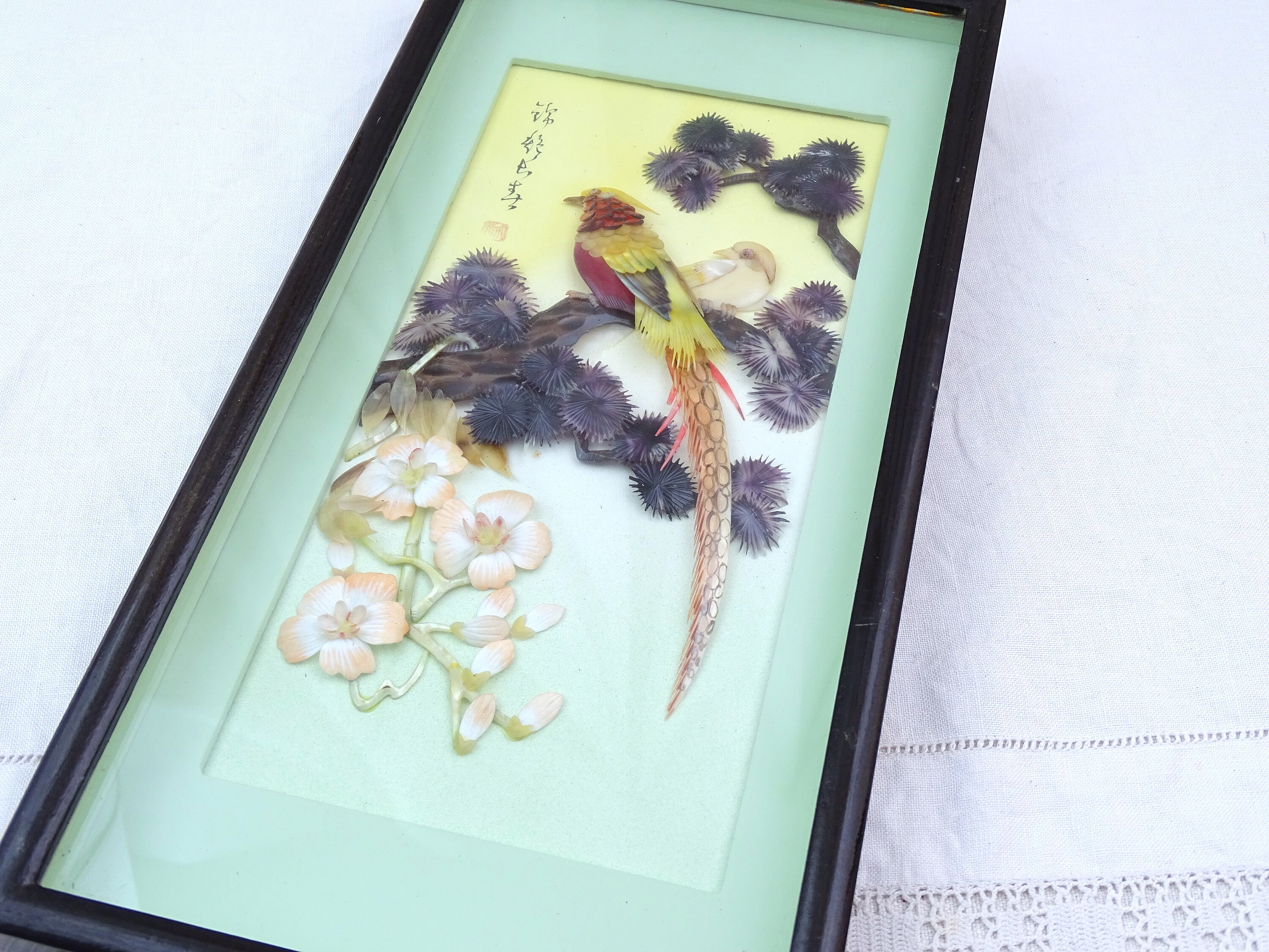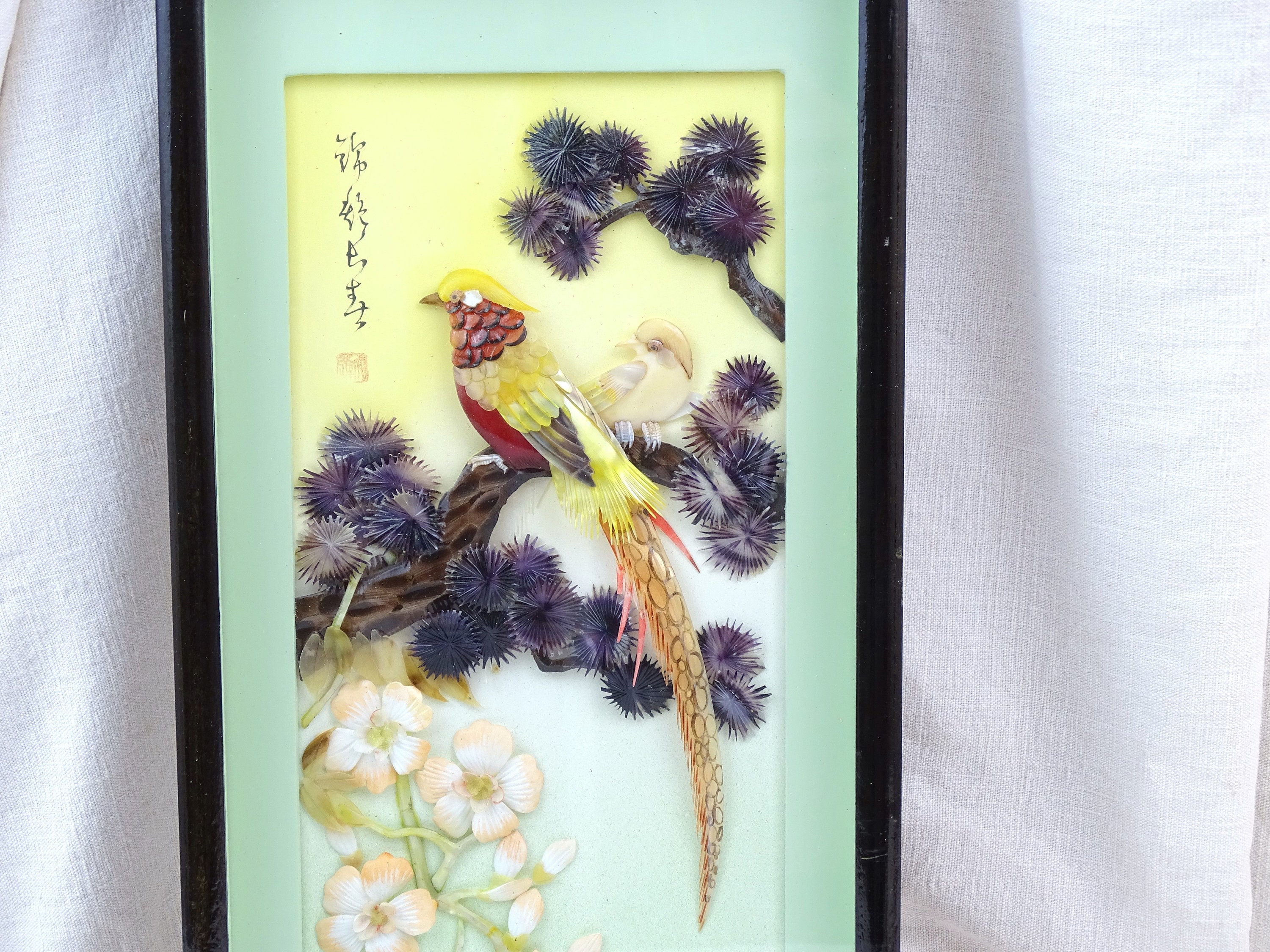 Vintage Asian shell art with 2 parrots. Made of shells with a wooden and glass frame. Ca 1980s.