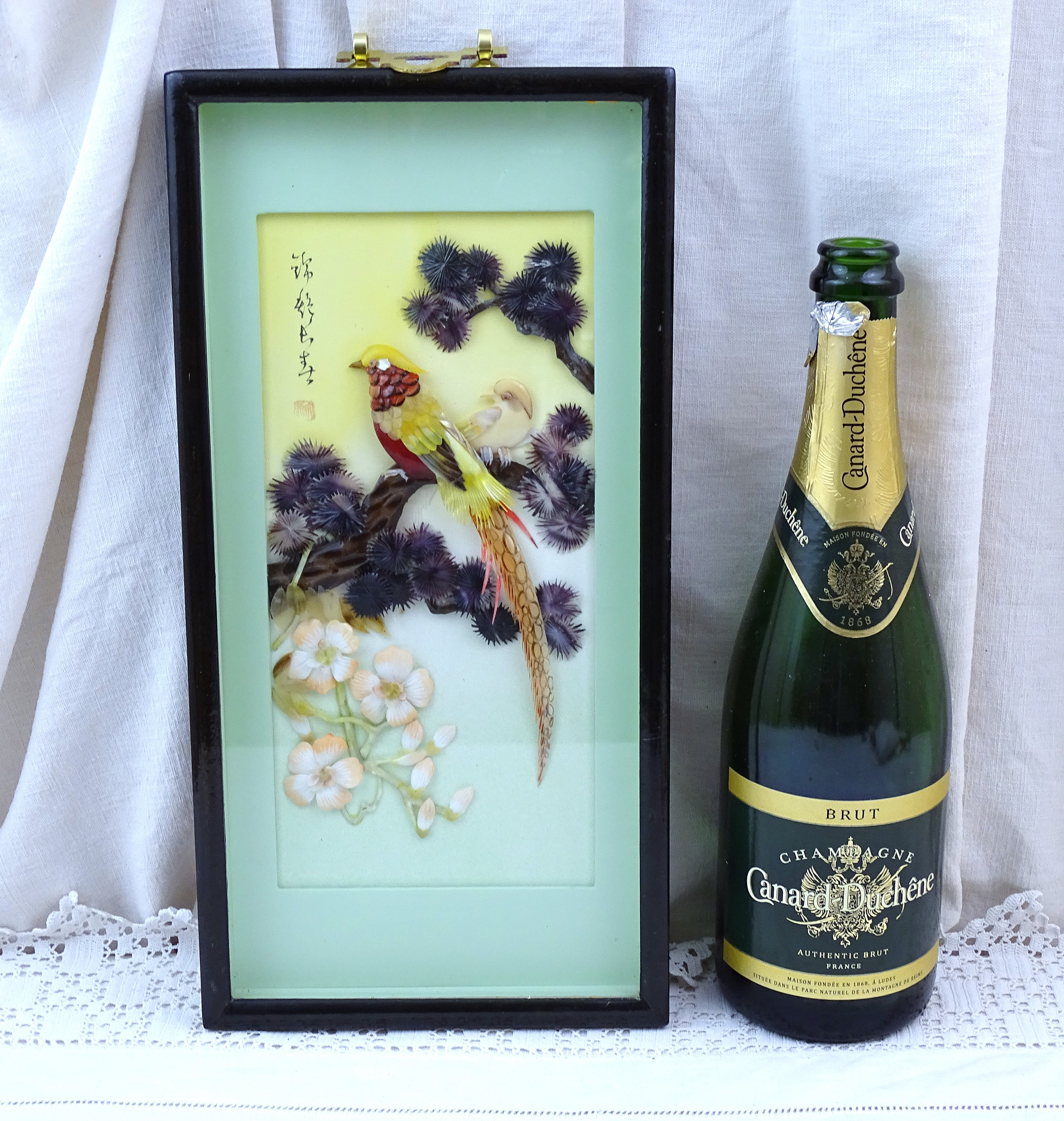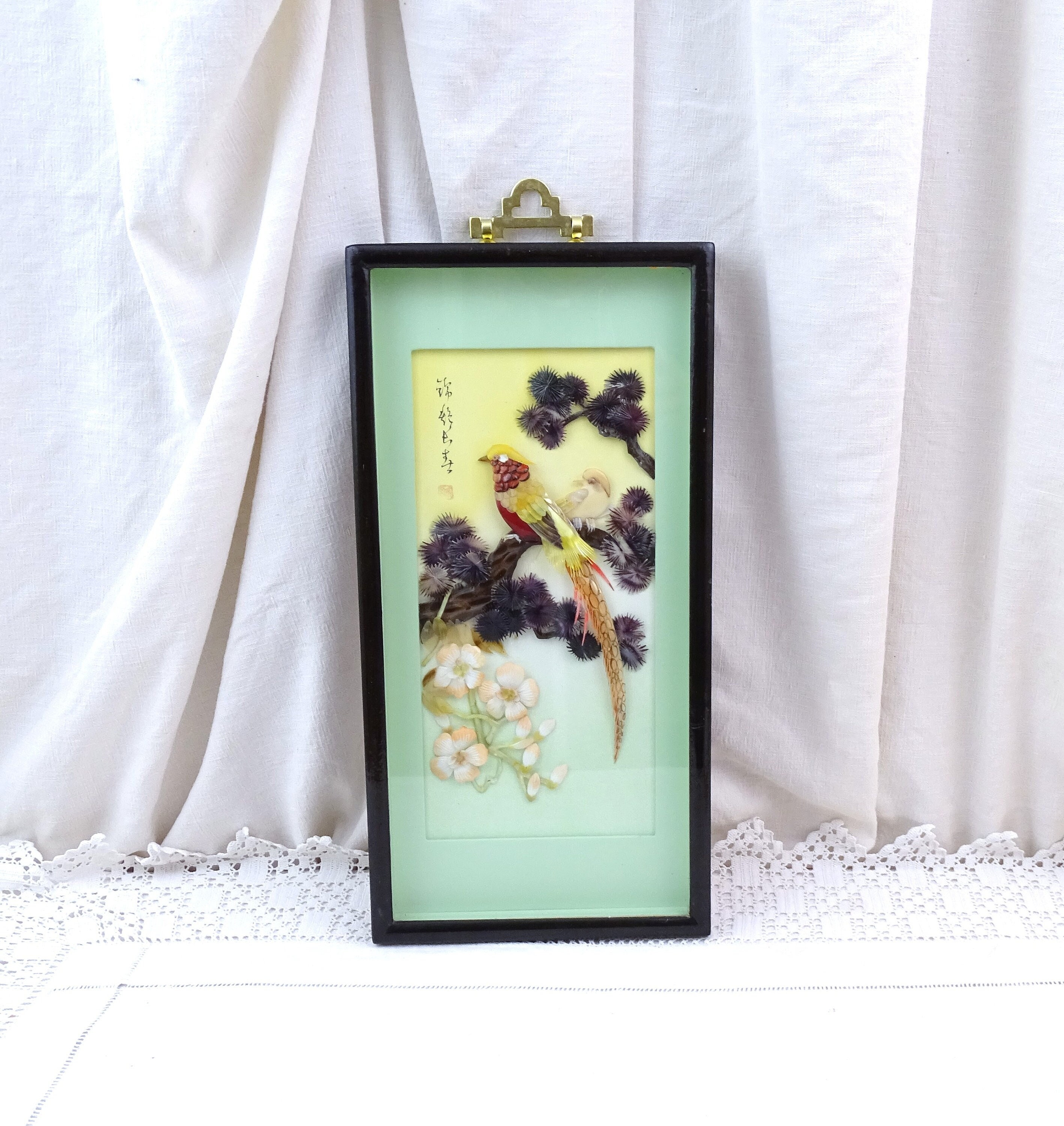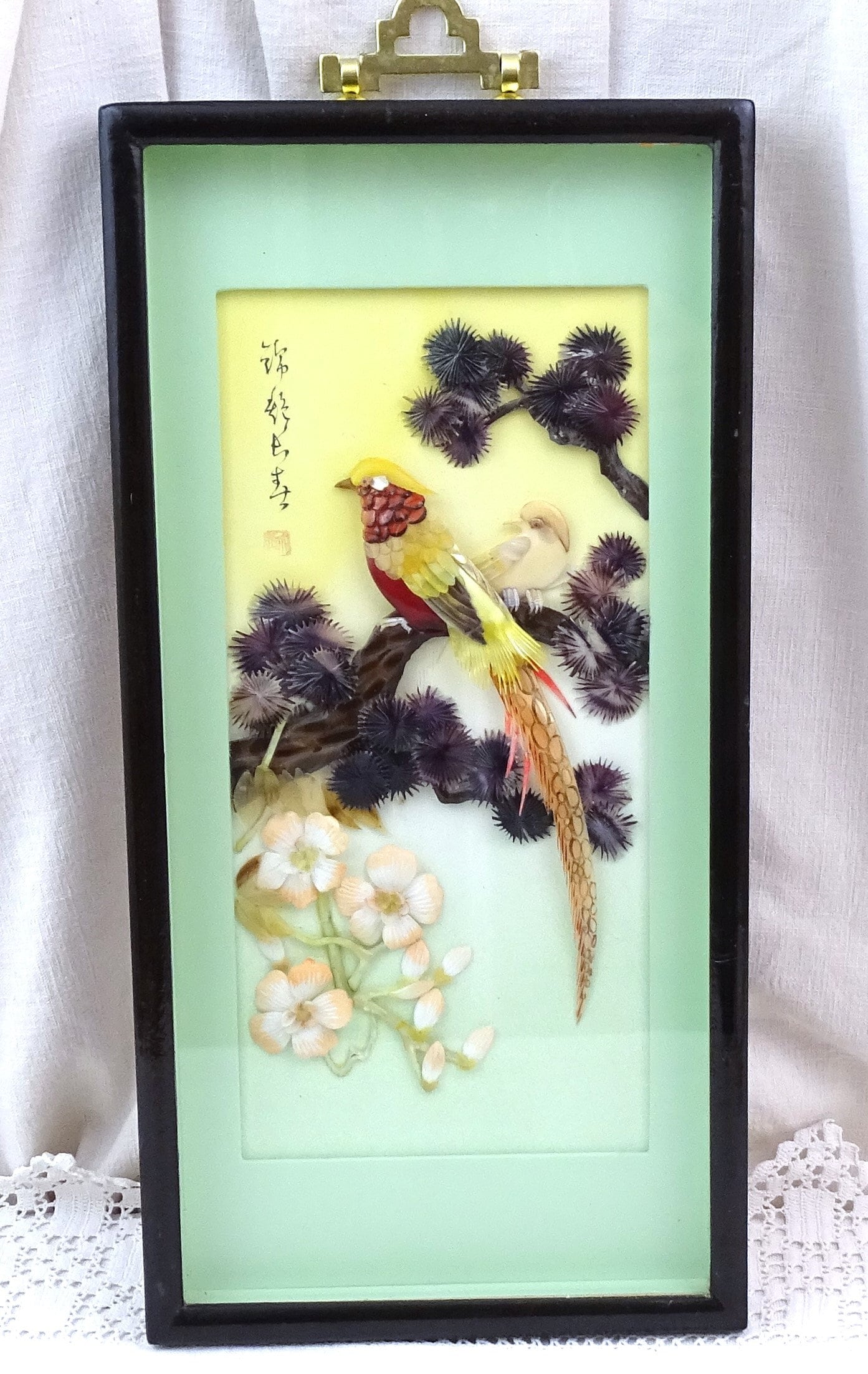 Vintage Asian shell art with 2 parrots. Made of shells with a wooden and glass frame. Ca 1980s.