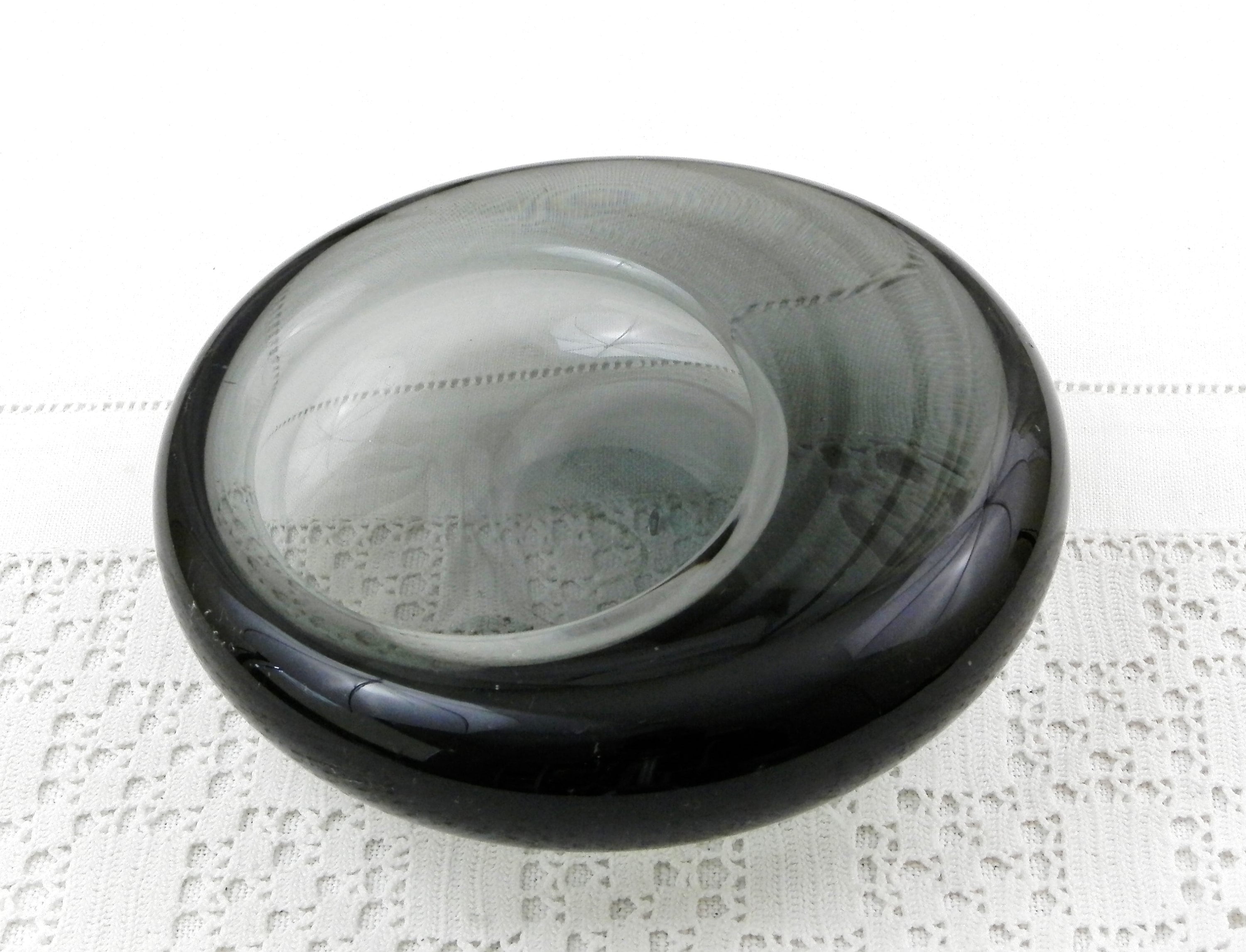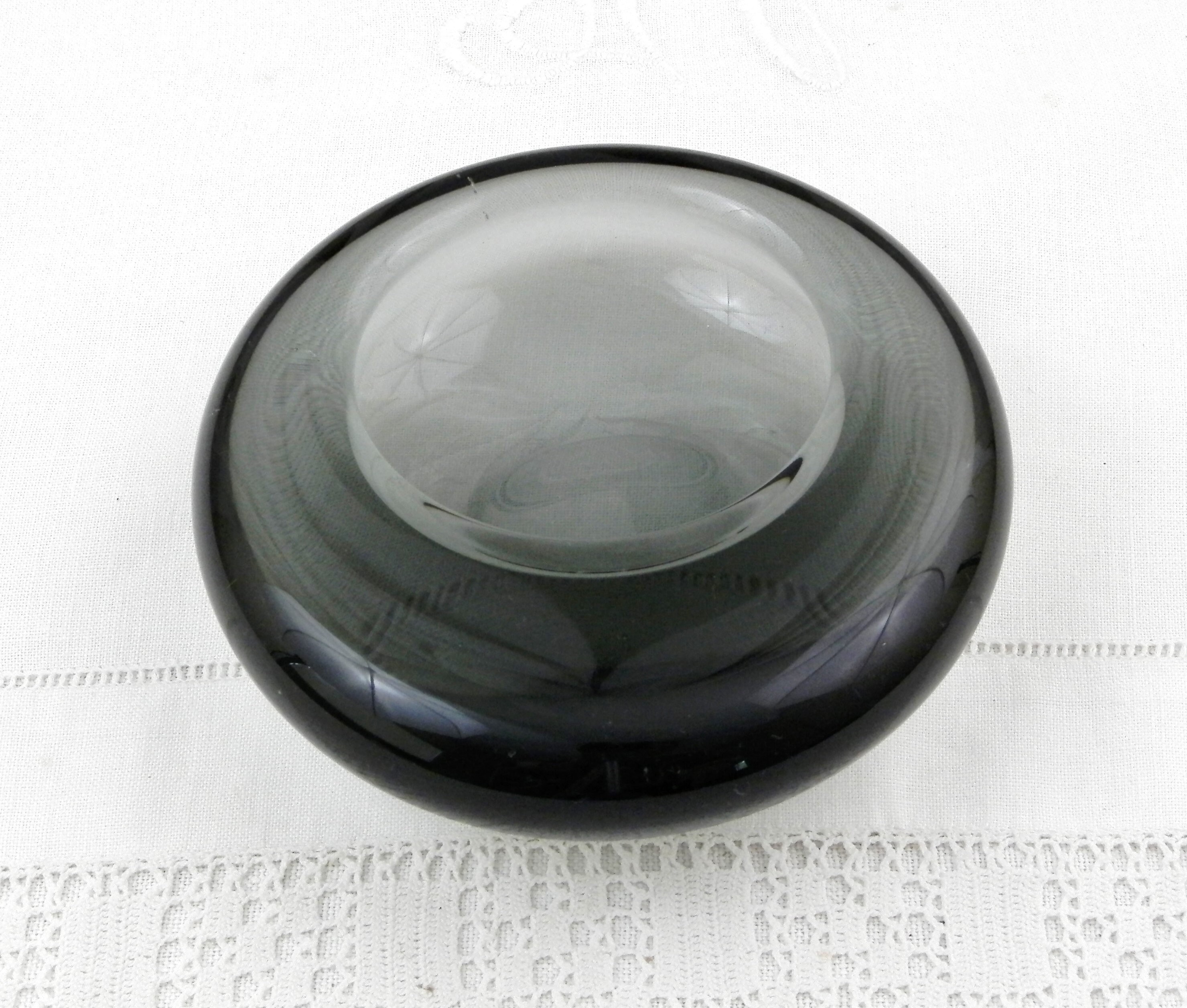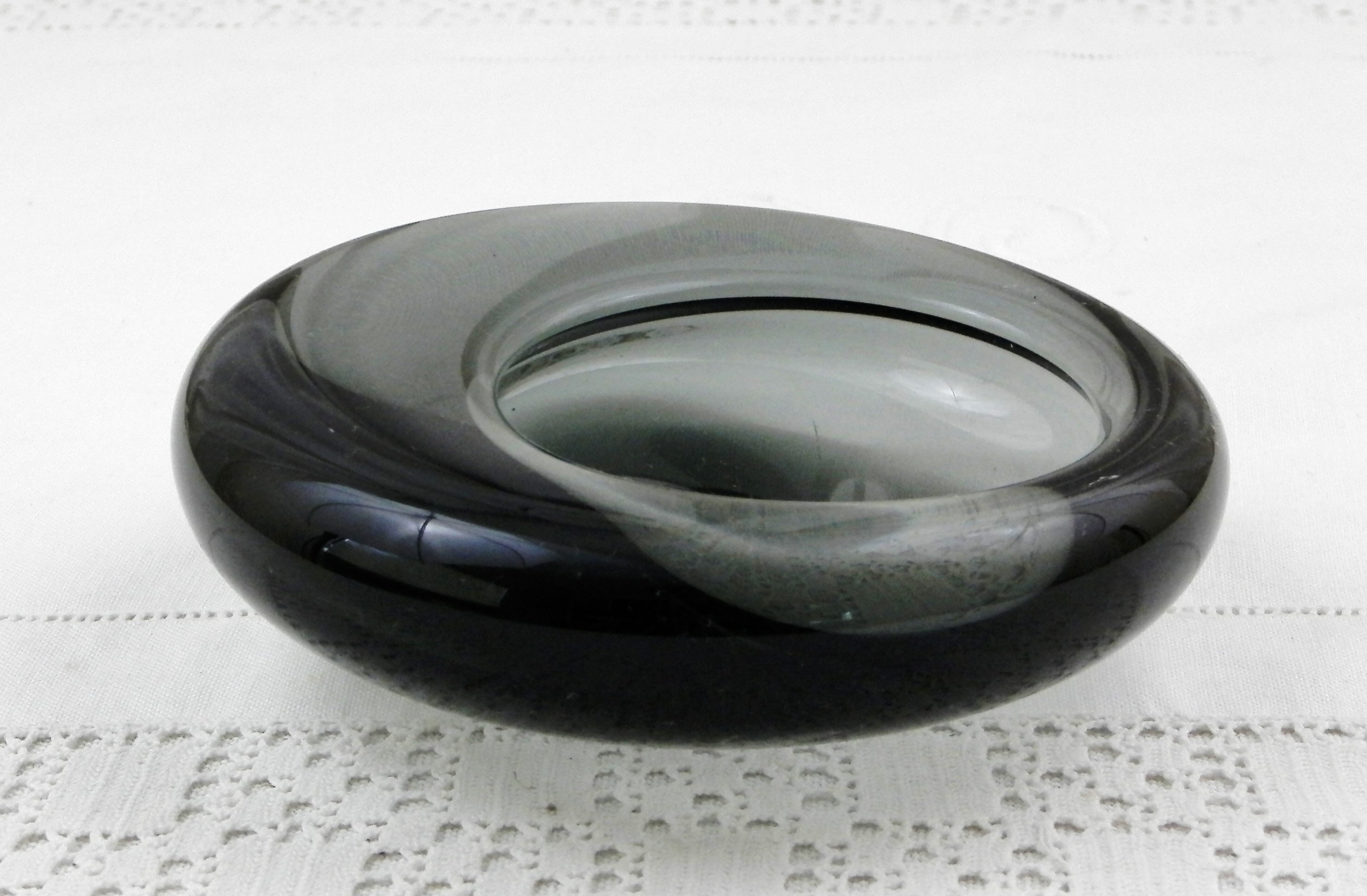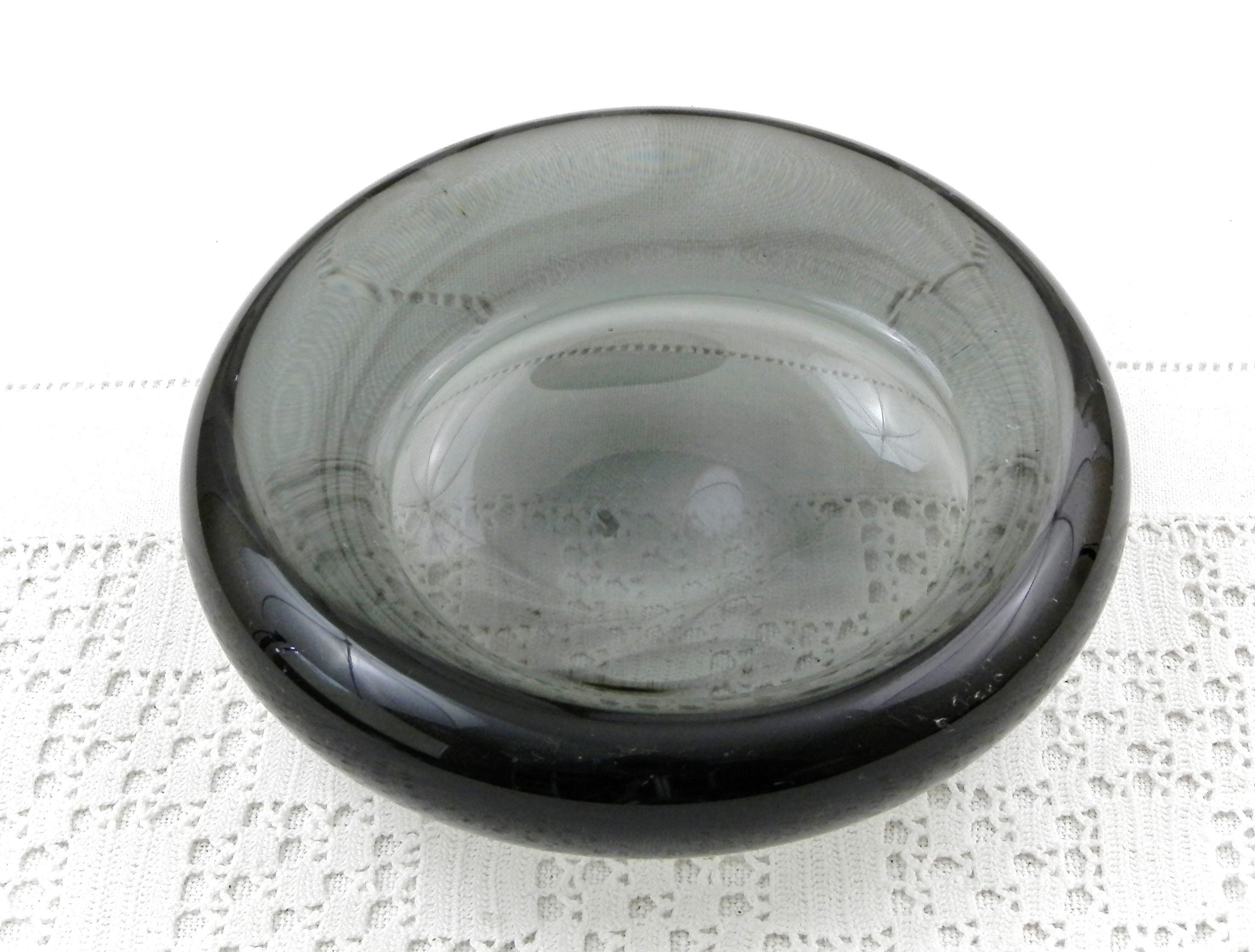 Vintage Danish art glass trinket dish. Designed by Per Lütken for Holmegaard Model No 16039. Made of smoked gray glass. Ca 1960.
