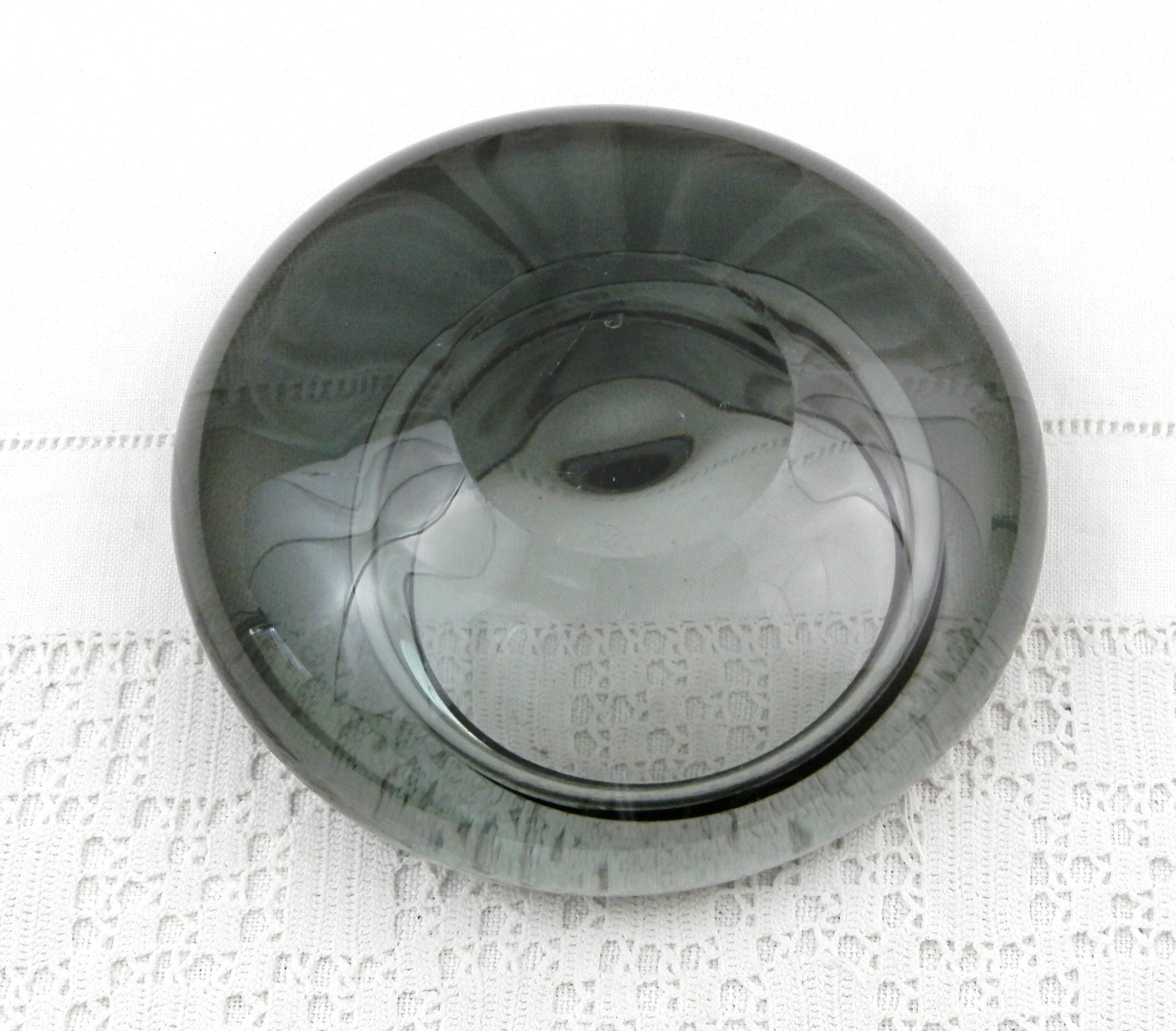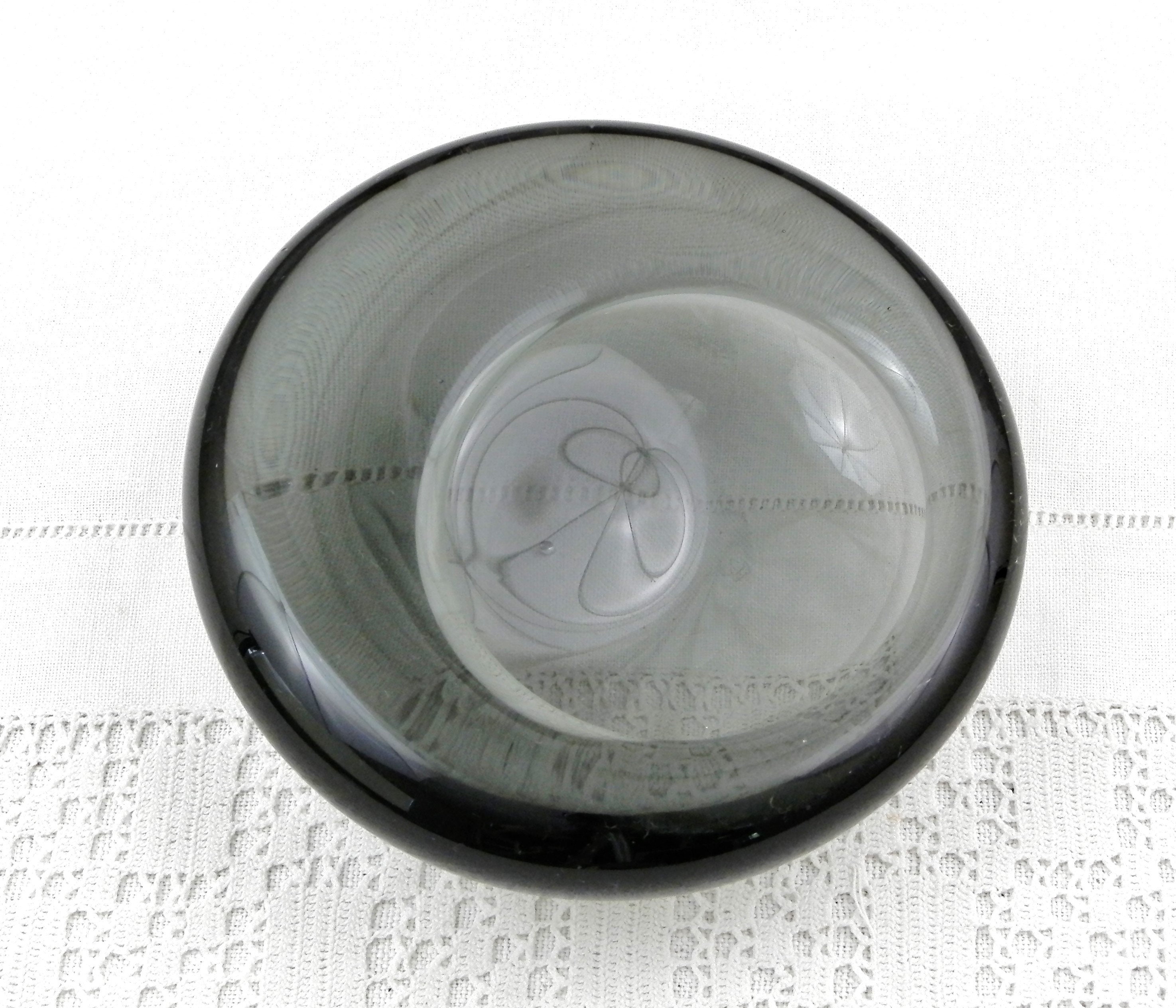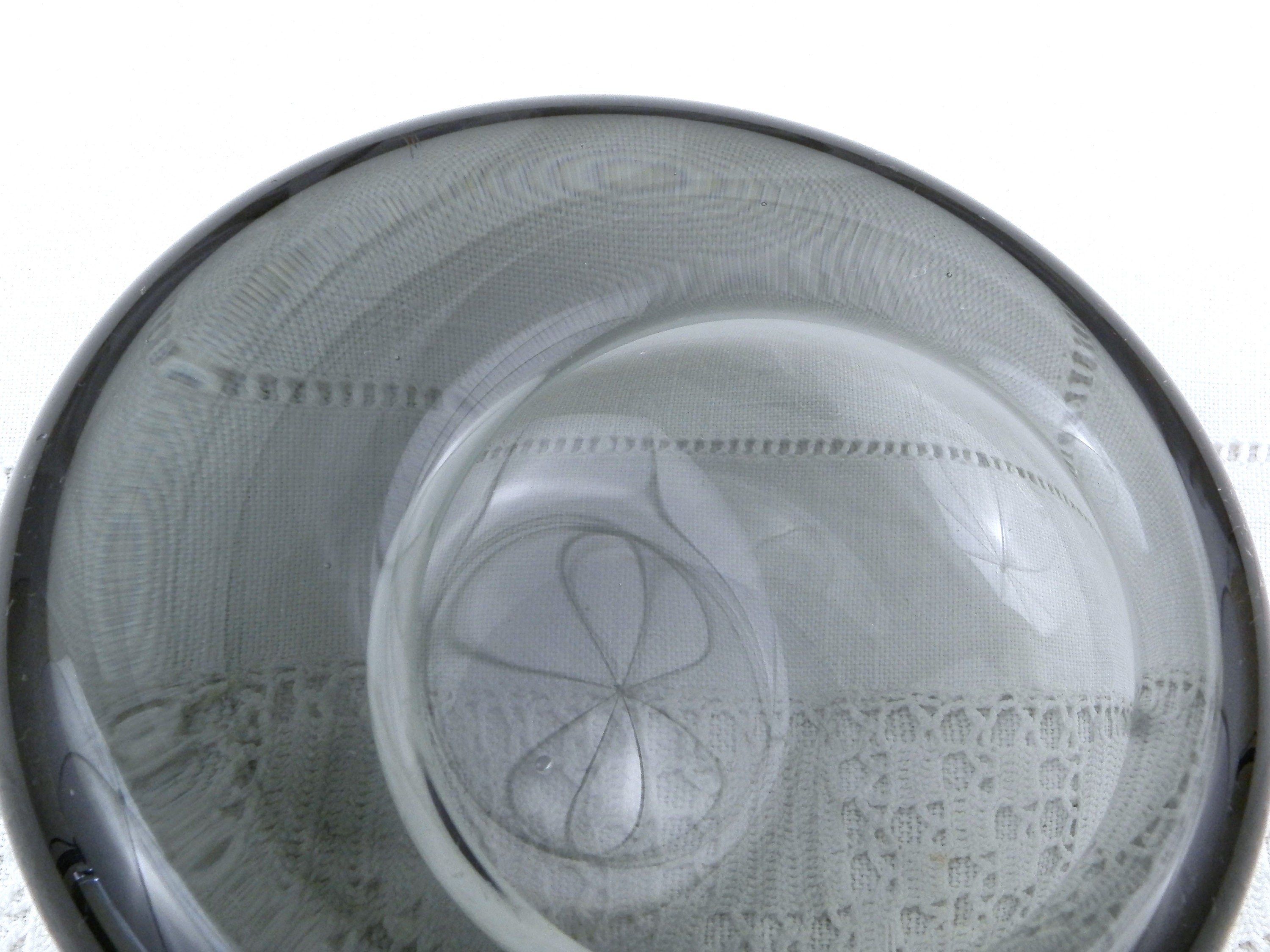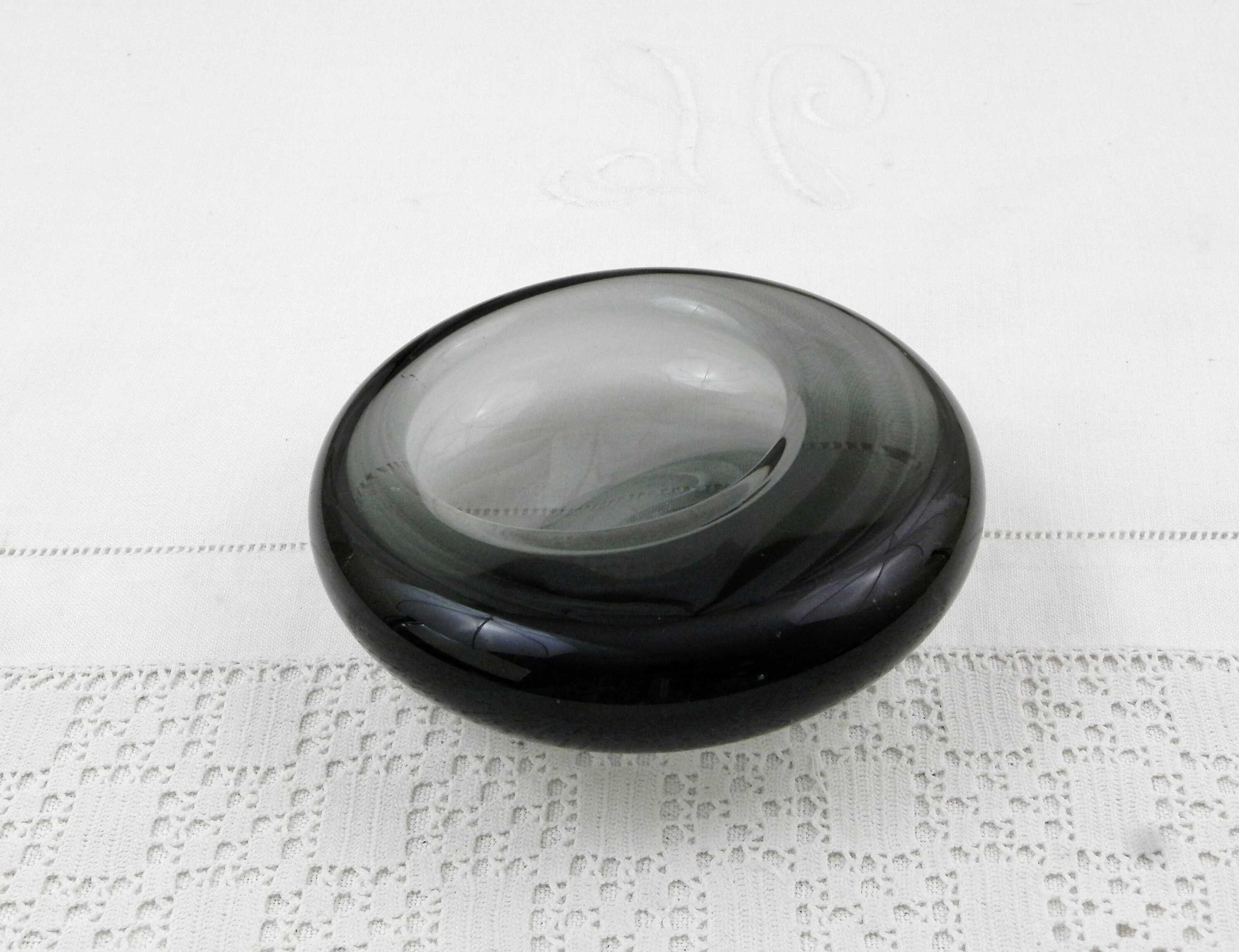 Vintage Danish art glass trinket dish. Designed by Per Lütken for Holmegaard Model No 16039. Made of smoked gray glass. Ca 1960.