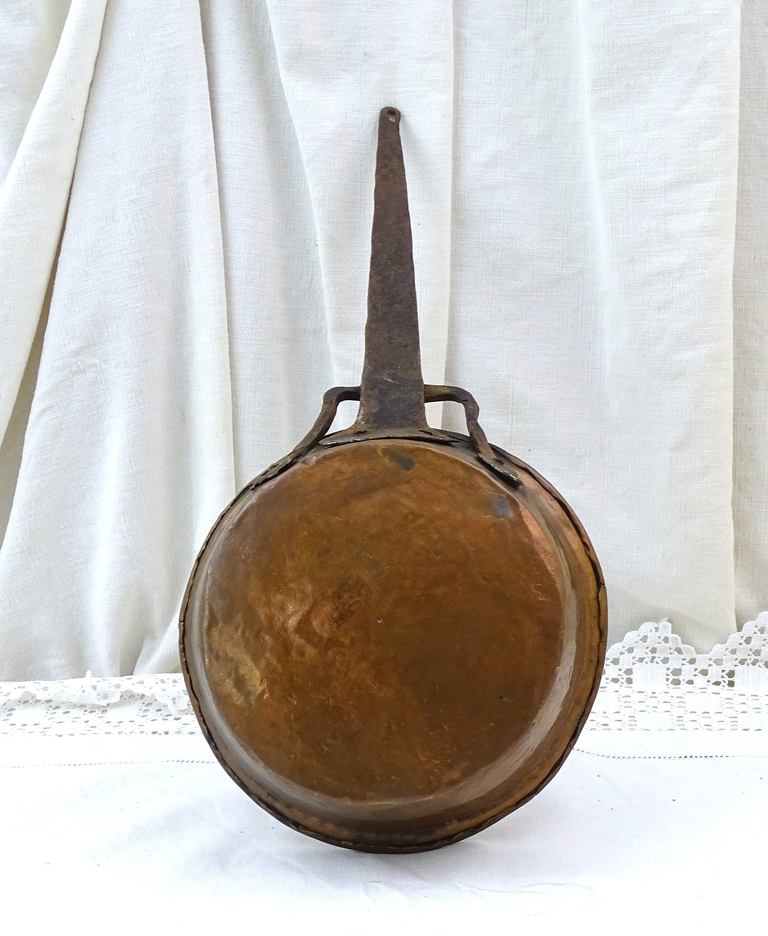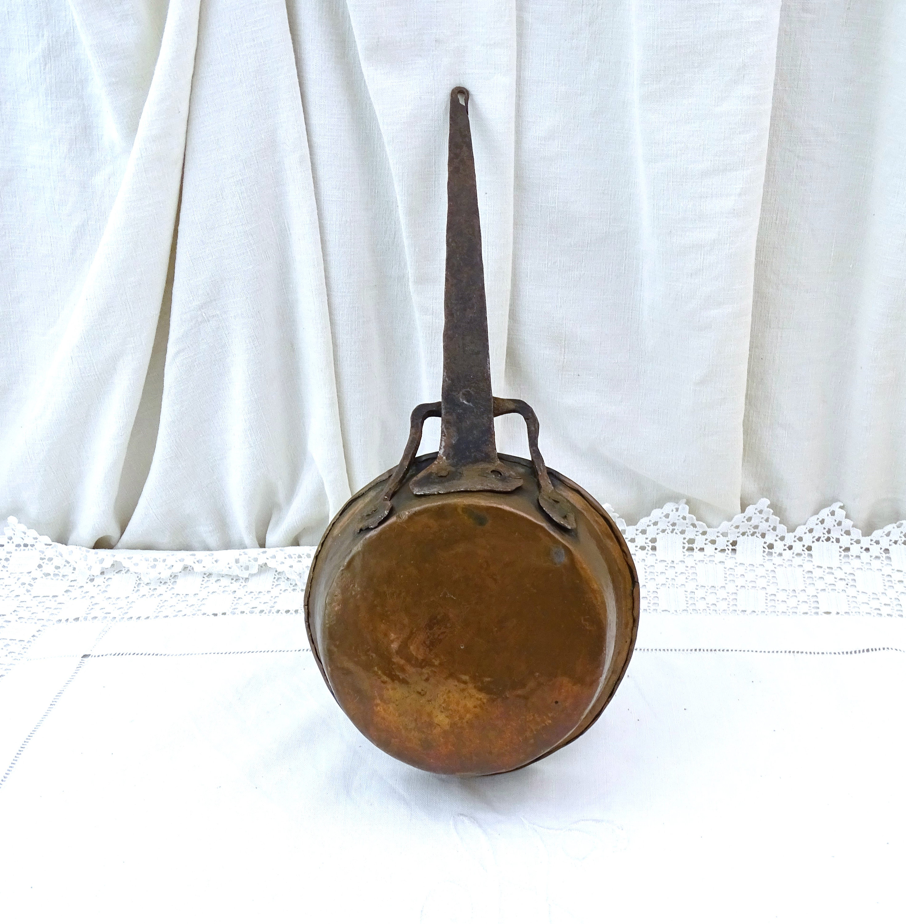 Antique French 18 th Century copper cooking pan. Made of tin lined copper with forged iron handle. Circa 1800s.
