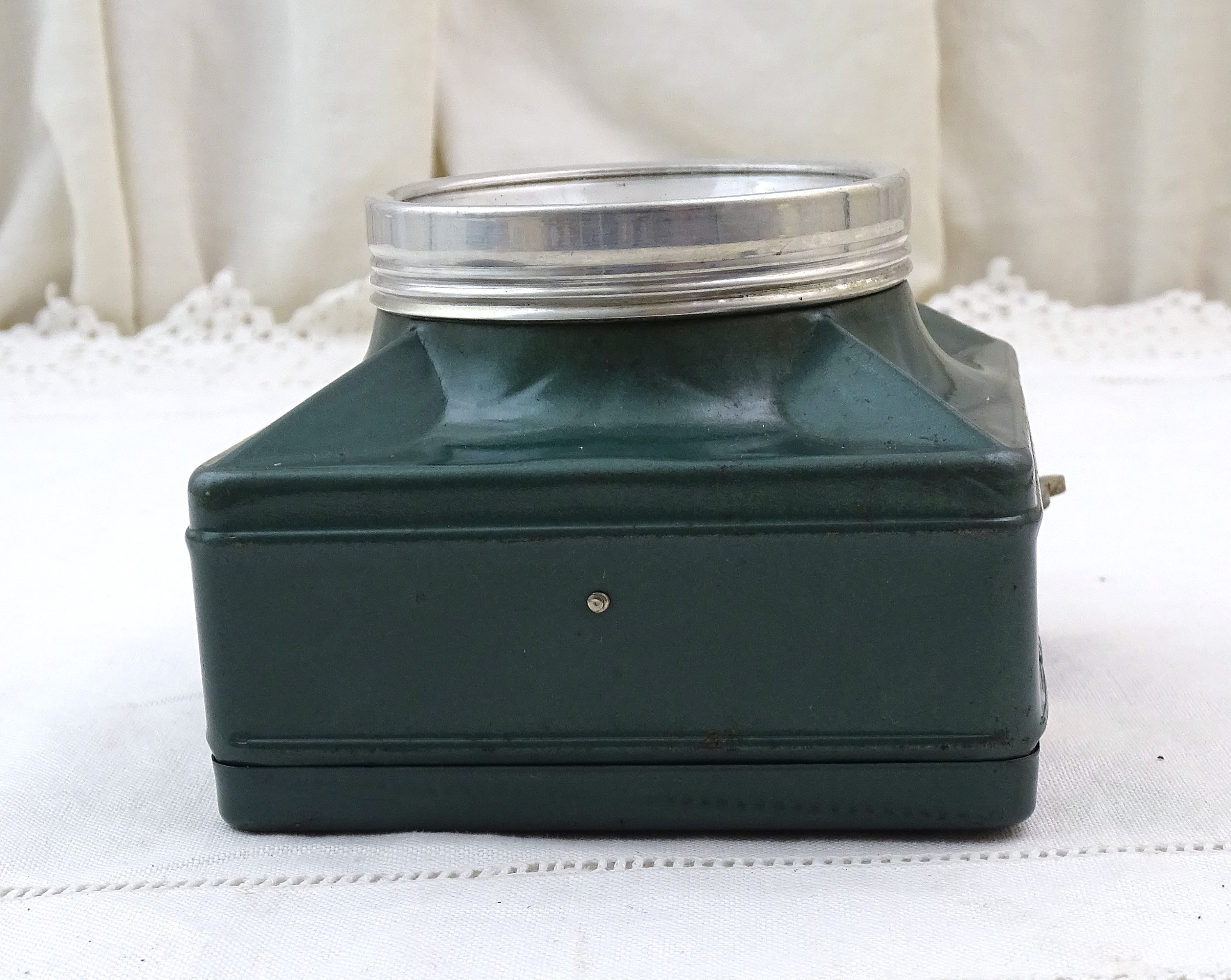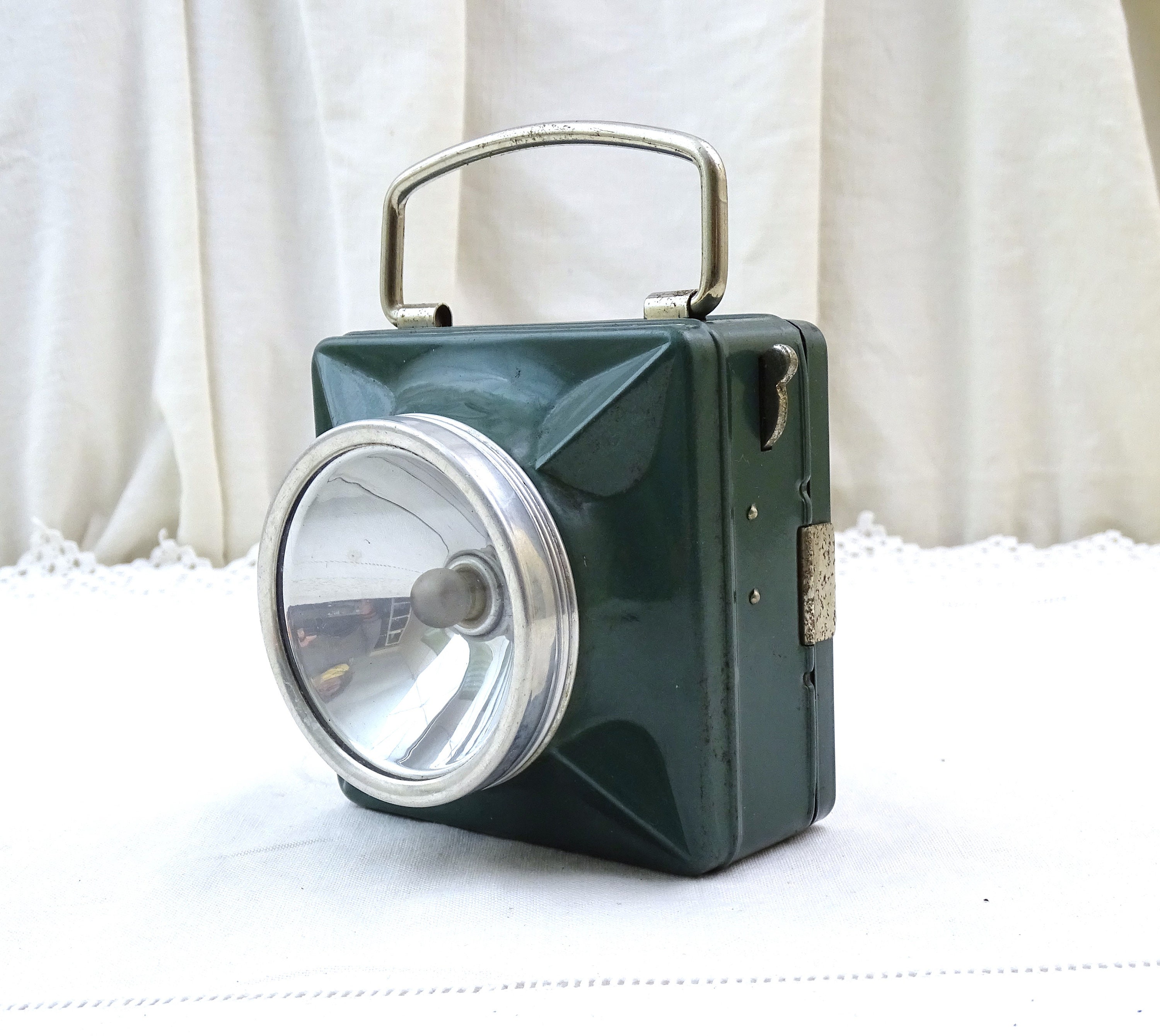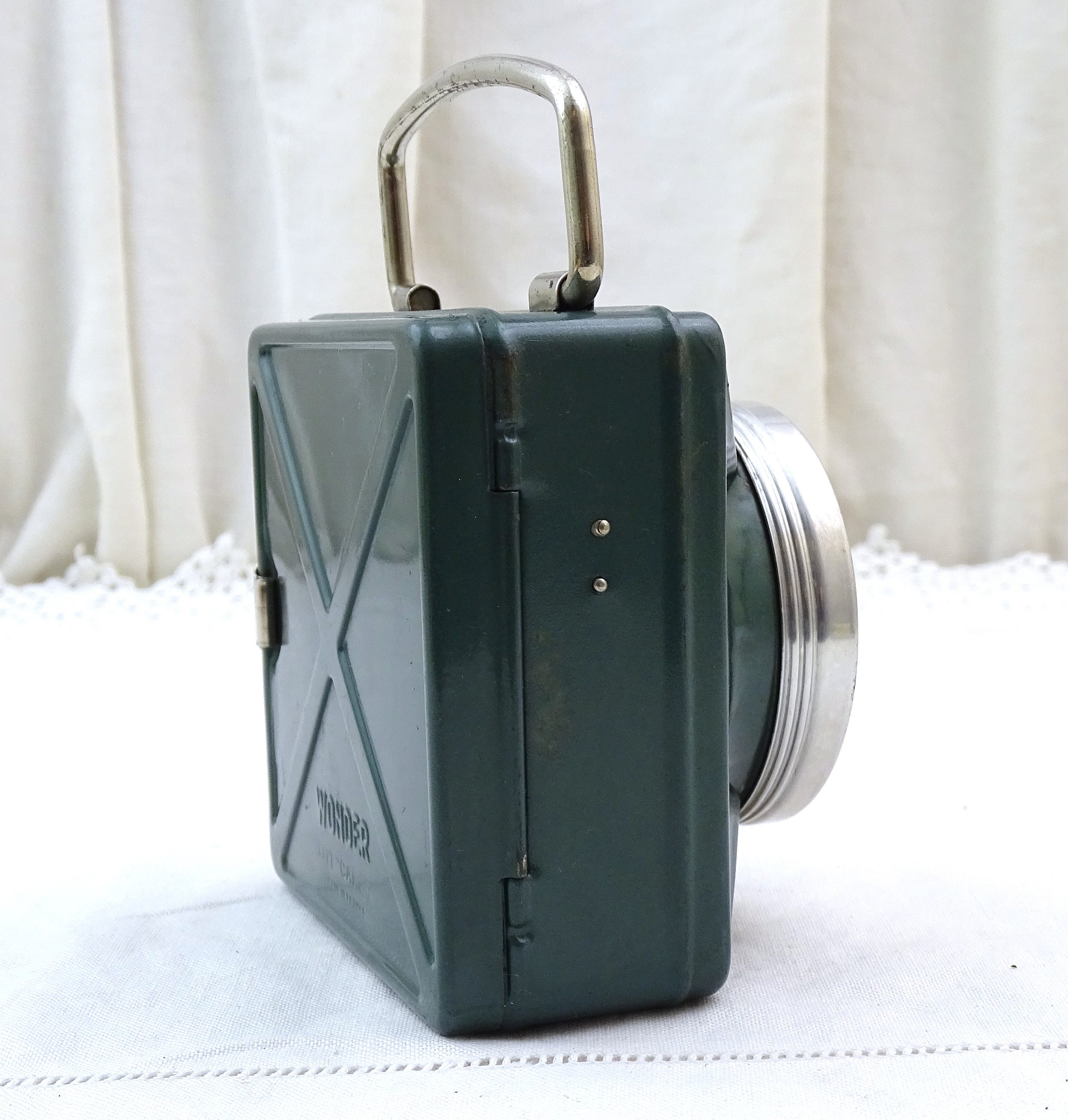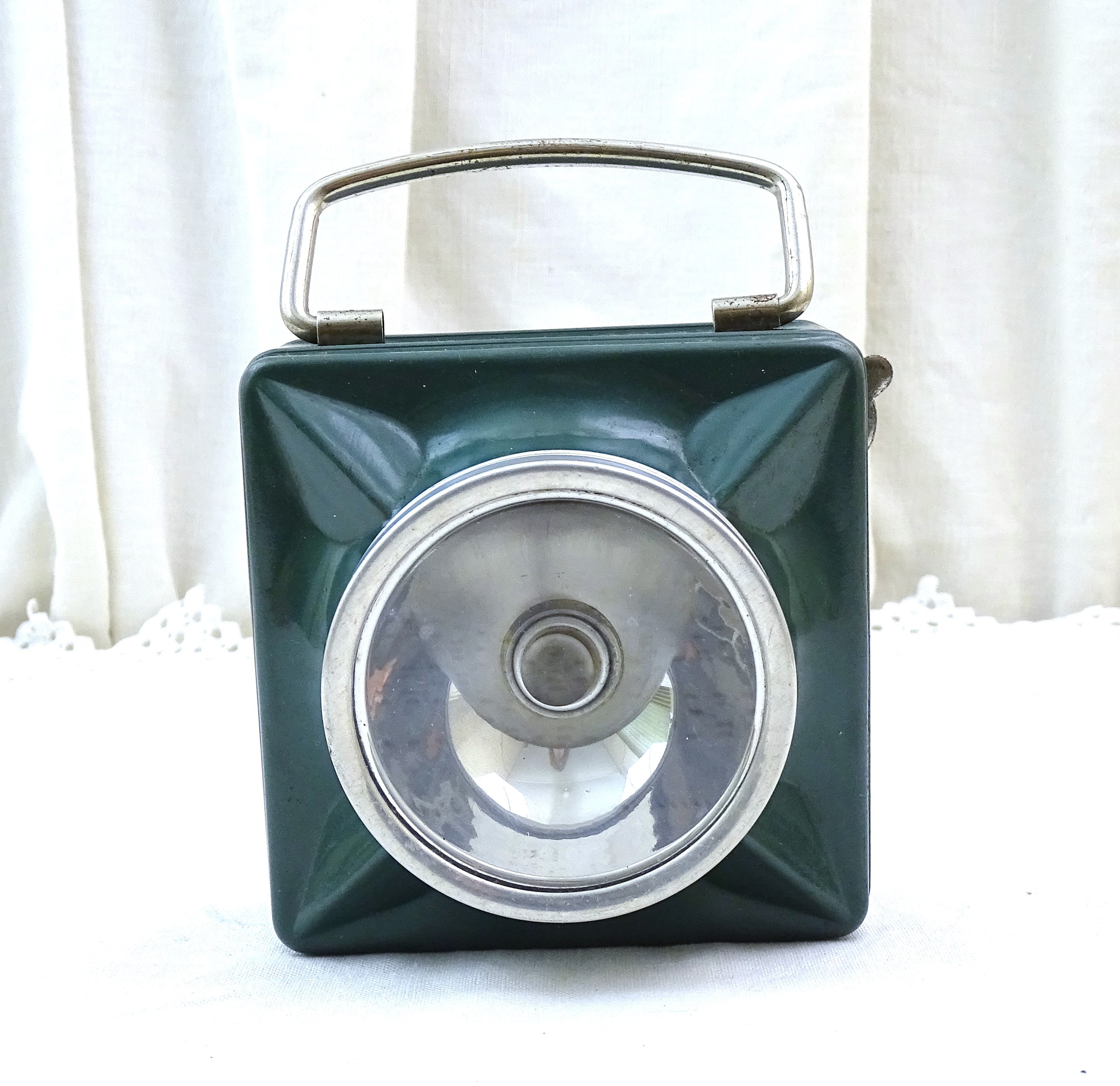 Vintage French square flashlight. Made by French company "Wonder" model called "cargo". Made of metal with a glass lens, green lacquer. Folding handle. This item has not been tested and I am unsure if it is in working condition. Circa 1940s / 1950s. Could be upcycled into a wall lamp. Found at a French flea market in Normandy.