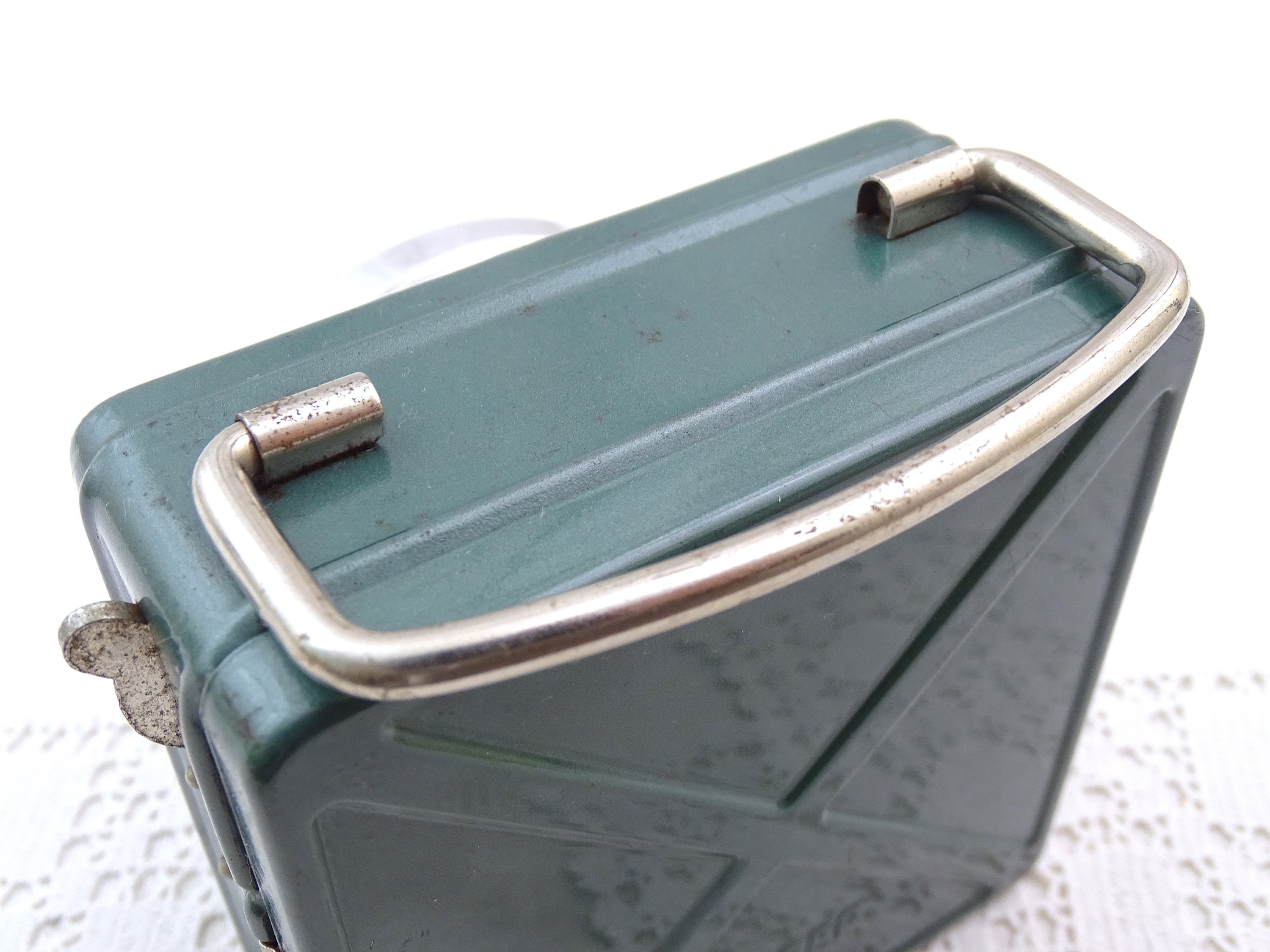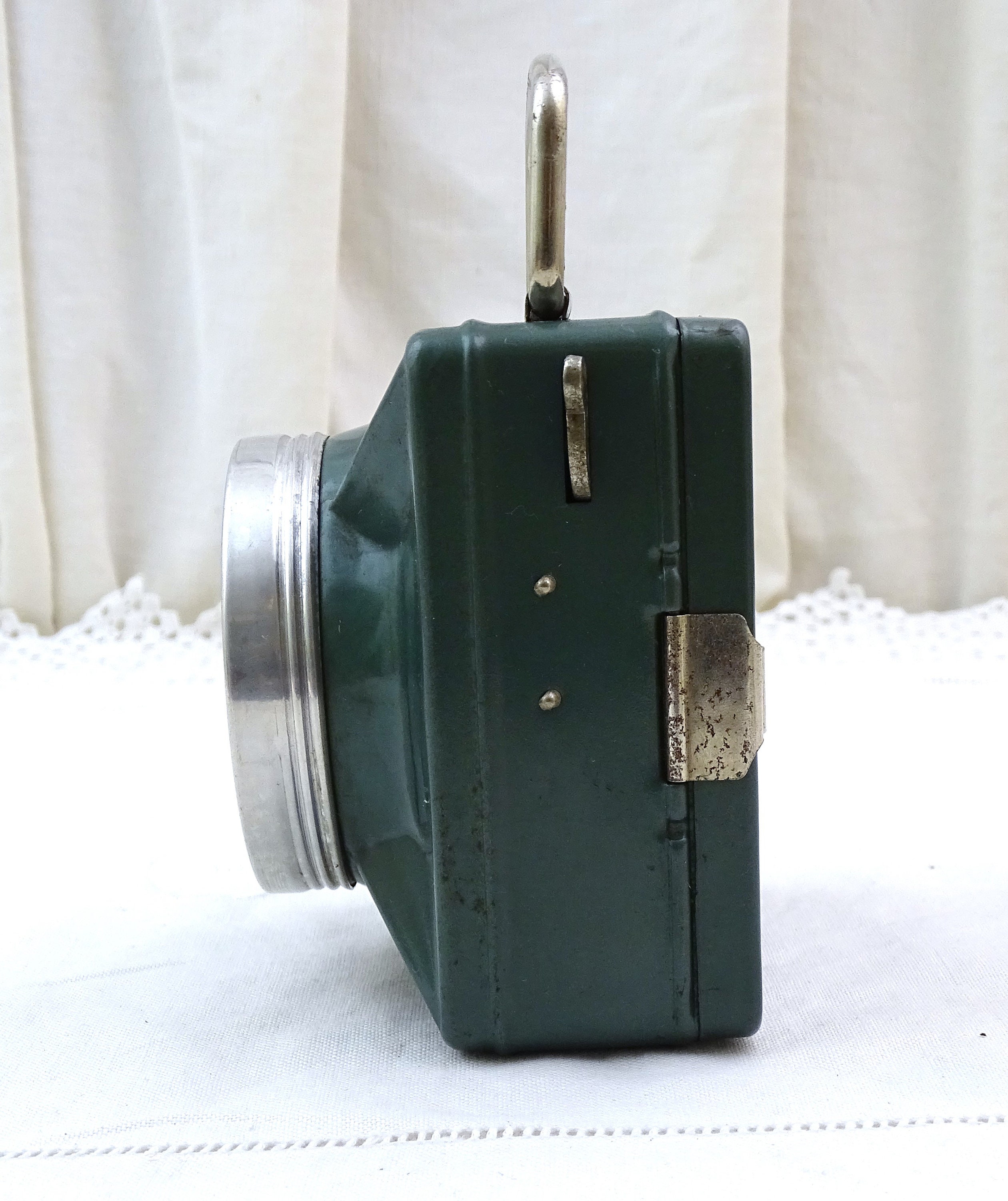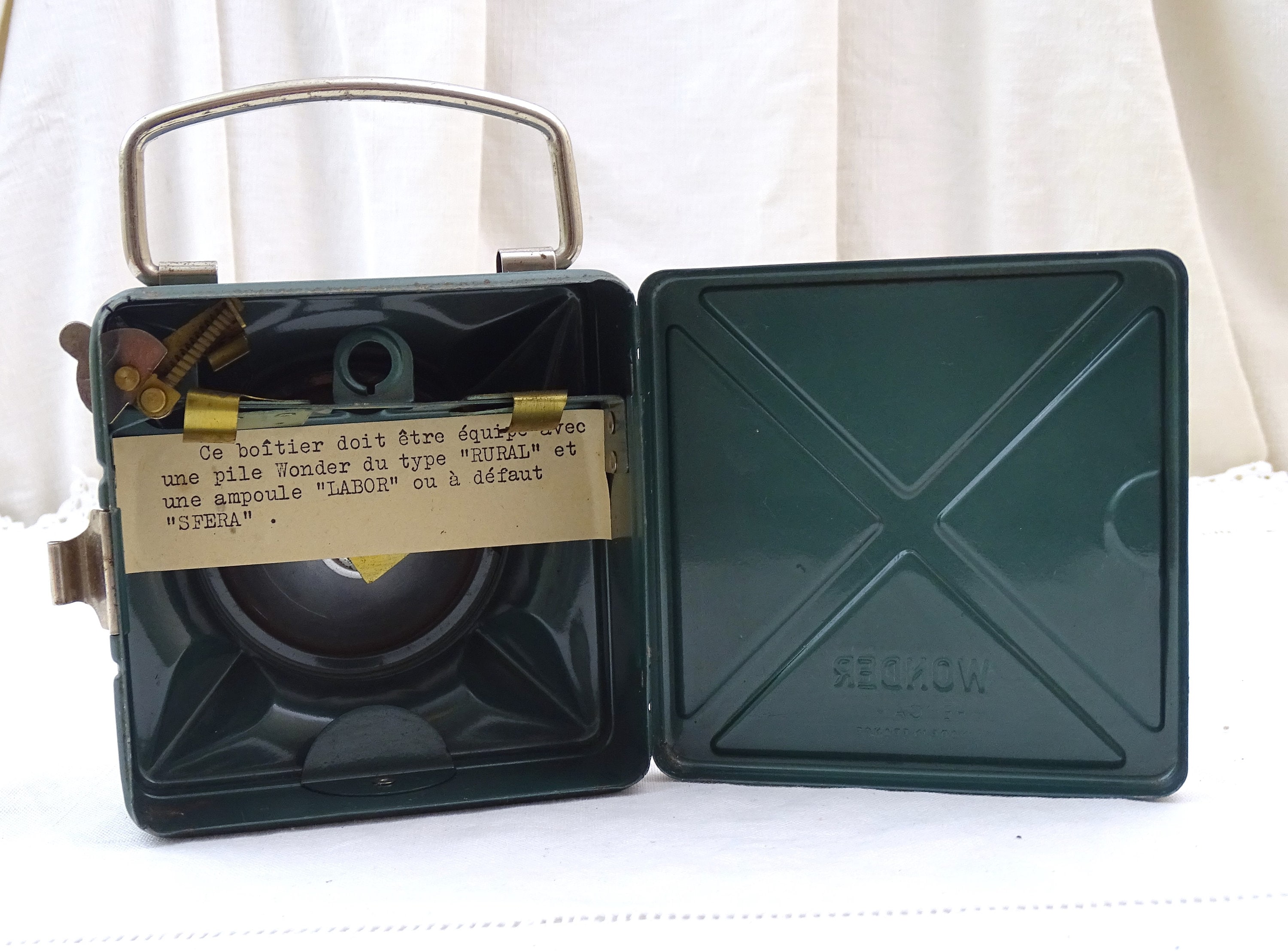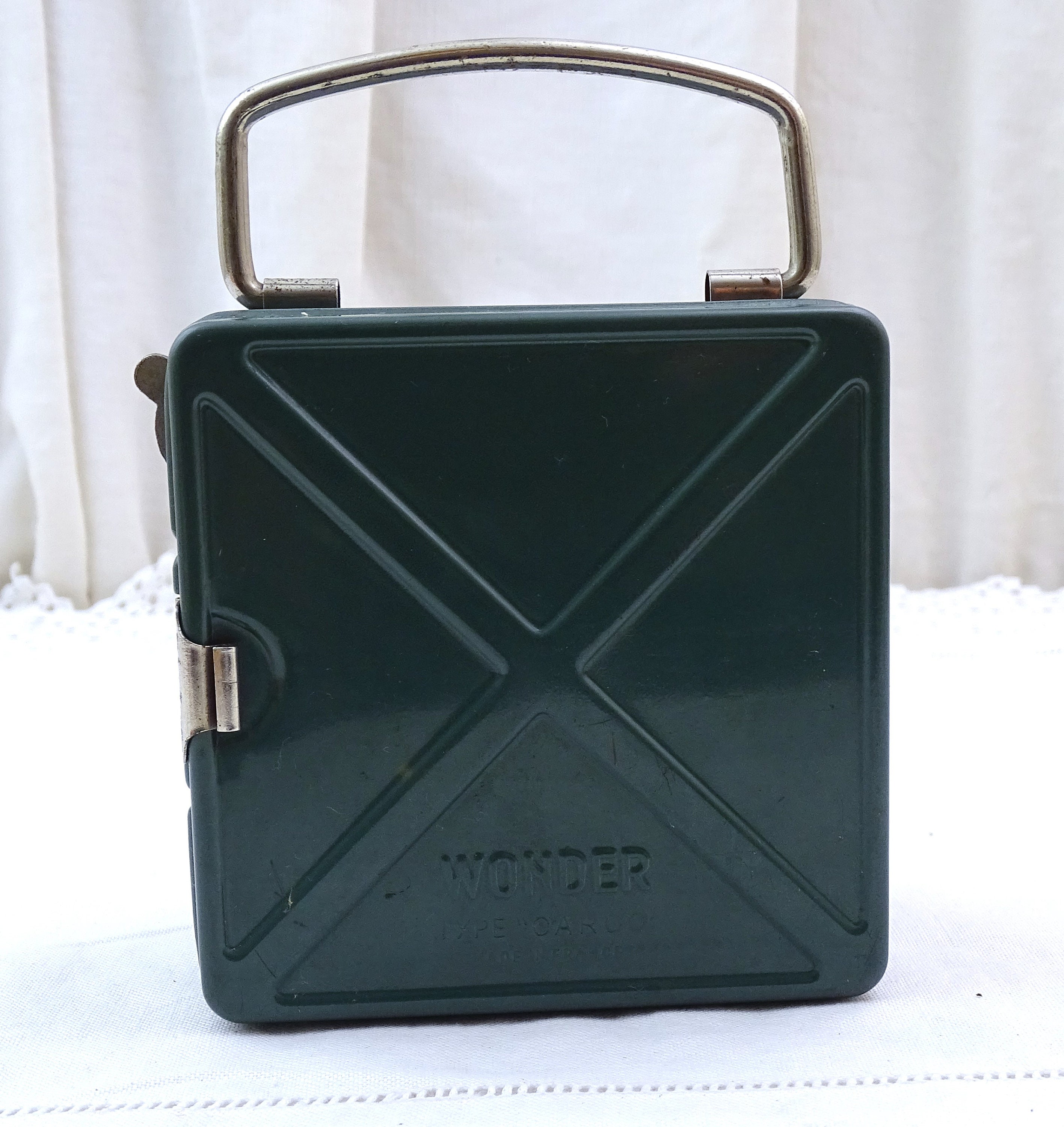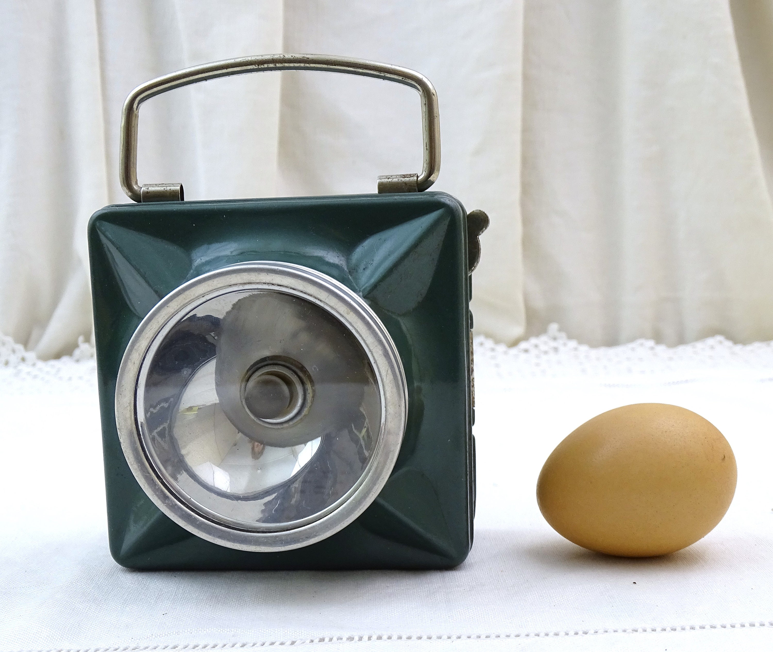 Vintage French square flashlight. Made by French company "Wonder" model called "cargo". Made of metal with a glass lens, green lacquer. Folding handle. This item has not been tested and I am unsure if it is in working condition. Circa 1940s / 1950s. Could be upcycled into a wall lamp. Found at a French flea market in Normandy.