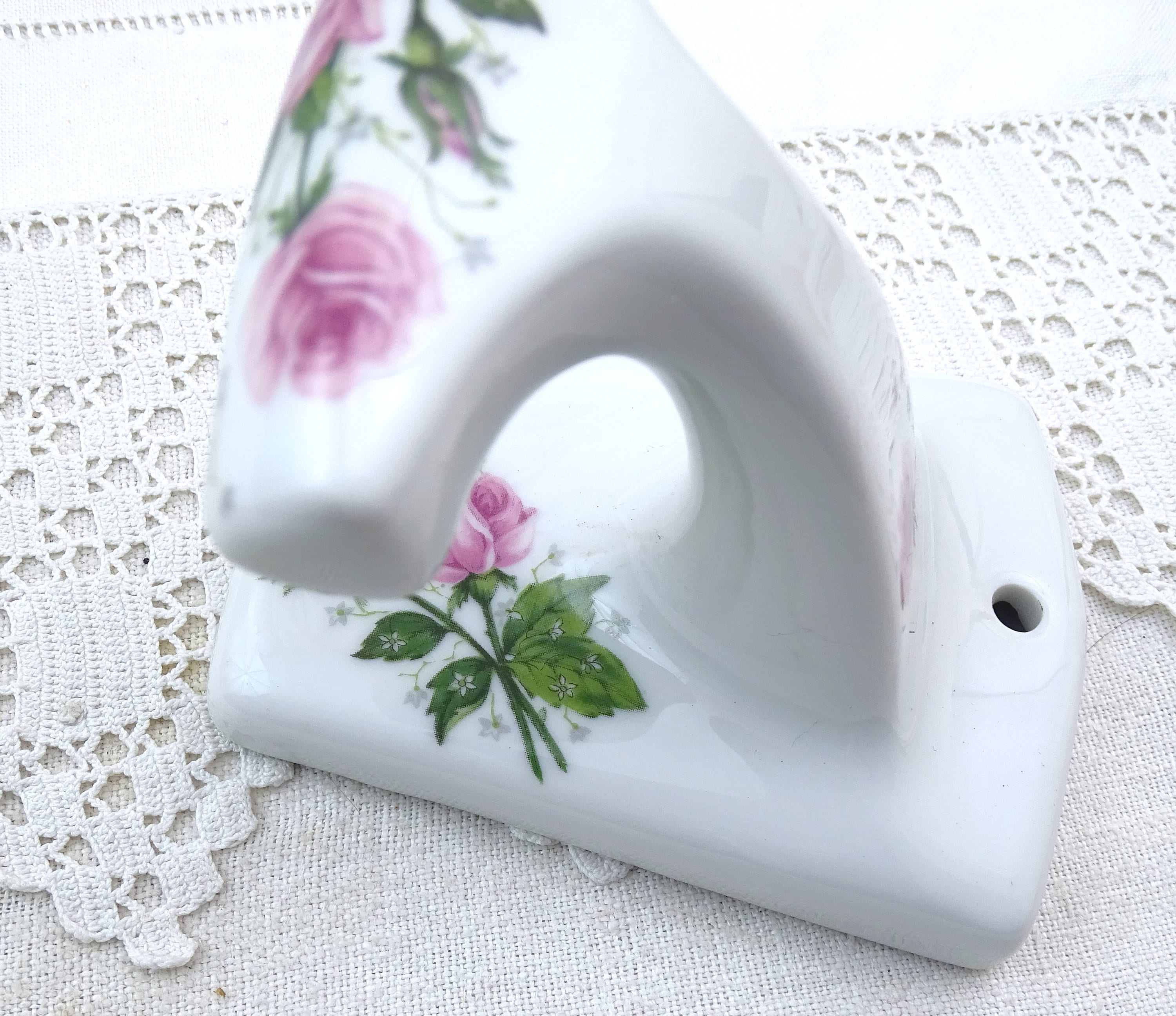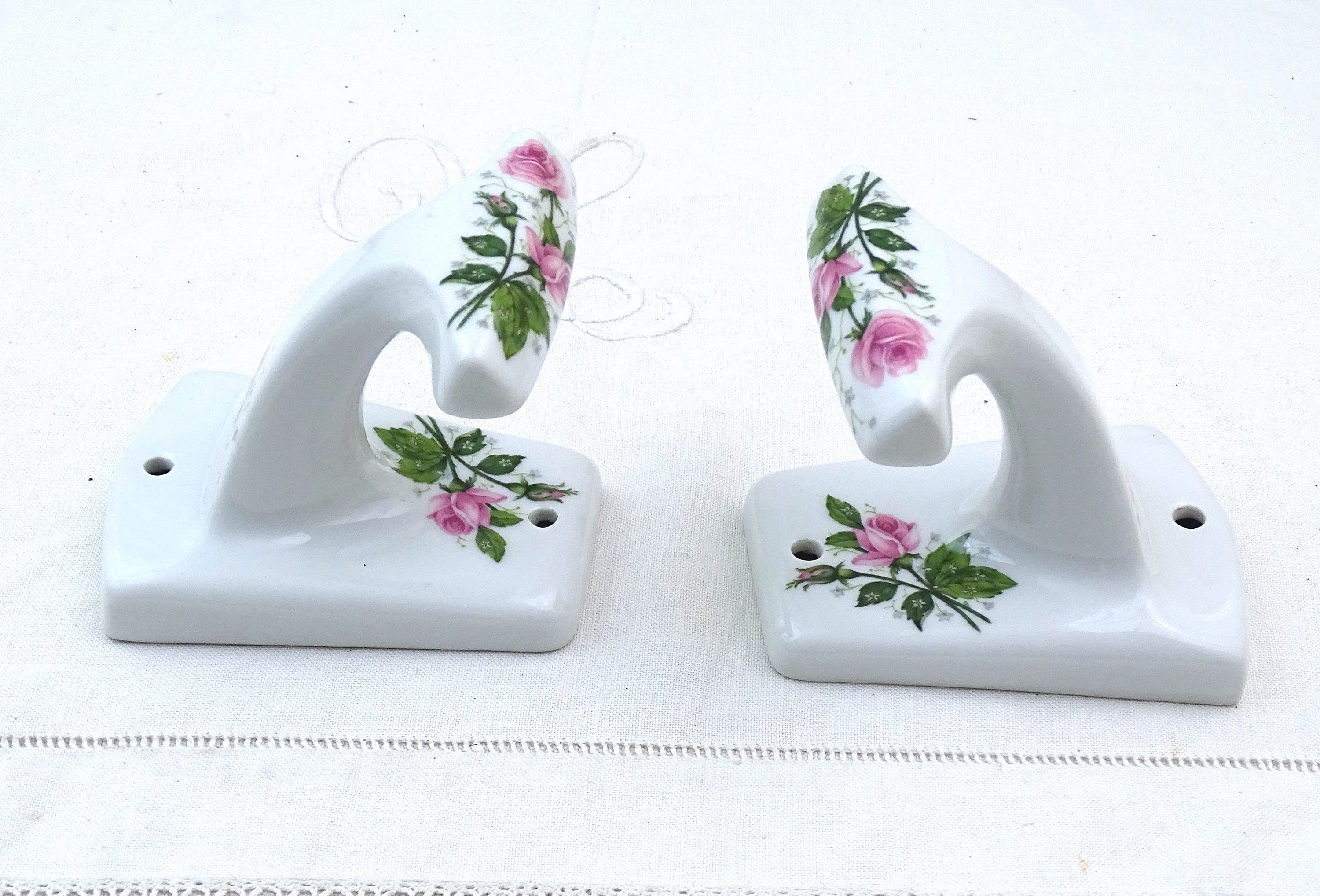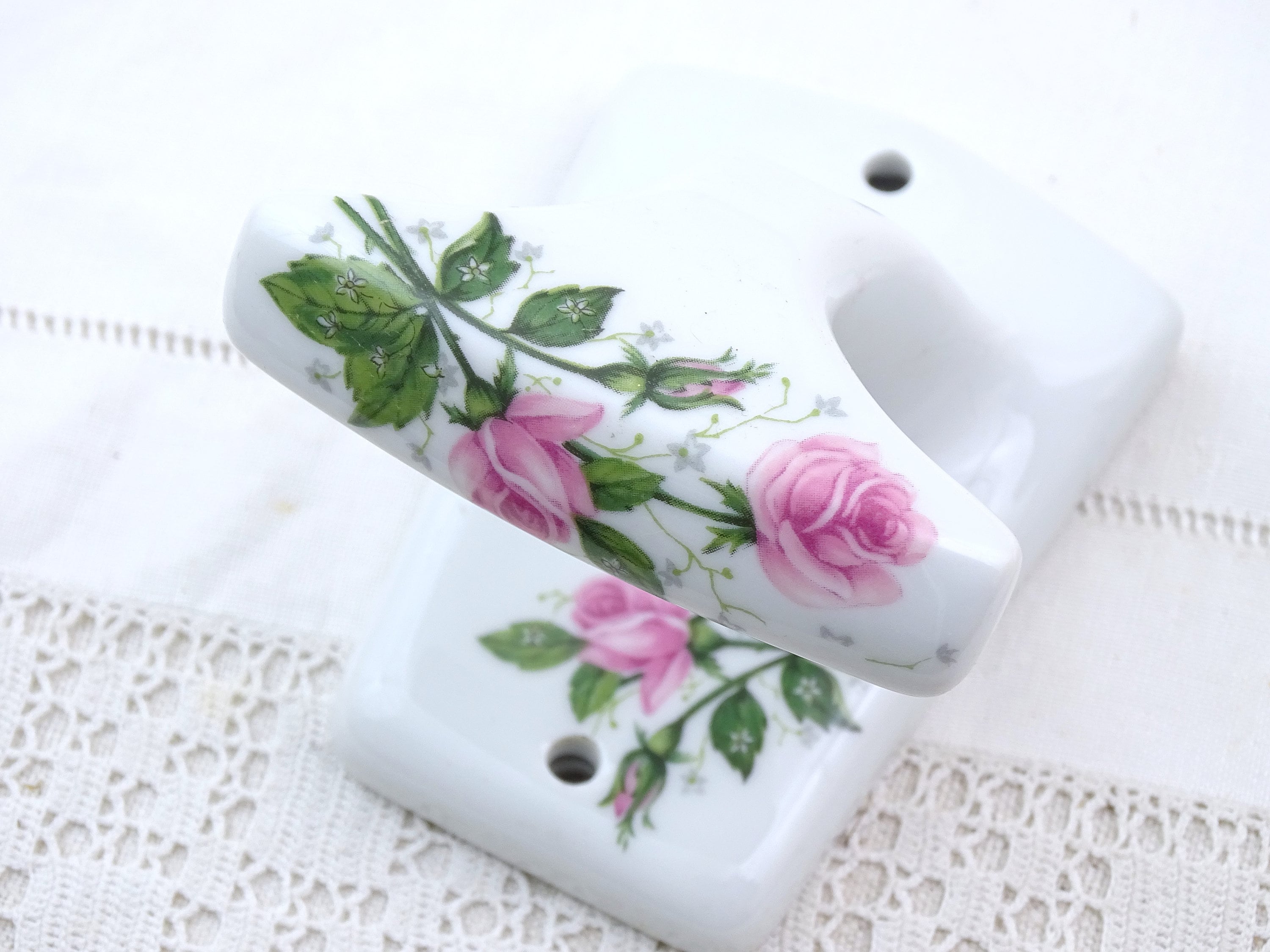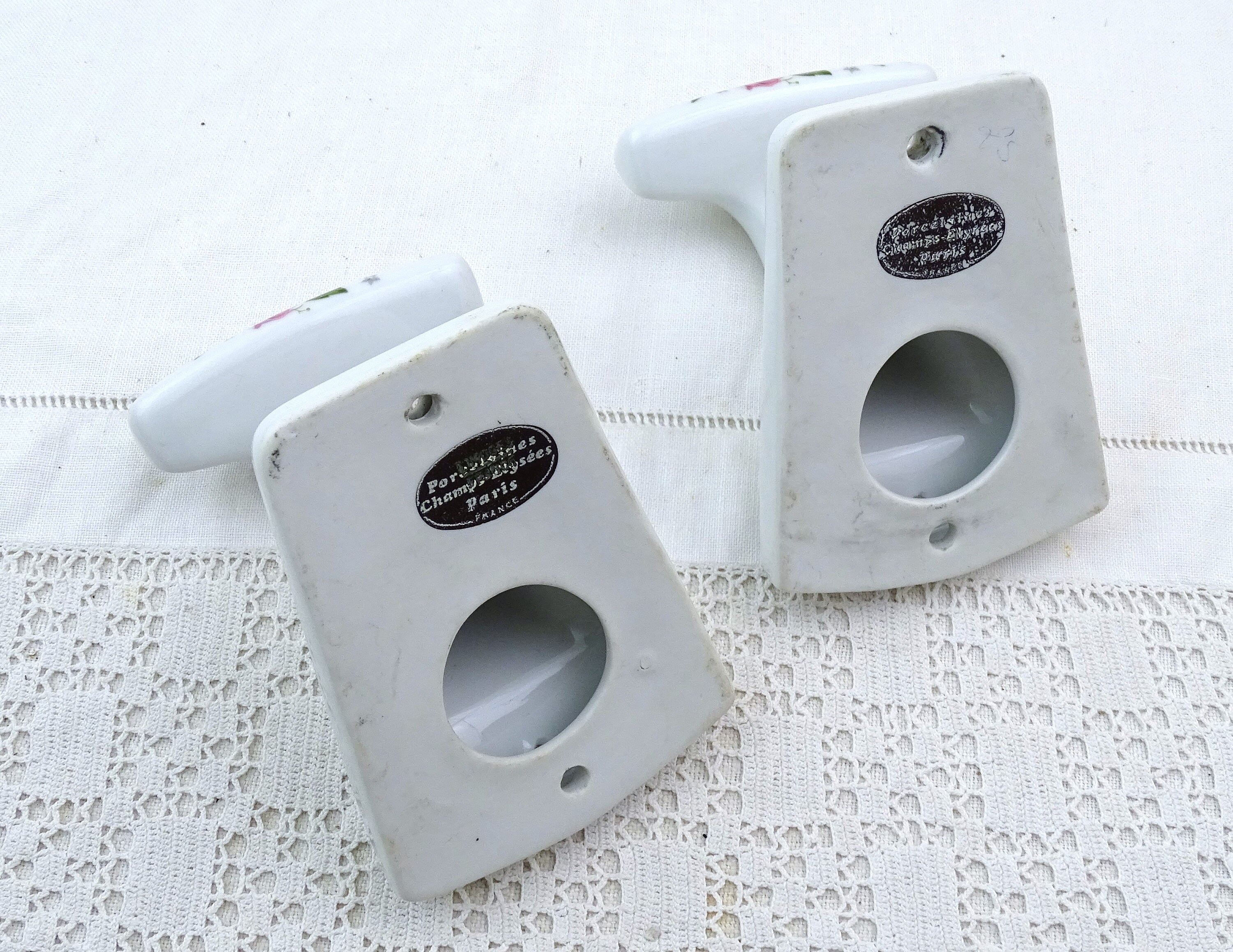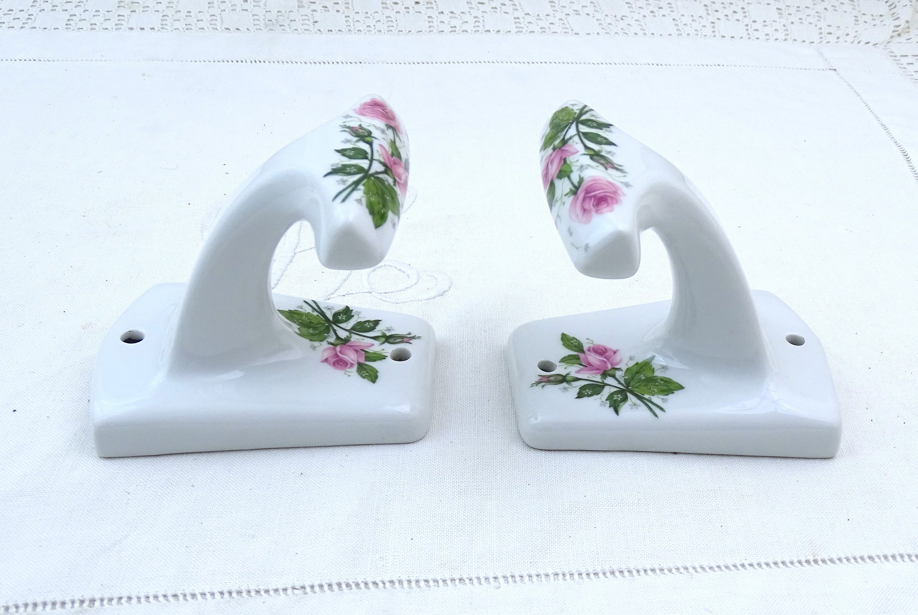 Pair of vintage French china bathroom hooks with pink rose flower pattern. Made by Porcelaine Champs Elysee Paris of white china. Ca mid to late 1900s.