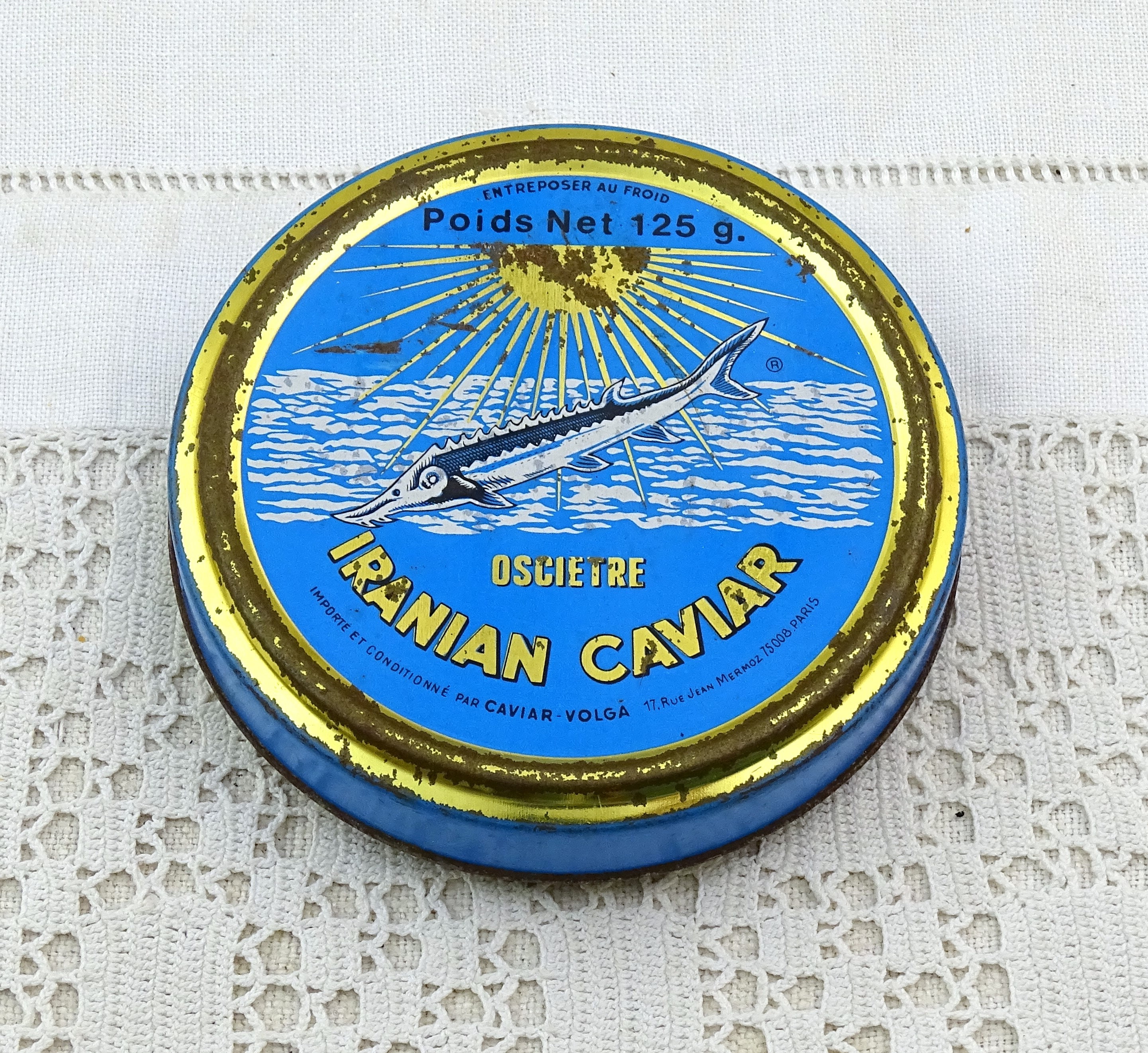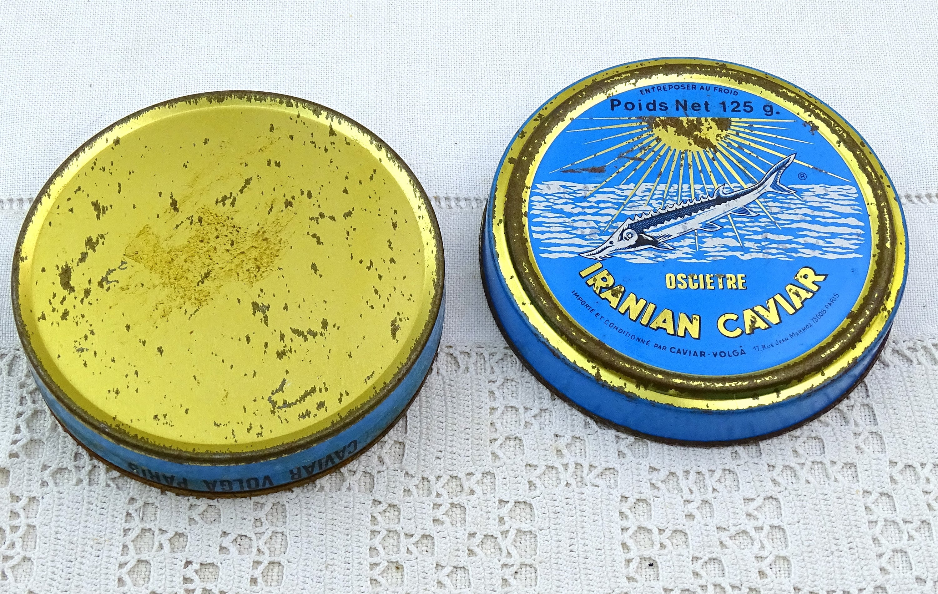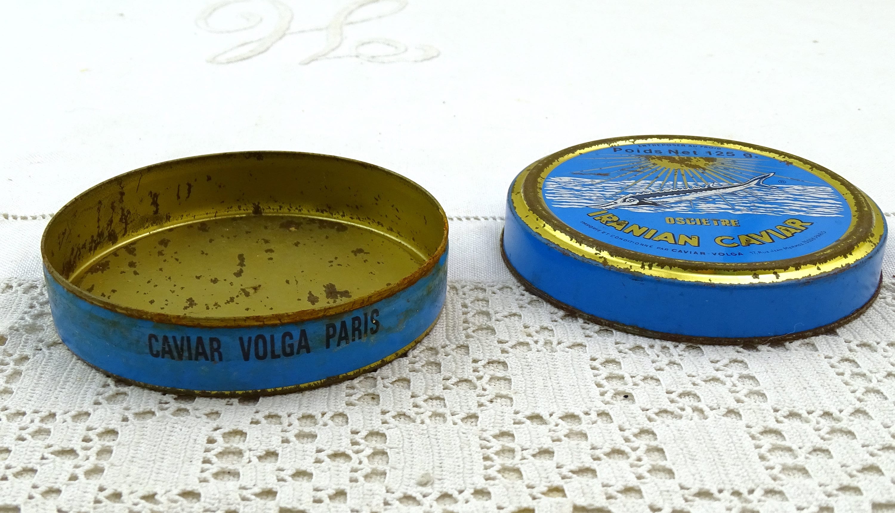 Vintage round blue and gold caviar tin Made of printed metal. Ca mid 1900s.