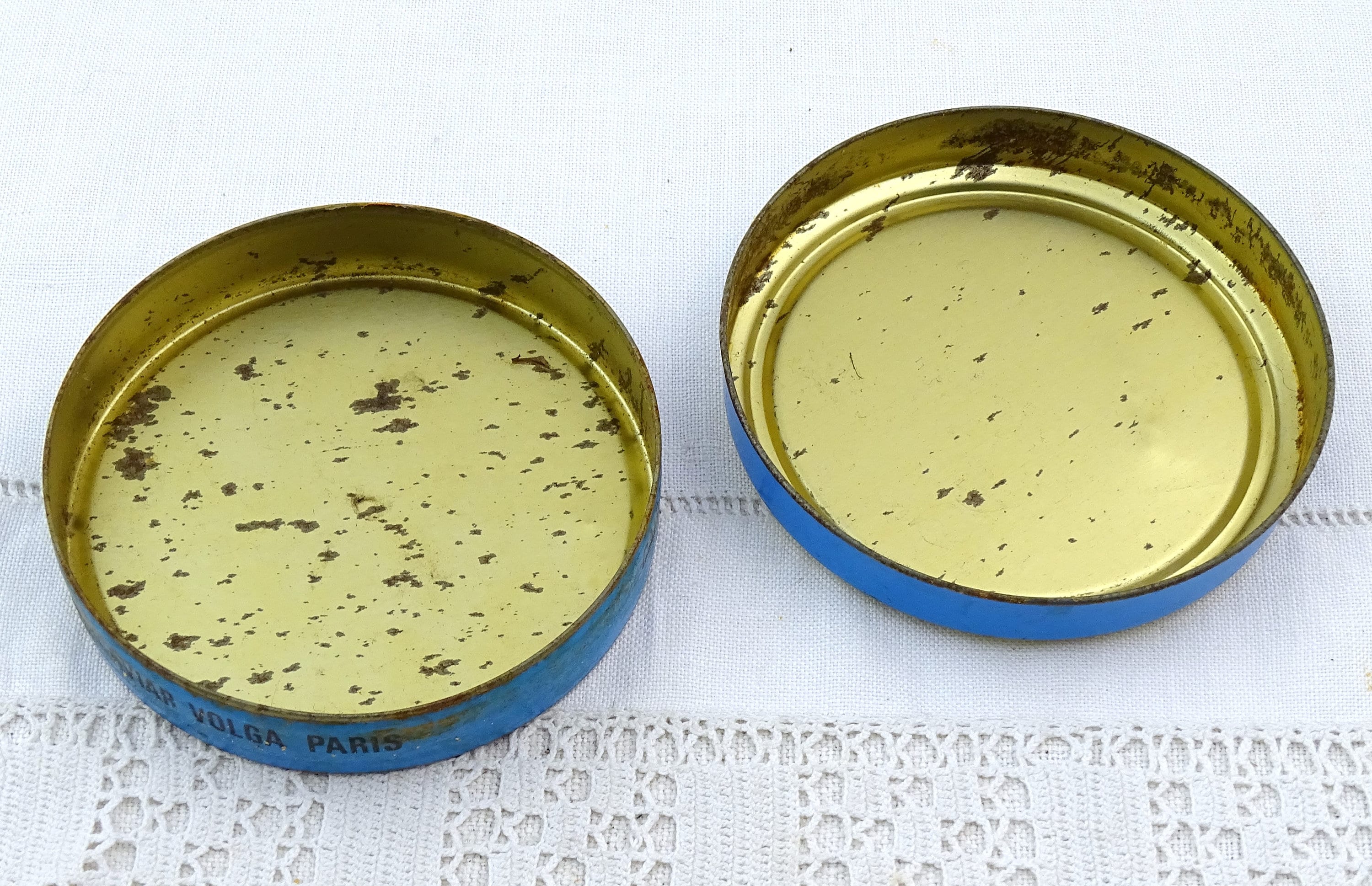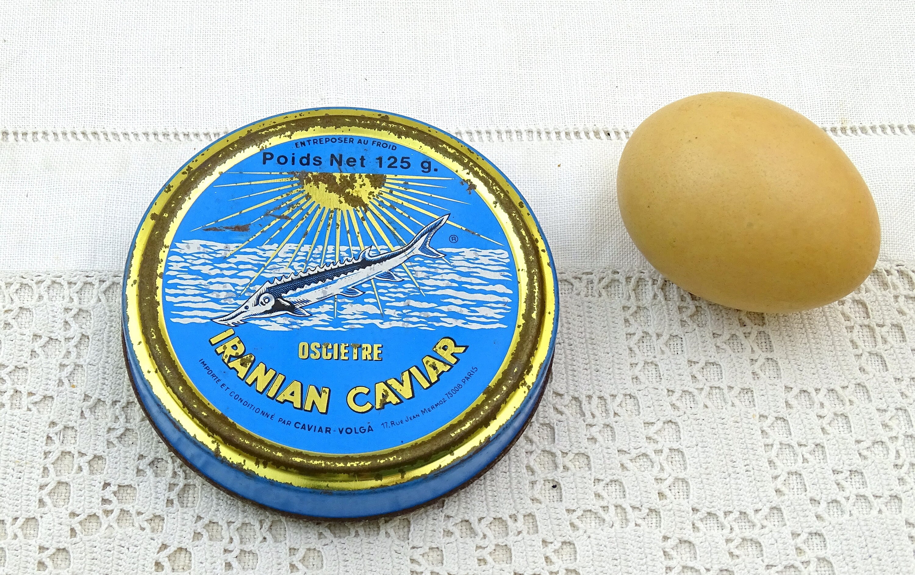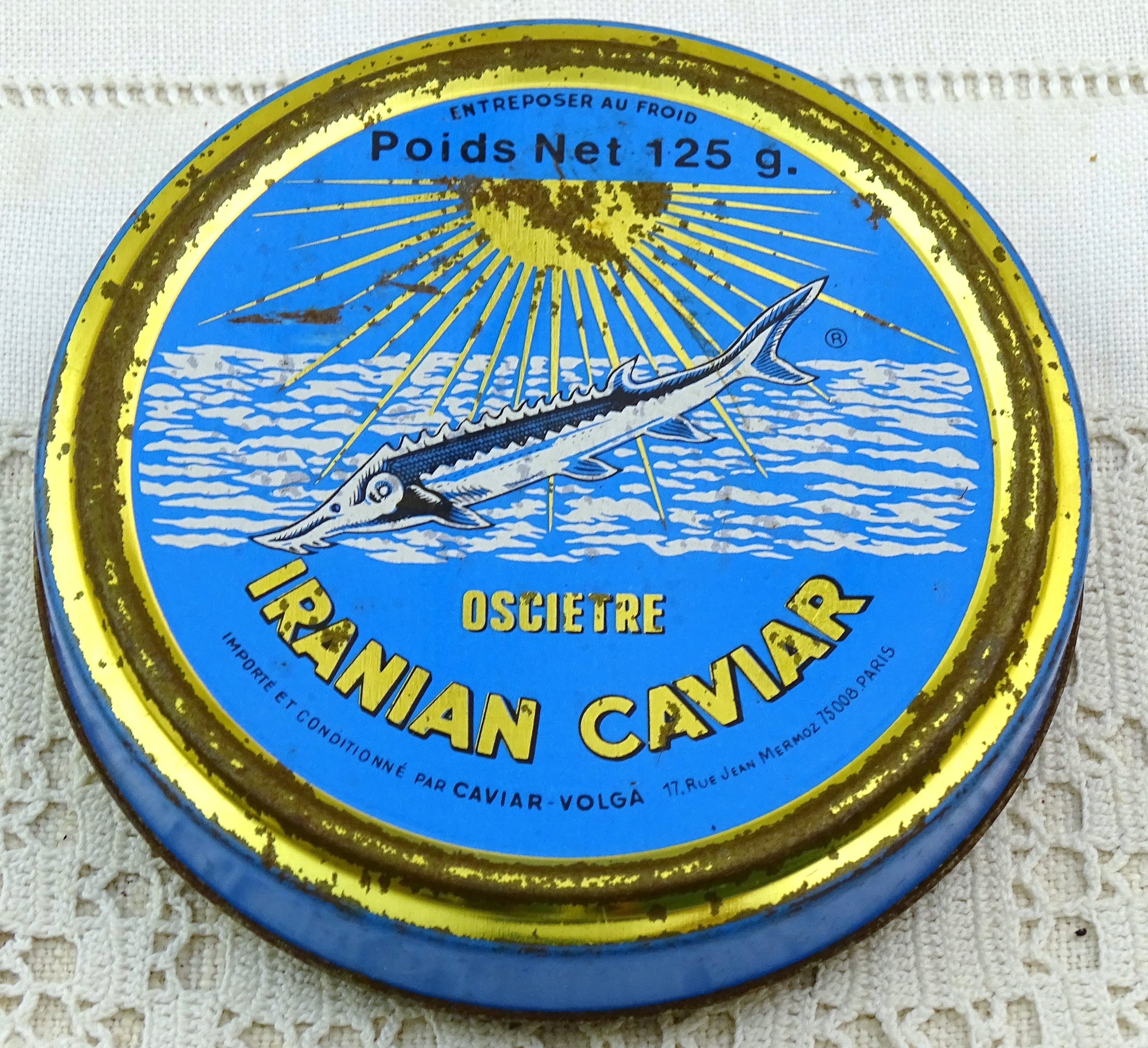 Vintage round blue and gold caviar tin Made of printed metal. Ca mid 1900s.