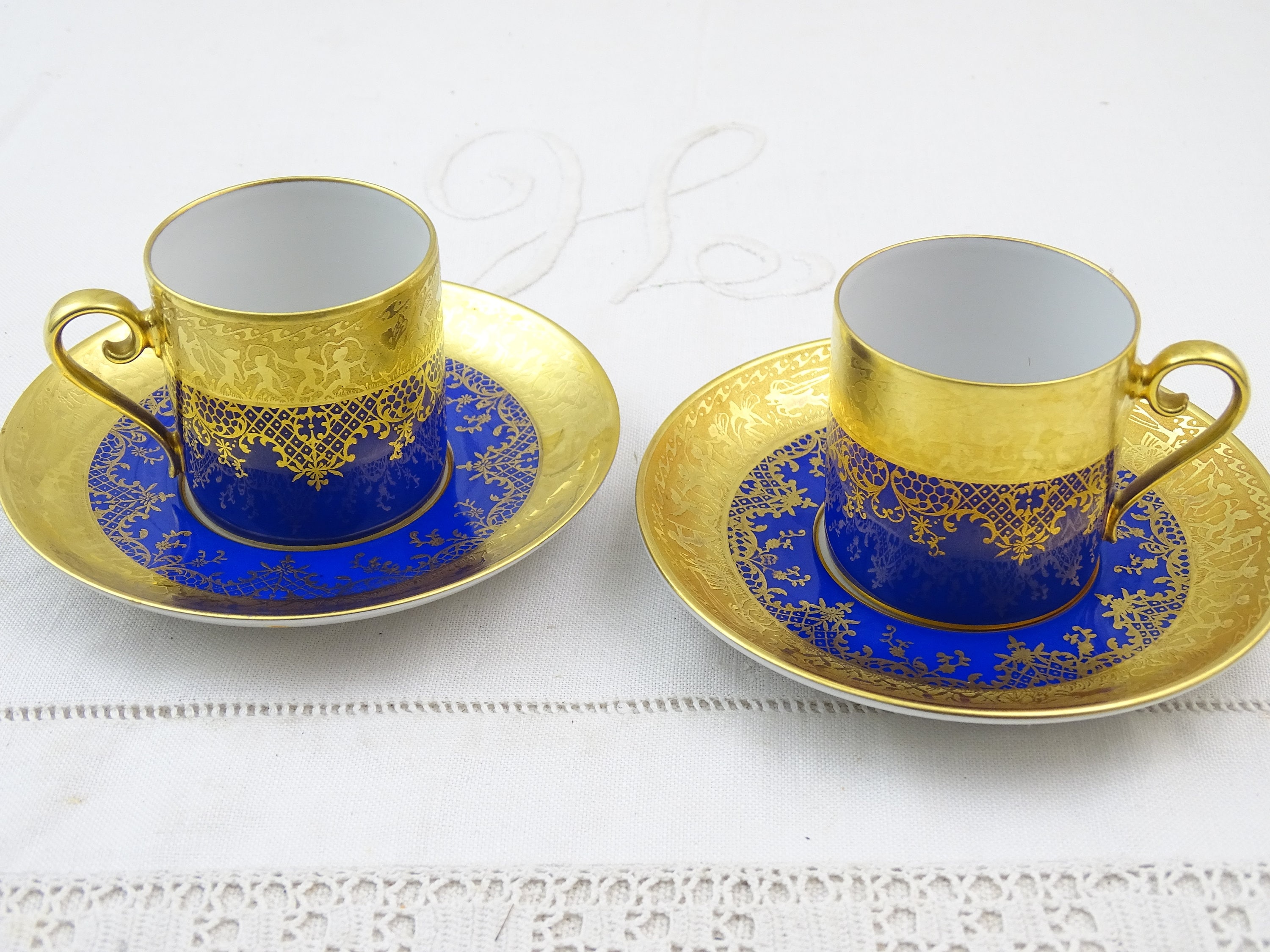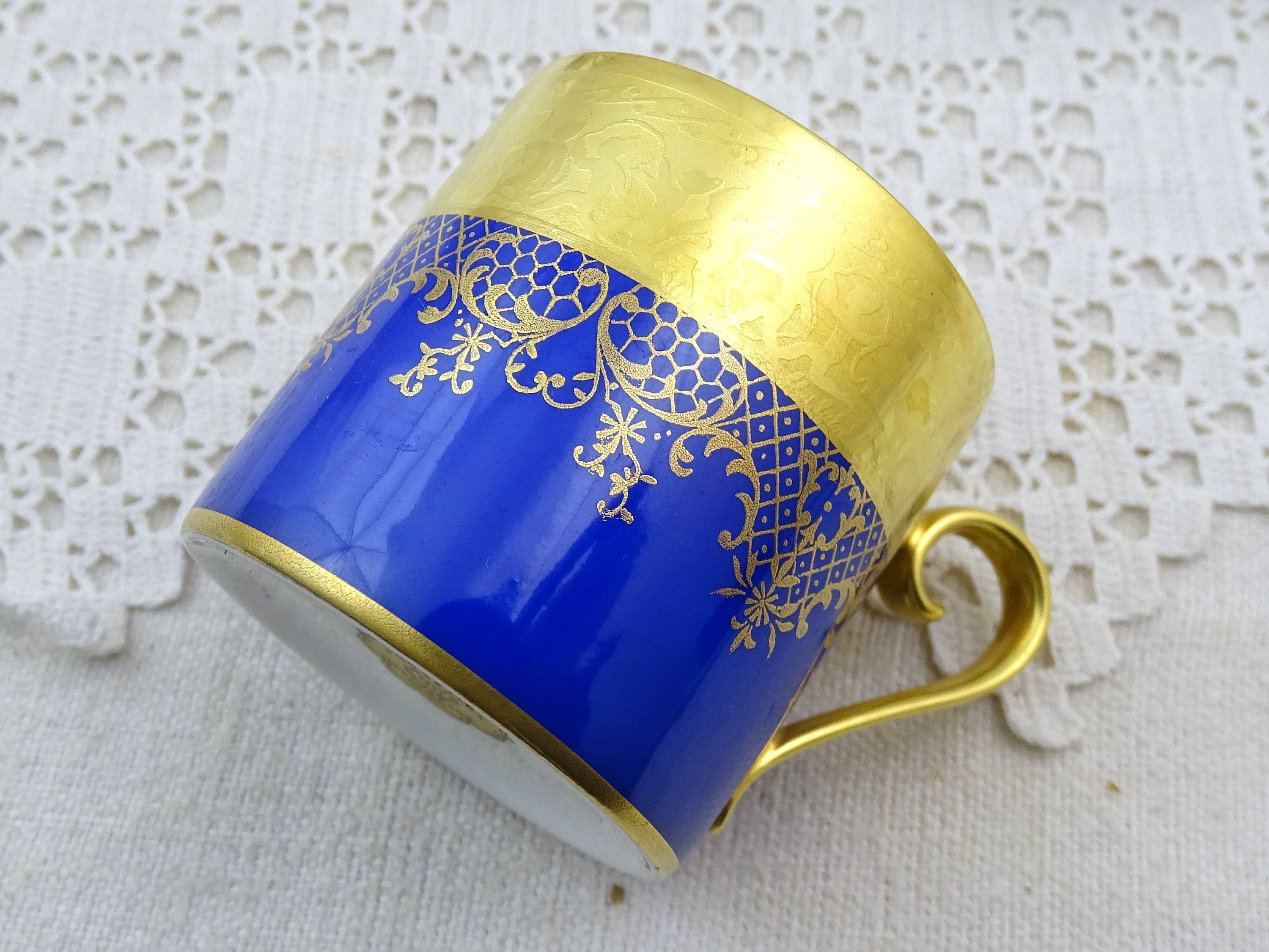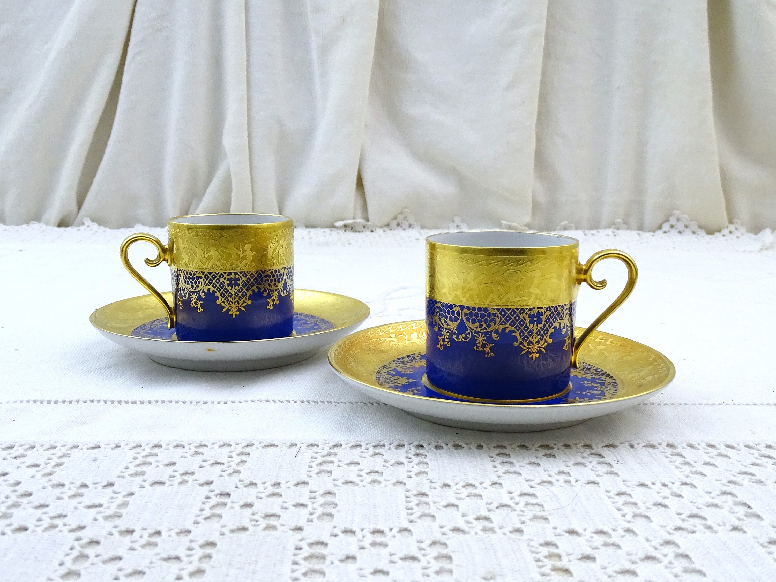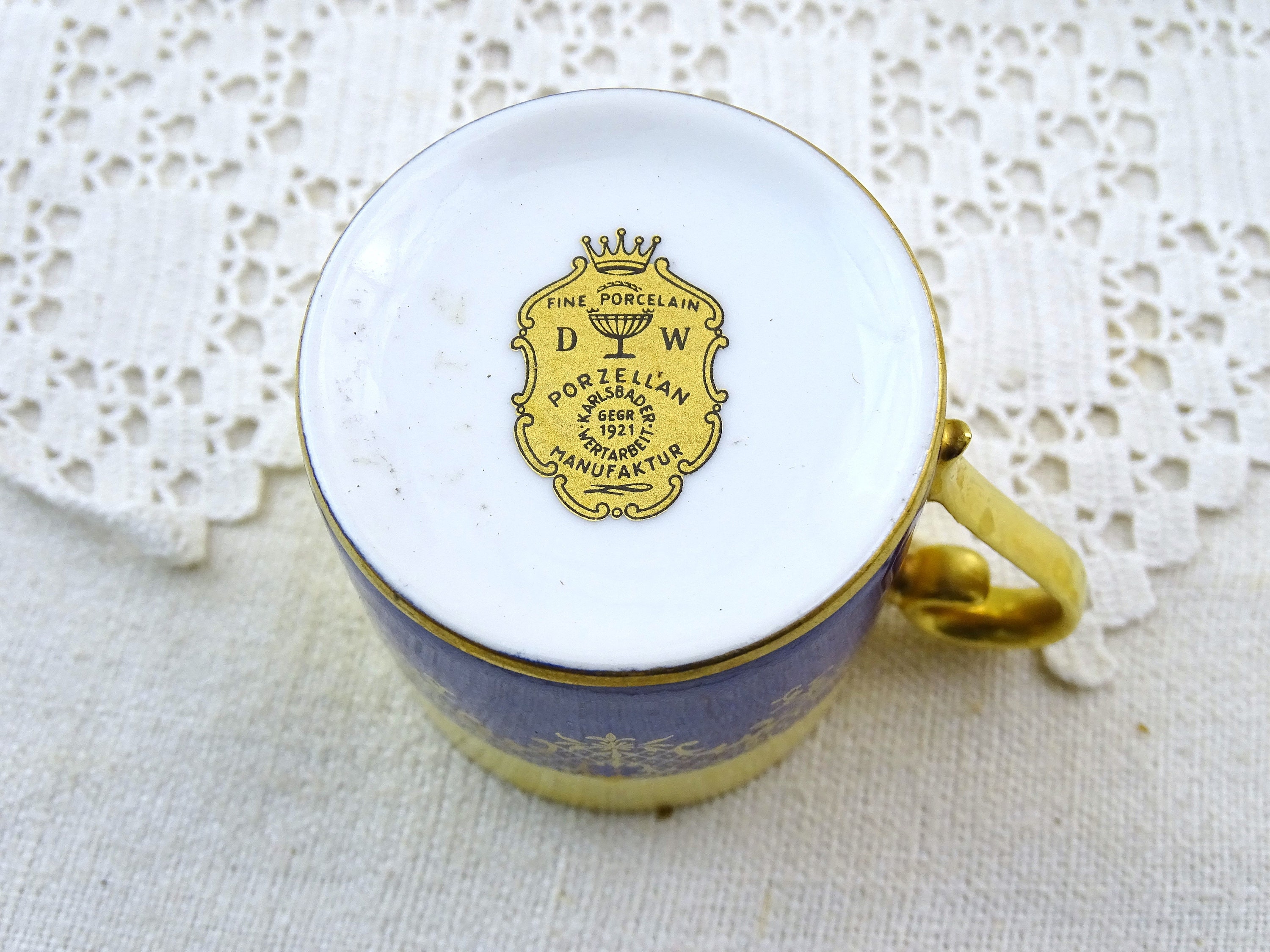 2 small vintage fine porcelain espresso cups and saucers in Prussian blue with gold. Made by DW Karlsbader Wertarbeit of fine porcelain with gold. Ca 1950s- 1960s.