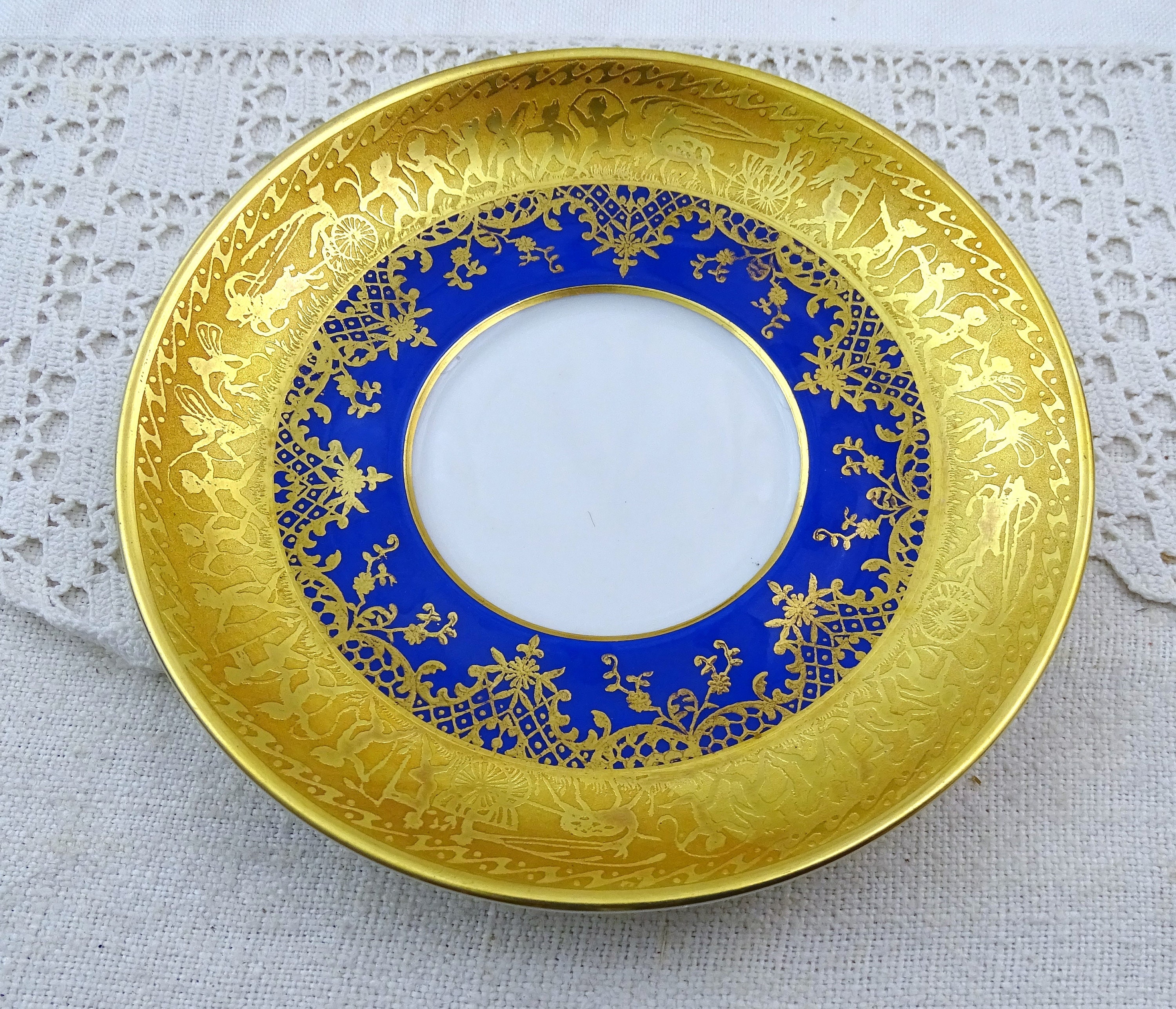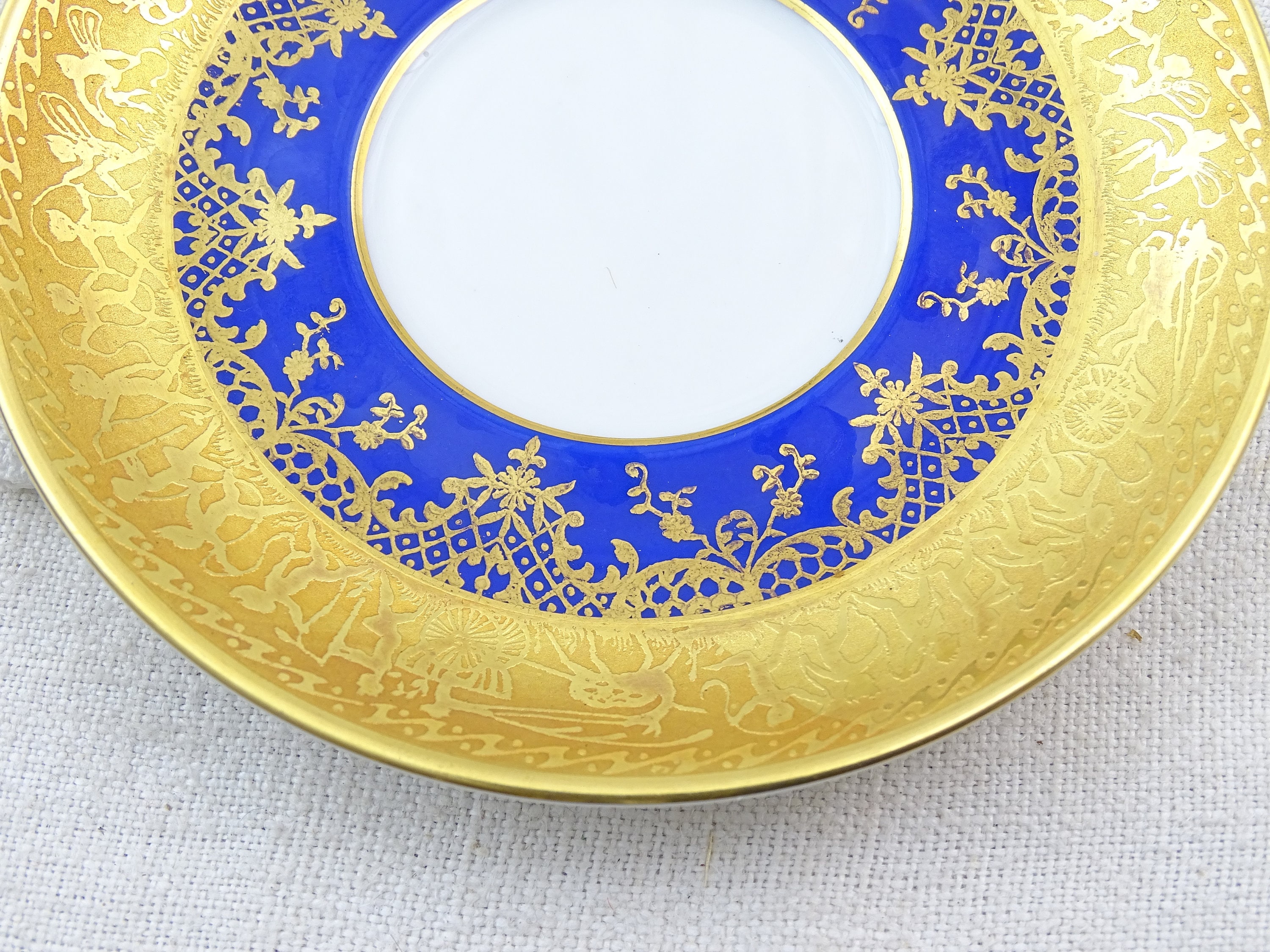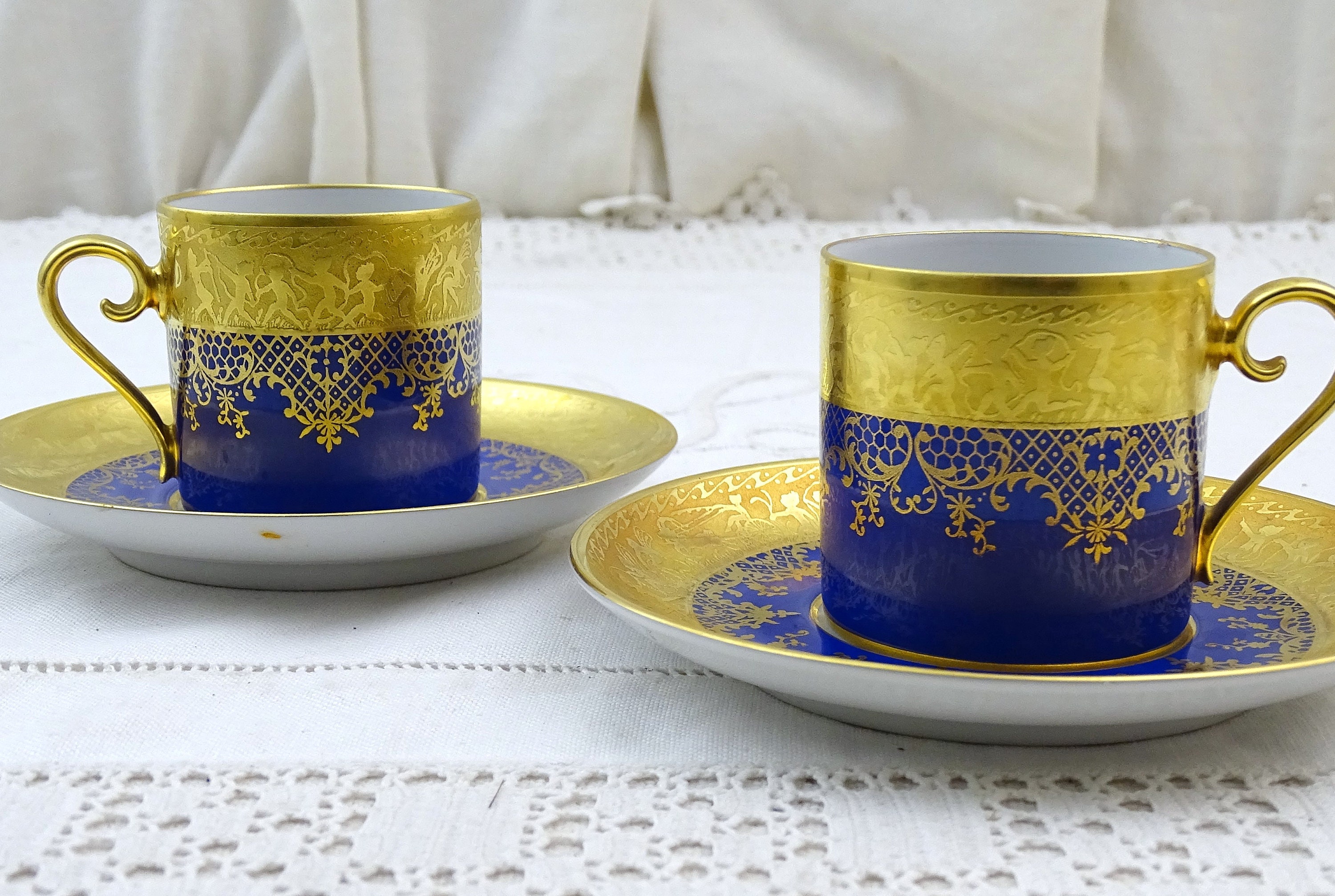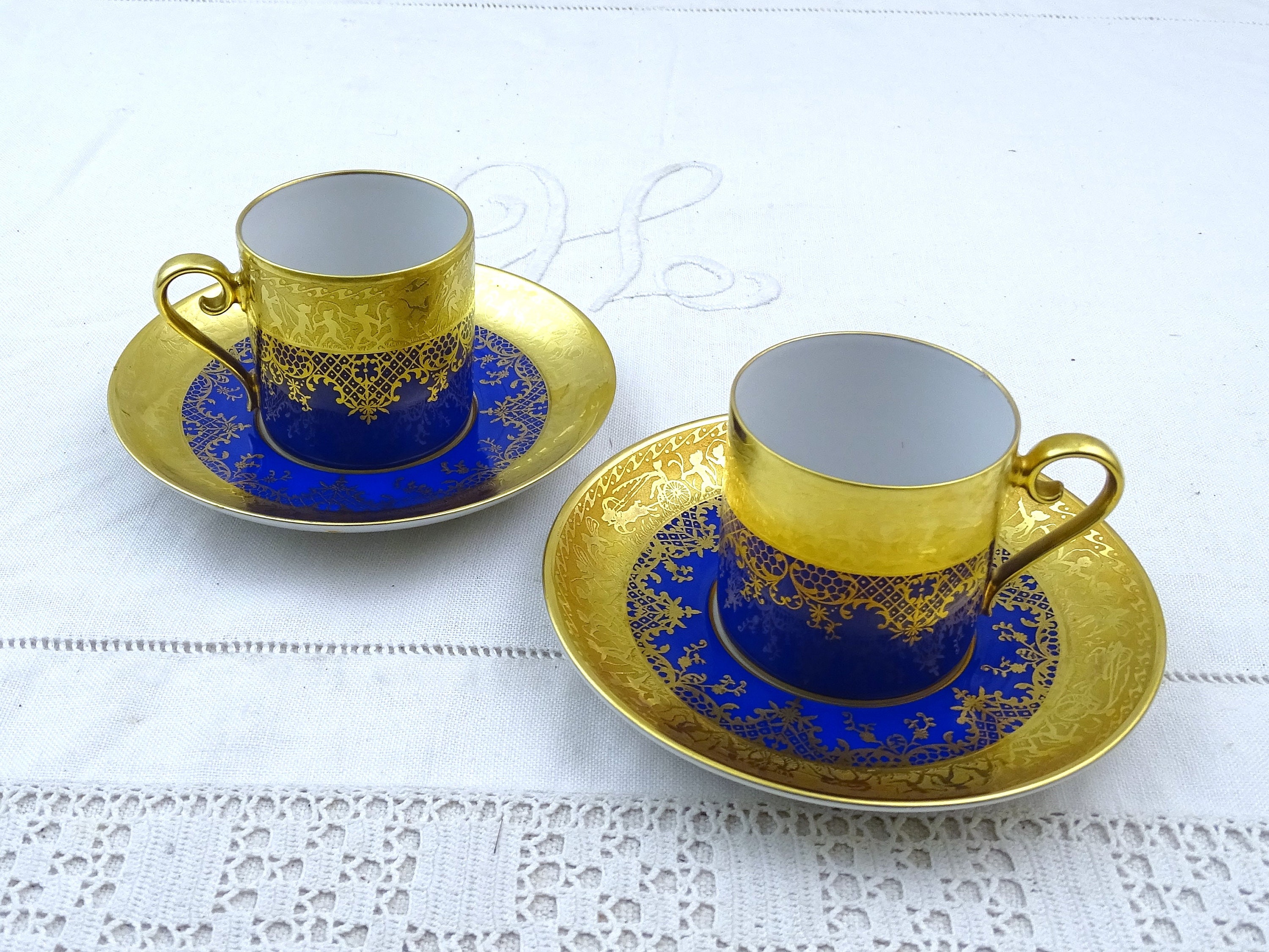 2 small vintage fine porcelain espresso cups and saucers in Prussian blue with gold. Made by DW Karlsbader Wertarbeit of fine porcelain with gold. Ca 1950s- 1960s.