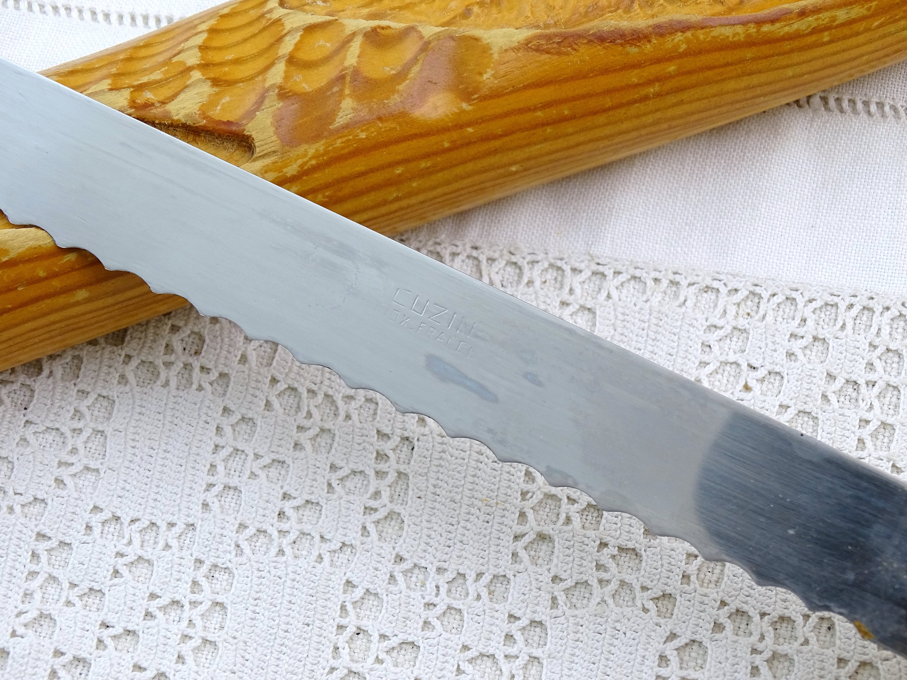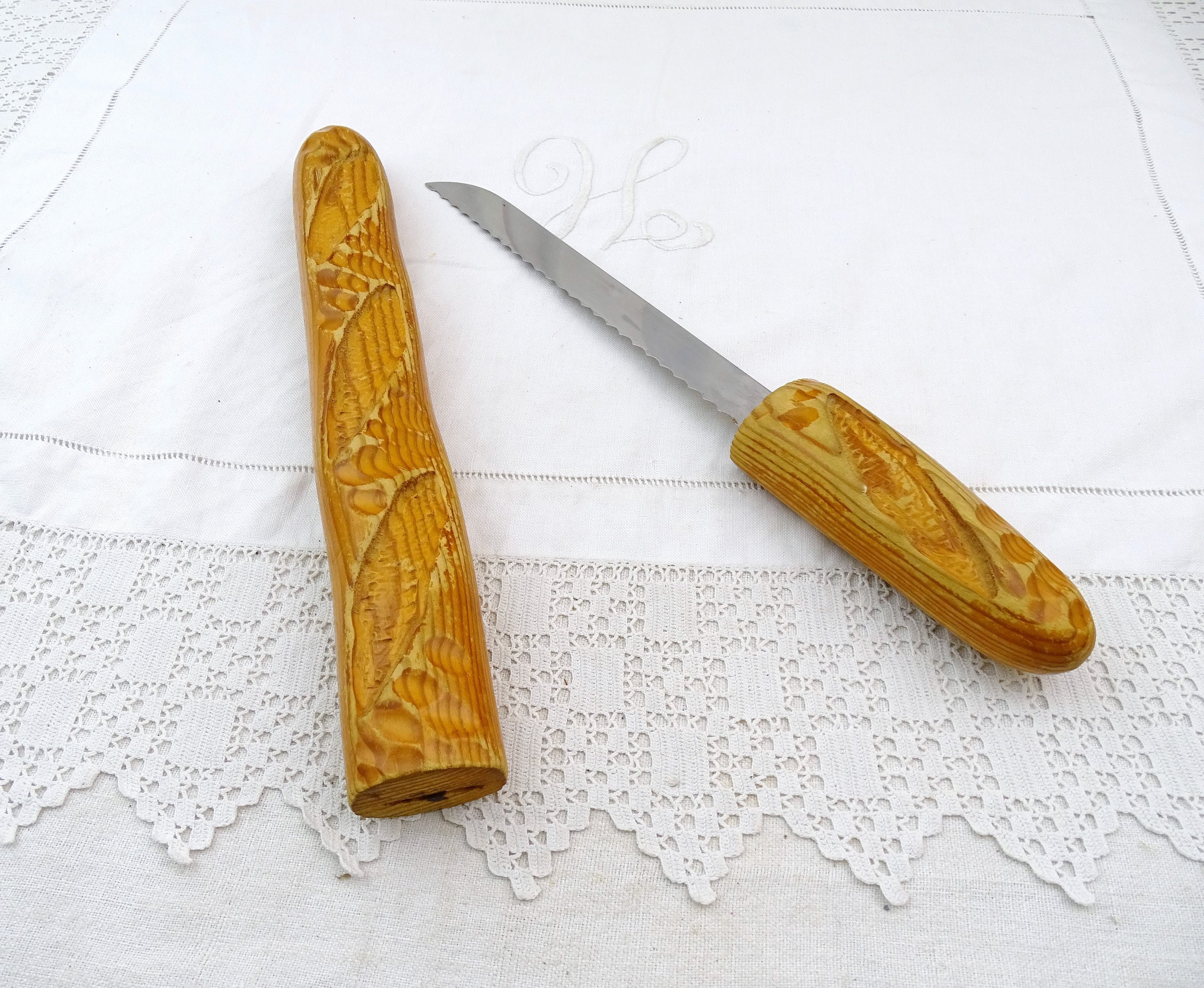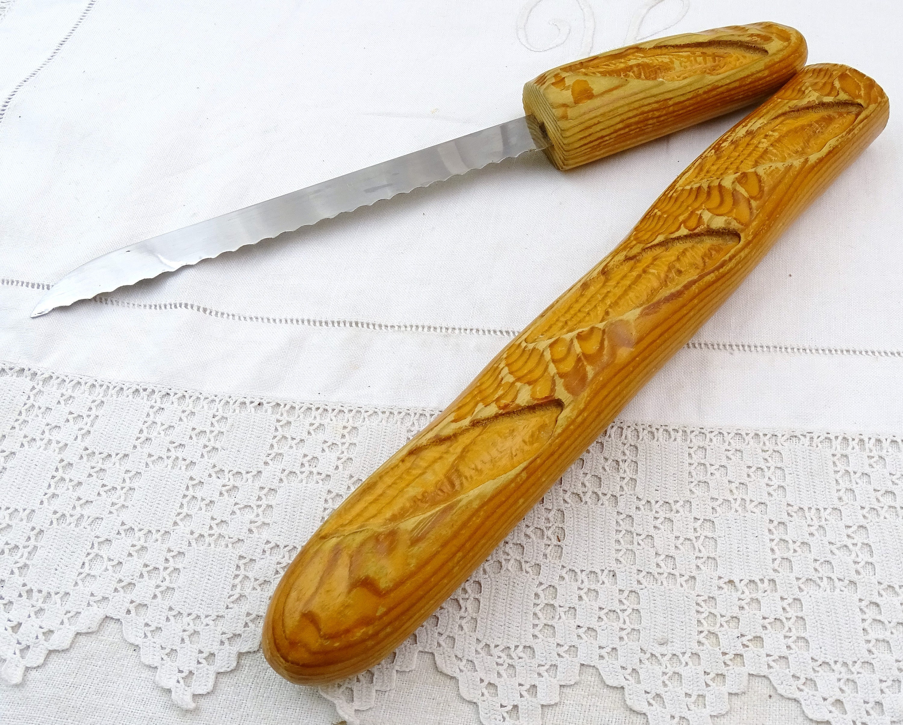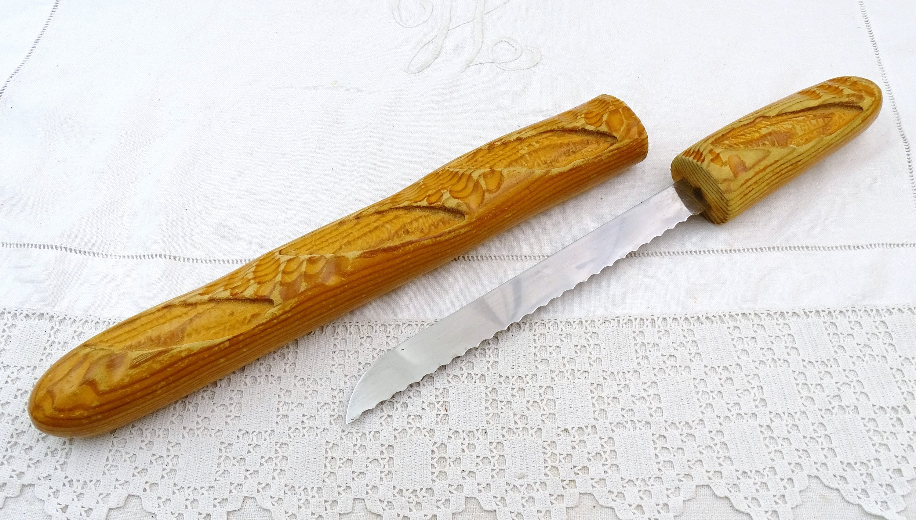 Vintage French bread knife shaped as a baguette loaf. Made by Cuzin of wood and stainless steel. Ca 1980s- 2000s.