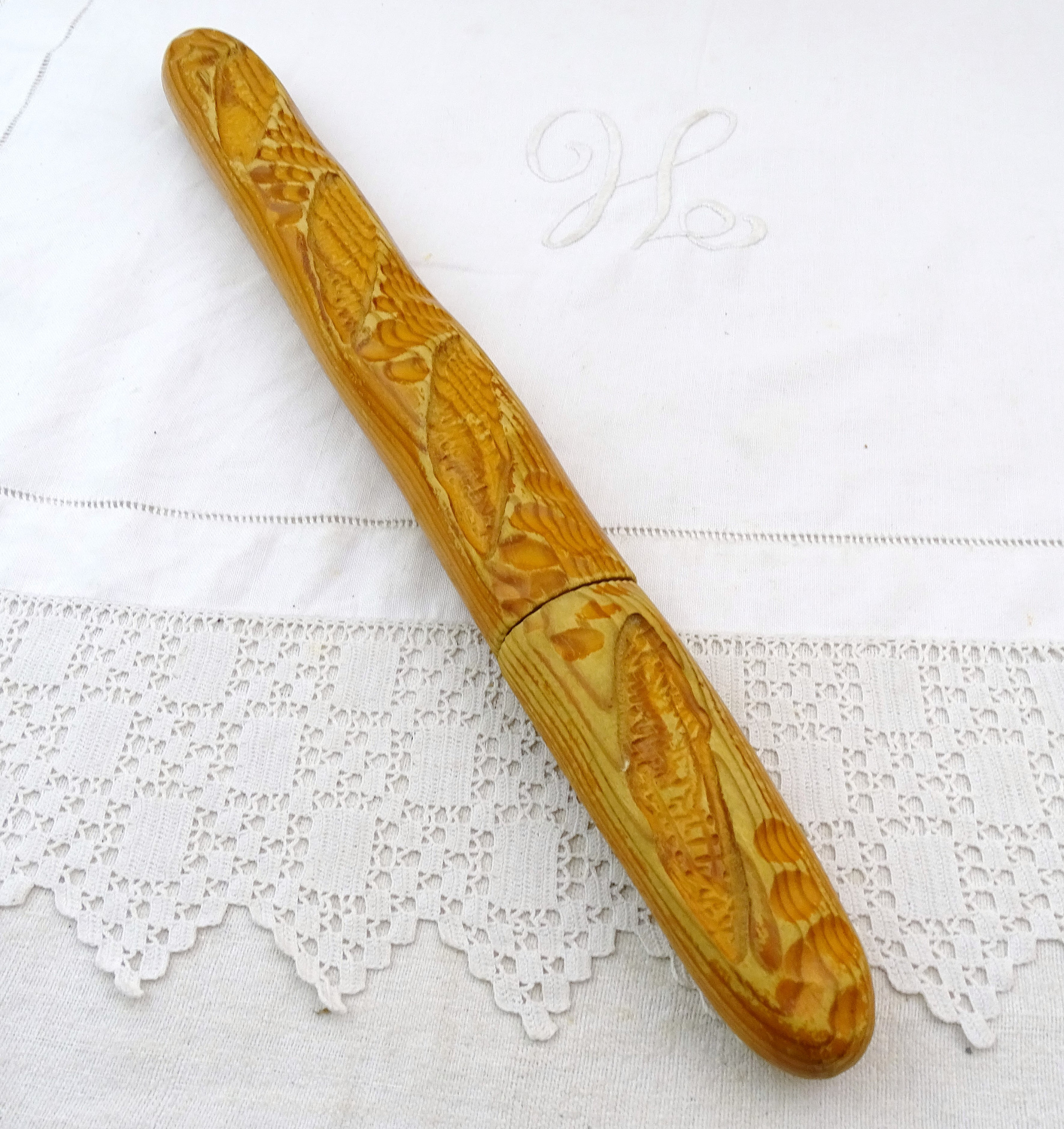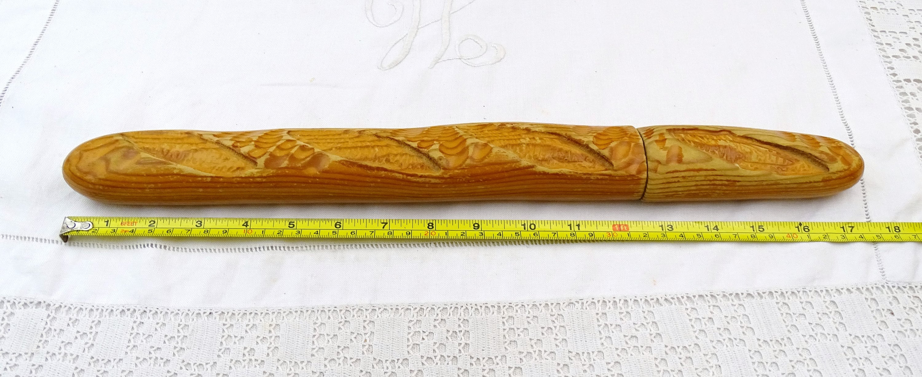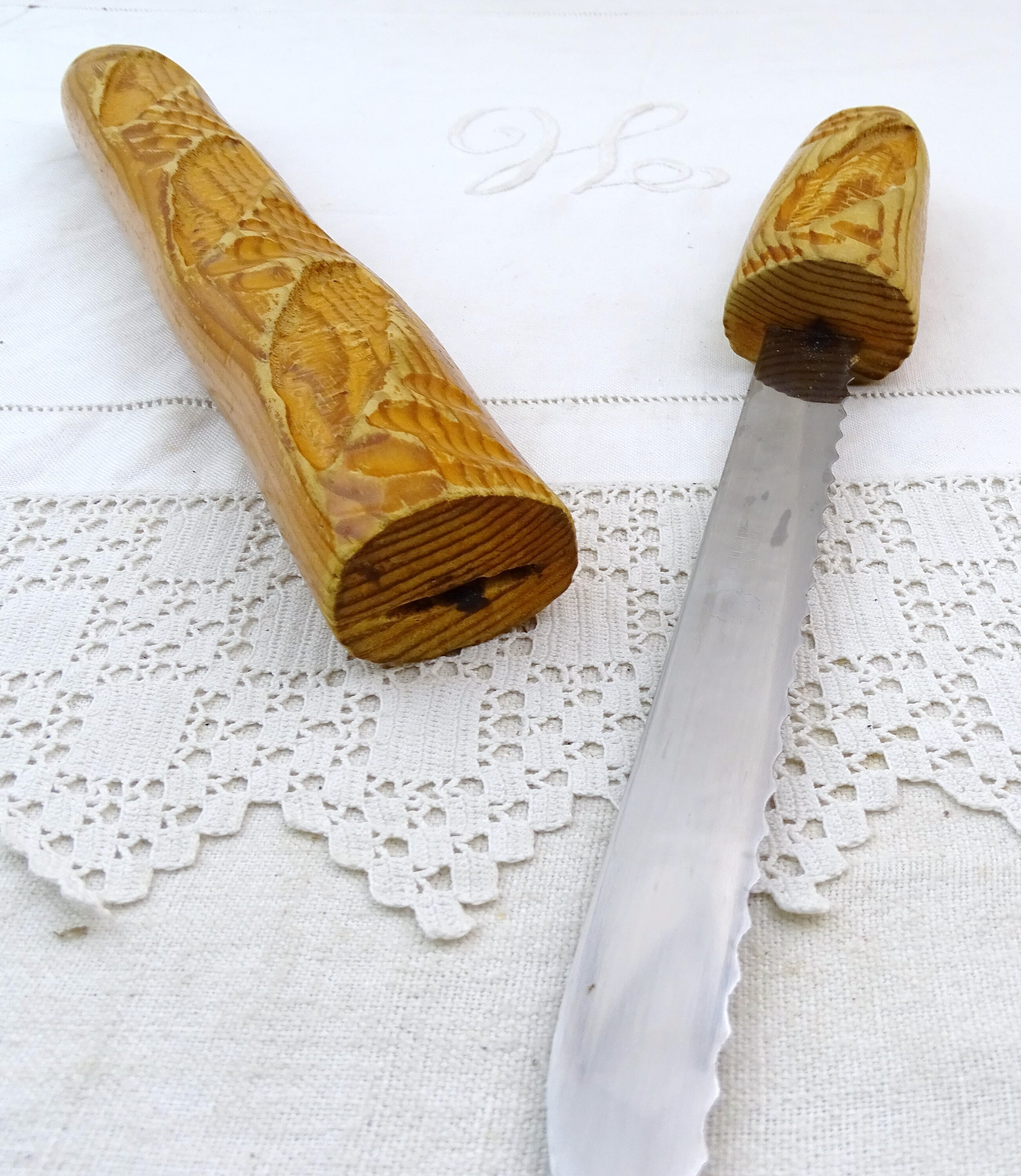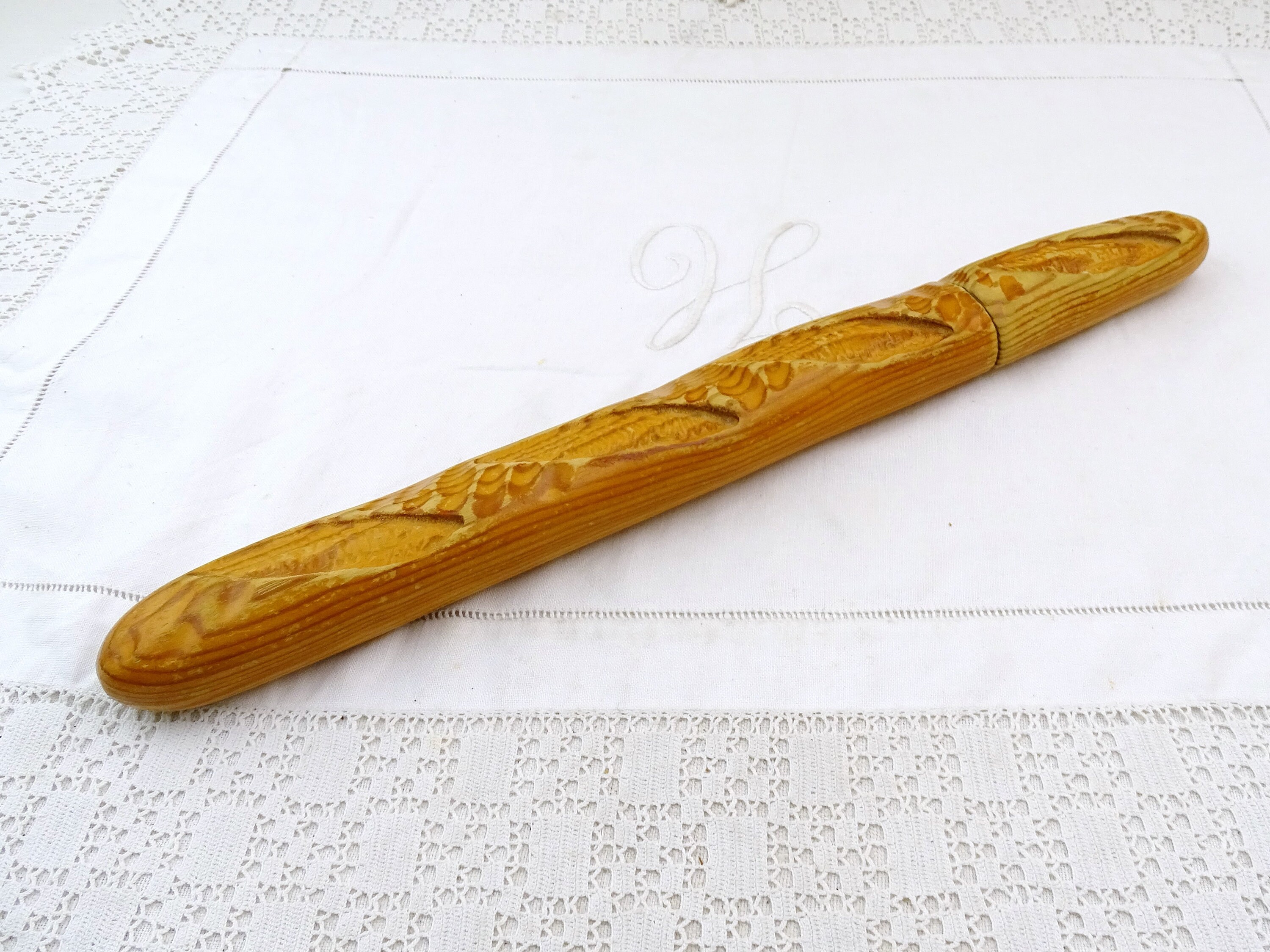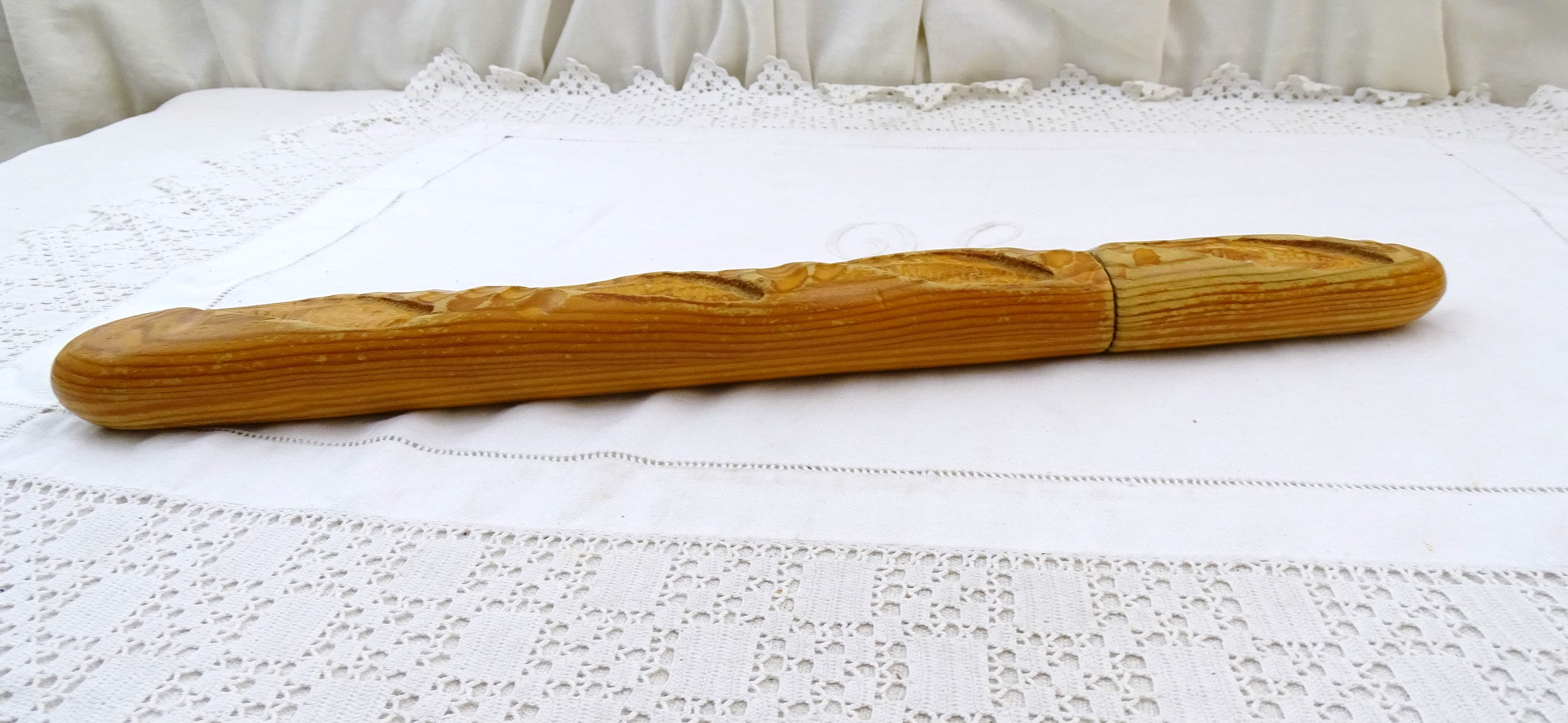 Vintage French bread knife shaped as a baguette loaf. Made by Cuzin of wood and stainless steel. Ca 1980s- 2000s.