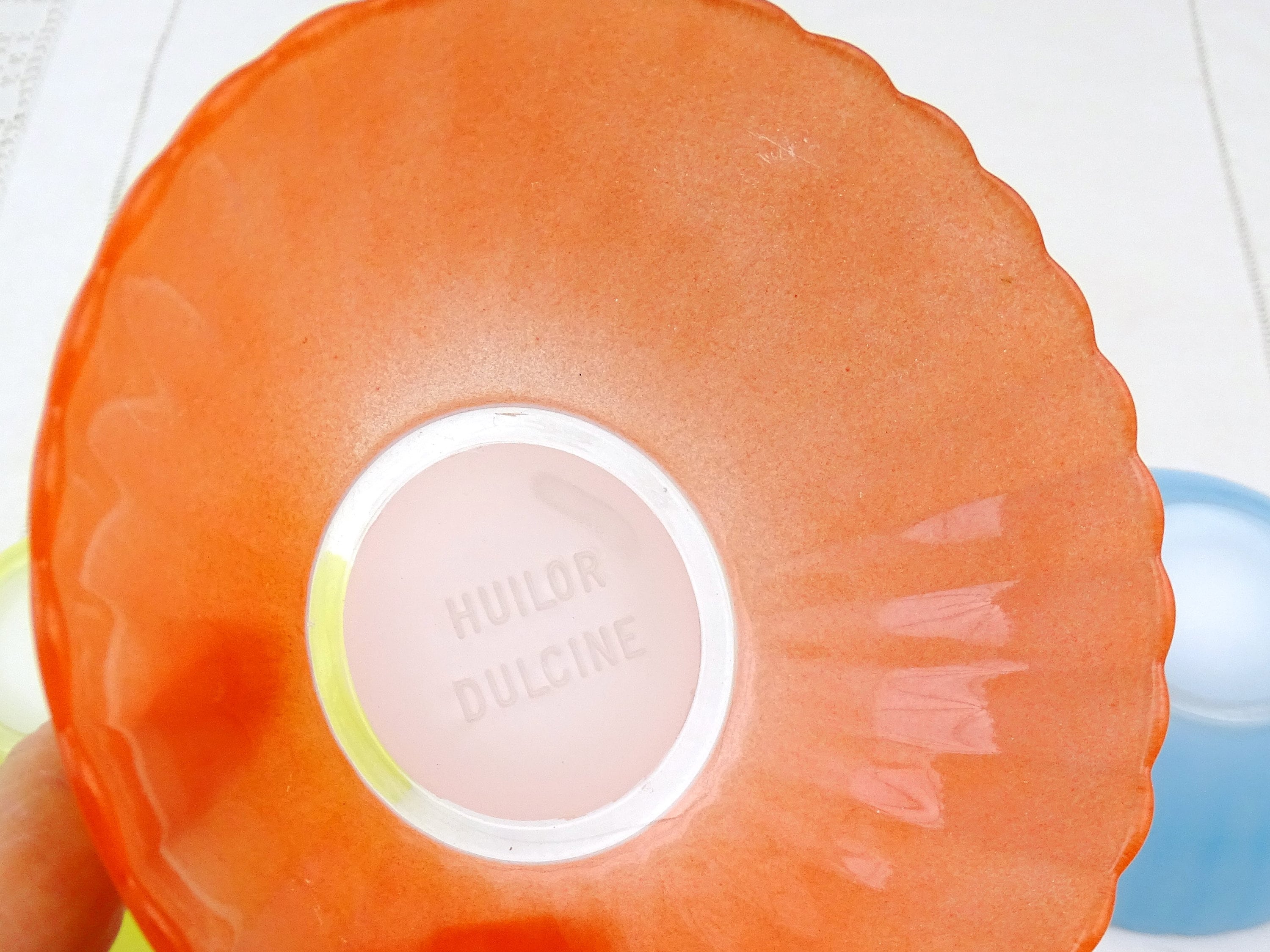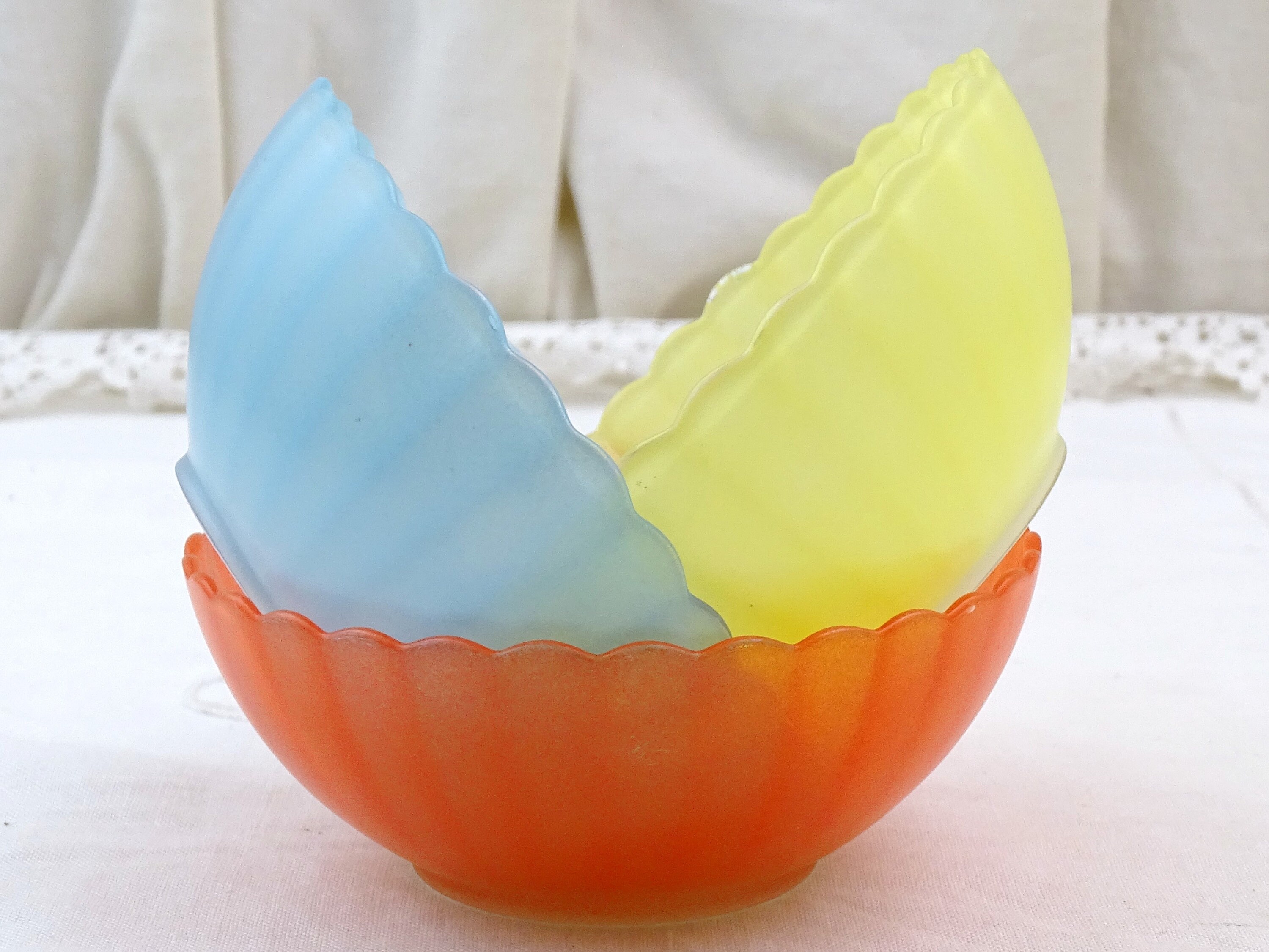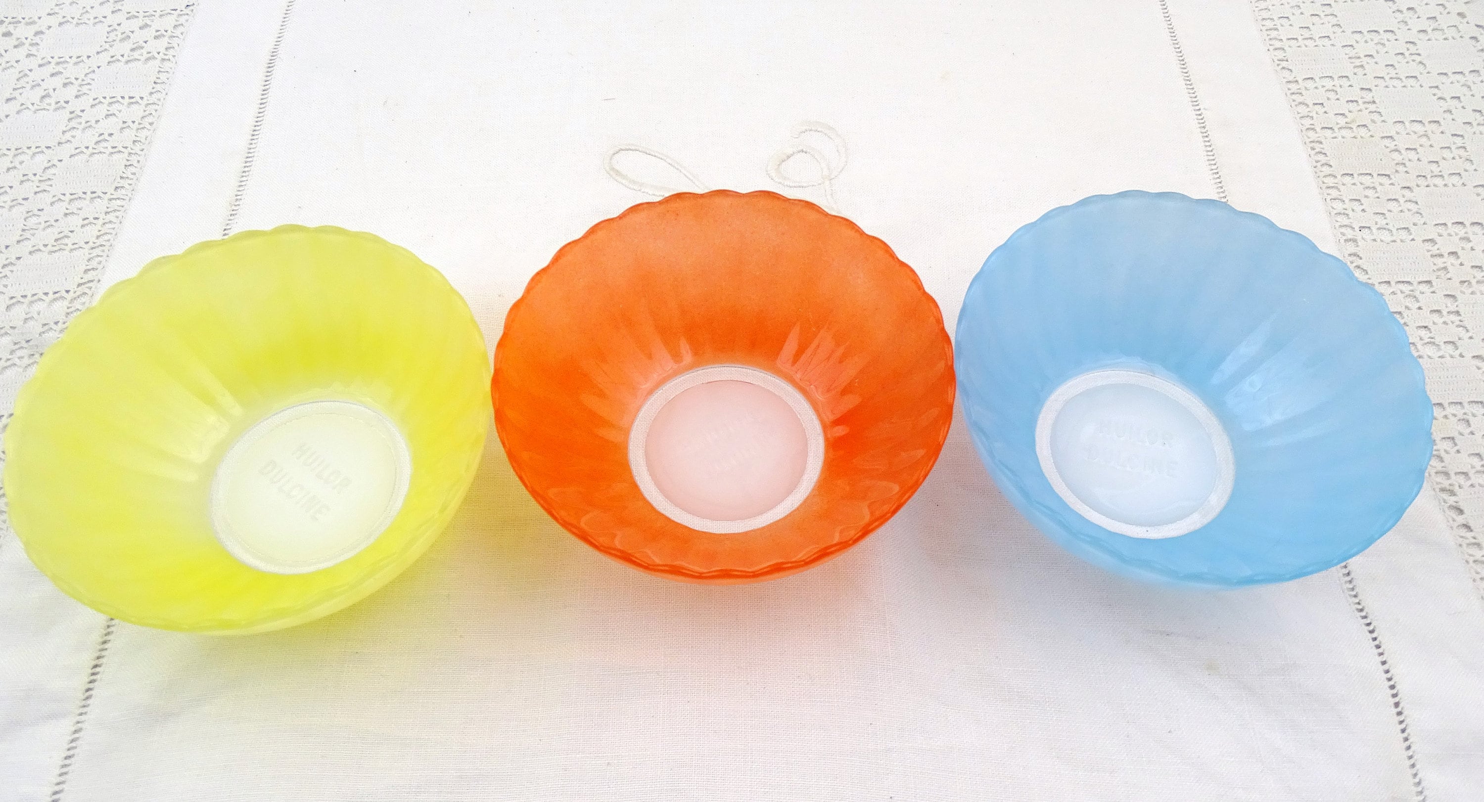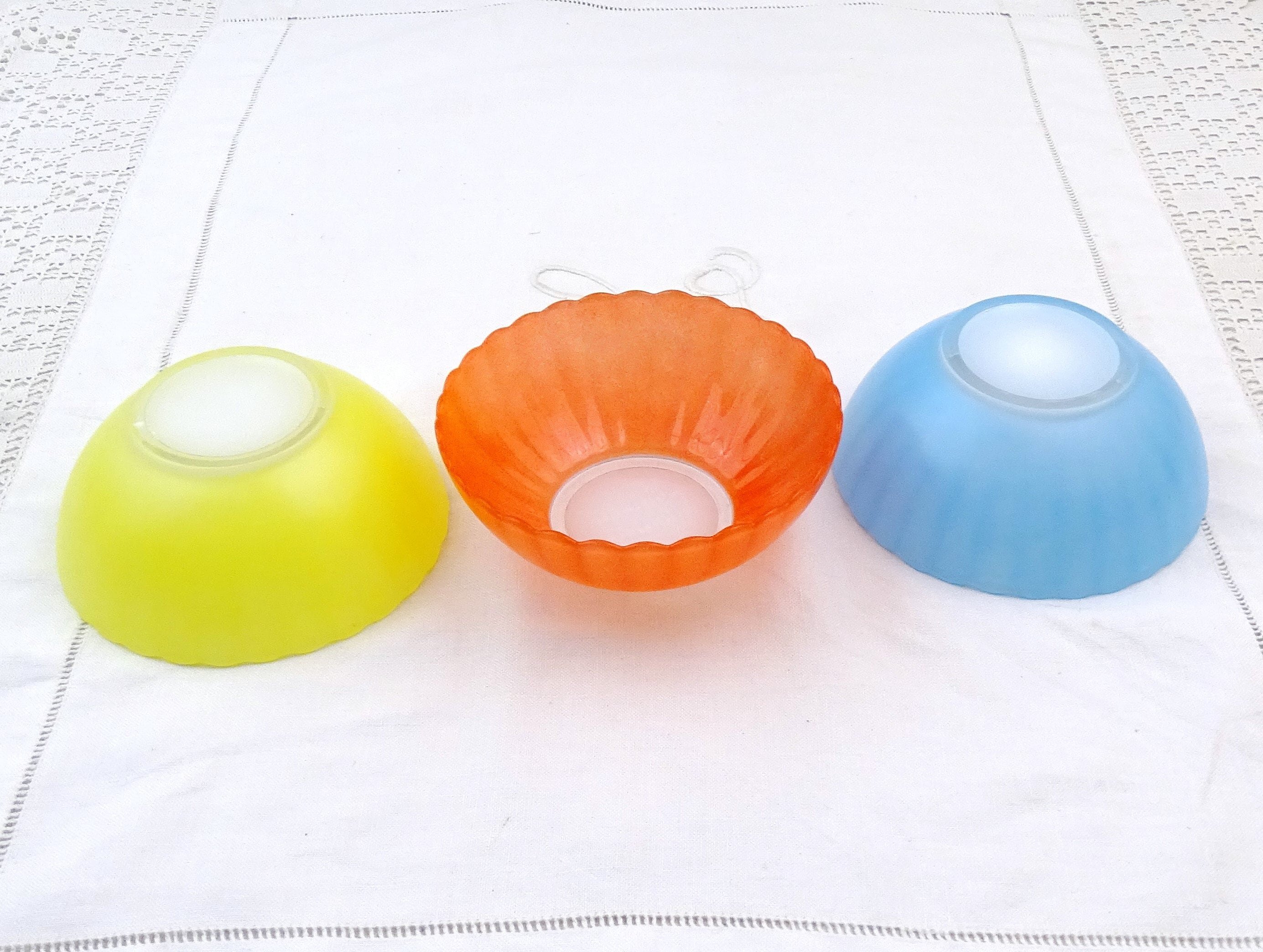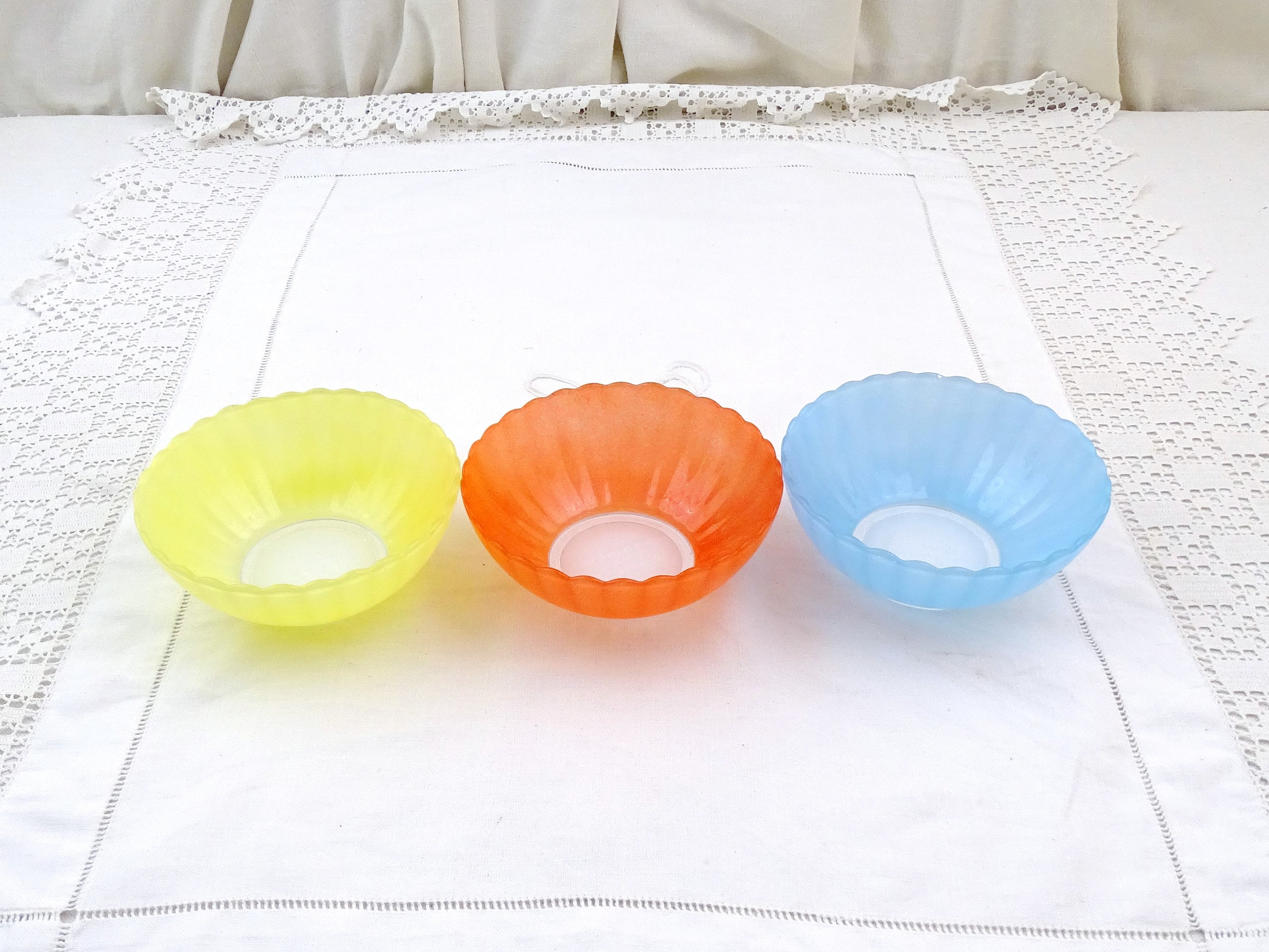 Vintage set of 3 colored glass ribbed dessert bowls. Promotional gift from cooking oil company Huilor Dulcine. Made of glass. Ca 1960s.