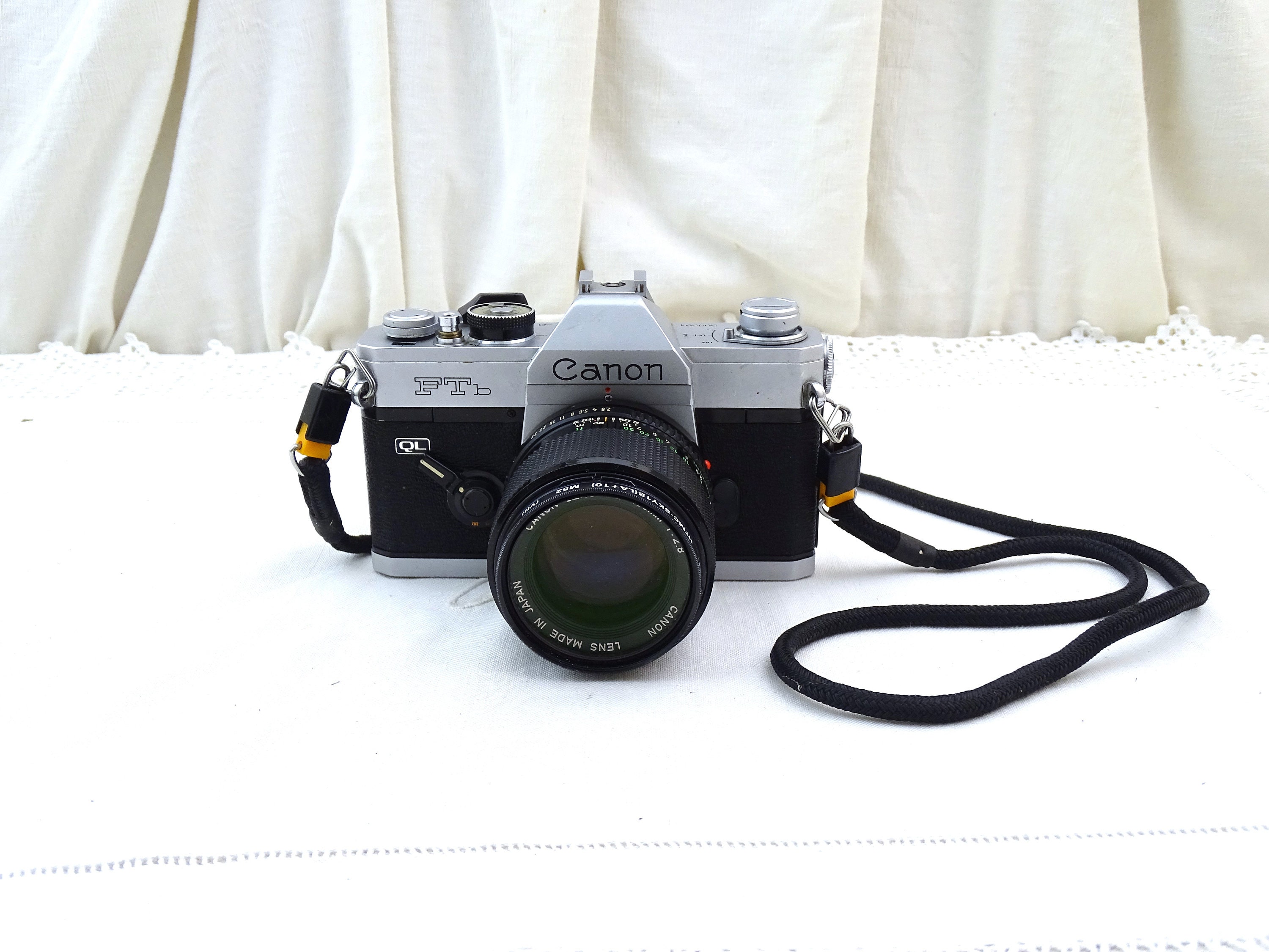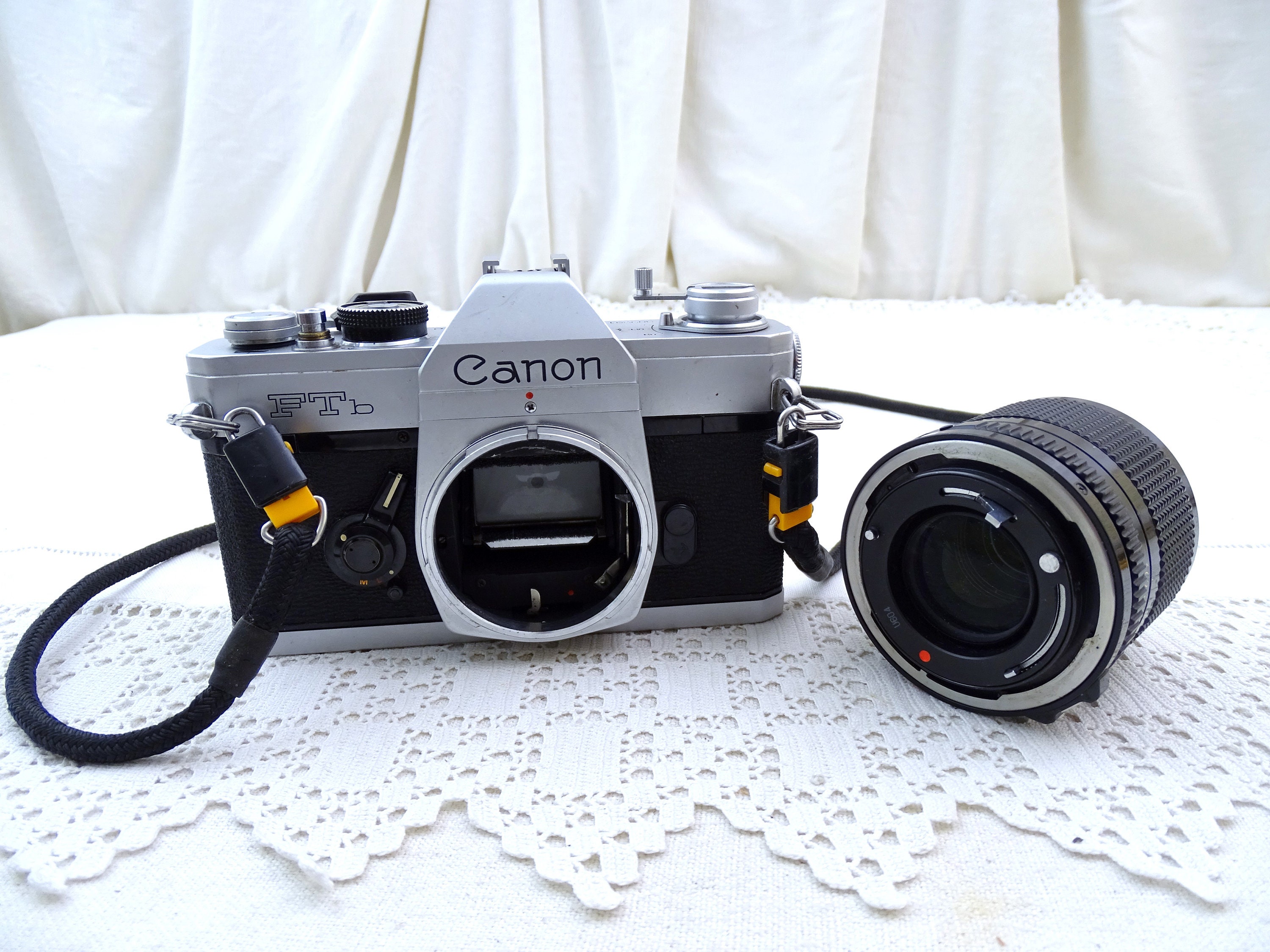 Vintage Canon FTb film camera and 100mm lens. Made in Japan in the 70s. In need of repair, the mechanism has seized and the shutter does close for some reason, or as a decorative piece, the lens has not been tested.