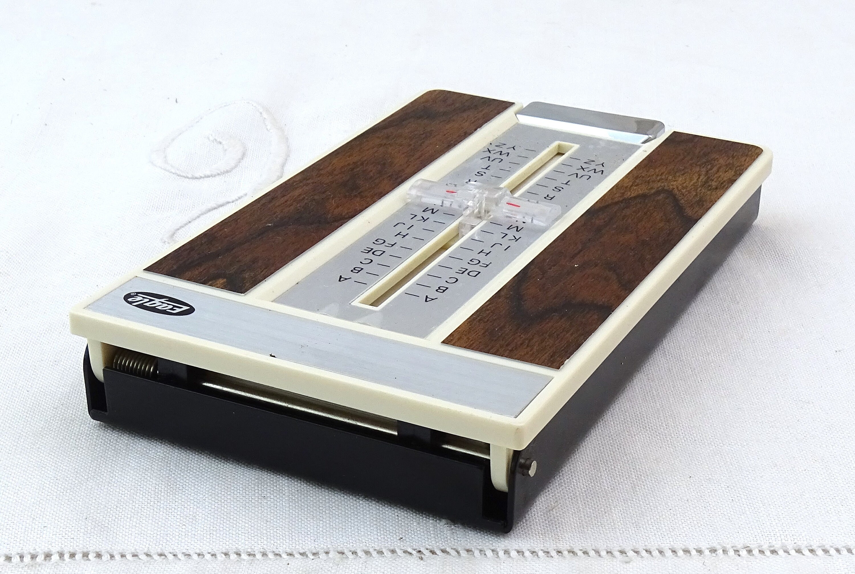 Vintage pop up phone number and address file. Made of thick silver colored plastic with fake wooden veneer the base is made of black colored metal. All the cards are unused. Circa 1960s / 1970s.