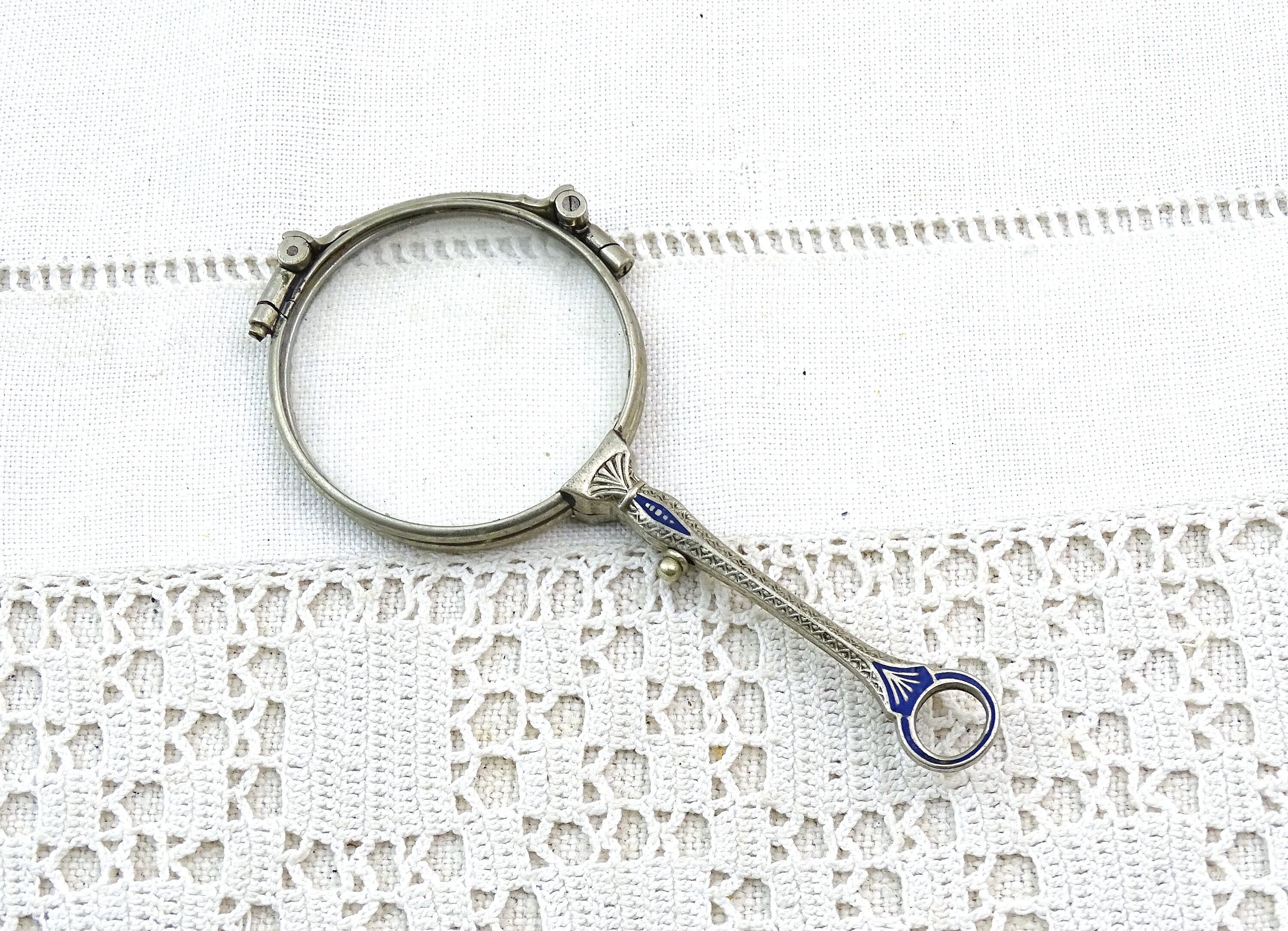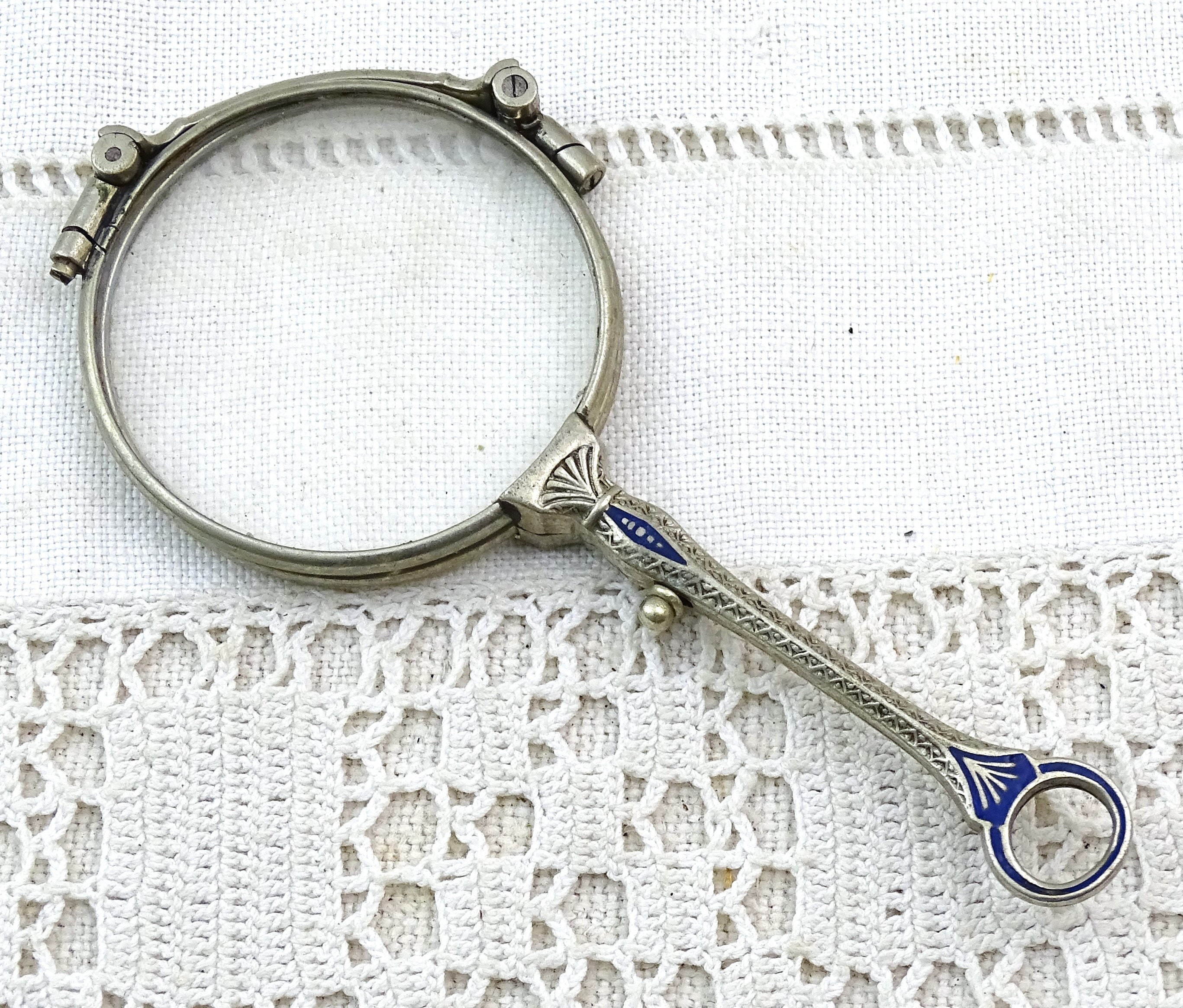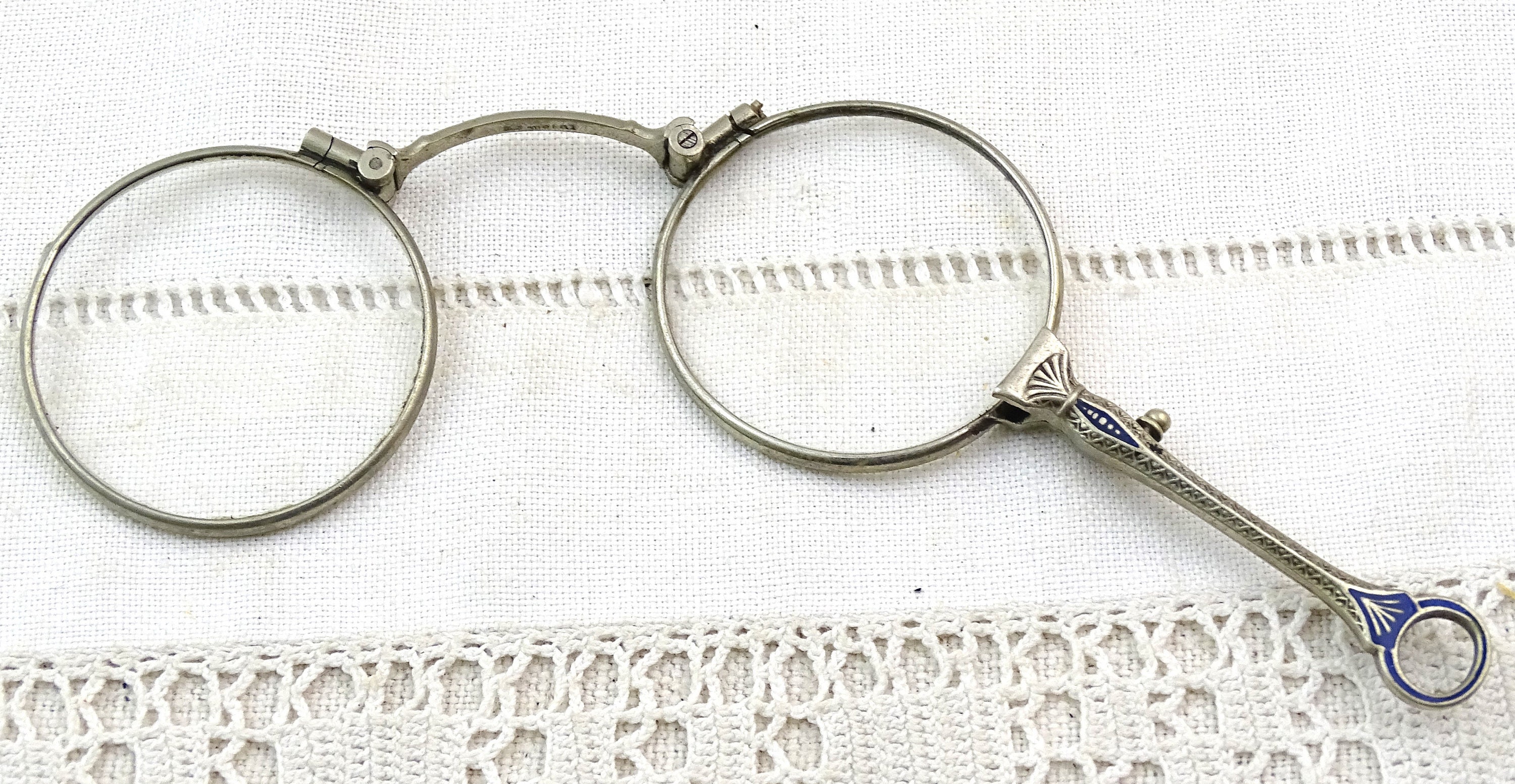 Antique Victorian magnifying spring action folding reading glasses. Made of silver tone metal with blue enamel. Ca 1800s.