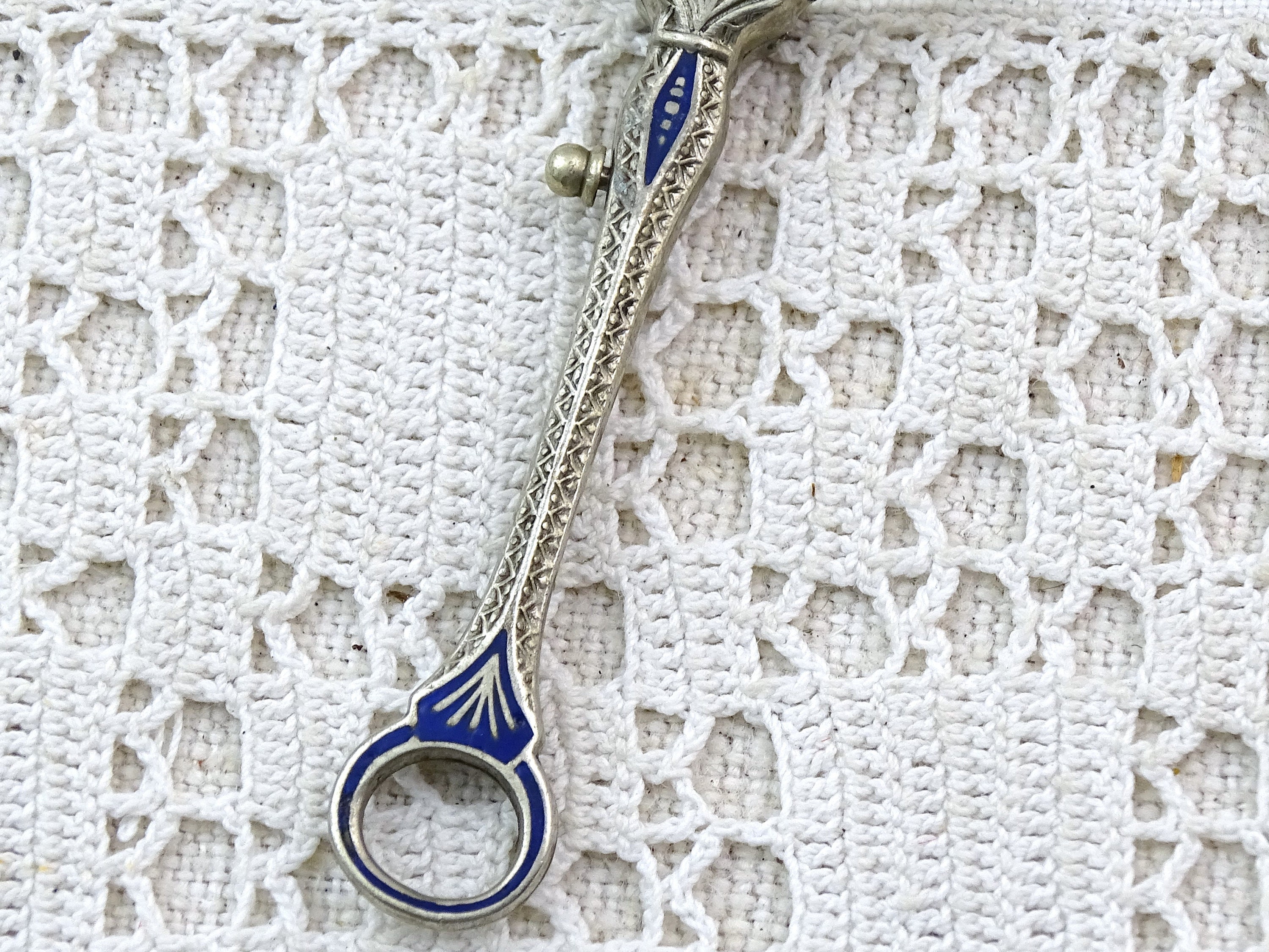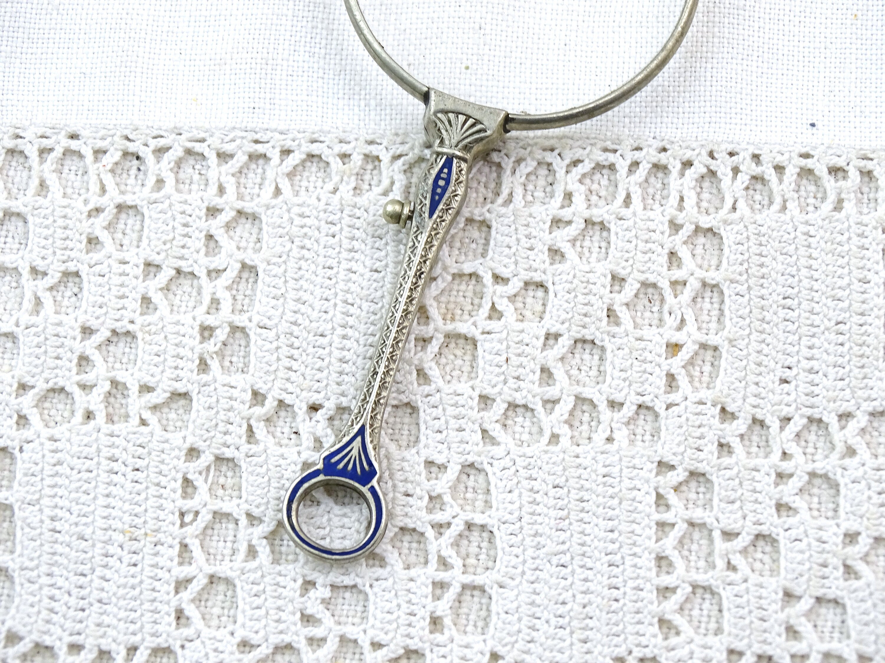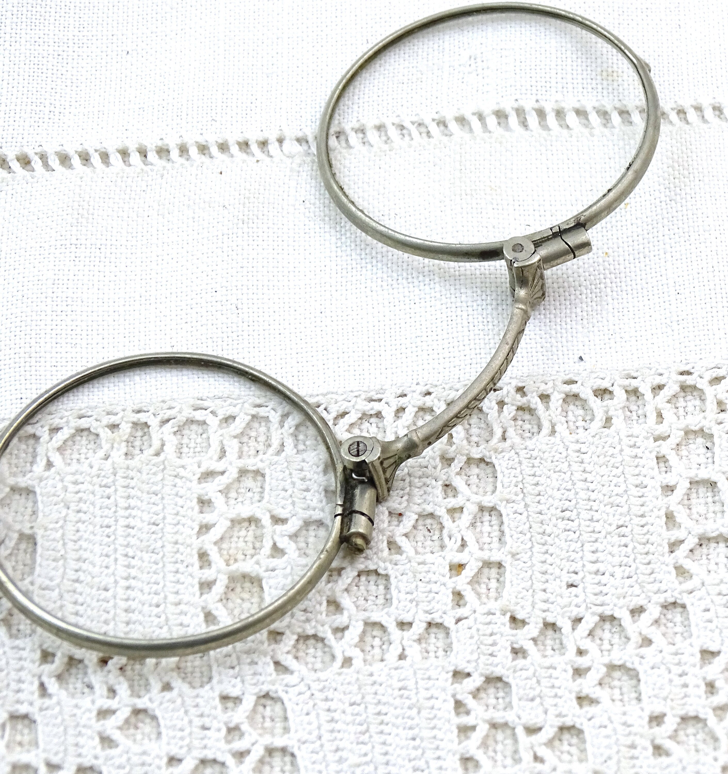 Antique Victorian magnifying spring action folding reading glasses. Made of silver tone metal with blue enamel. Ca 1800s.