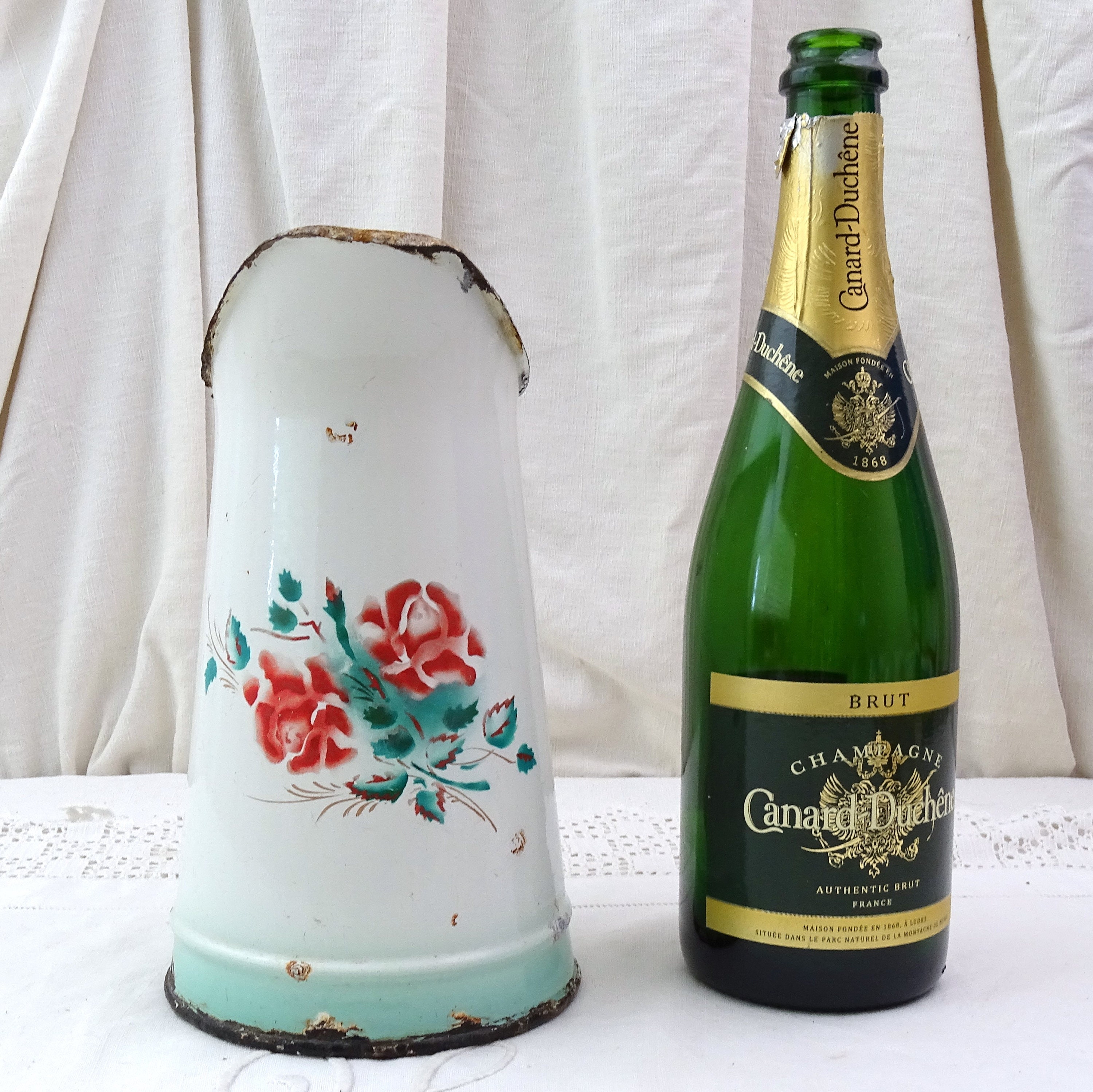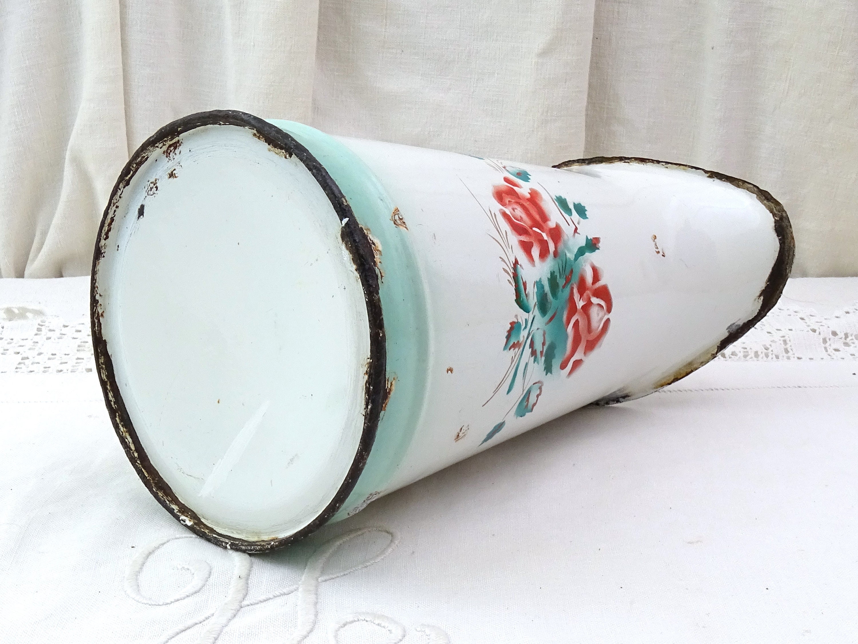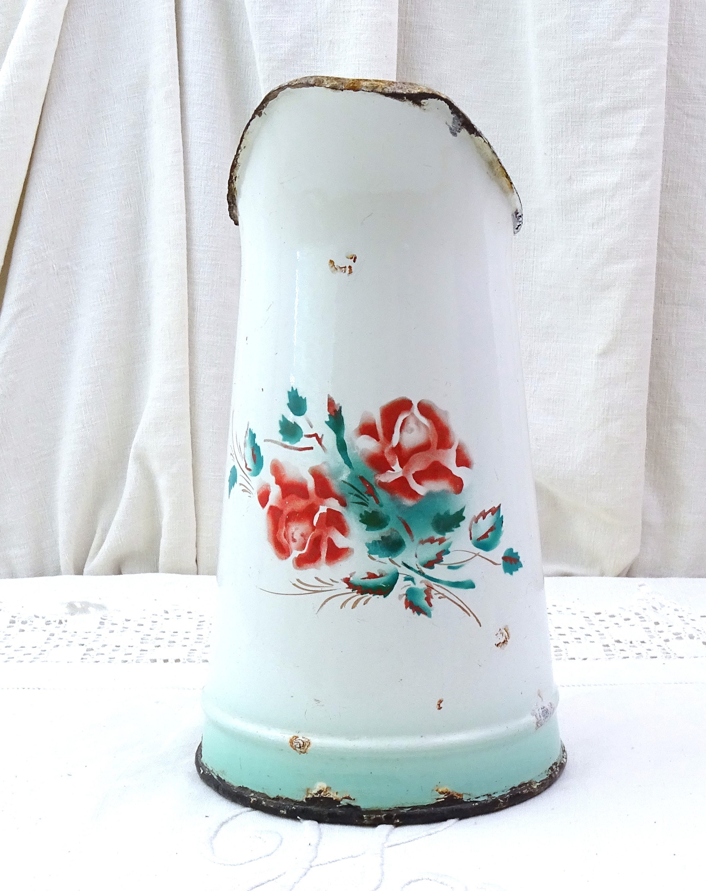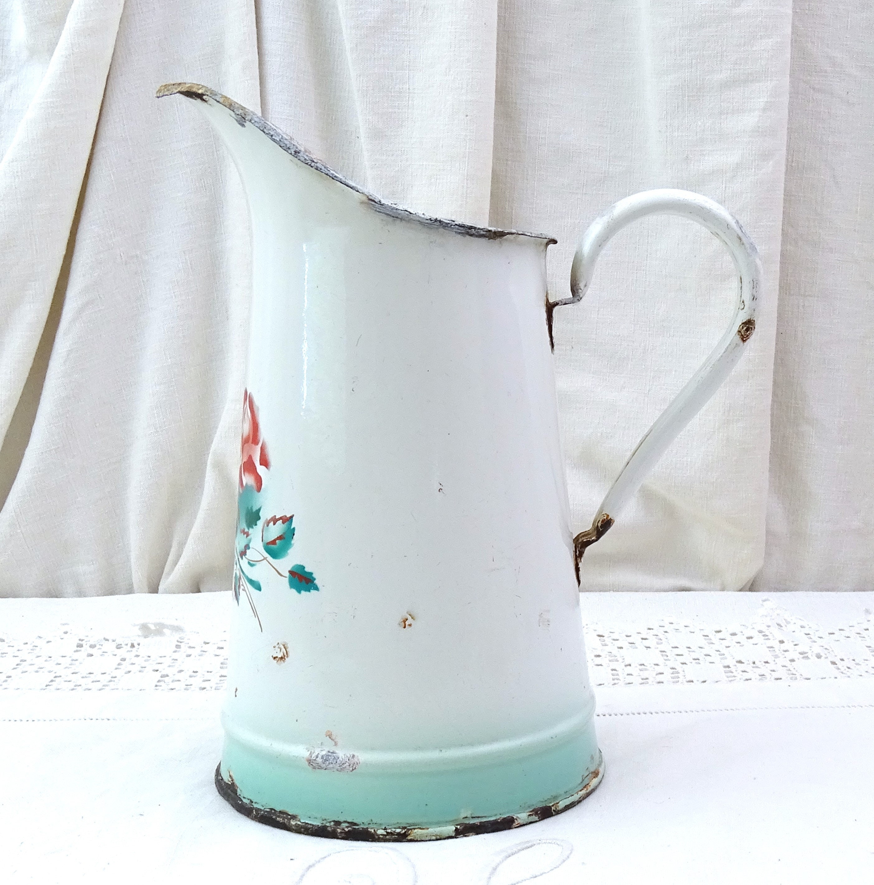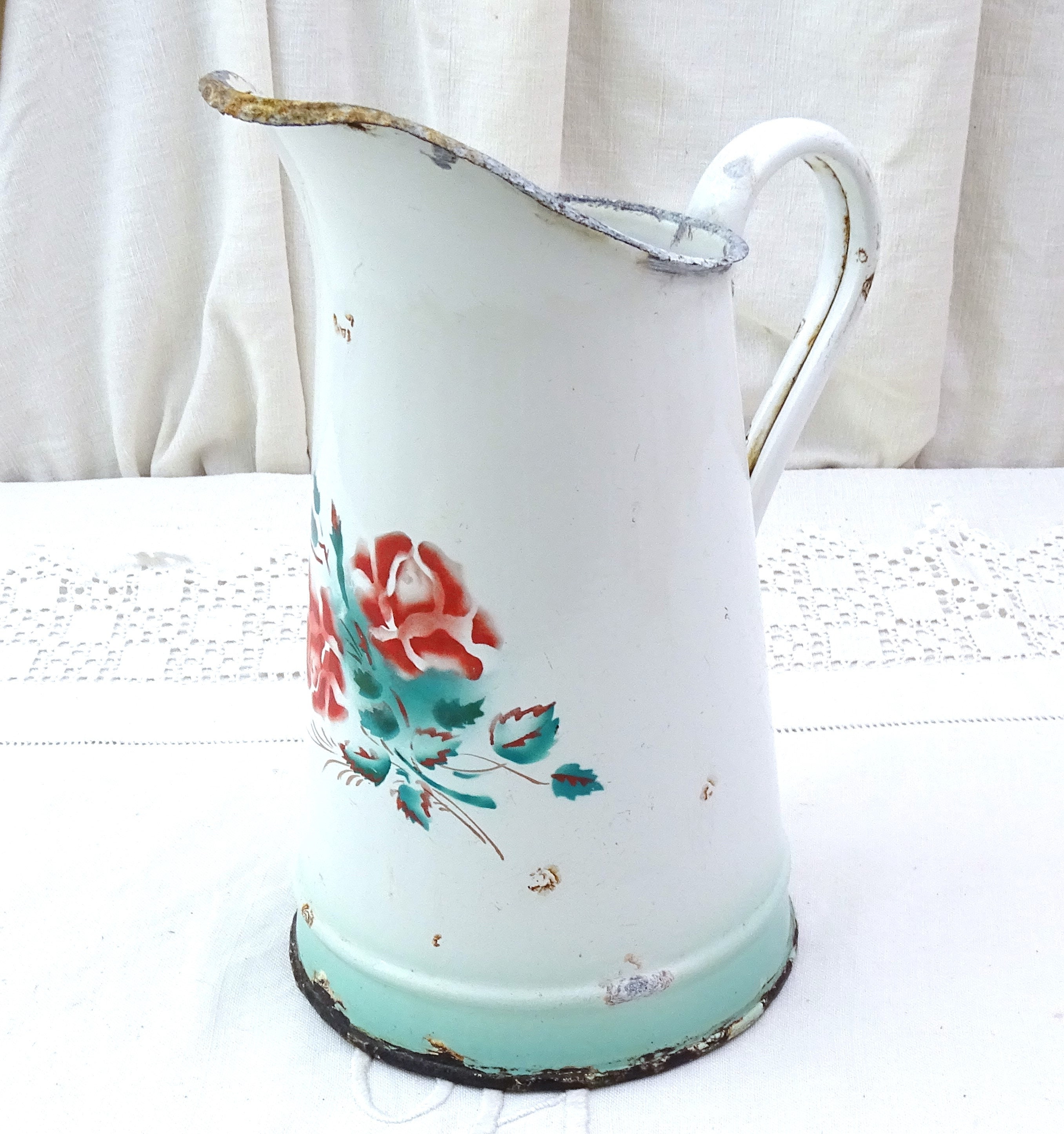Antique French enamel pitcher. White enamel on the outside and the inside with stenciled rose flower pattern. Ca late 1800s early 1900s.