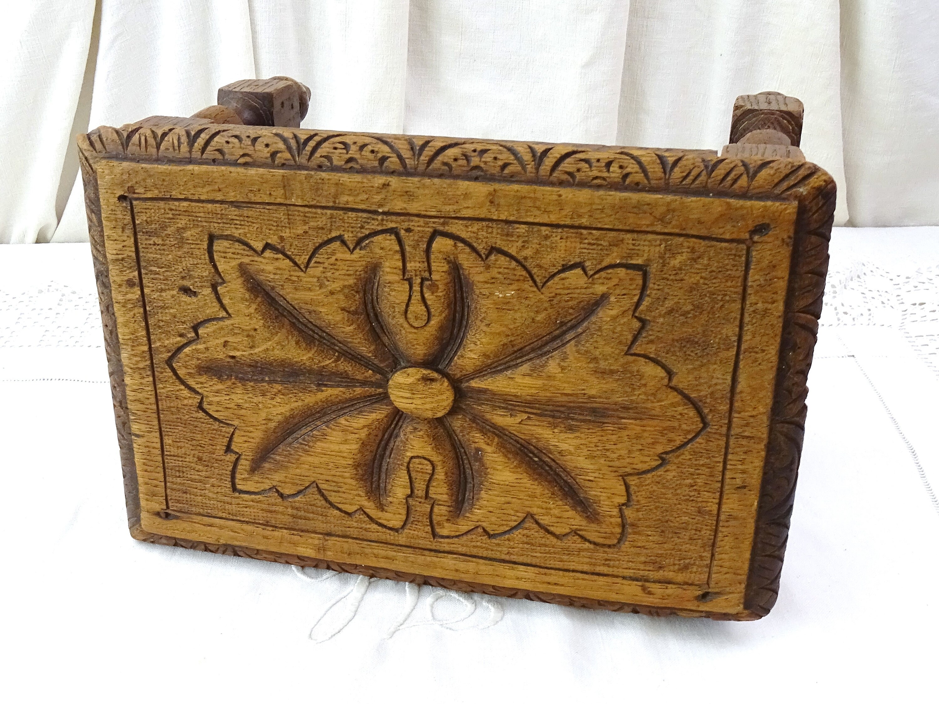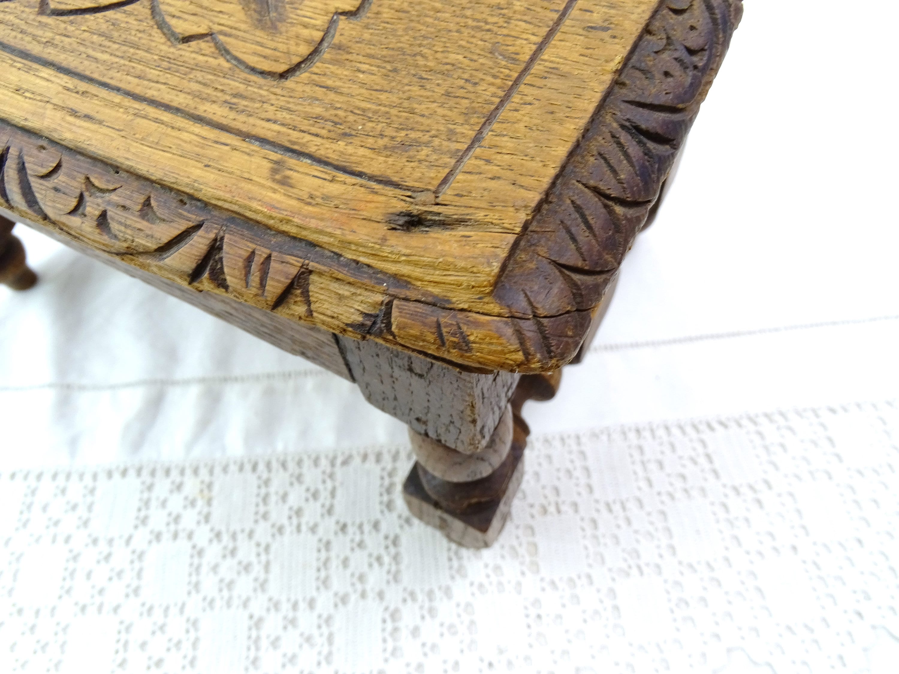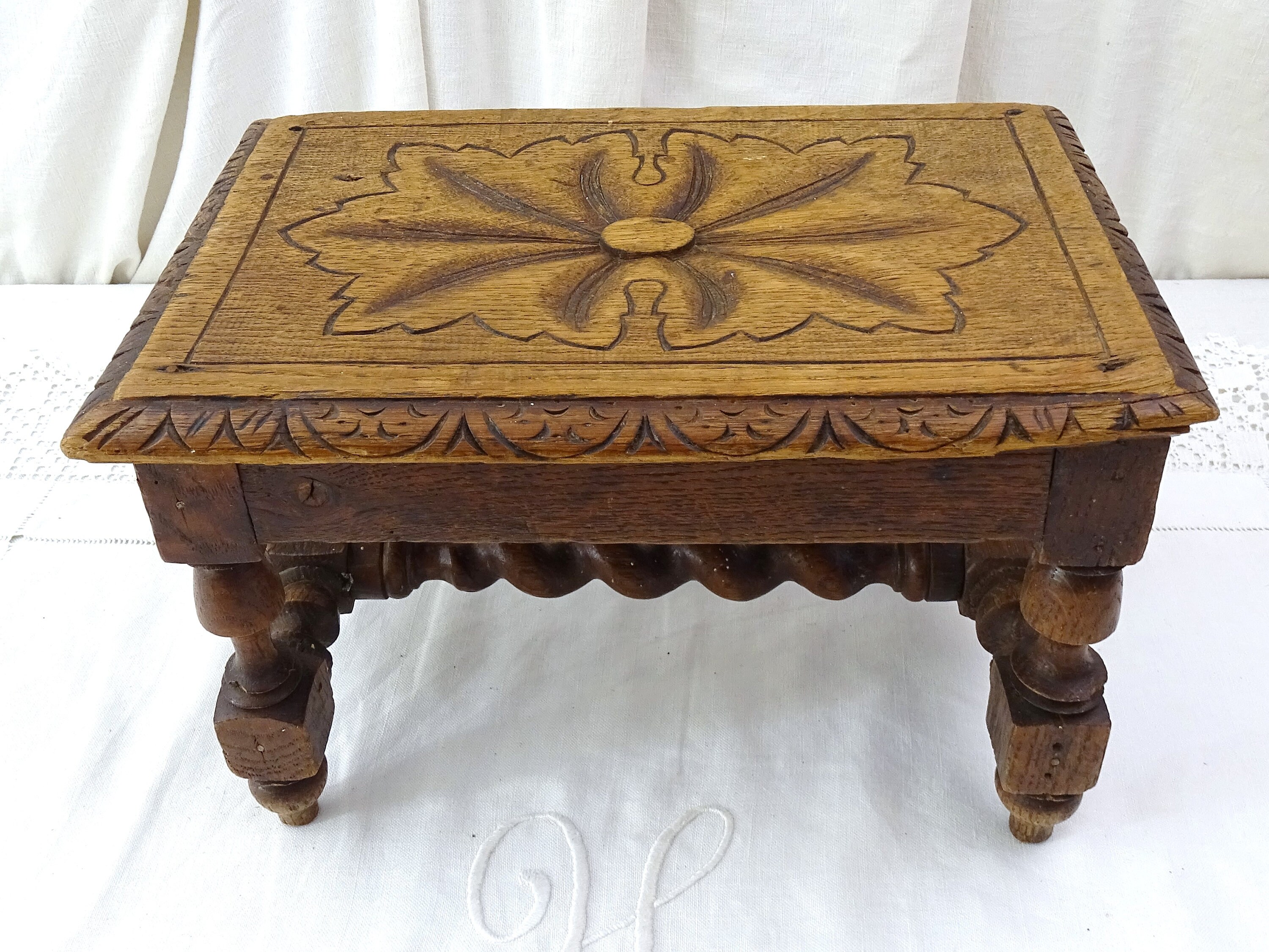 Small antique carved French foot stool with a worn patina. Made of oak wood. Ca early 1800s.