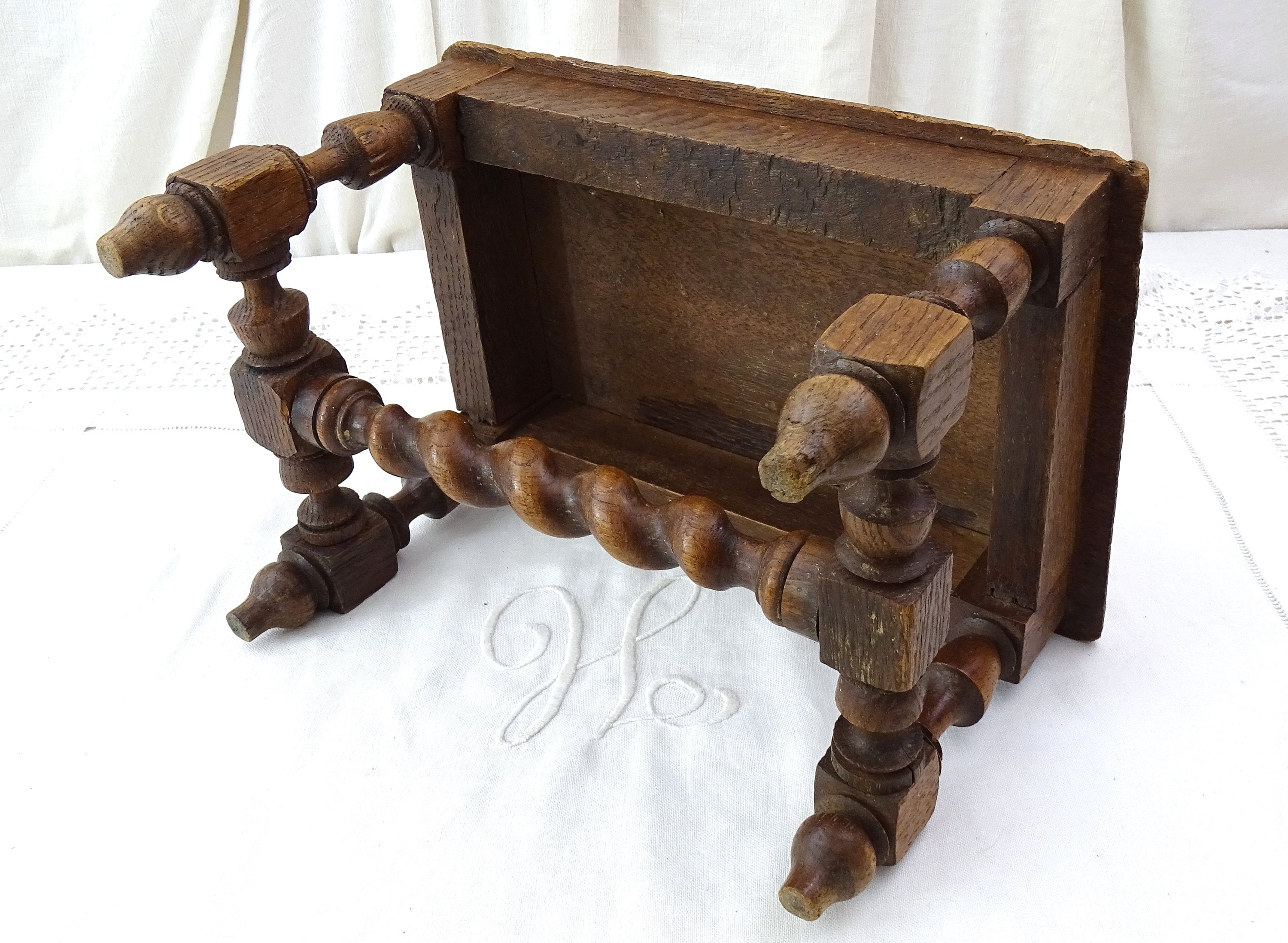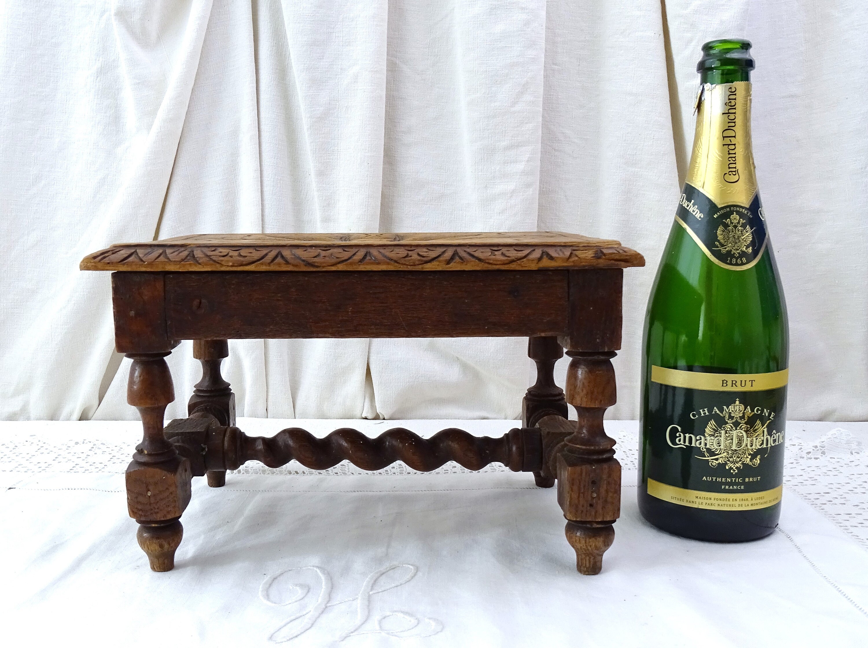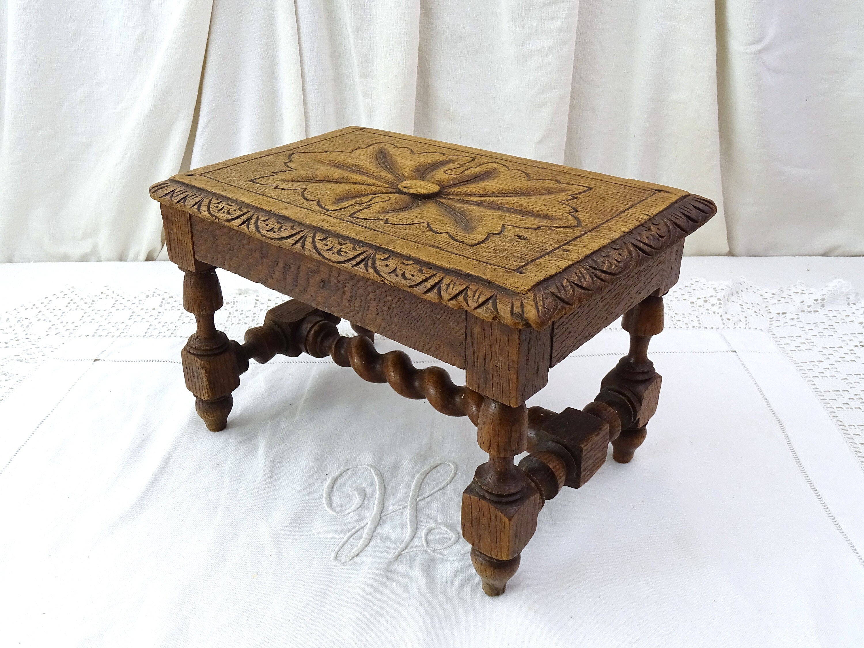 Small antique carved French foot stool with a worn patina. Made of oak wood. Ca early 1800s.