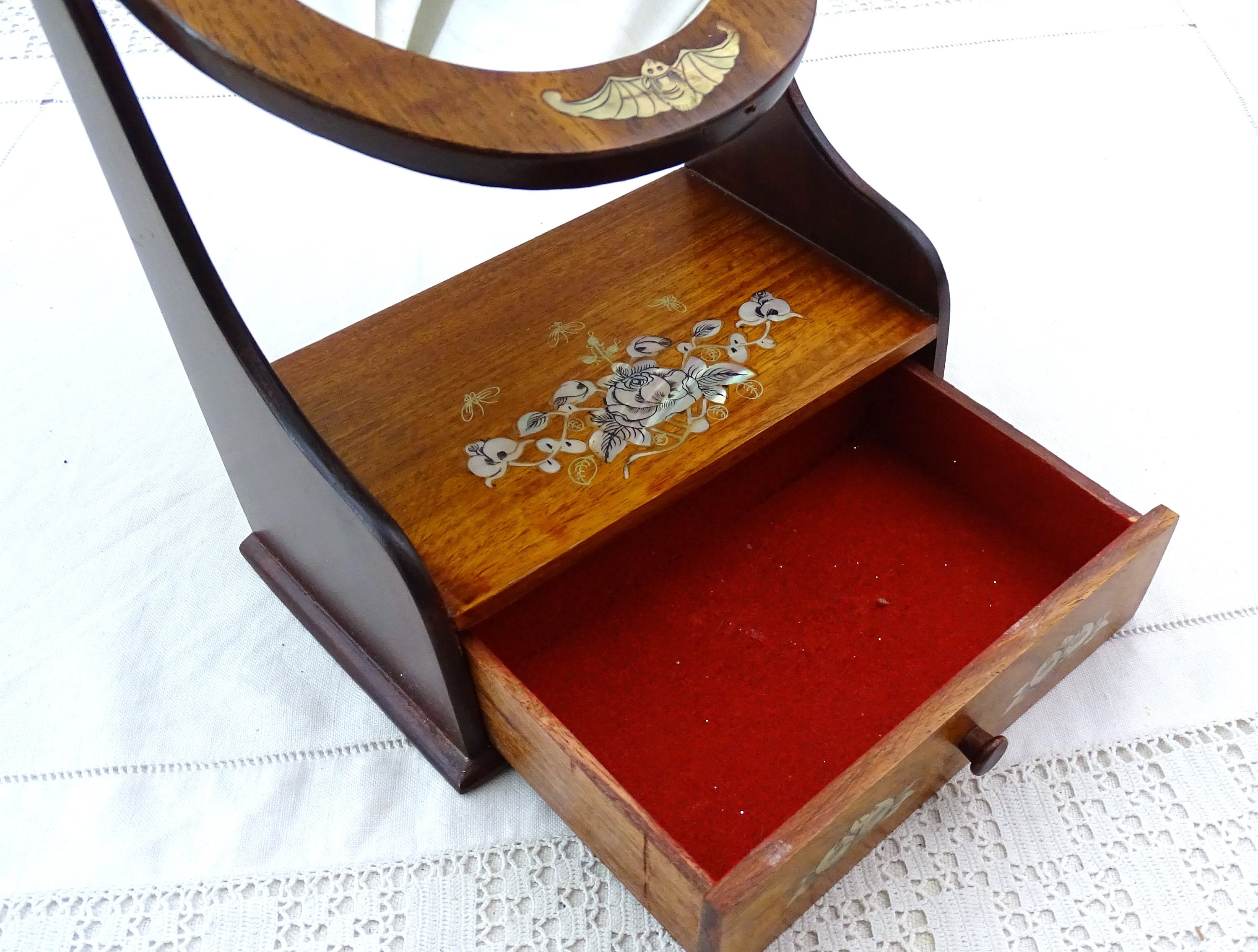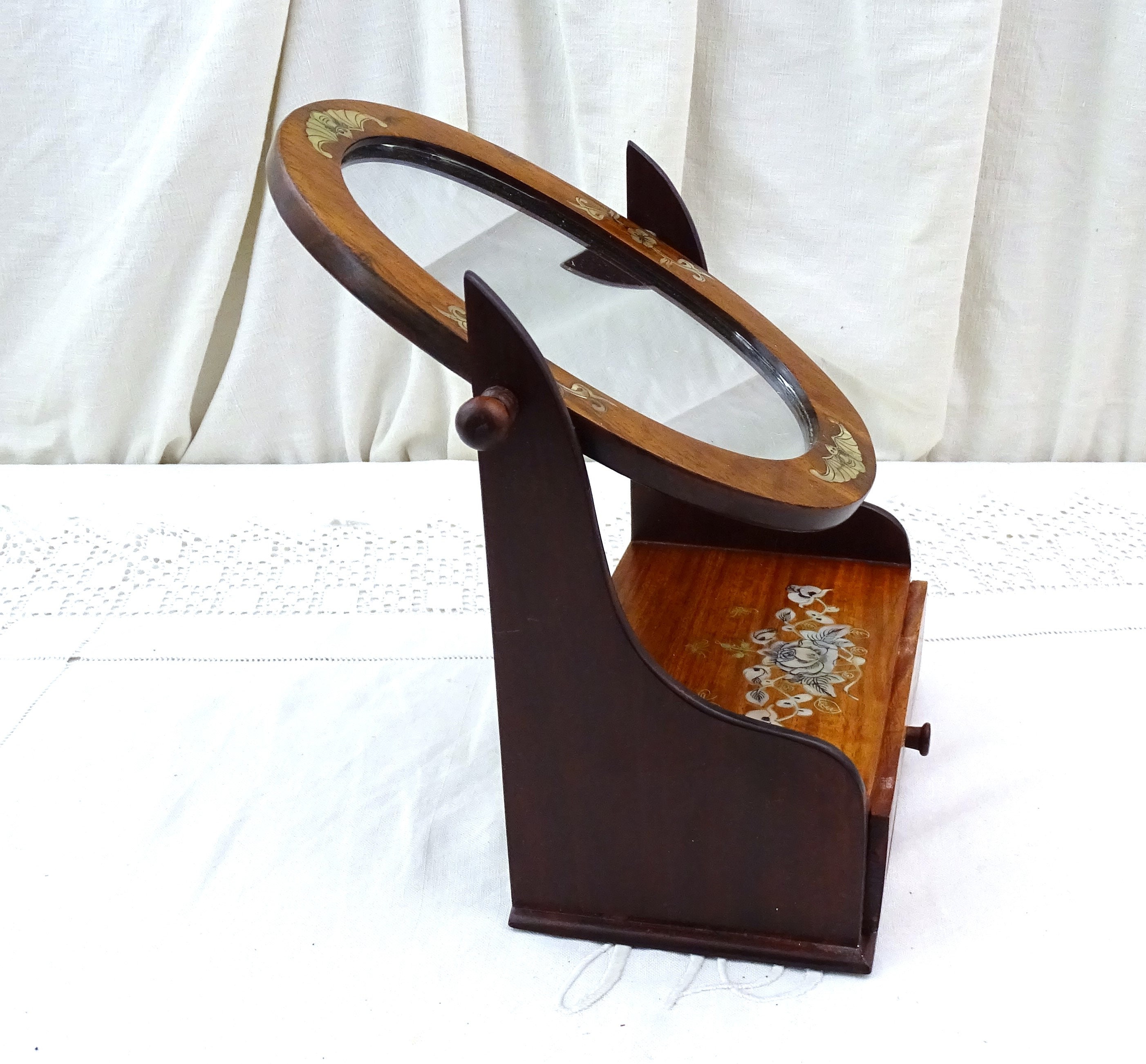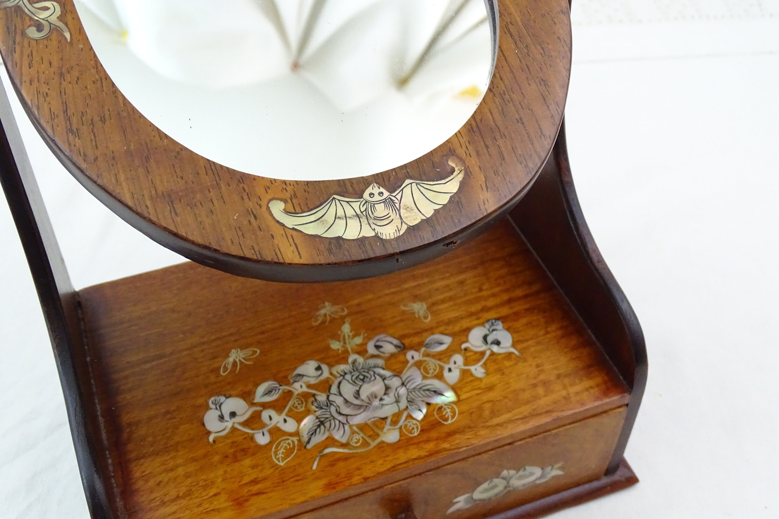 Small vintage oval vanity mirror on a stand with a draw. Made in Japan of wood with mother of pearl shell inlays of flowers and bats. Ca late 1900s.