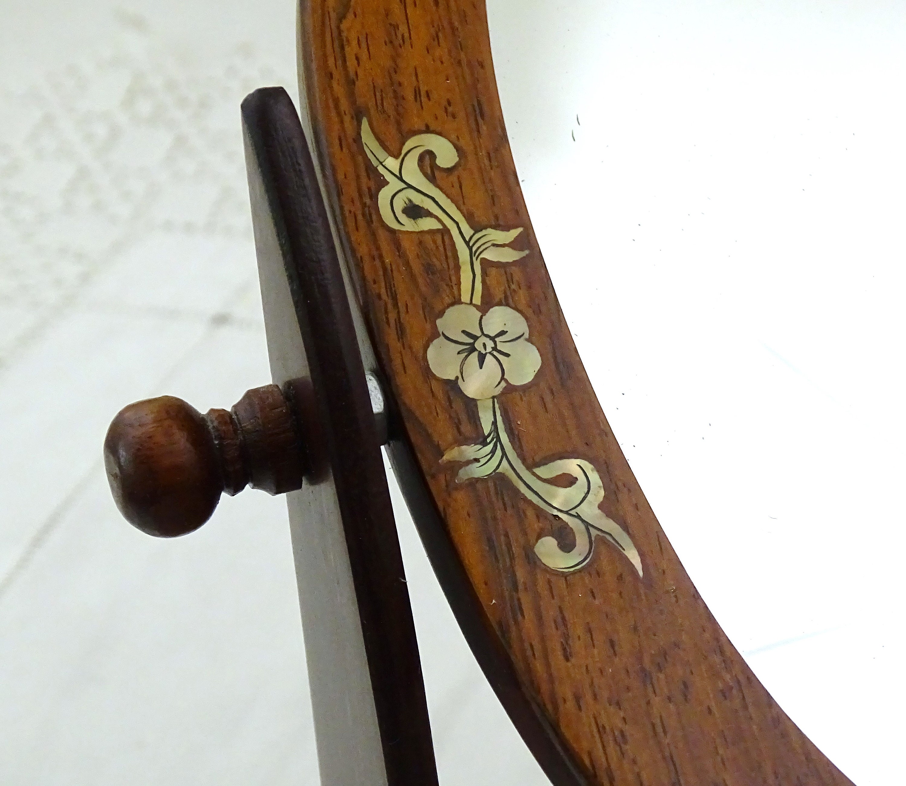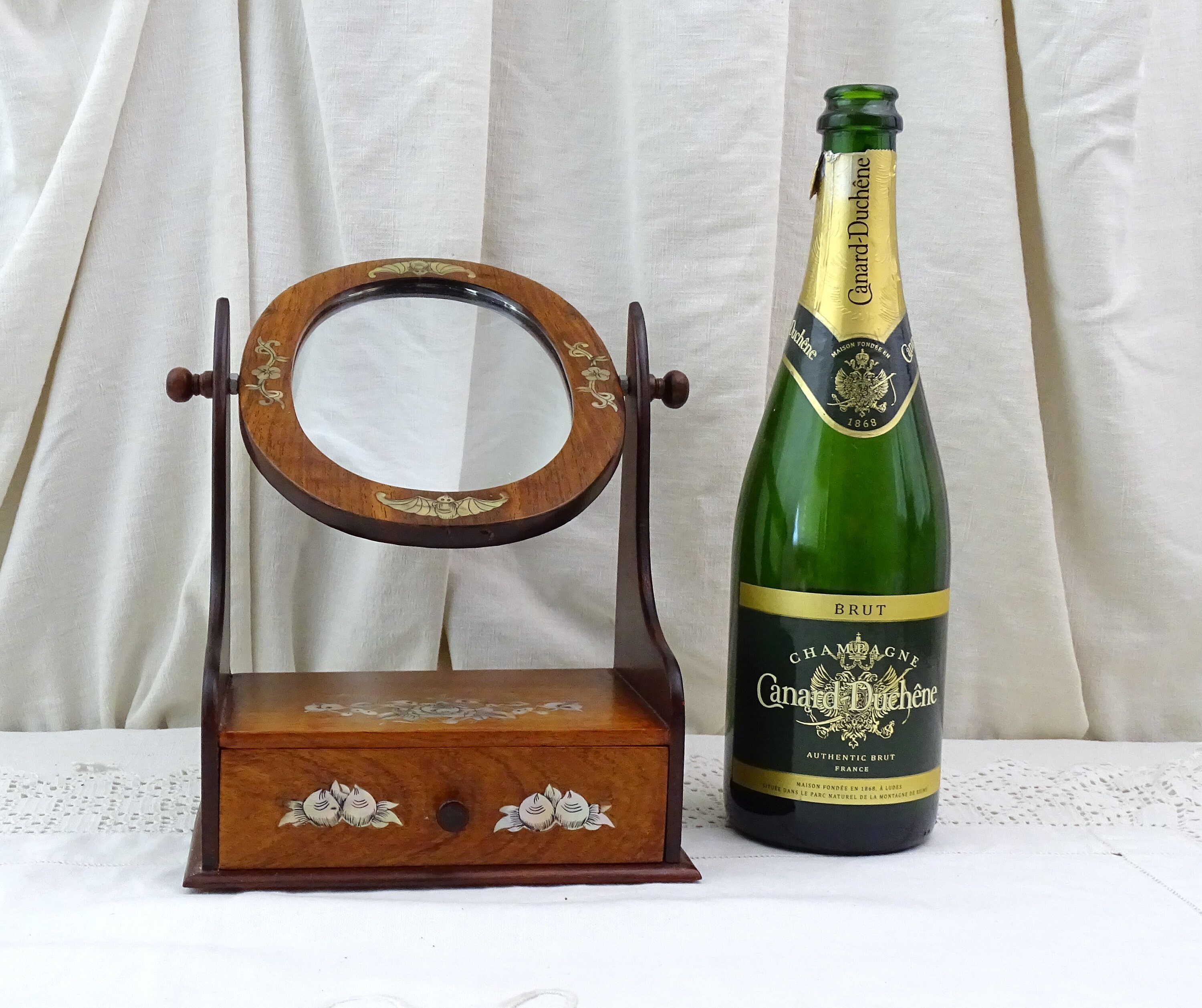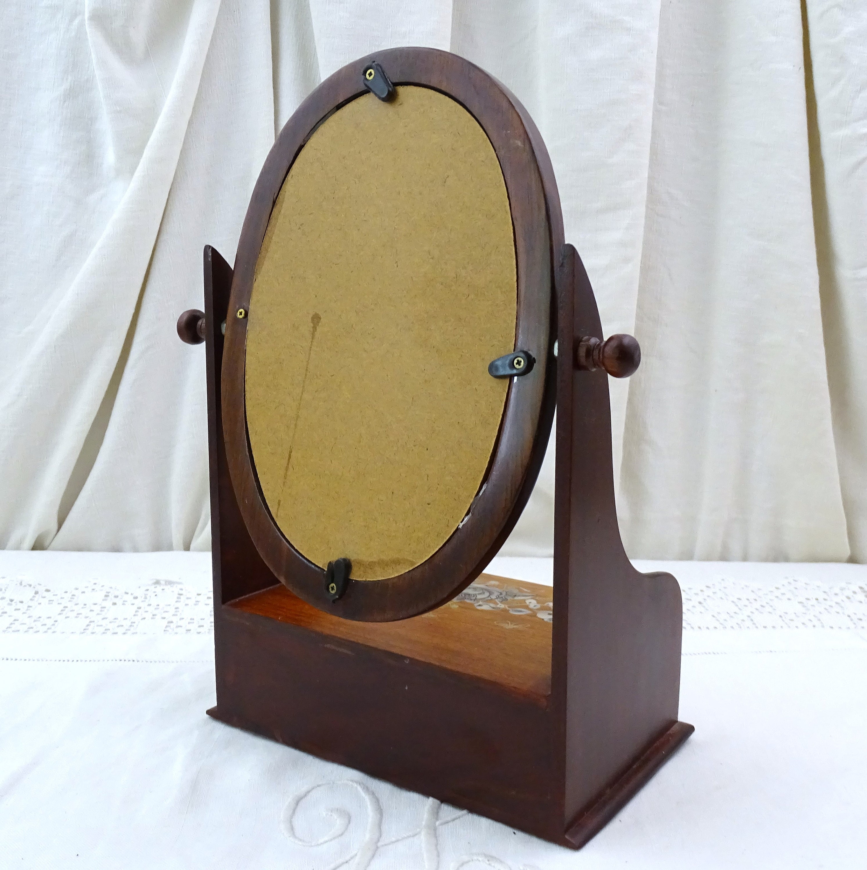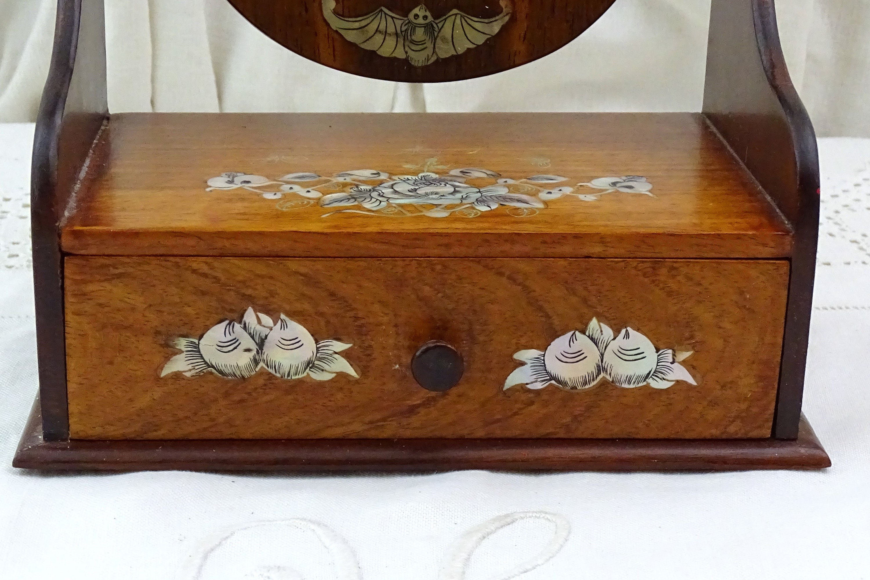 Small vintage oval vanity mirror on a stand with a draw. Made in Japan of wood with mother of pearl shell inlays of flowers and bats. Ca late 1900s.