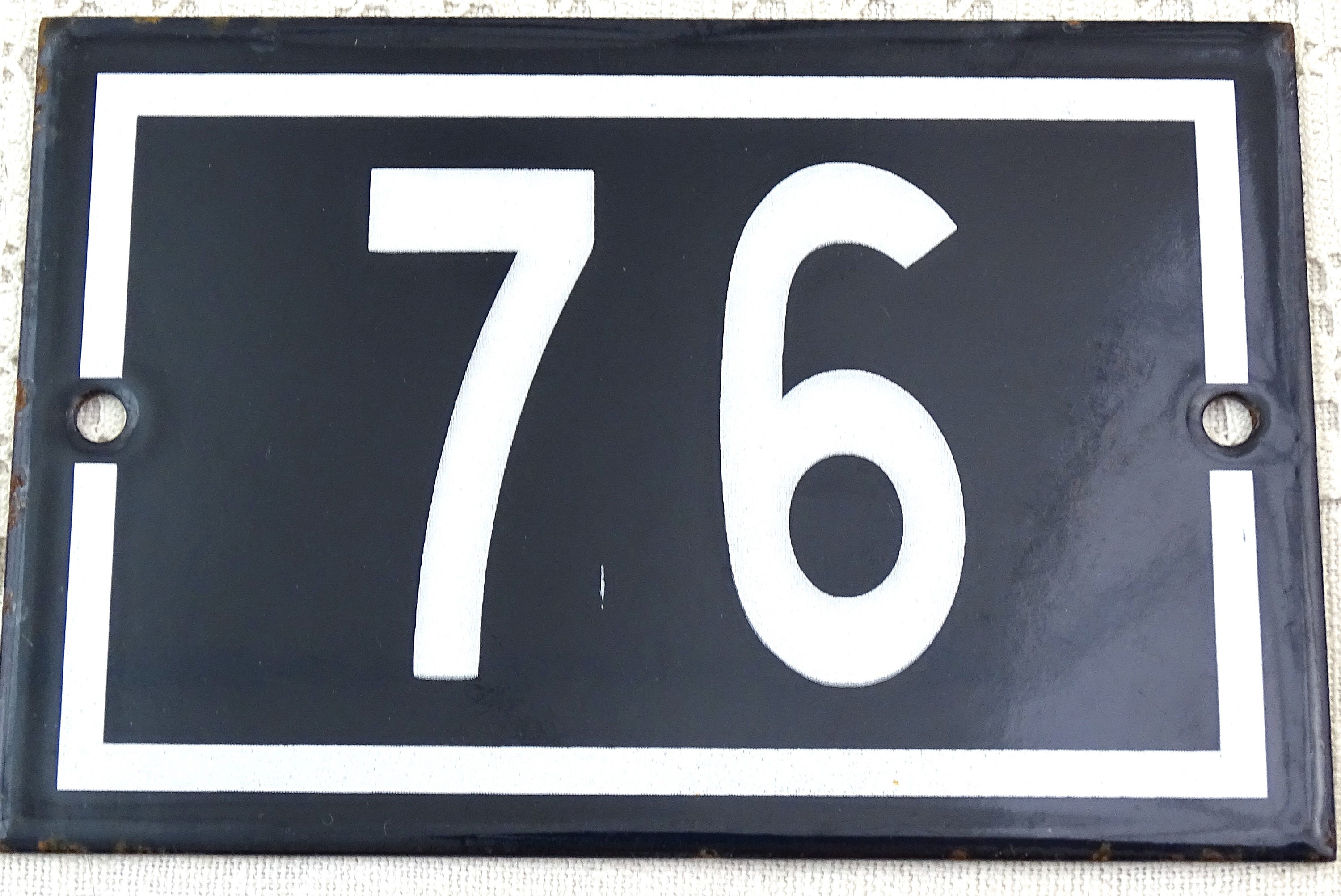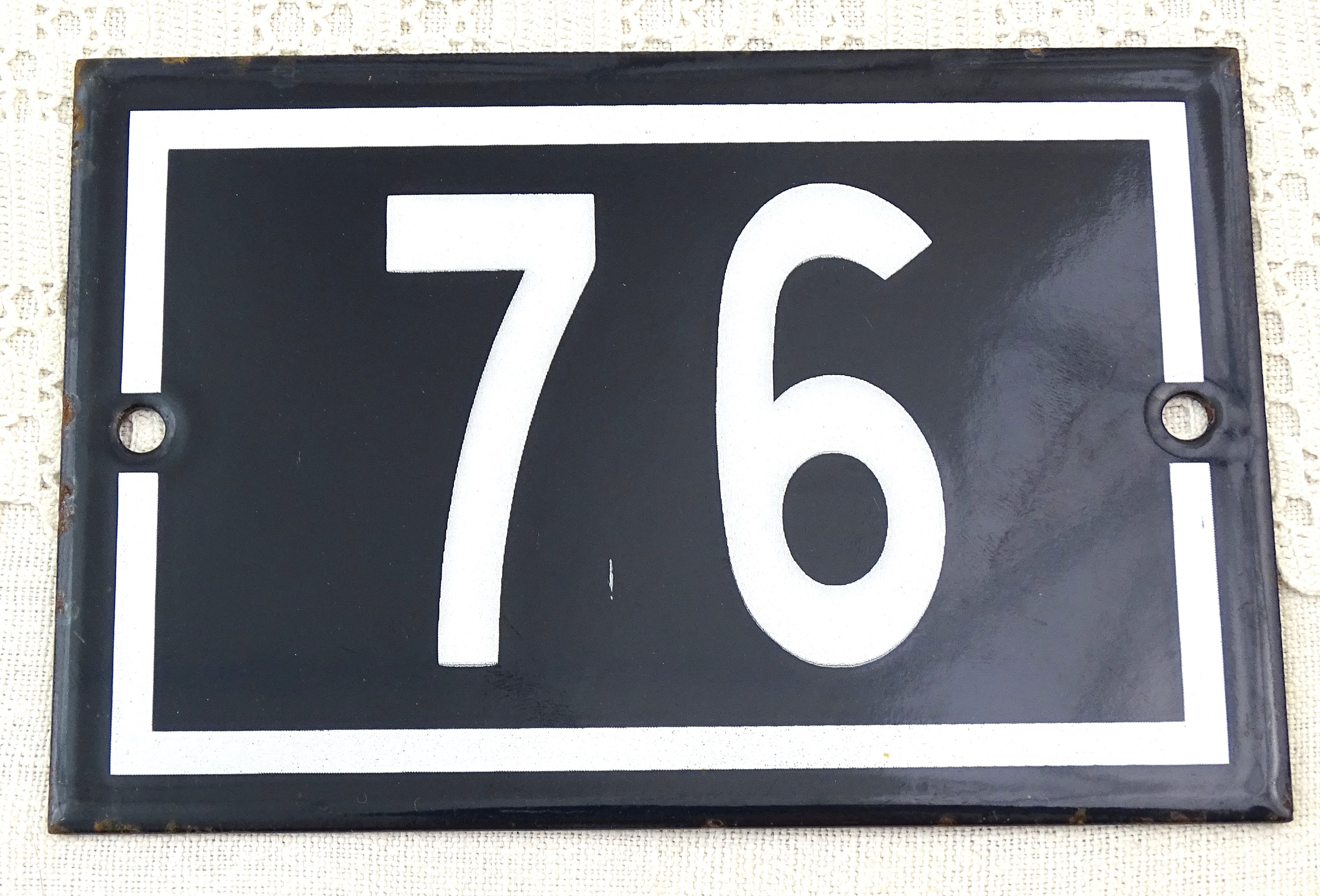 Vintage traditional French enamel house number 76. Made of enameled metal in dark blue with white numbers. Ca 1950s.
