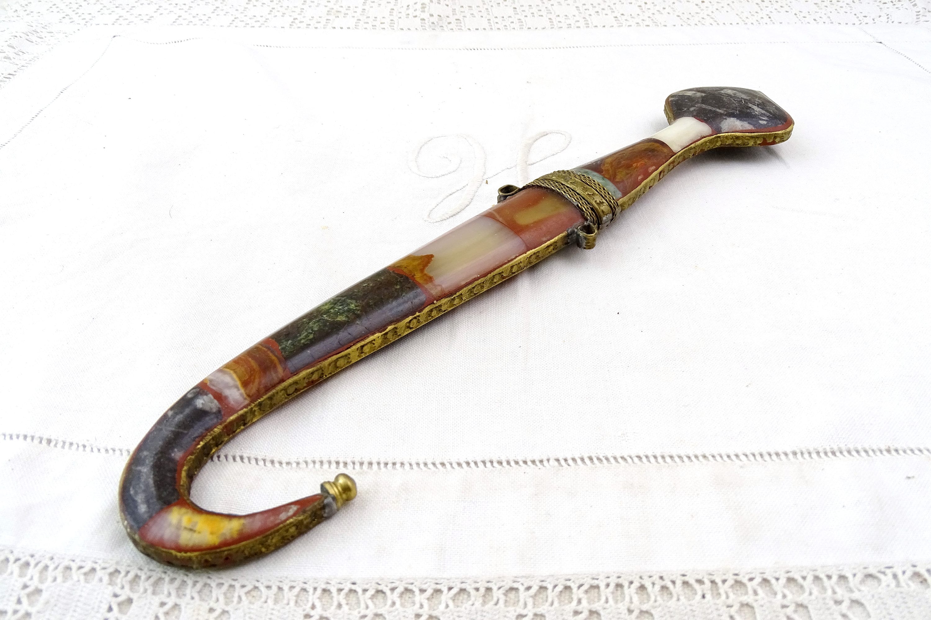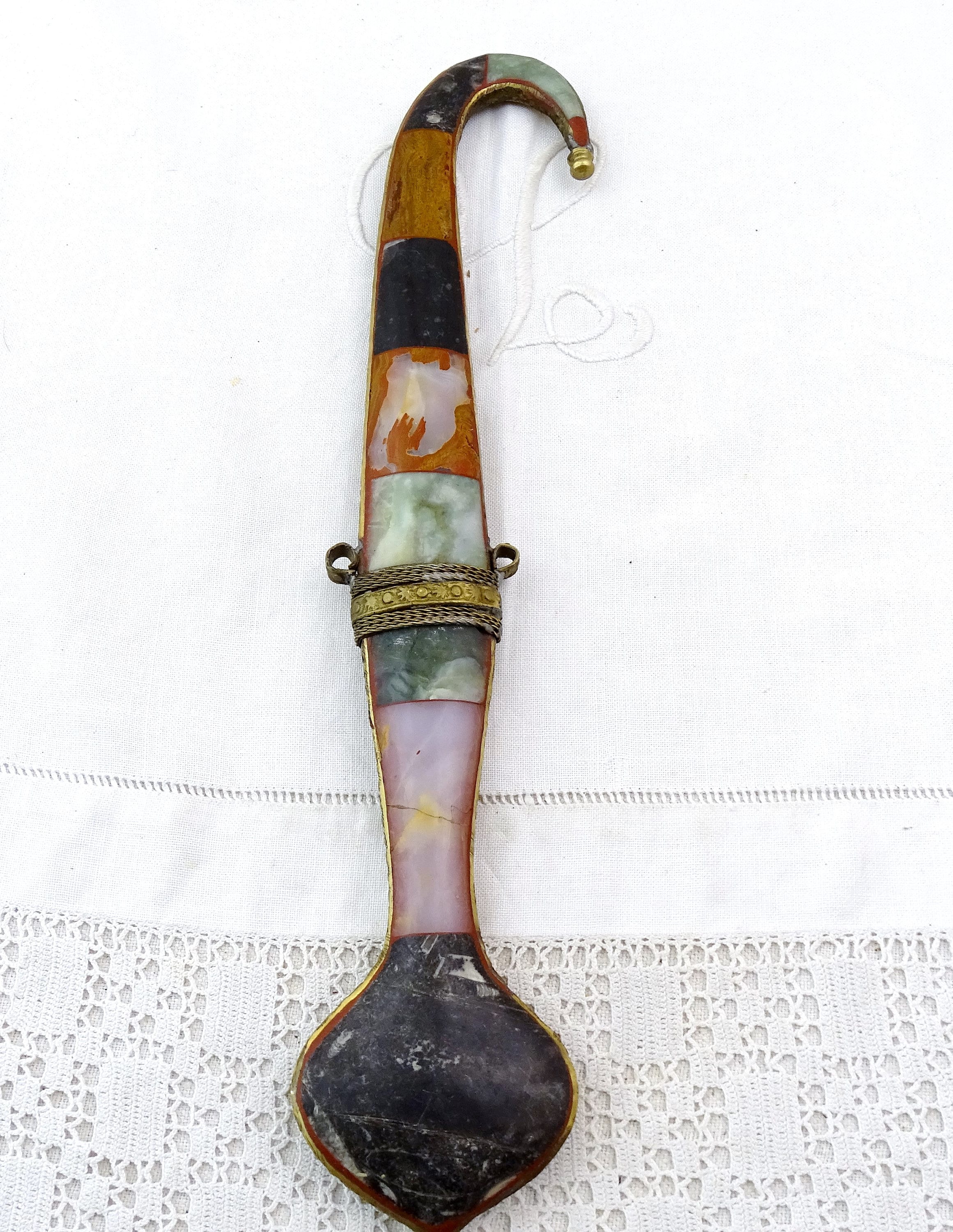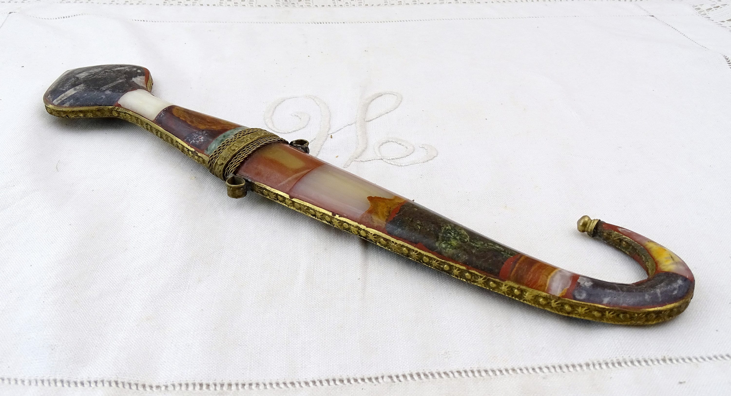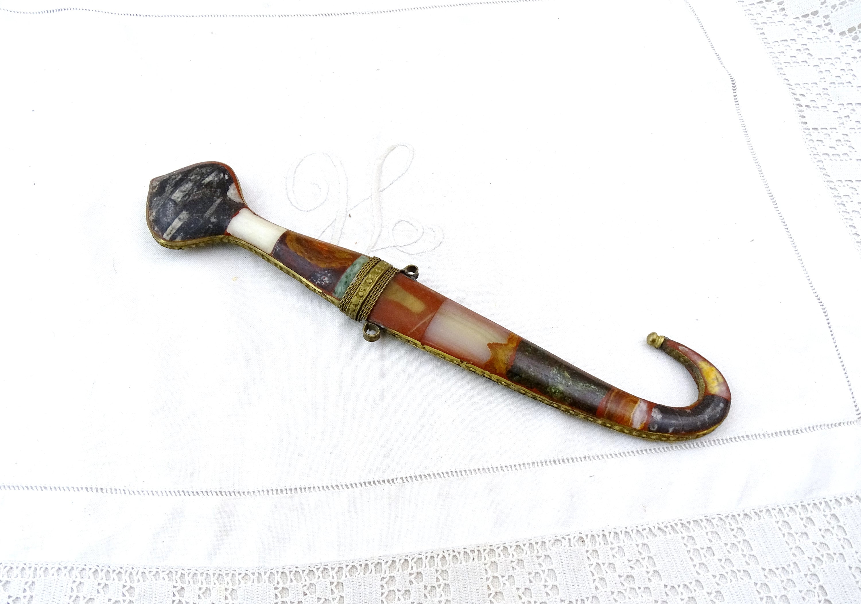 Vintage Moroccan Koummya decorative curved dagger. Made of inlayed brass with semi precious stones and steel blade. Ca mid to late 1900s.