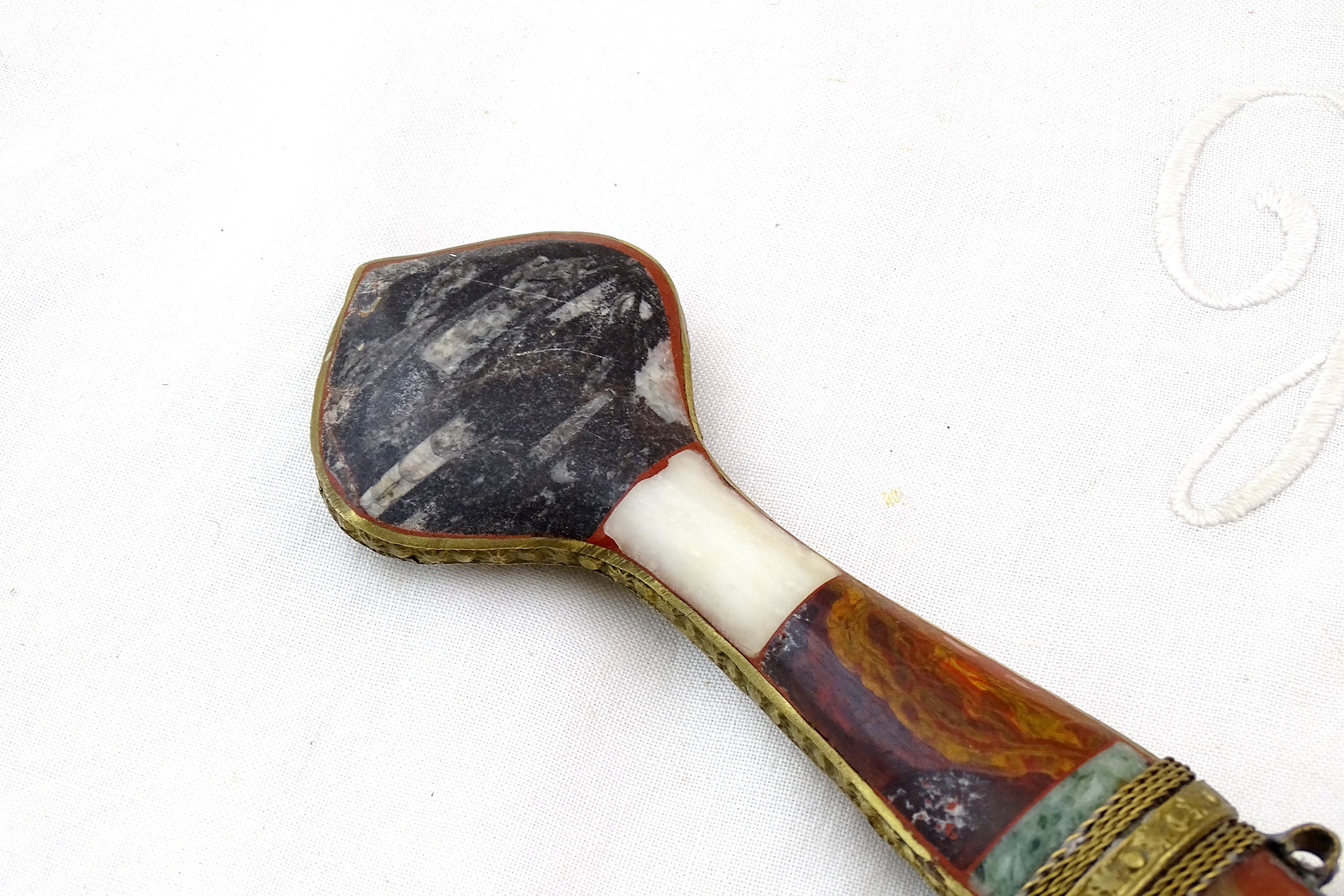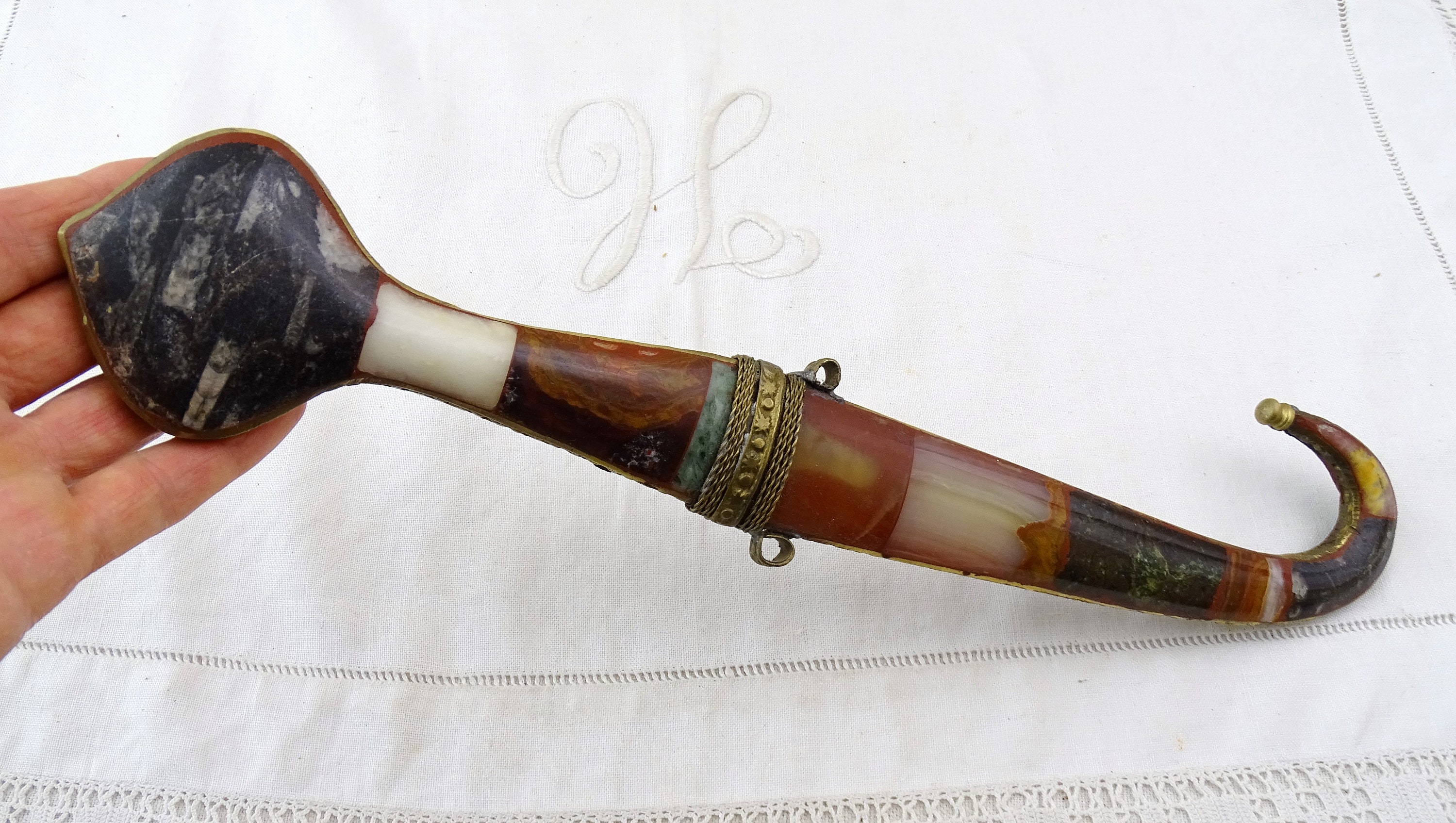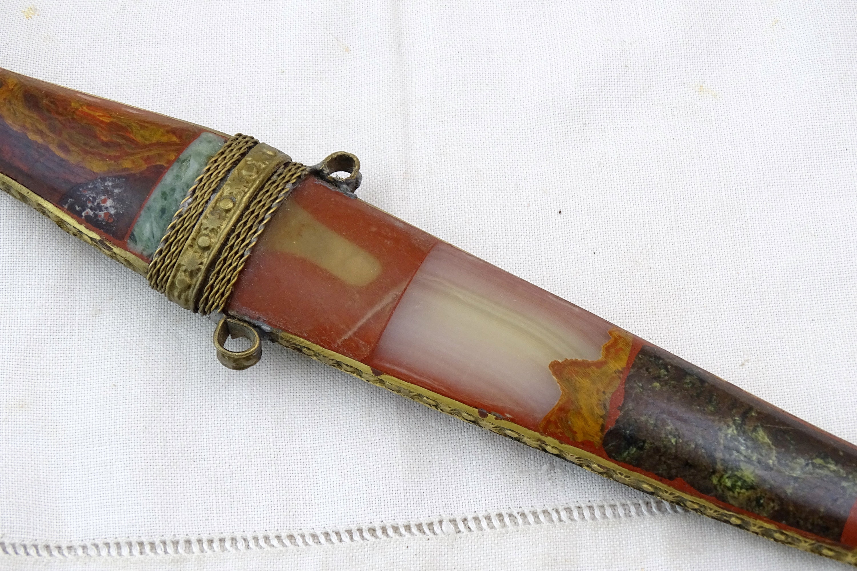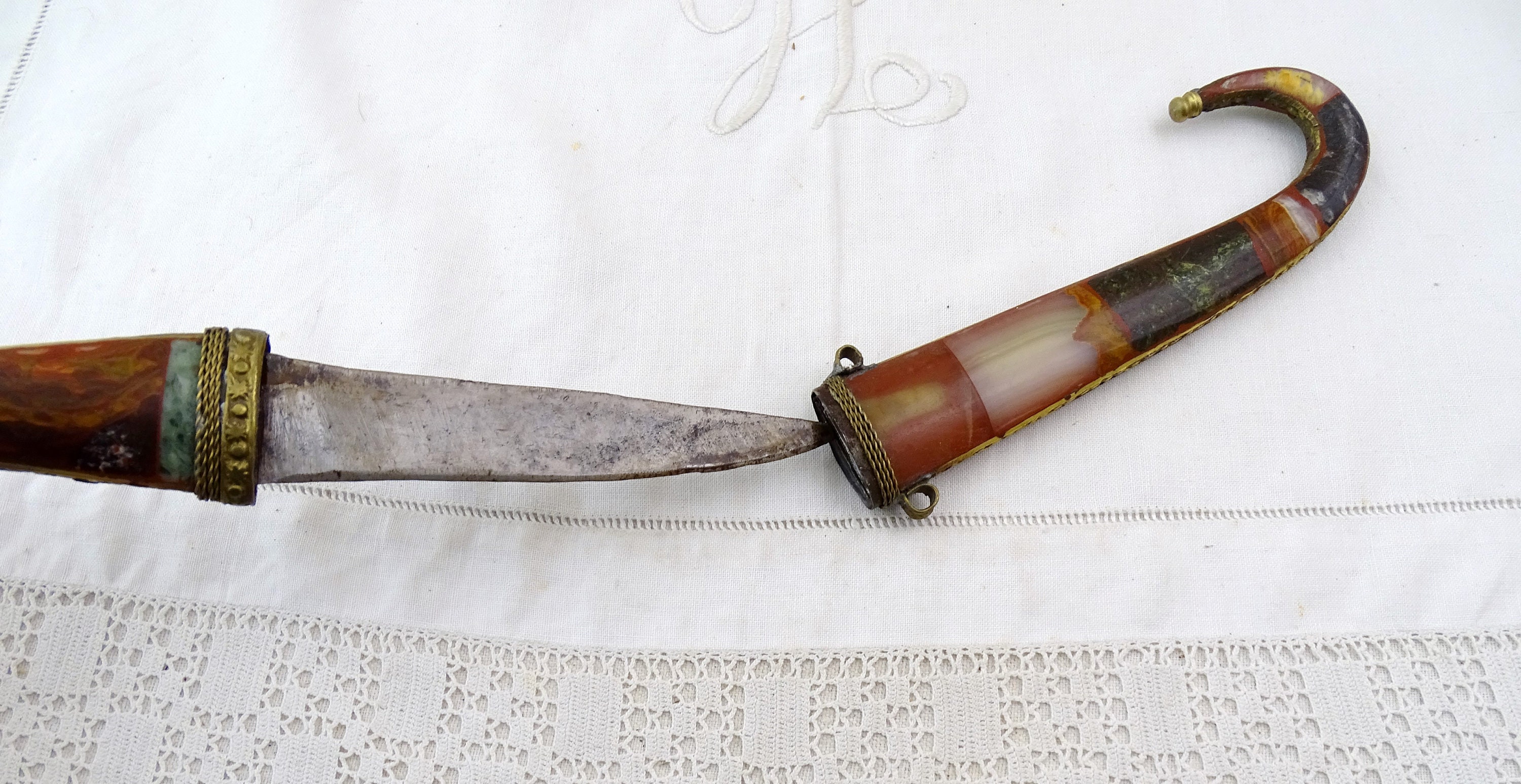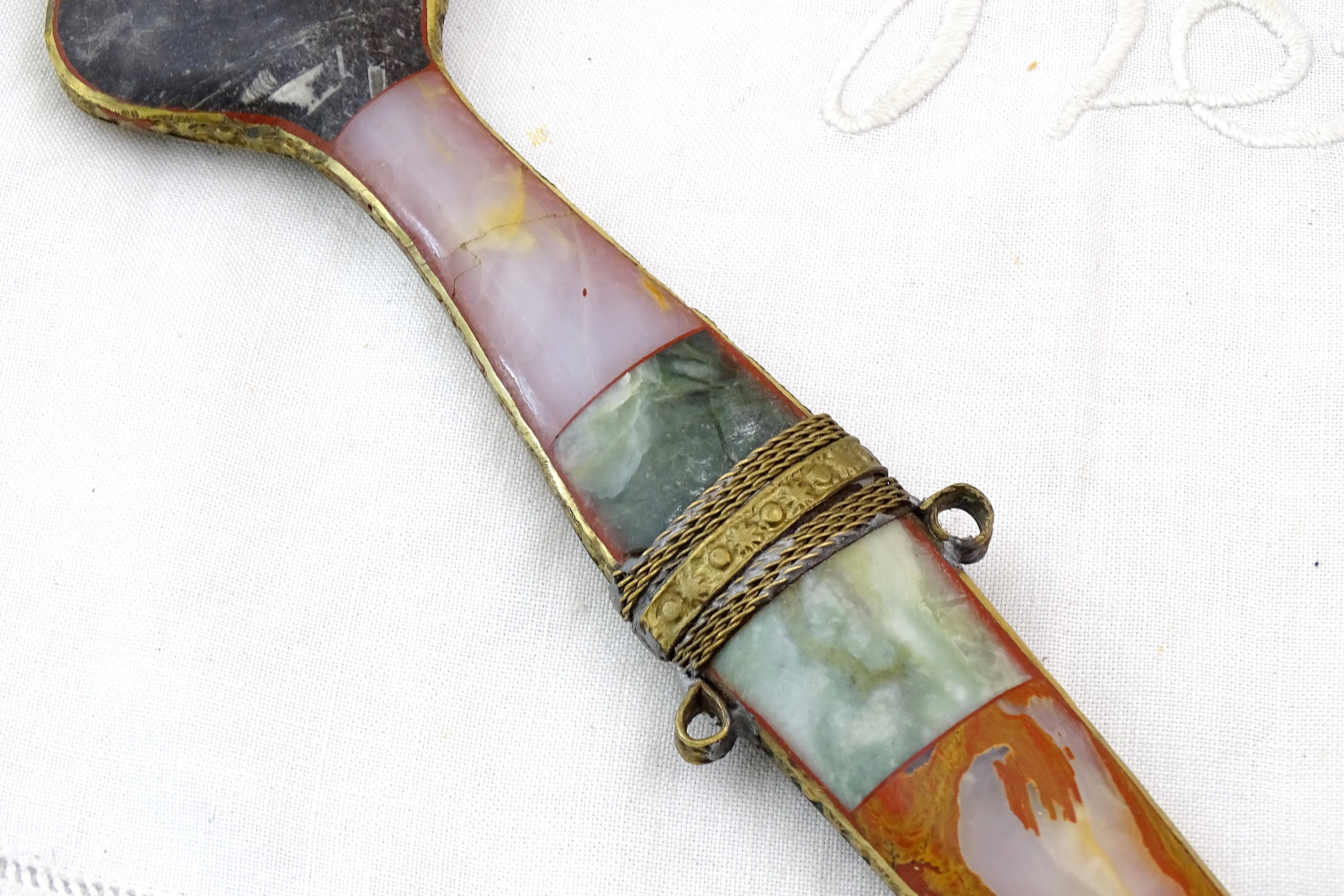 Vintage Moroccan Koummya decorative curved dagger. Made of inlayed brass with semi precious stones and steel blade. Ca mid to late 1900s.