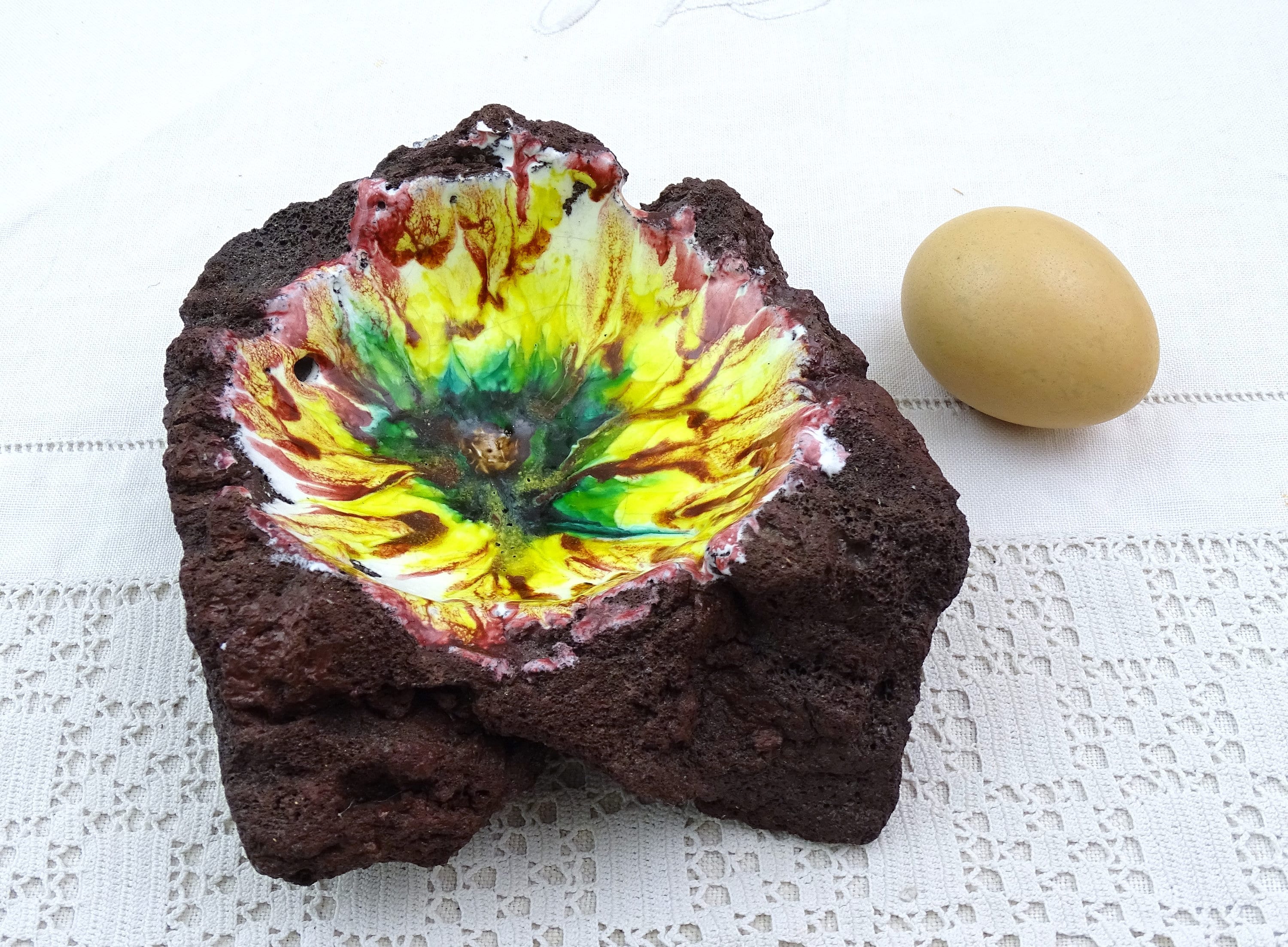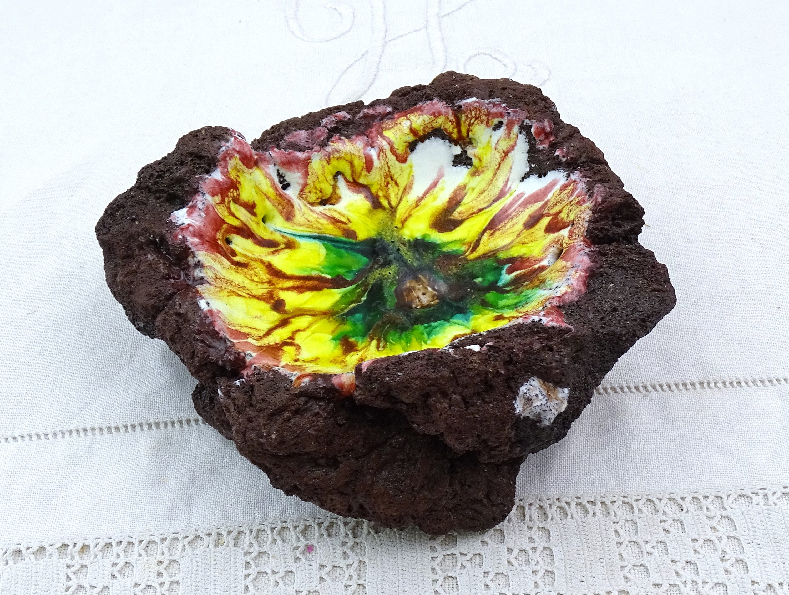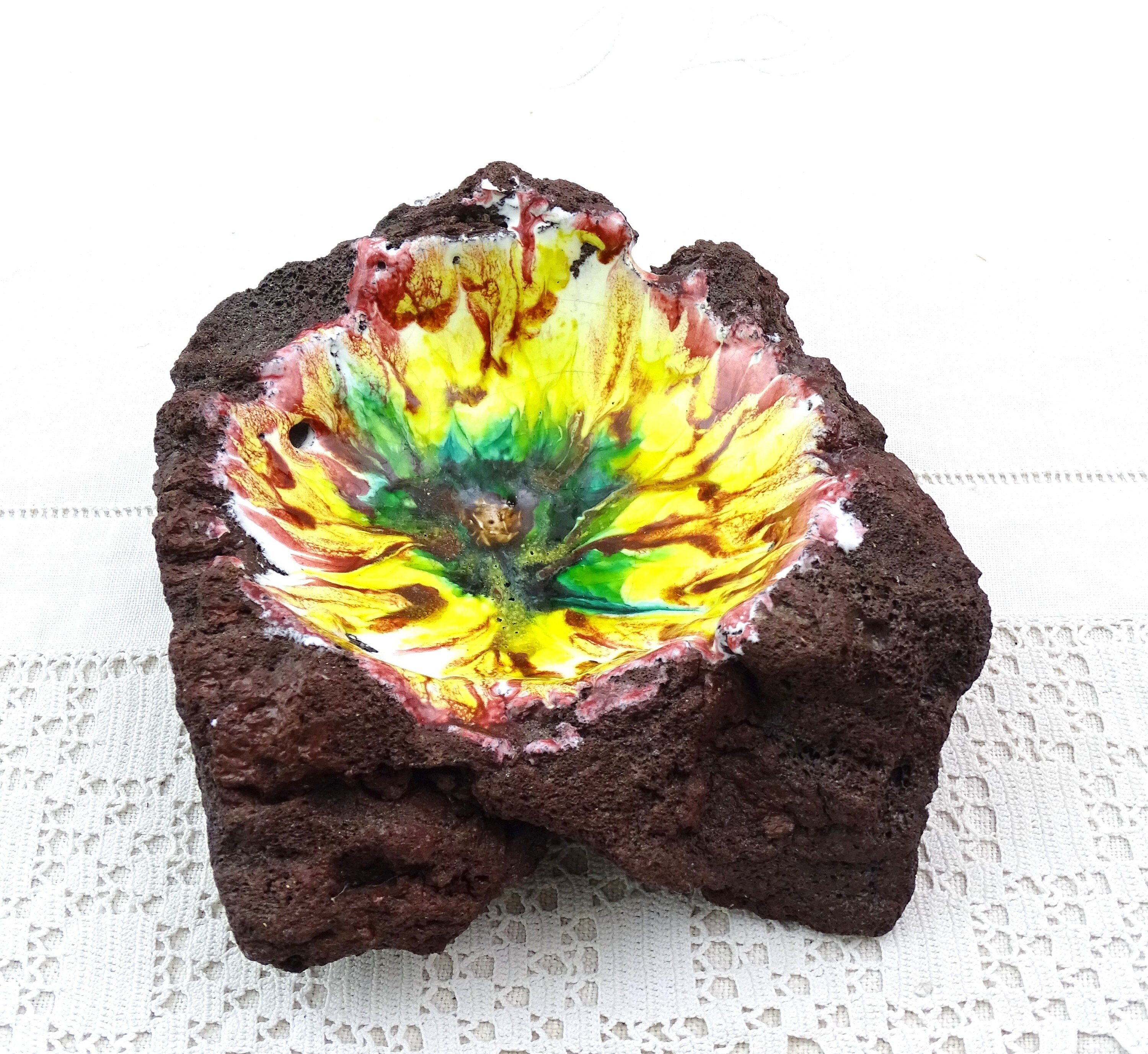 Vintage enameled lava stone trinket / ring dish / ashtray. Made from a solid chunk of lava rock, lined with multi colored glass enamel. Circa 1970s.