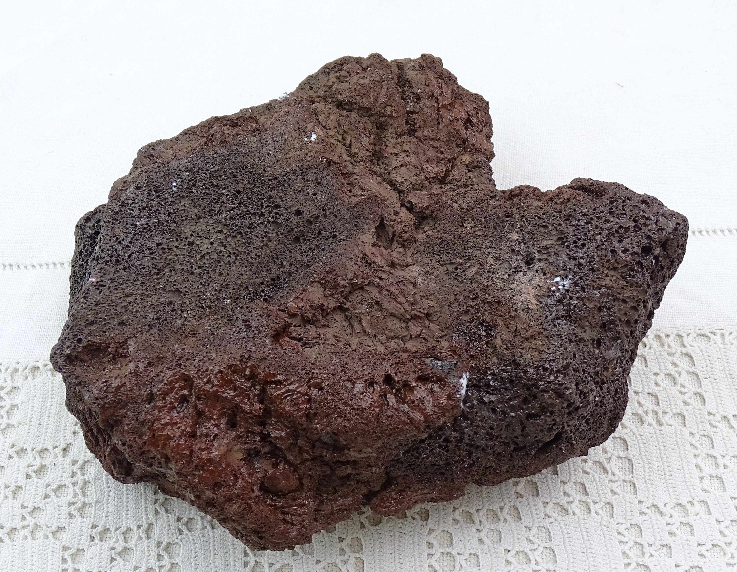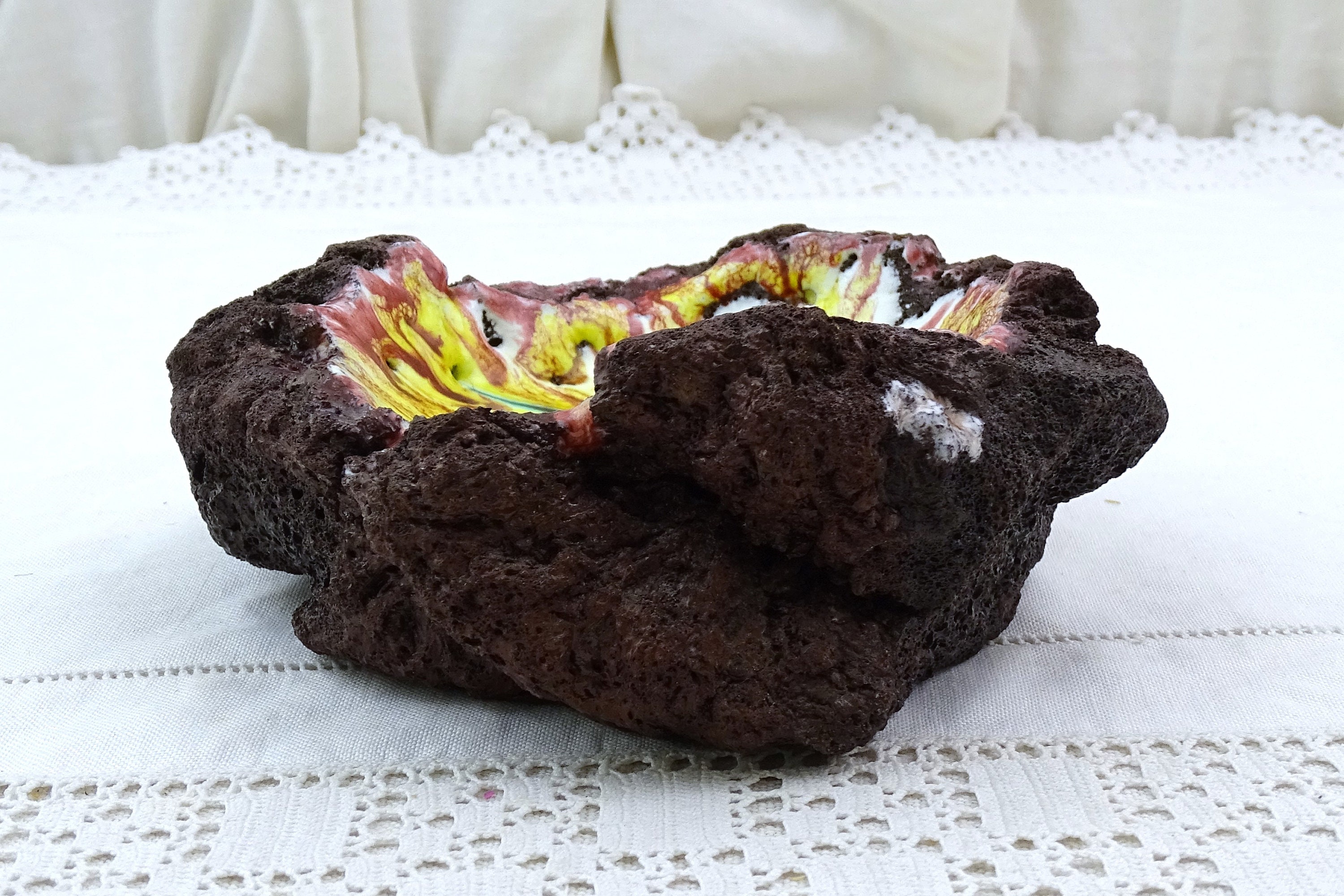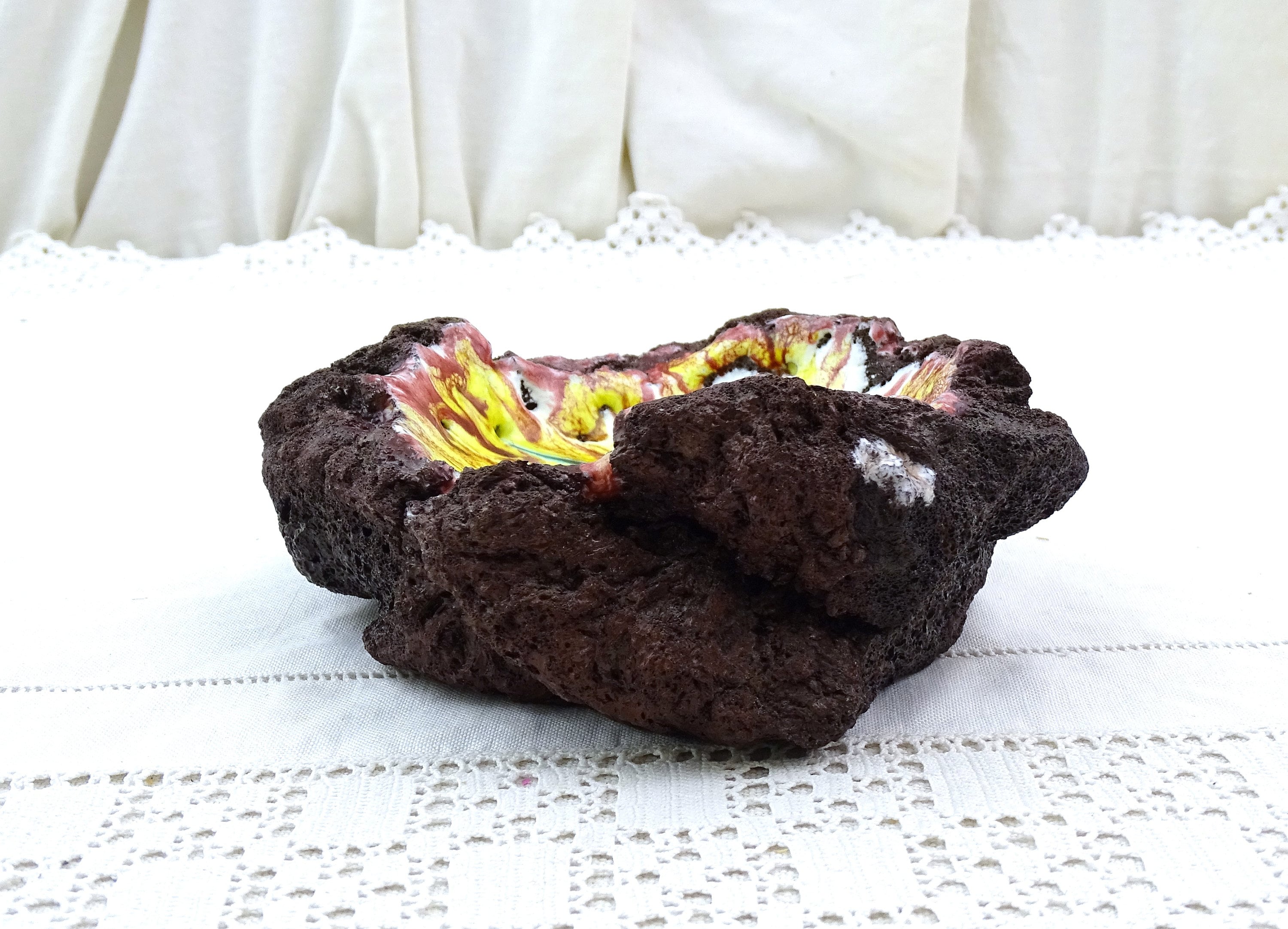 Vintage enameled lava stone trinket / ring dish / ashtray. Made from a solid chunk of lava rock, lined with multi colored glass enamel. Circa 1970s.