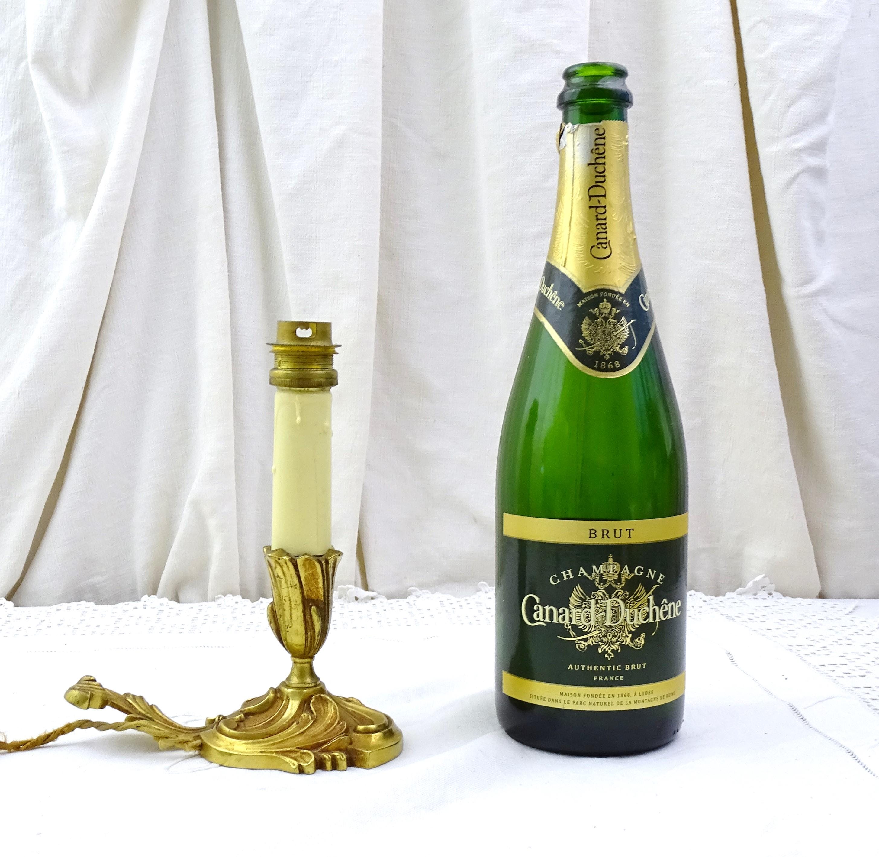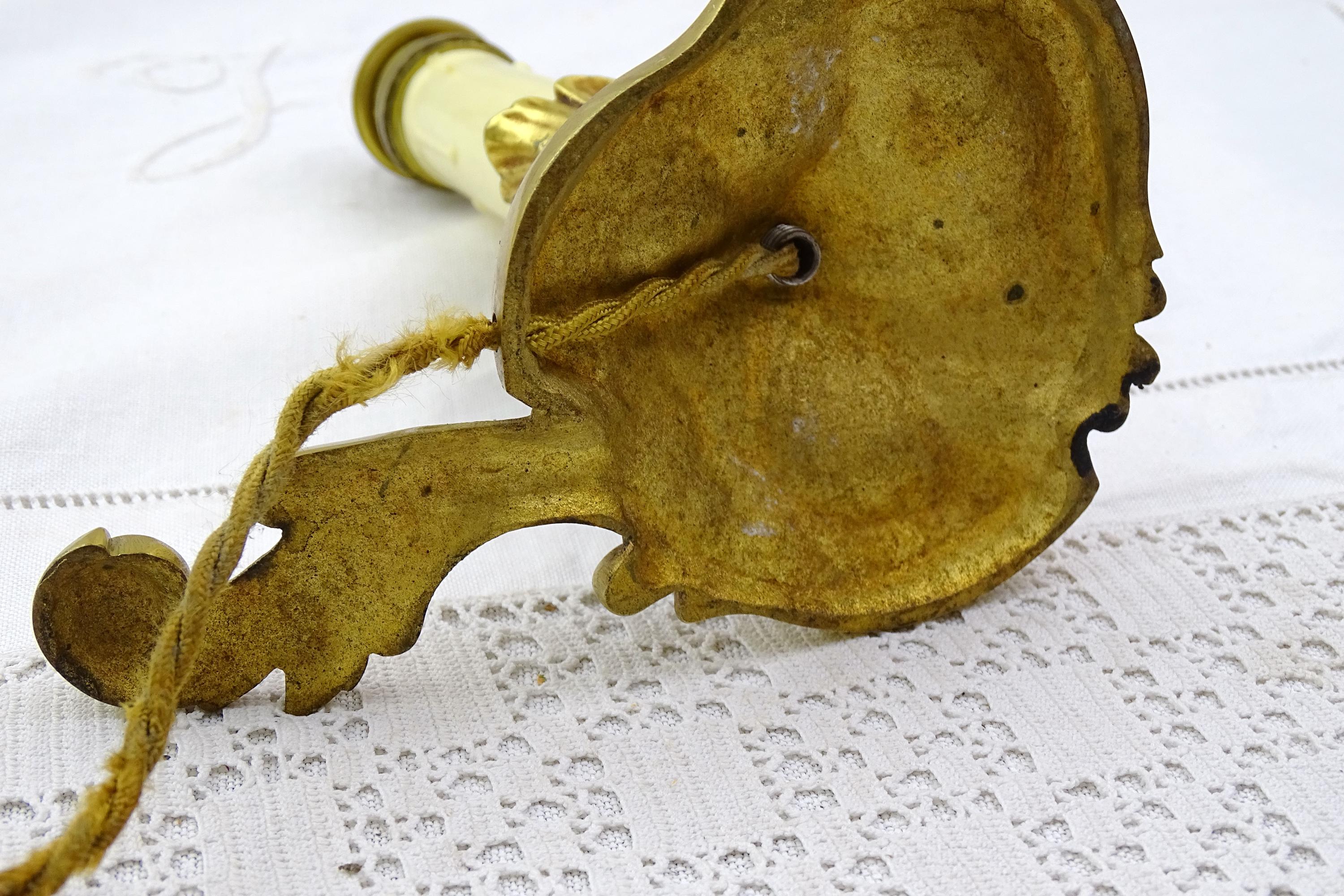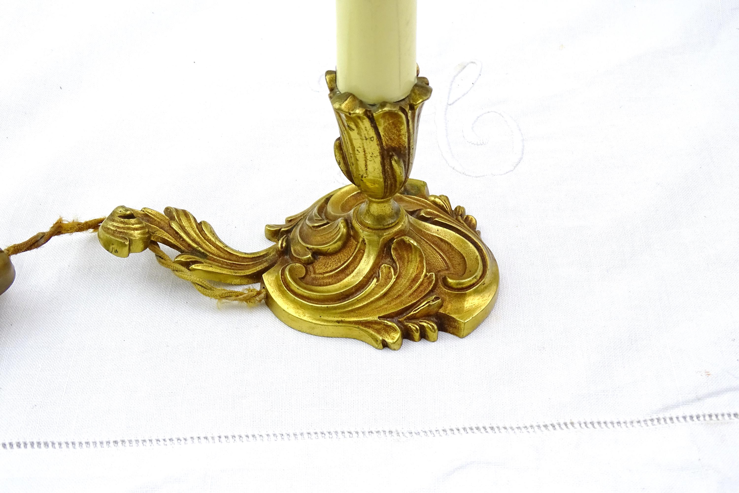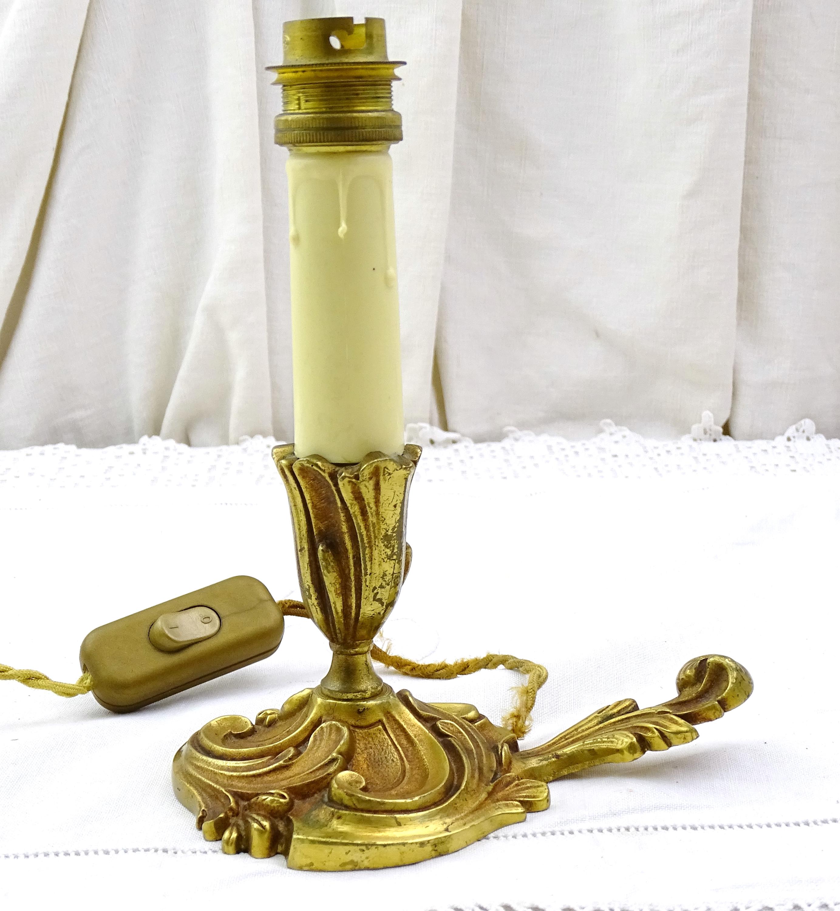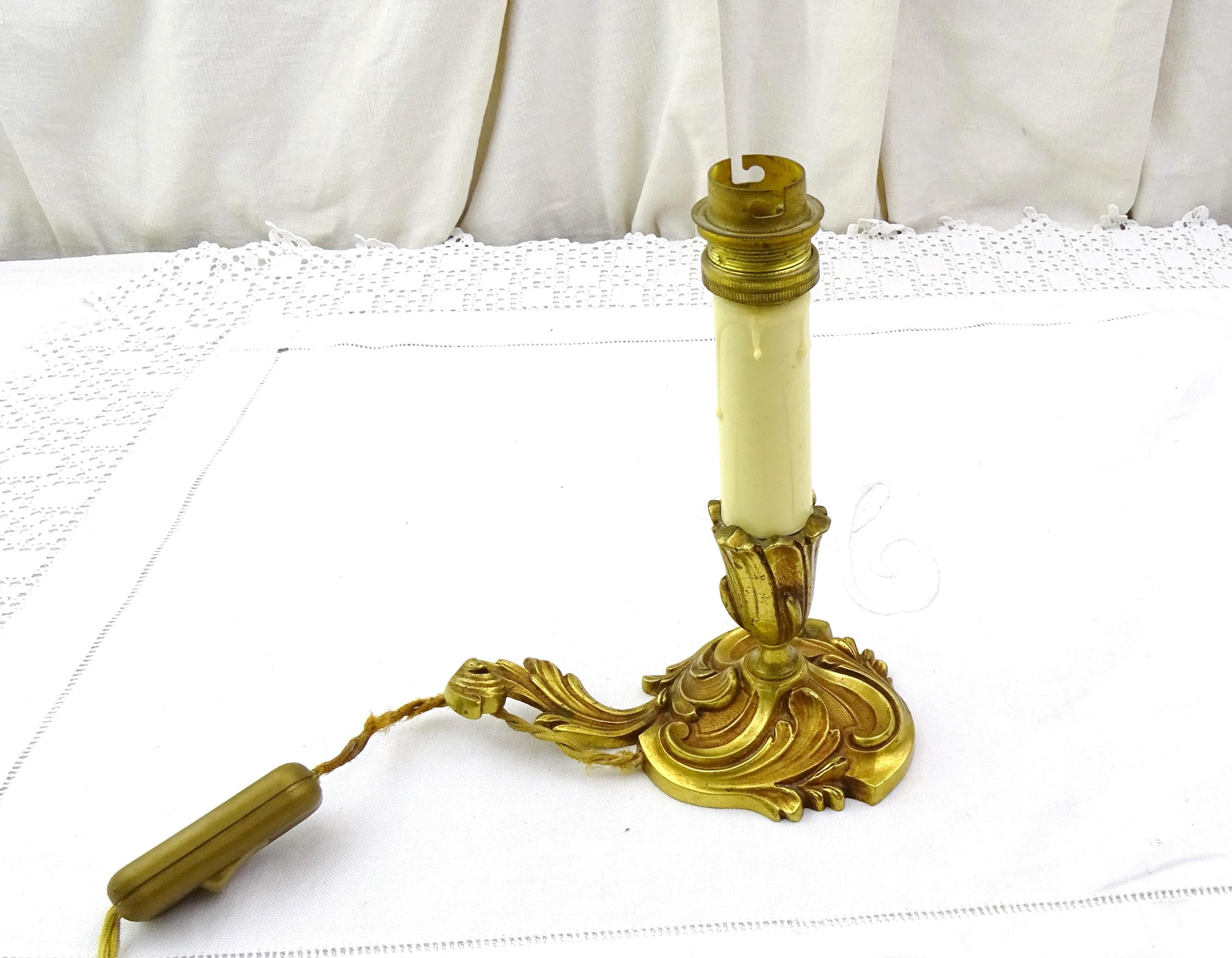 Vintage French ornate rococo style chamber stick lamp base. Made of bronze metal with acrylic imitation candle. Ca mid 1900s.
