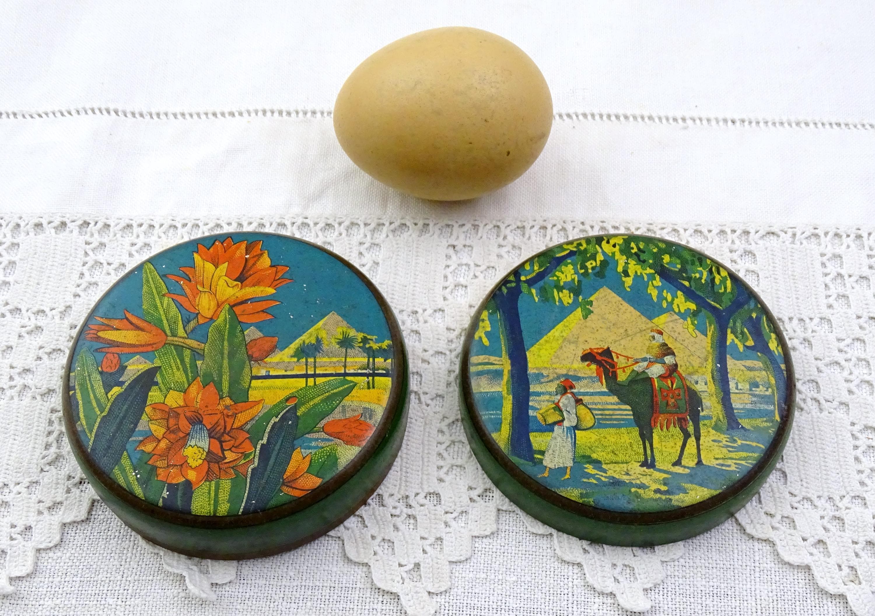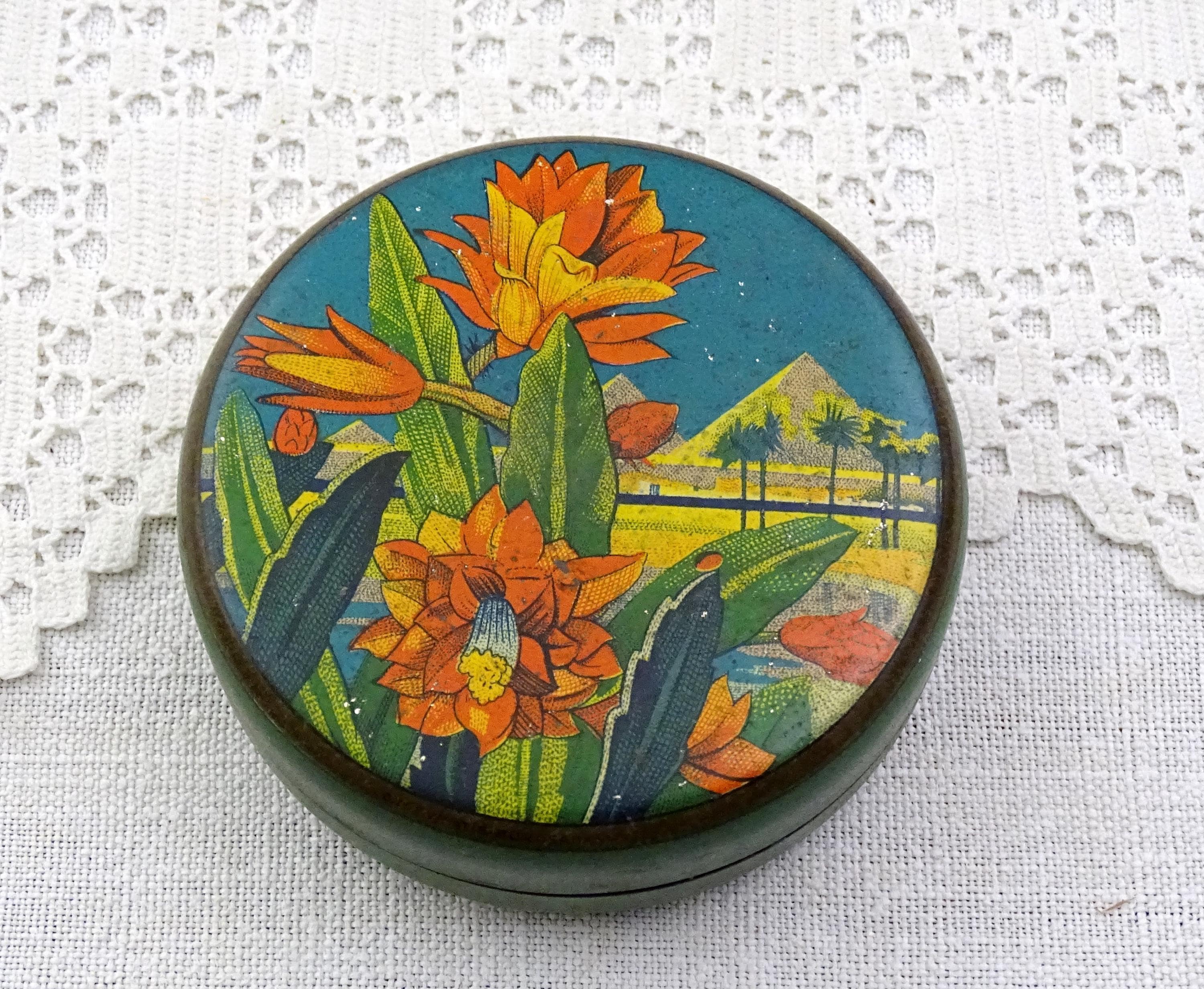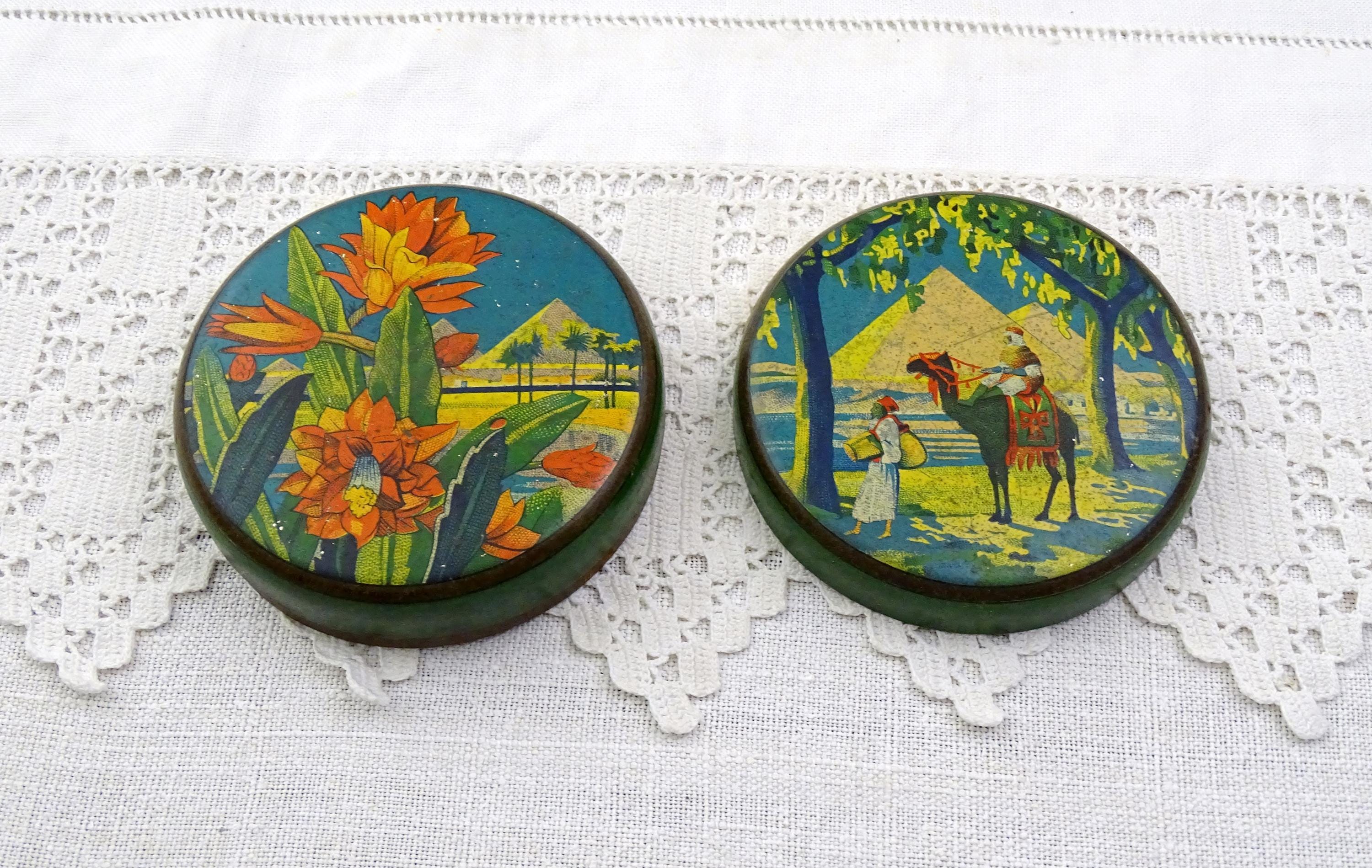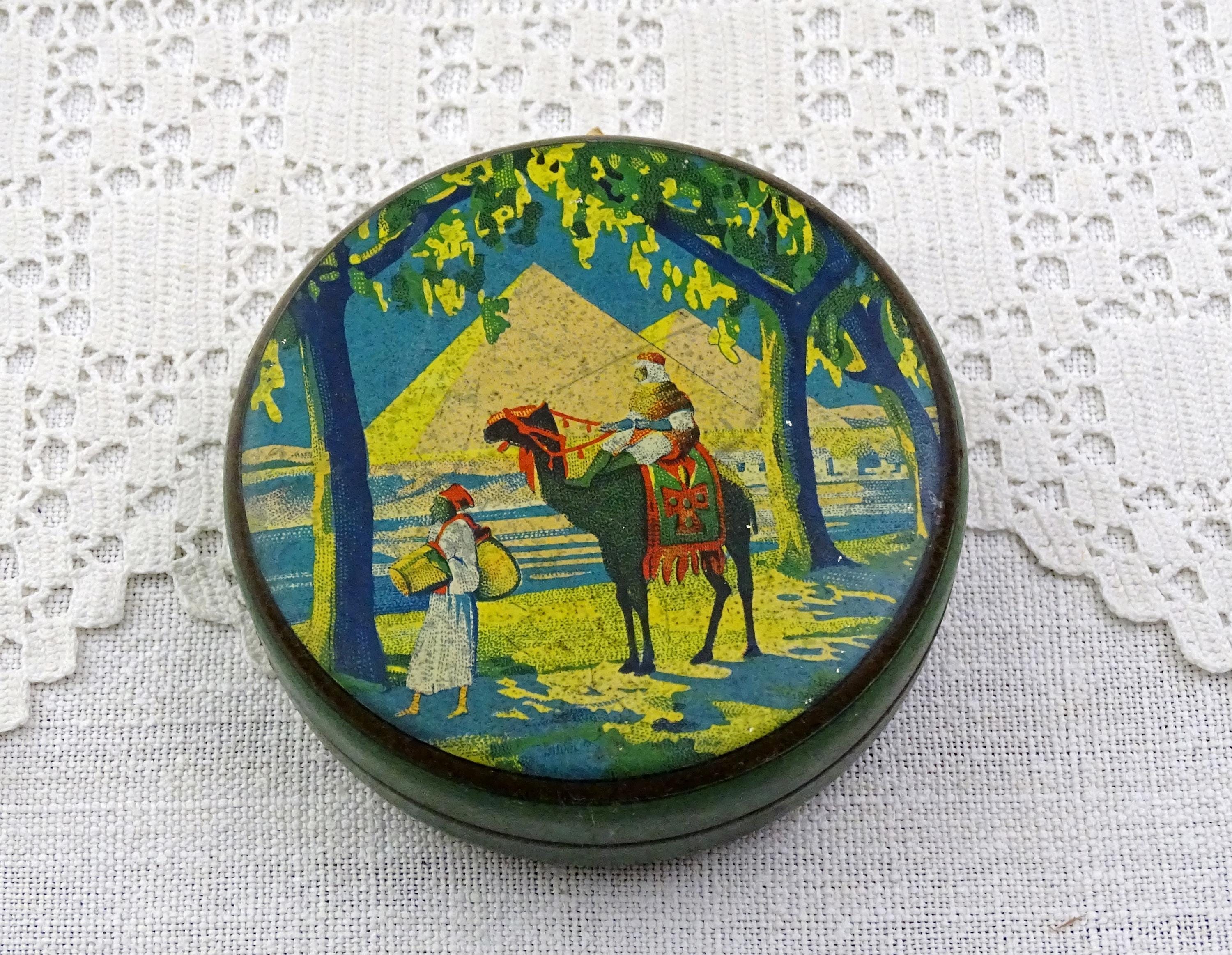 Antique French round tin with a Egyptian themed pattern. Made of lithographed metal. Ca early 1900s.