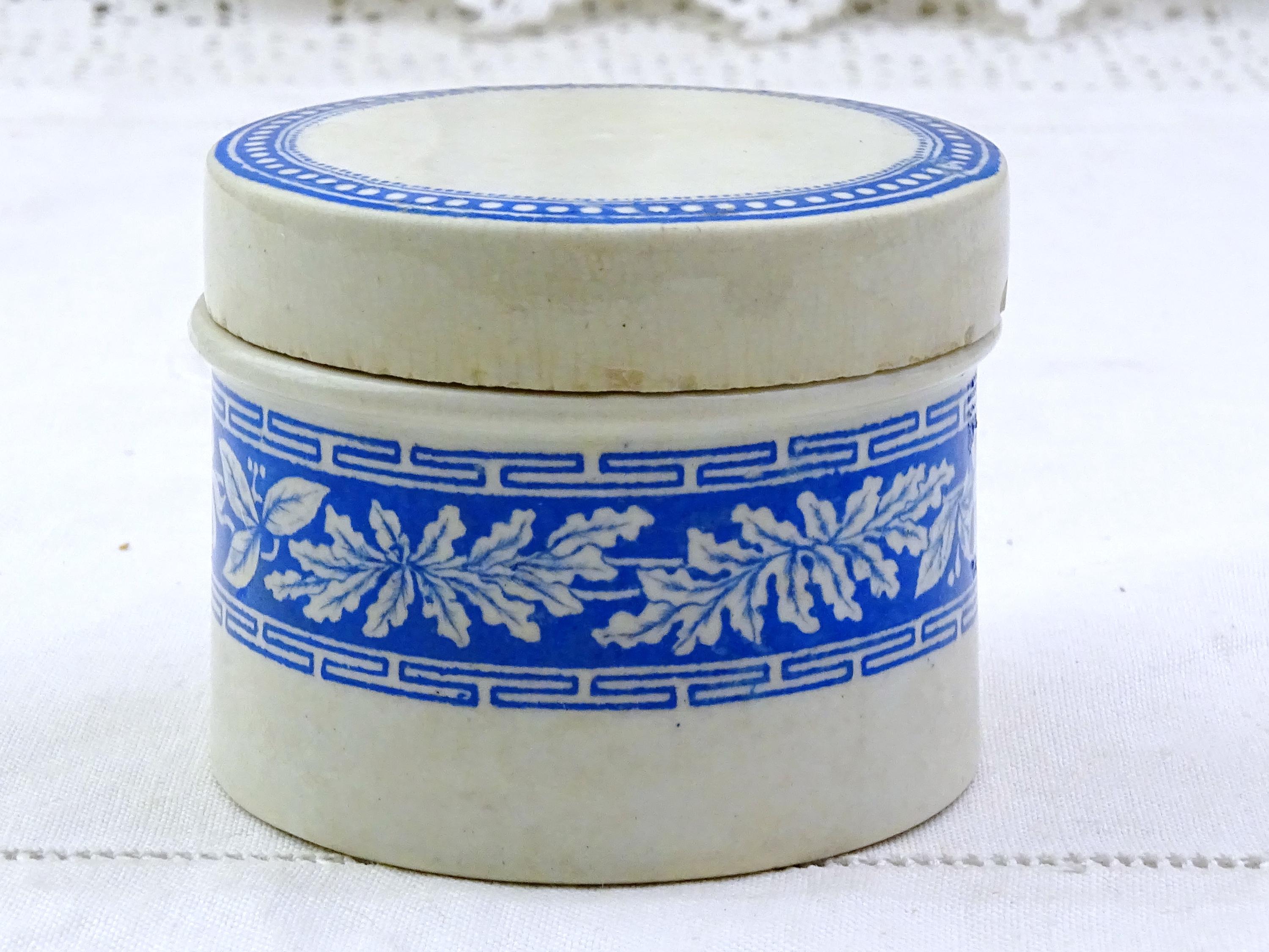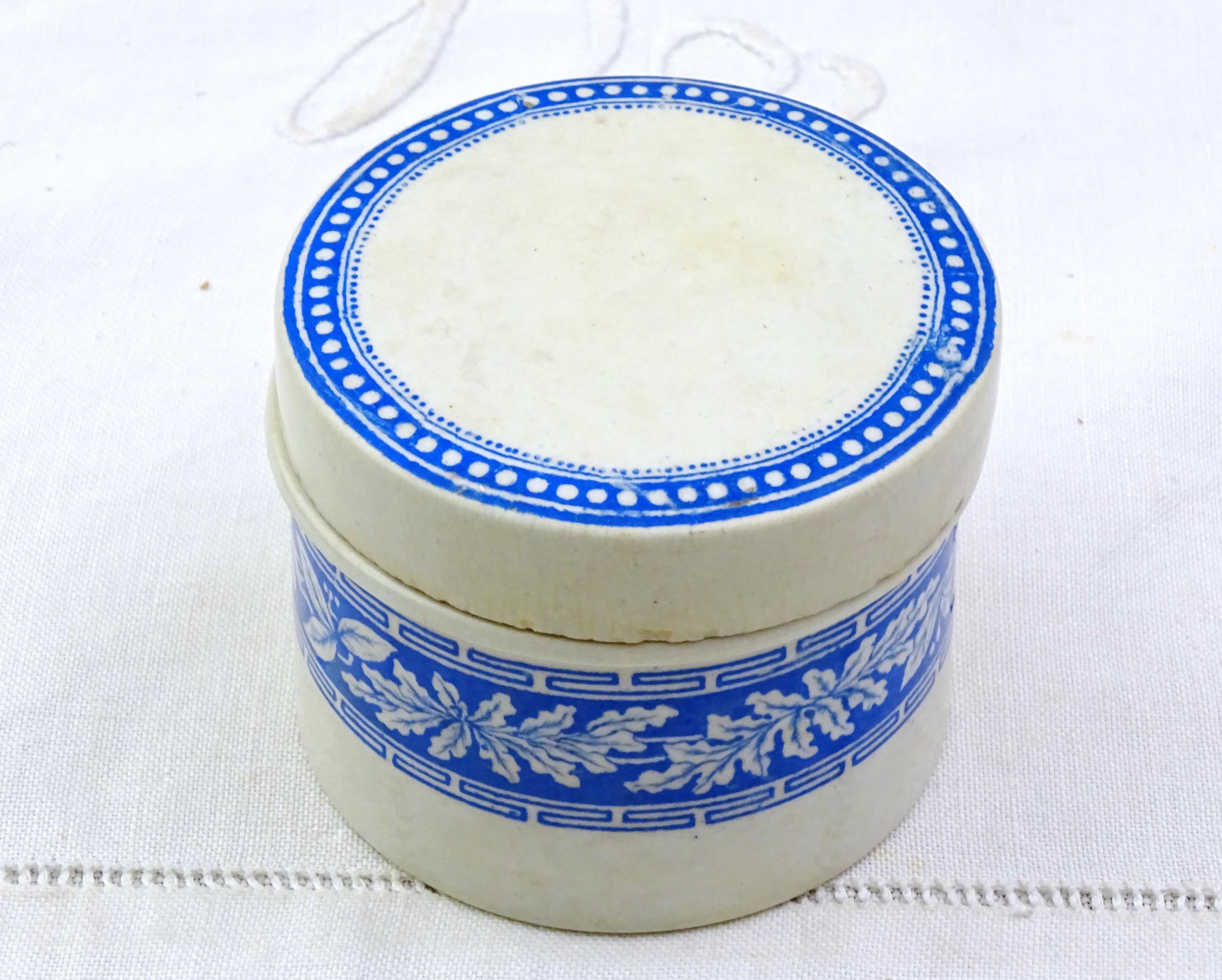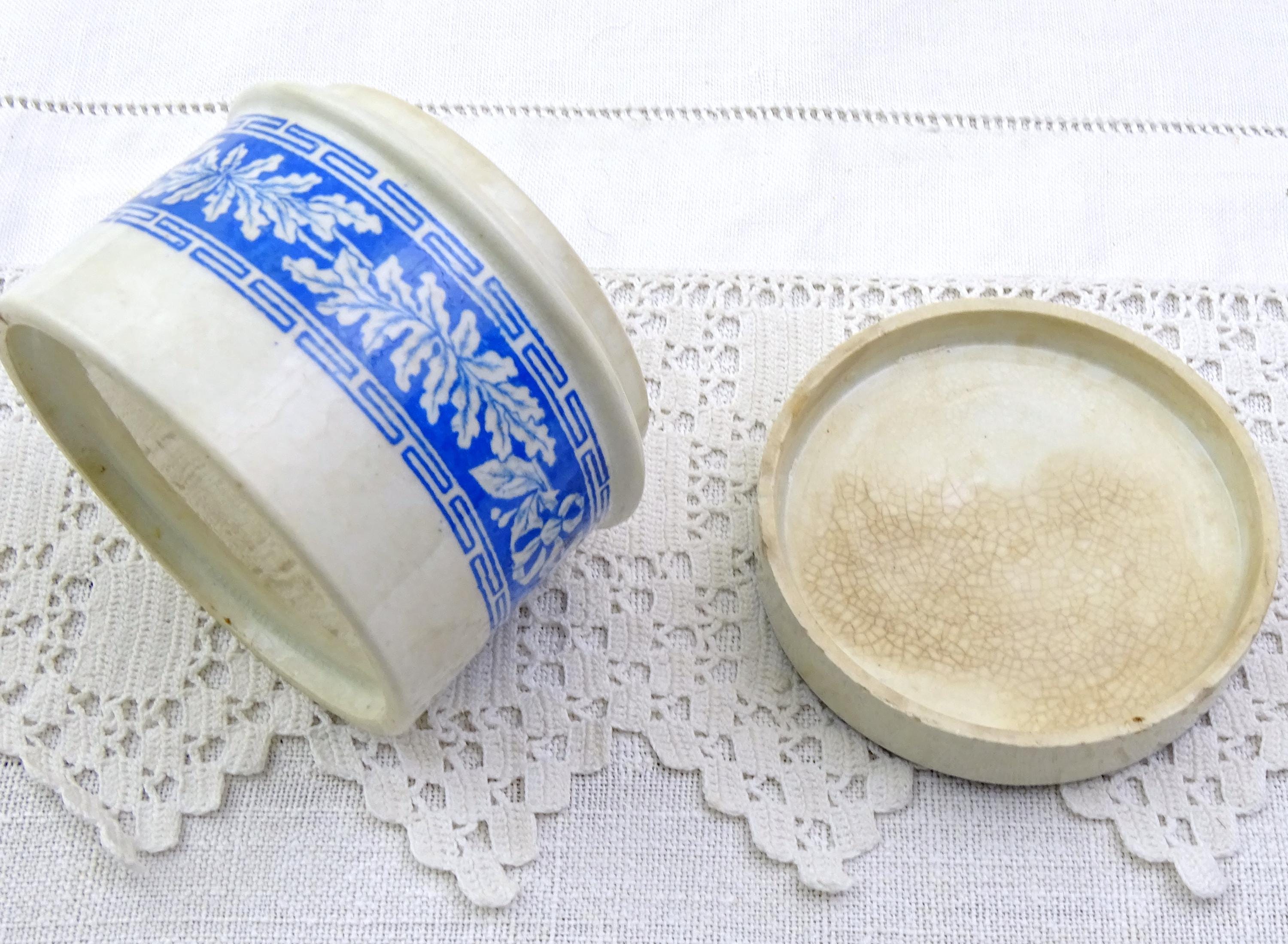 Antique French lidded pot with Empire style pattern. Made of white glazed ceramic with blue leaf pattern. Ca early 1800s.