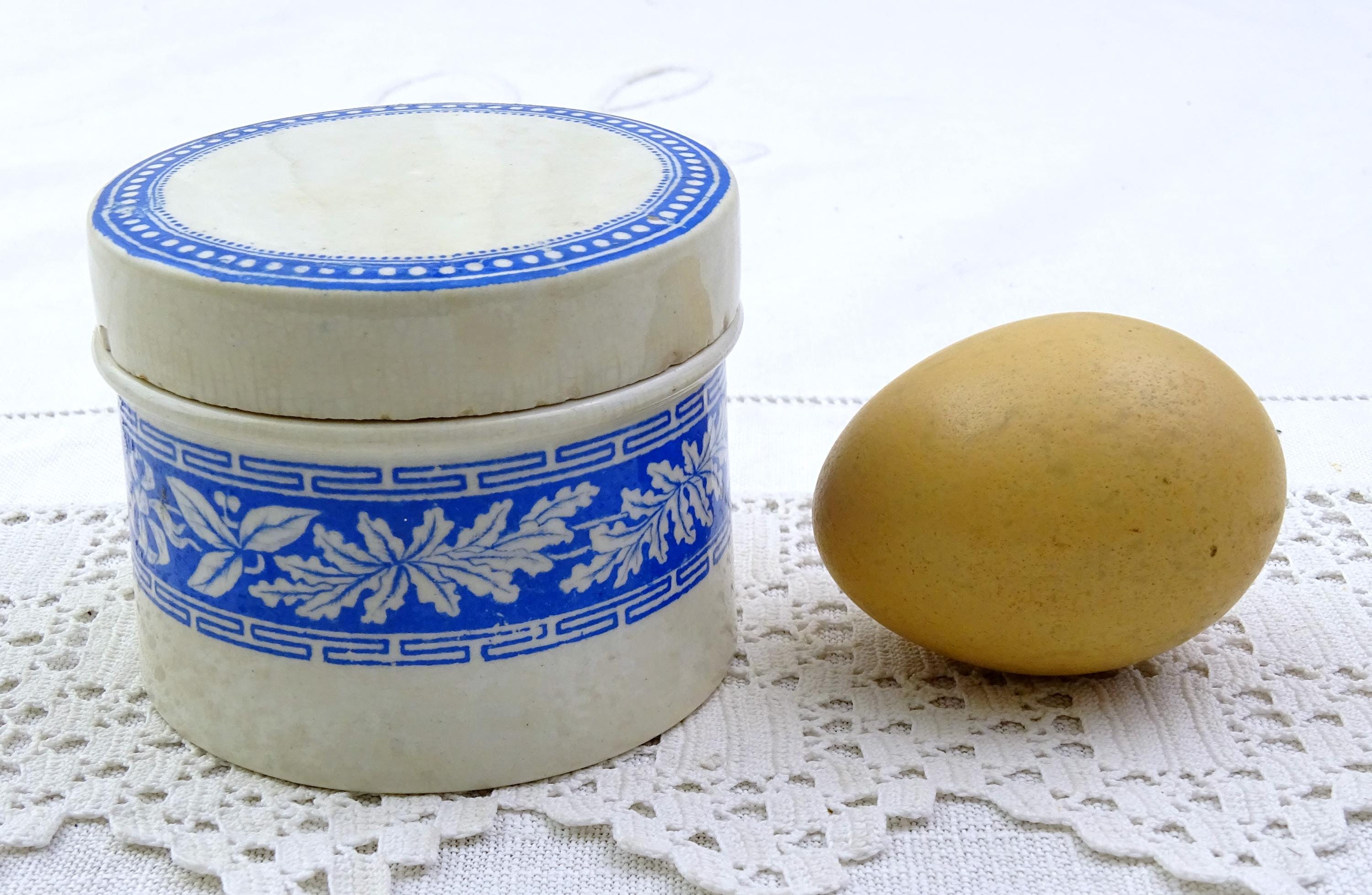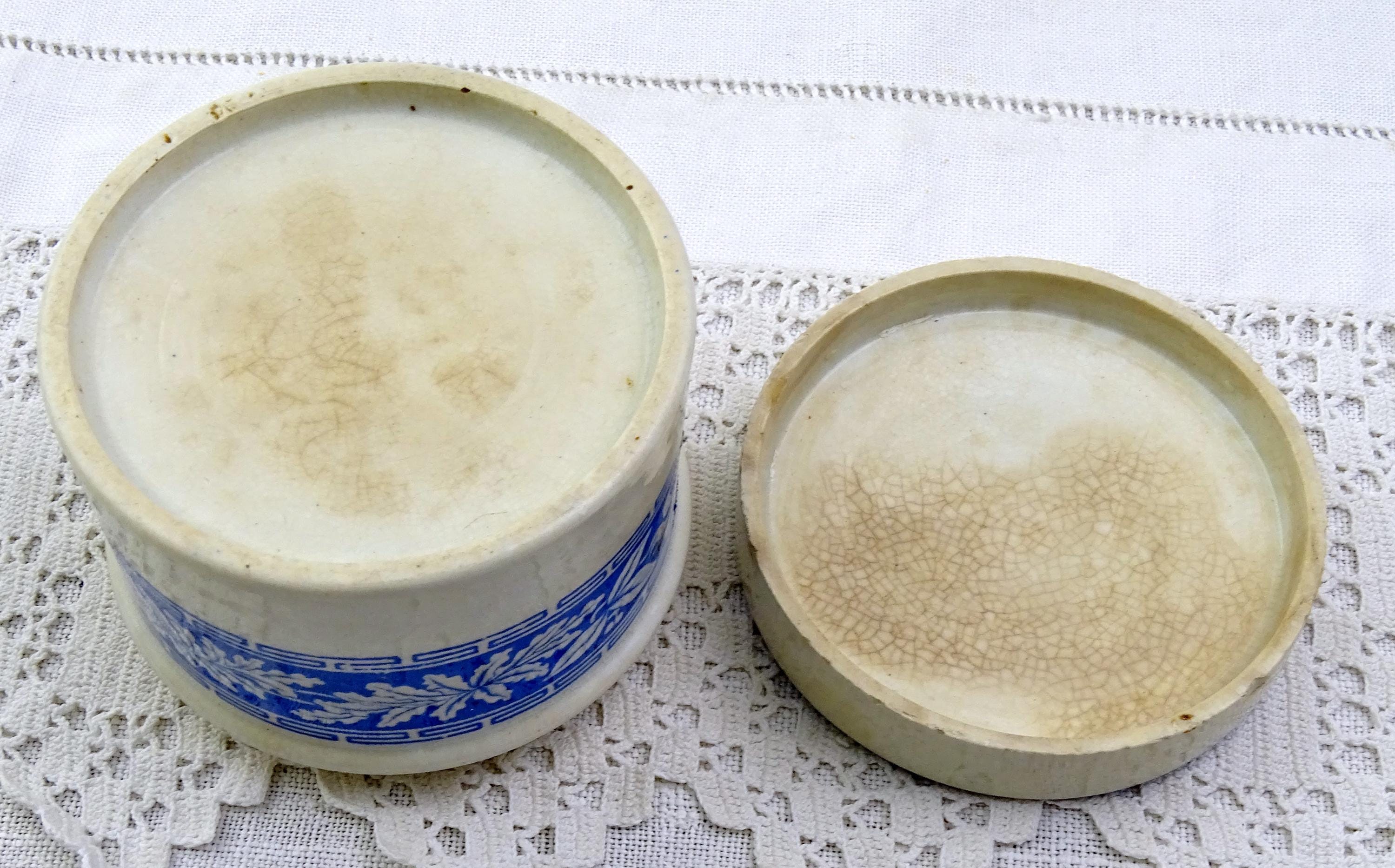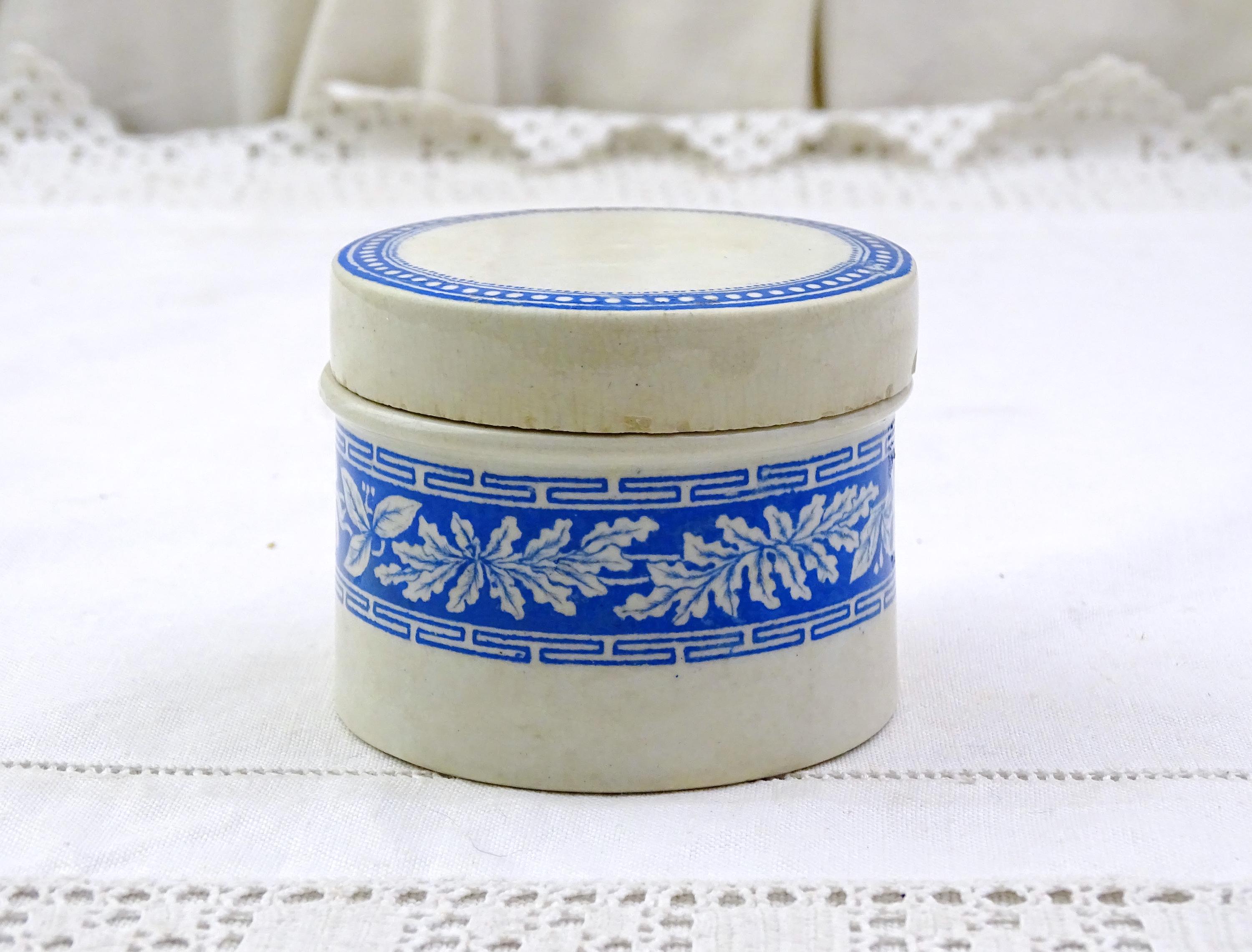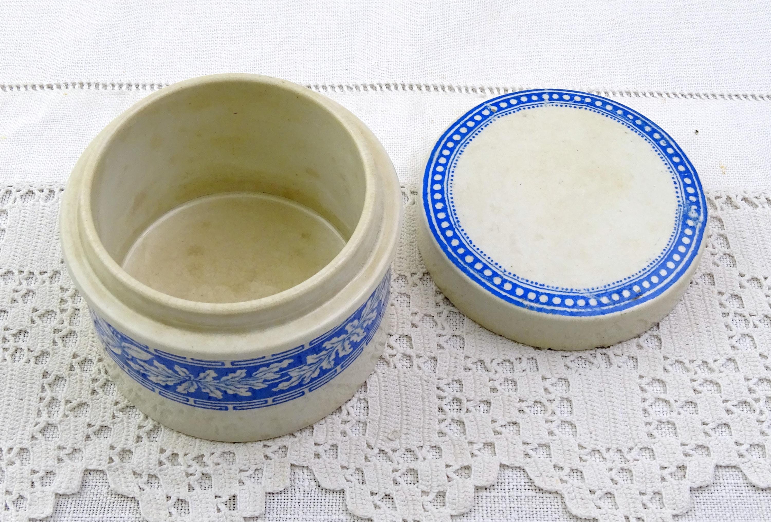 Antique French lidded pot with Empire style pattern. Made of white glazed ceramic with blue leaf pattern. Ca early 1800s.