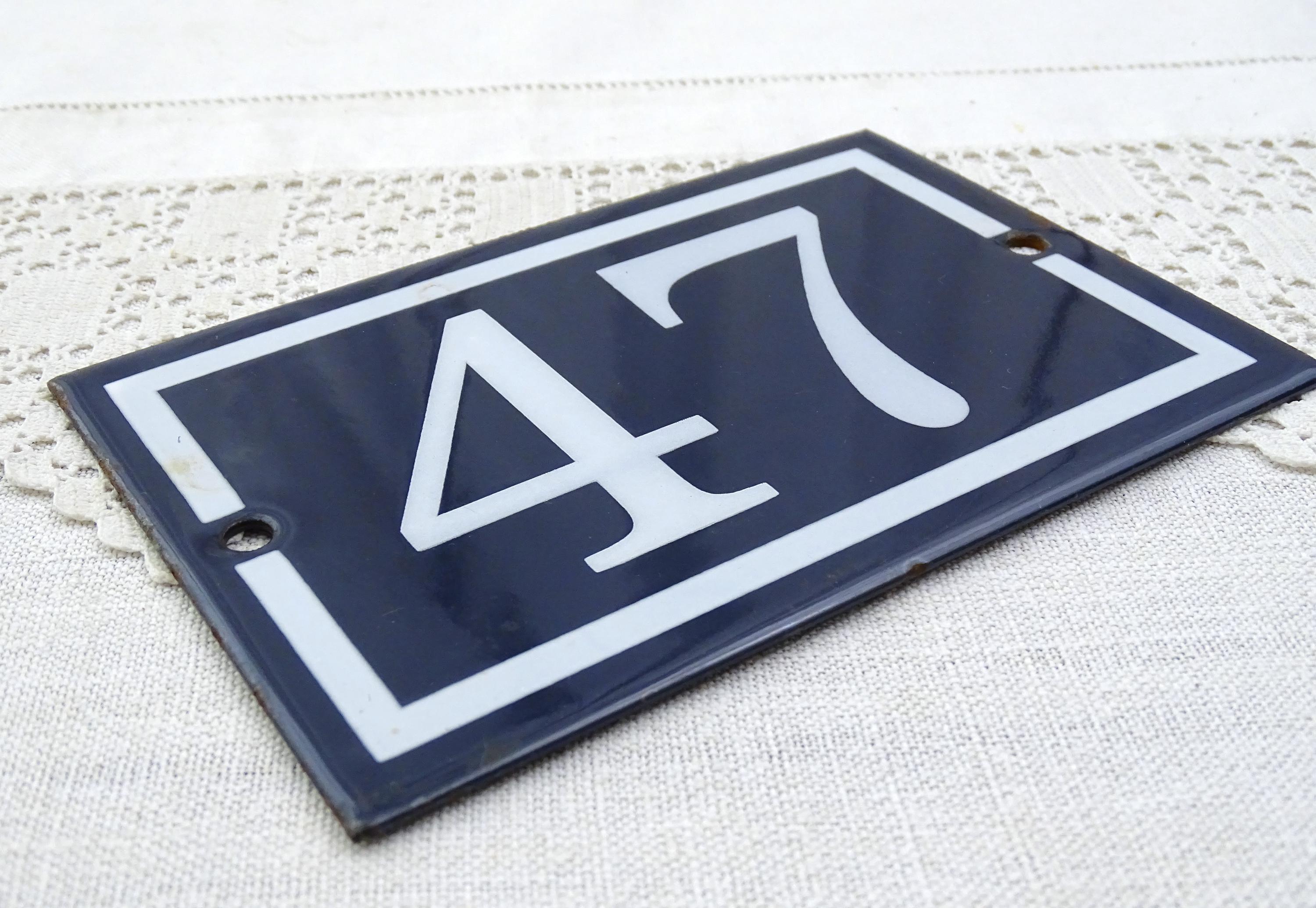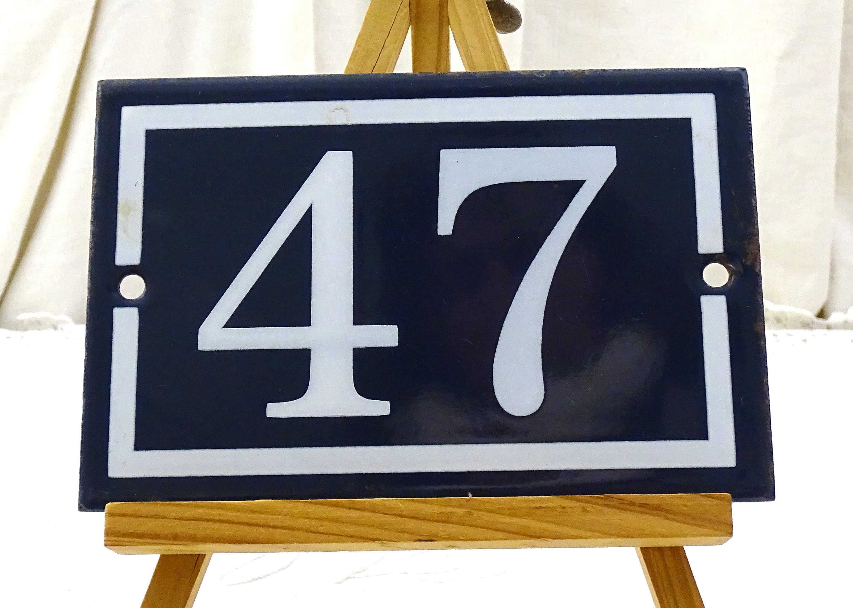 Vintage traditional French enamel house number 47. Made of enameled metal in dark blue with white number. Ca 1940s.