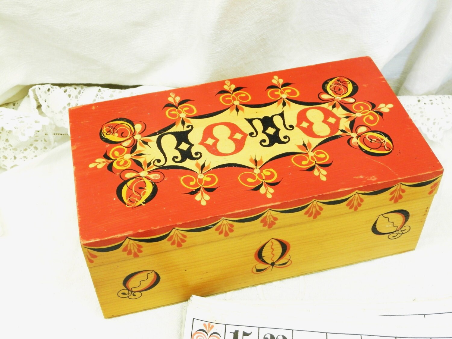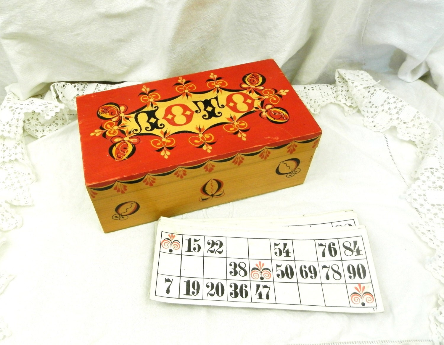 Colorful wooden box with a set of 24 cards. A really beautiful set.